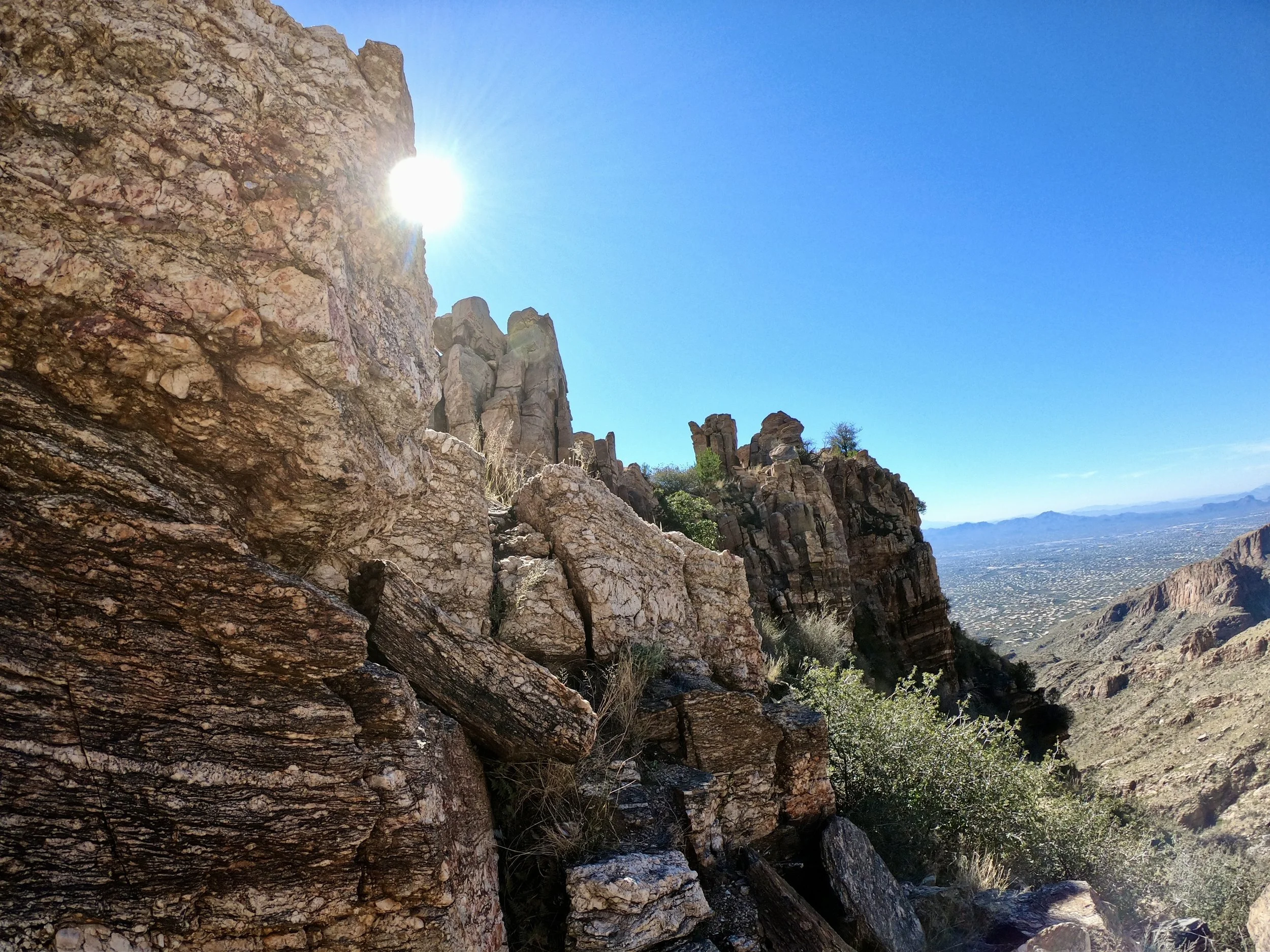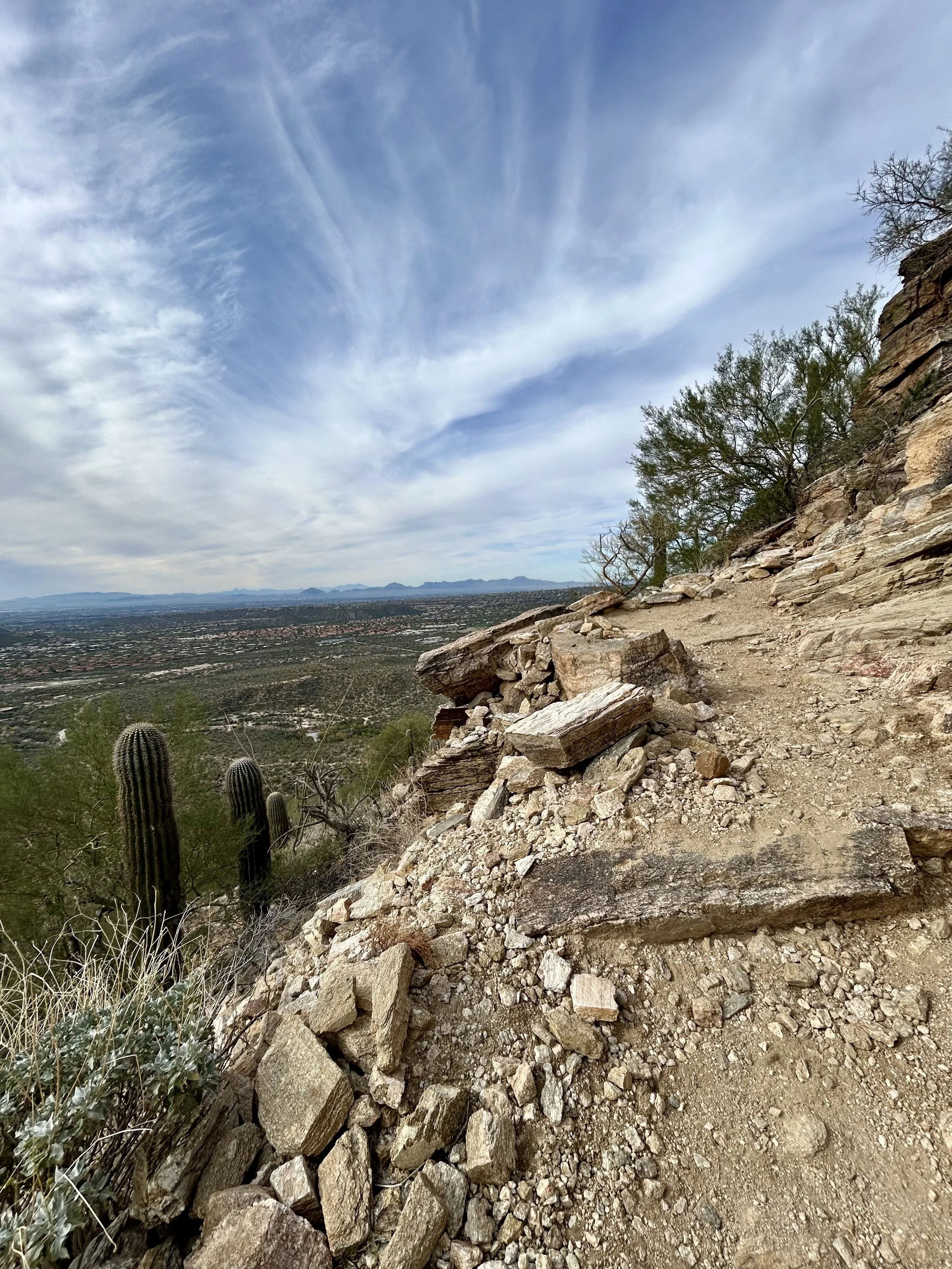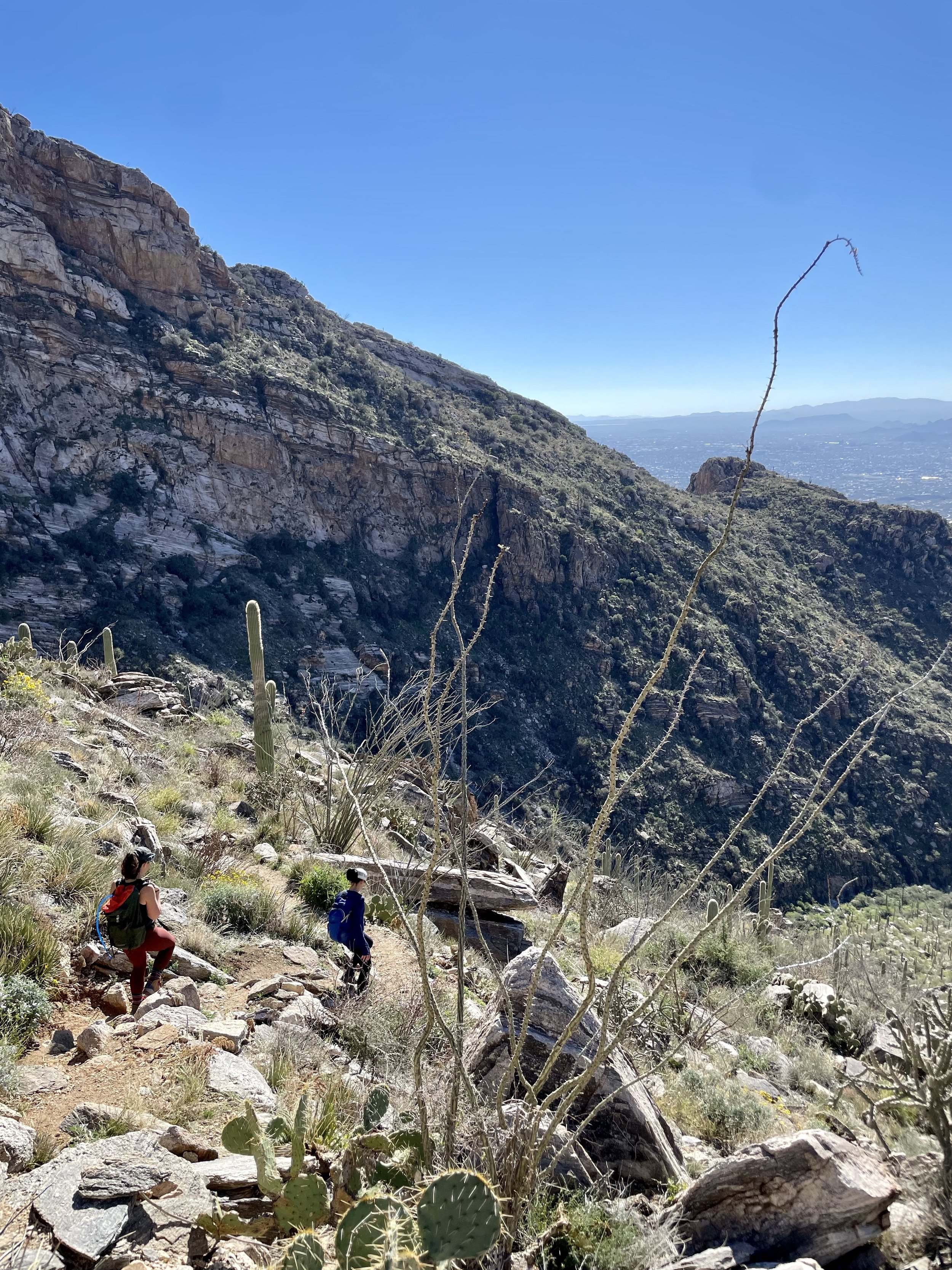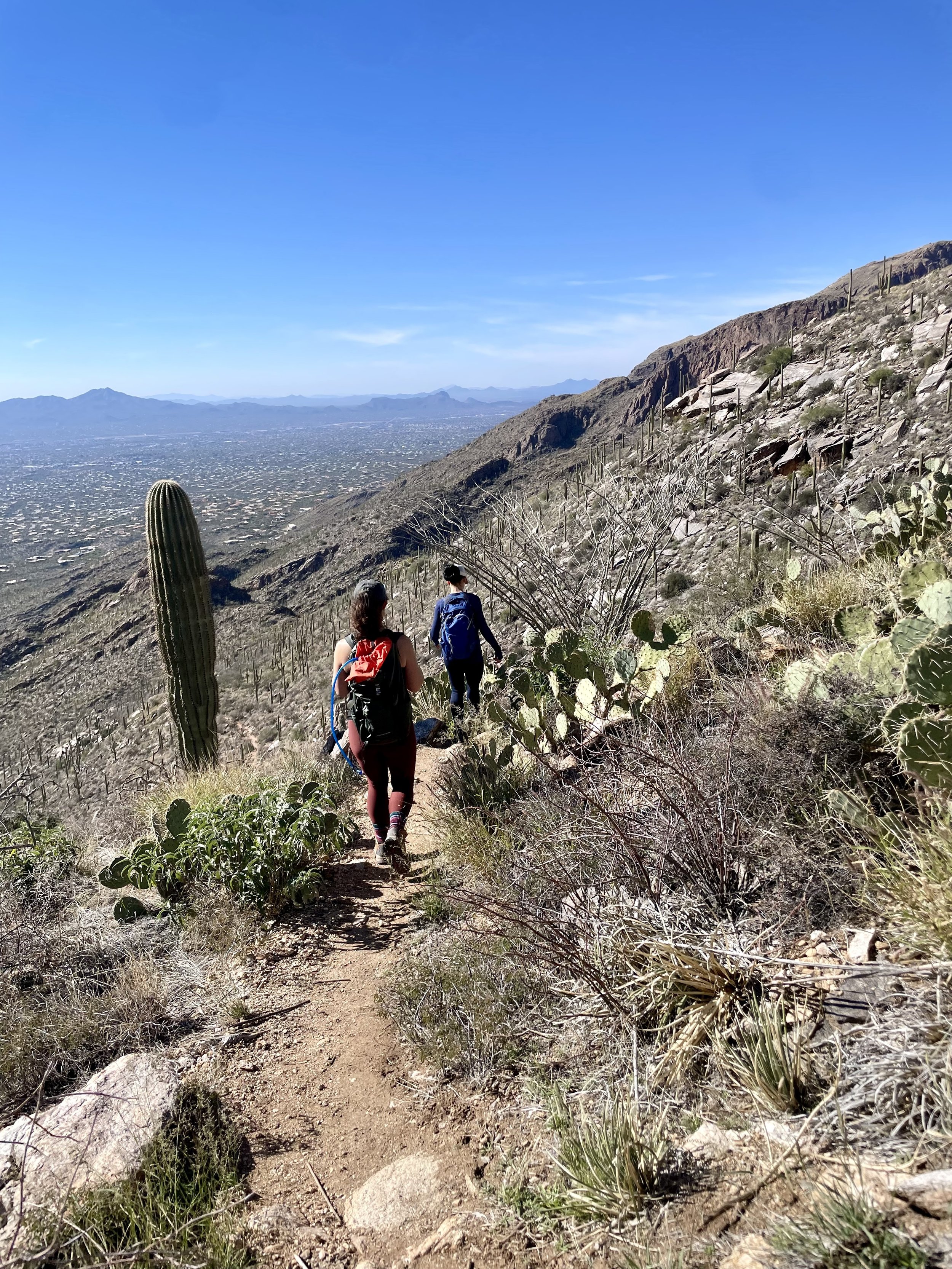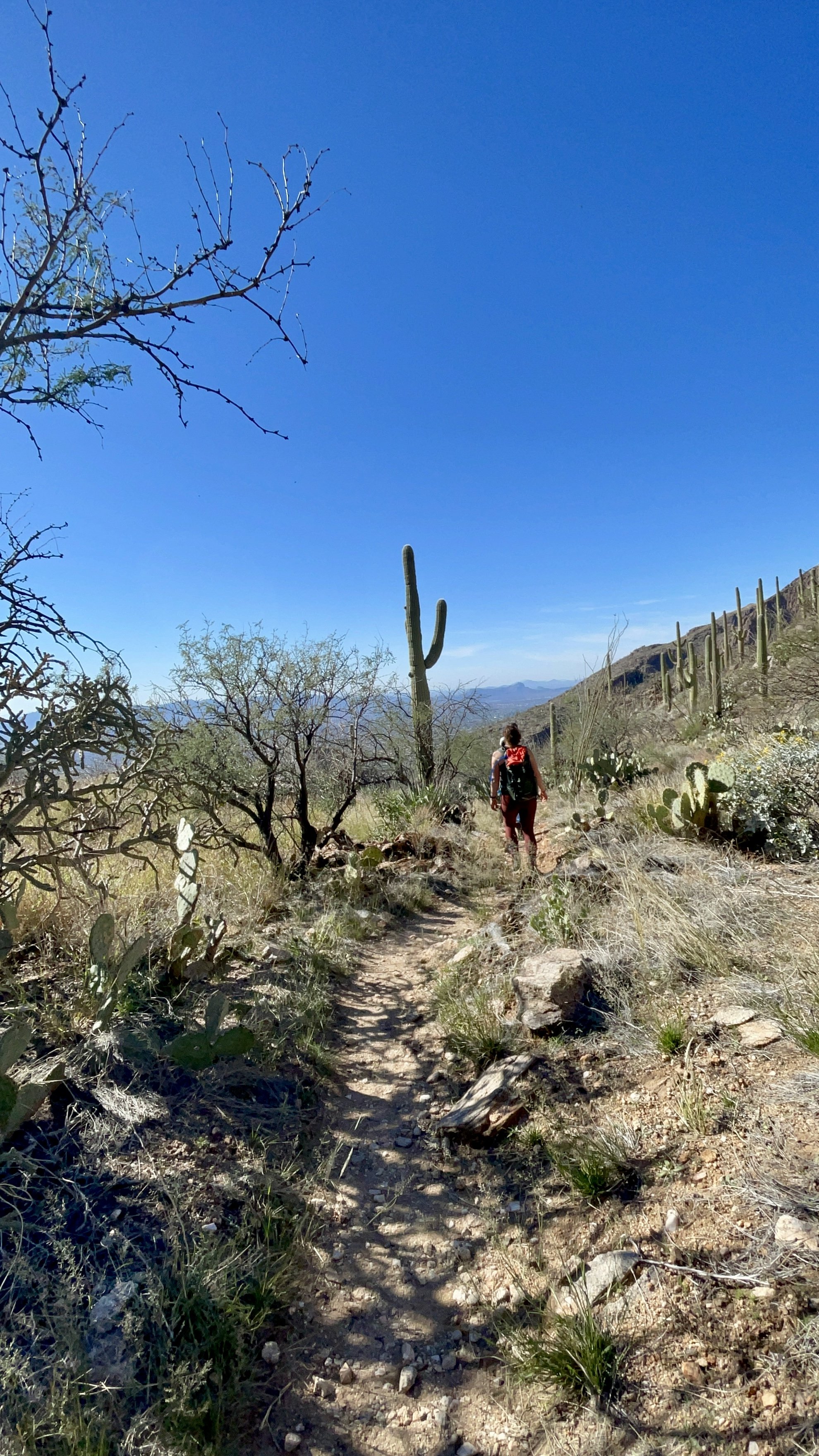 Just north of Tucson are the Catalina Foothills, which lead into the greater Santa Catalina Mountain Range. This mountain range does not feel like it should be here. This is where Mount Lemmon proudly sits above 9,000’ of vertical elevation. We have taken multiple adventures up into these mountains, and have only looked at the tip of the iceberg, let alone touched it. We have spent a good amount of time here over the past couple weeks. It has become a sort of weekend ritual to hike up there. We called up our hiking friend, Katie, and headed up to the Sabino State Parka area to explore. Our trail started at a parking area outside of the state park that we have been to before for another hike. It’s a great spot, because it saves us state park fees, which are quite pricy here in AZ, and it gave us a little more length to the hike. We set out to do Blackett’s Ridge. With beautiful weather, we had a great day in the sunshine. The Saguaros were massive, and the trail was littered with tons of Mica crystals. The trail took us up above the Tucson Valley, with amazing views of the mountains ahead of us, and the valley to the left, right and behind us. The lush green views will always surprise us. It turns out, this is the wettest desert in the world, which makes sense! At the top of the ridge, we took in the views. This area had some massive cliff faces, as the ridge began to have significant exposure on both sides. Amity safely navigated to a good resting spot, while I found a good cliff to dangle my feet off. Hiking with Katie is a great change in our typical day of hiking. We have so much to talk about and enjoy the conversations along the hike! The hike was beautiful and went quick.