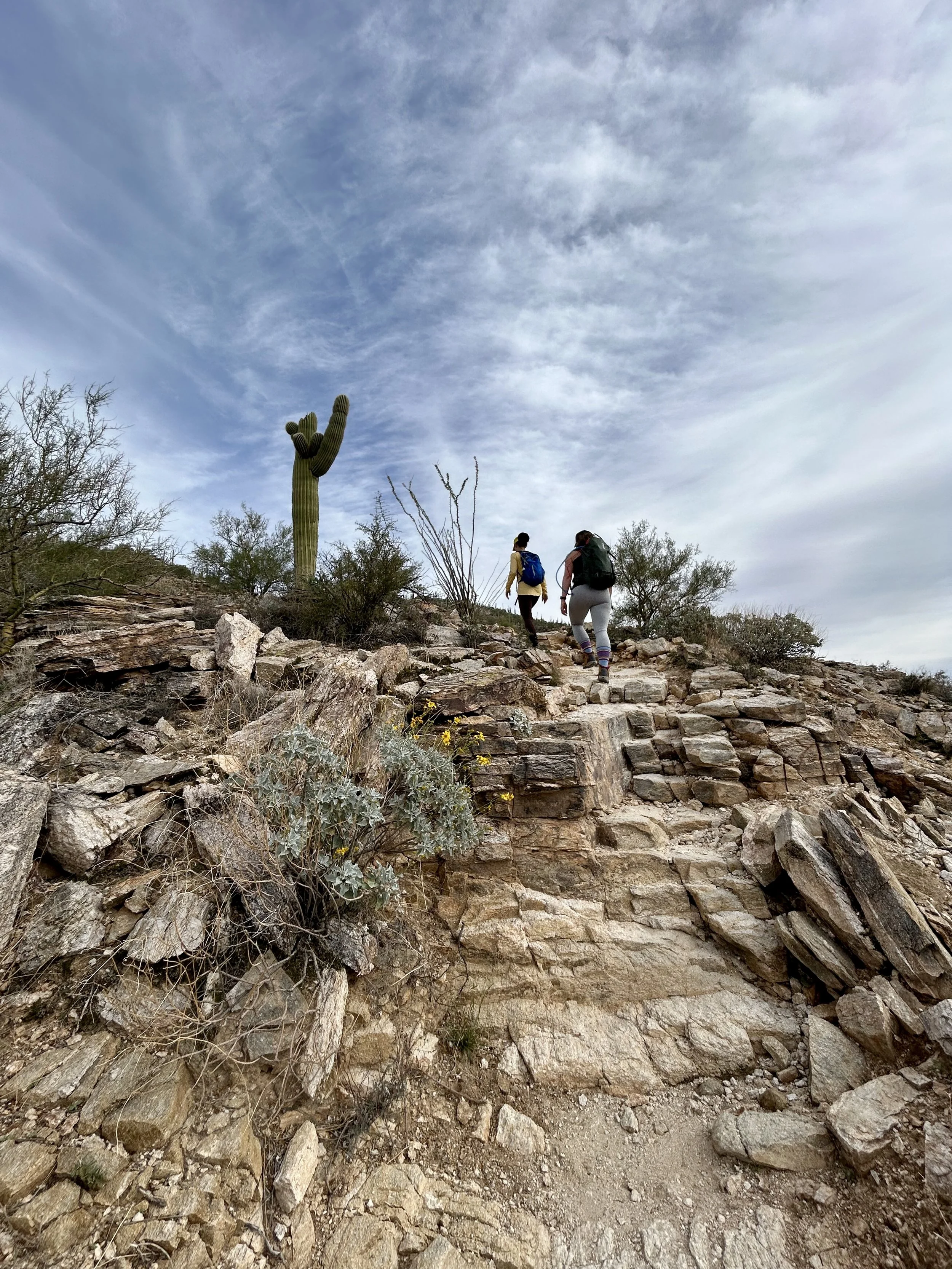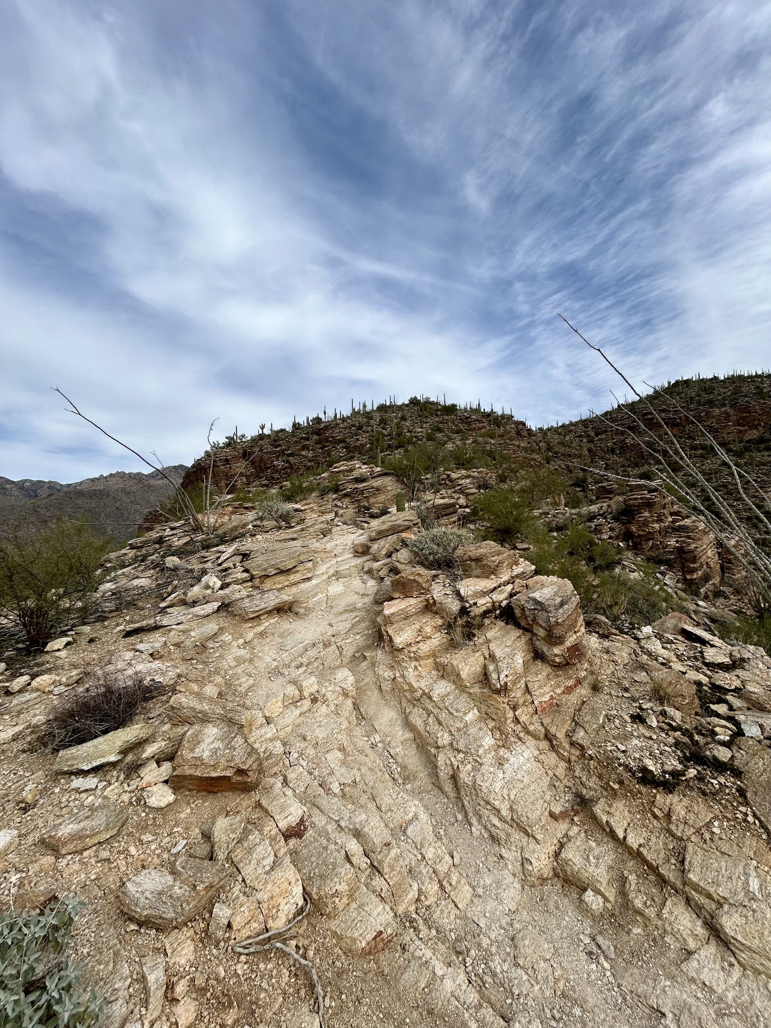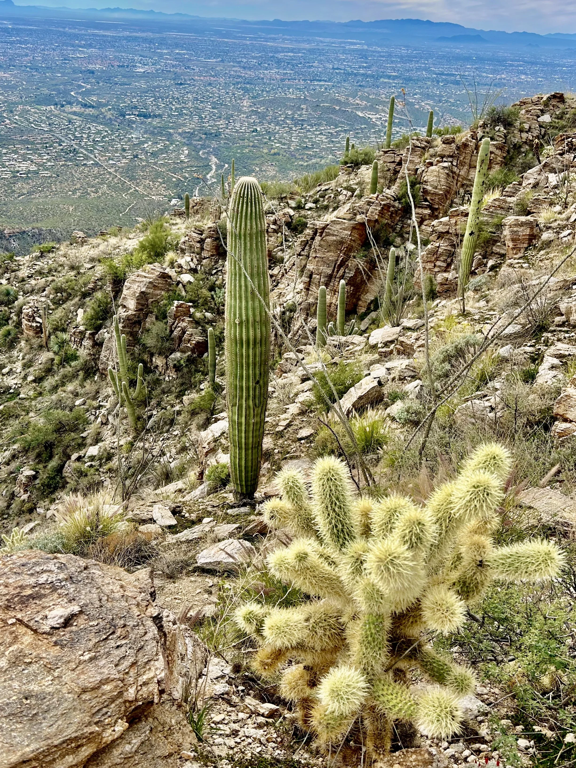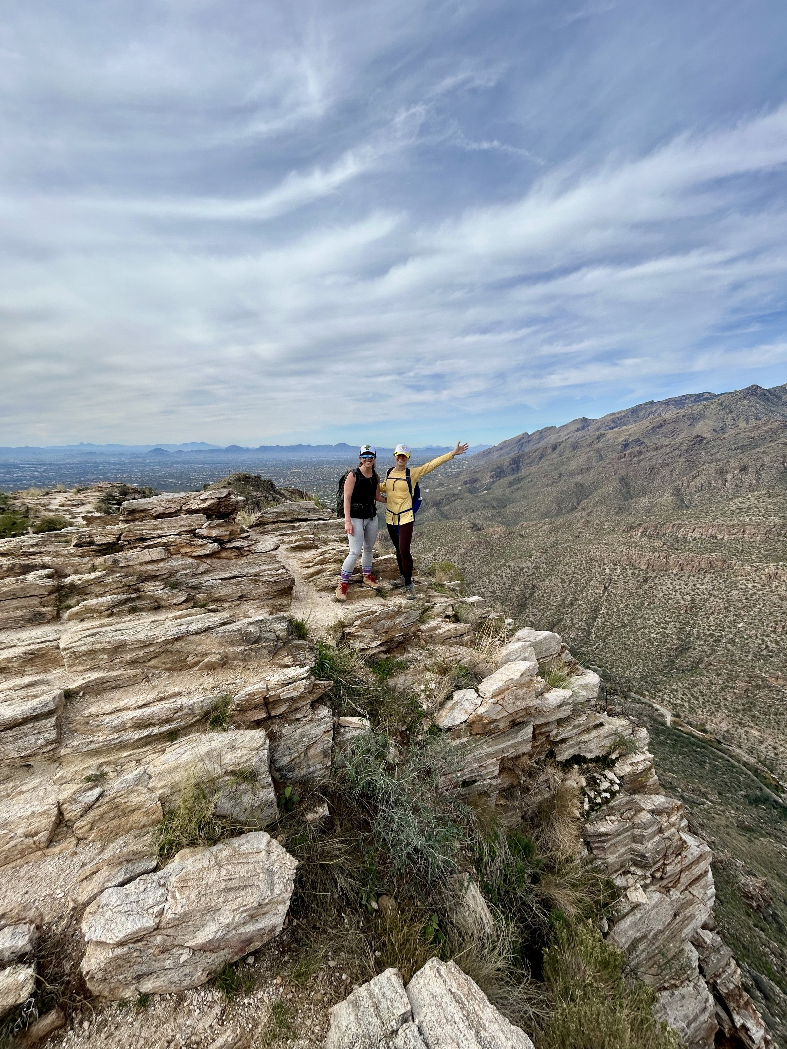 Just north of Tucson are the Catalina Foothills, which lead into the greater Santa Catalina Mountain Range. This mountain range does not feel like it should be here. This is where Mount Lemmon proudly sits above 9,000’ of vertical elevation. We have taken multiple adventures up into these mountains, and have only looked at the tip of the iceberg, let alone touched it. We have spent a good amount of time here over the past couple weeks. It has become a sort of weekend ritual to hike up there. We called up our hiking friend, Katie, and headed up to the Sabino State Parka area to explore. Our trail started at a parking area outside of the state park that we have been to before for another hike. It’s a great spot, because it saves us state park fees, which are quite pricy here in AZ, and it gave us a little more length to the hike. We set out to do Blackett’s Ridge. With beautiful weather, we had a great day in the sunshine. The Saguaros were massive, and the trail was littered with tons of Mica crystals. The trail took us up above the Tucson Valley, with amazing views of the mountains ahead of us, and the valley to the left, right and behind us. The lush green views will always surprise us. It turns out, this is the wettest desert in the world, which makes sense! At the top of the ridge, we took in the views. This area had some massive cliff faces, as the ridge began to have significant exposure on both sides. Amity safely navigated to a good resting spot, while I found a good cliff to dangle my feet off. Hiking with Katie is a great change in our typical day of hiking. We have so much to talk about and enjoy the conversations along the hike! The hike was beautiful and went quick.