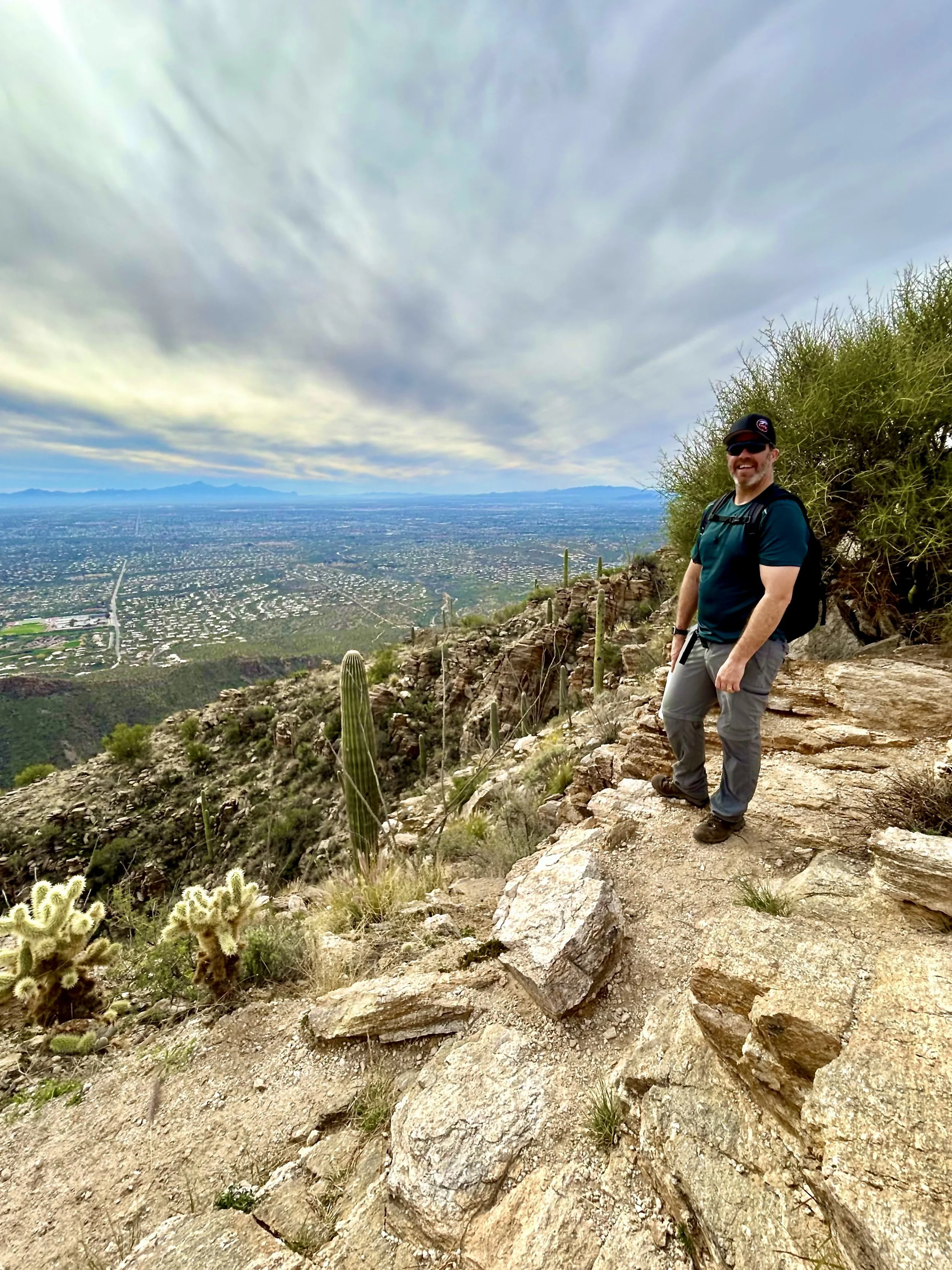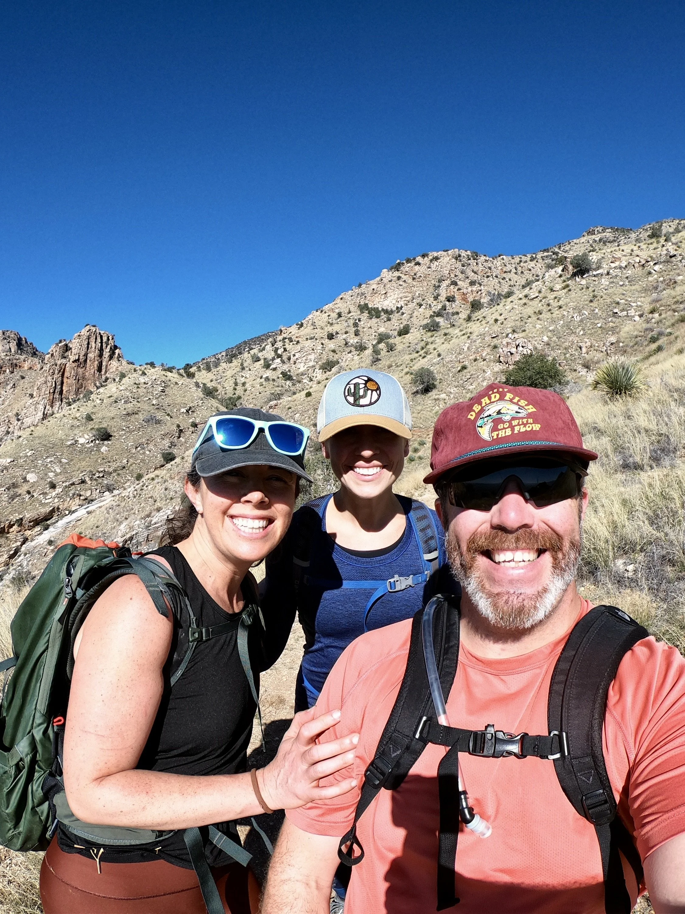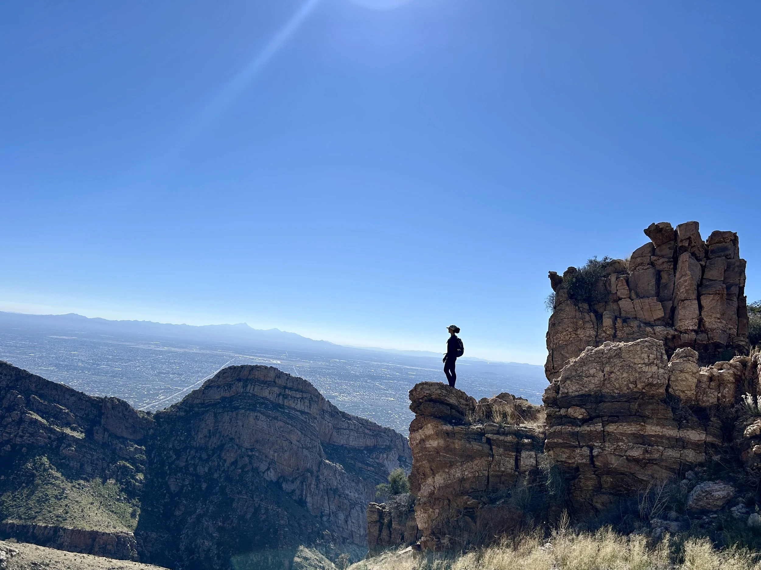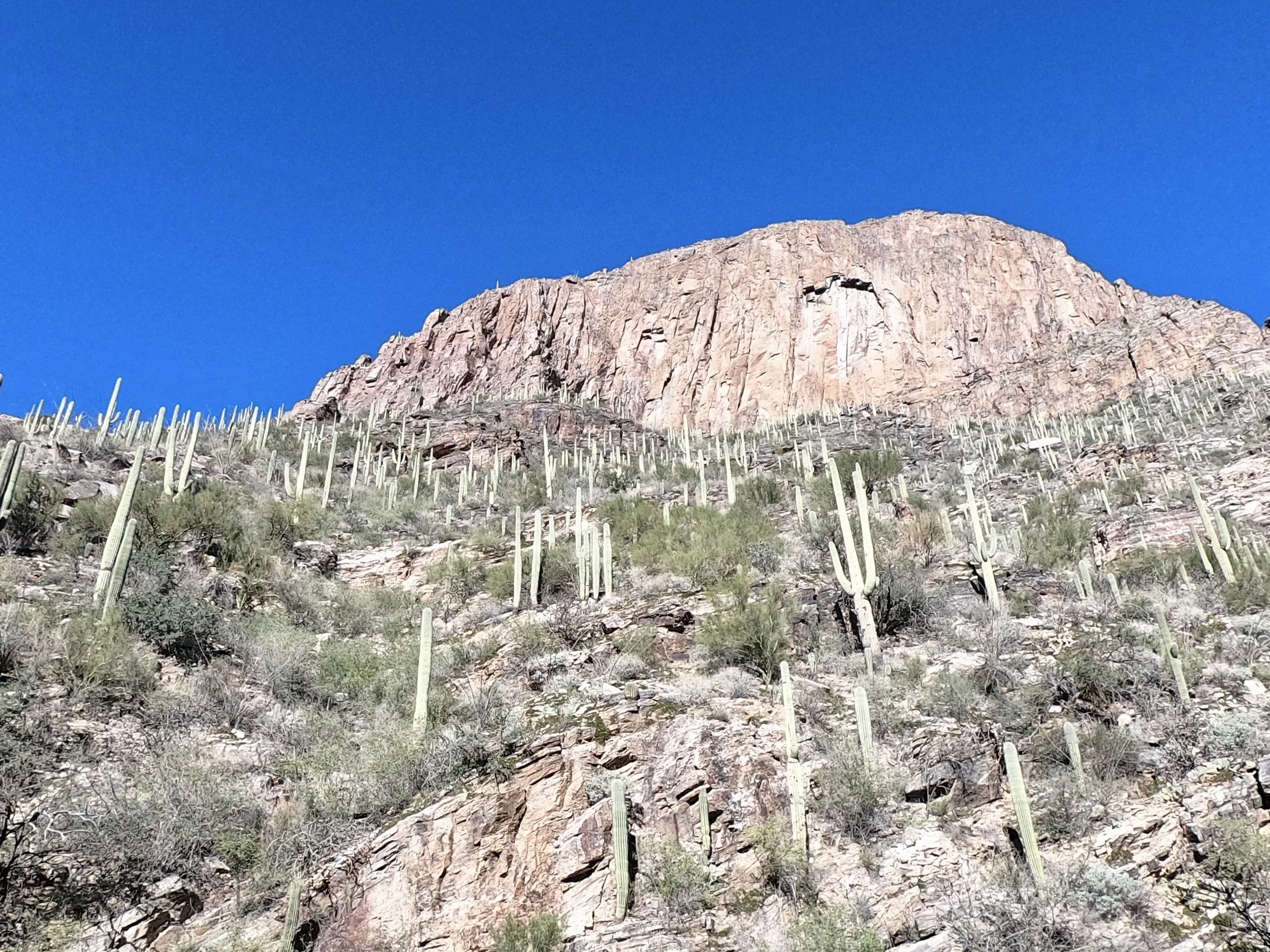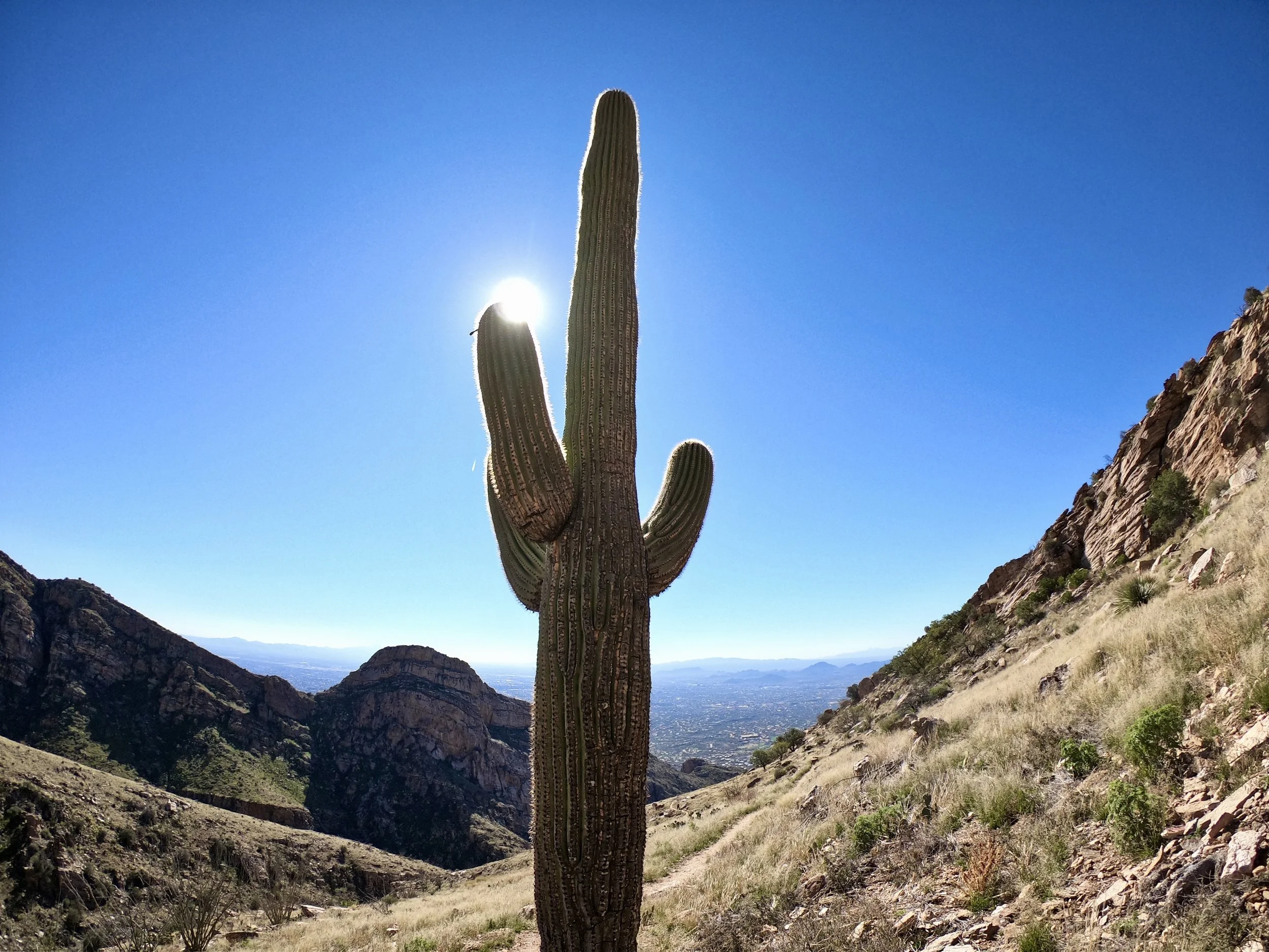 Just north of Tucson are the Catalina Foothills, which lead into the greater Santa Catalina Mountain Range. This mountain range does not feel like it should be here. This is where Mount Lemmon proudly sits above 9,000’ of vertical elevation. We have taken multiple adventures up into these mountains, and have only looked at the tip of the iceberg, let alone touched it. We have spent a good amount of time here over the past couple weeks. It has become a sort of weekend ritual to hike up there. We called up our hiking friend, Katie, and headed up to the Sabino State Parka area to explore. Our trail started at a parking area outside of the state park that we have been to before for another hike. It’s a great spot, because it saves us state park fees, which are quite pricy here in AZ, and it gave us a little more length to the hike. We set out to do Blackett’s Ridge. With beautiful weather, we had a great day in the sunshine. The Saguaros were massive, and the trail was littered with tons of Mica crystals. The trail took us up above the Tucson Valley, with amazing views of the mountains ahead of us, and the valley to the left, right and behind us. The lush green views will always surprise us. It turns out, this is the wettest desert in the world, which makes sense! At the top of the ridge, we took in the views. This area had some massive cliff faces, as the ridge began to have significant exposure on both sides. Amity safely navigated to a good resting spot, while I found a good cliff to dangle my feet off. Hiking with Katie is a great change in our typical day of hiking. We have so much to talk about and enjoy the conversations along the hike! The hike was beautiful and went quick.