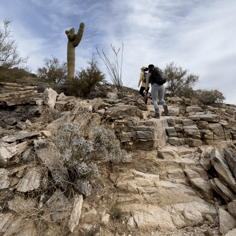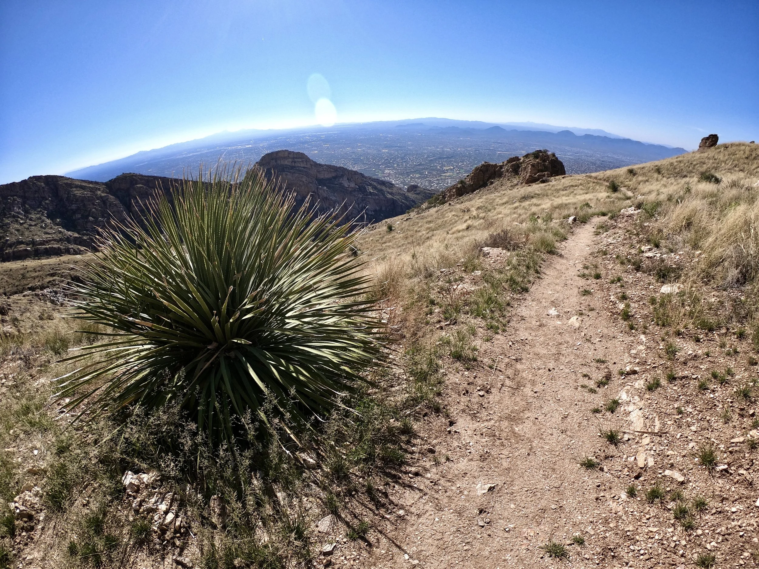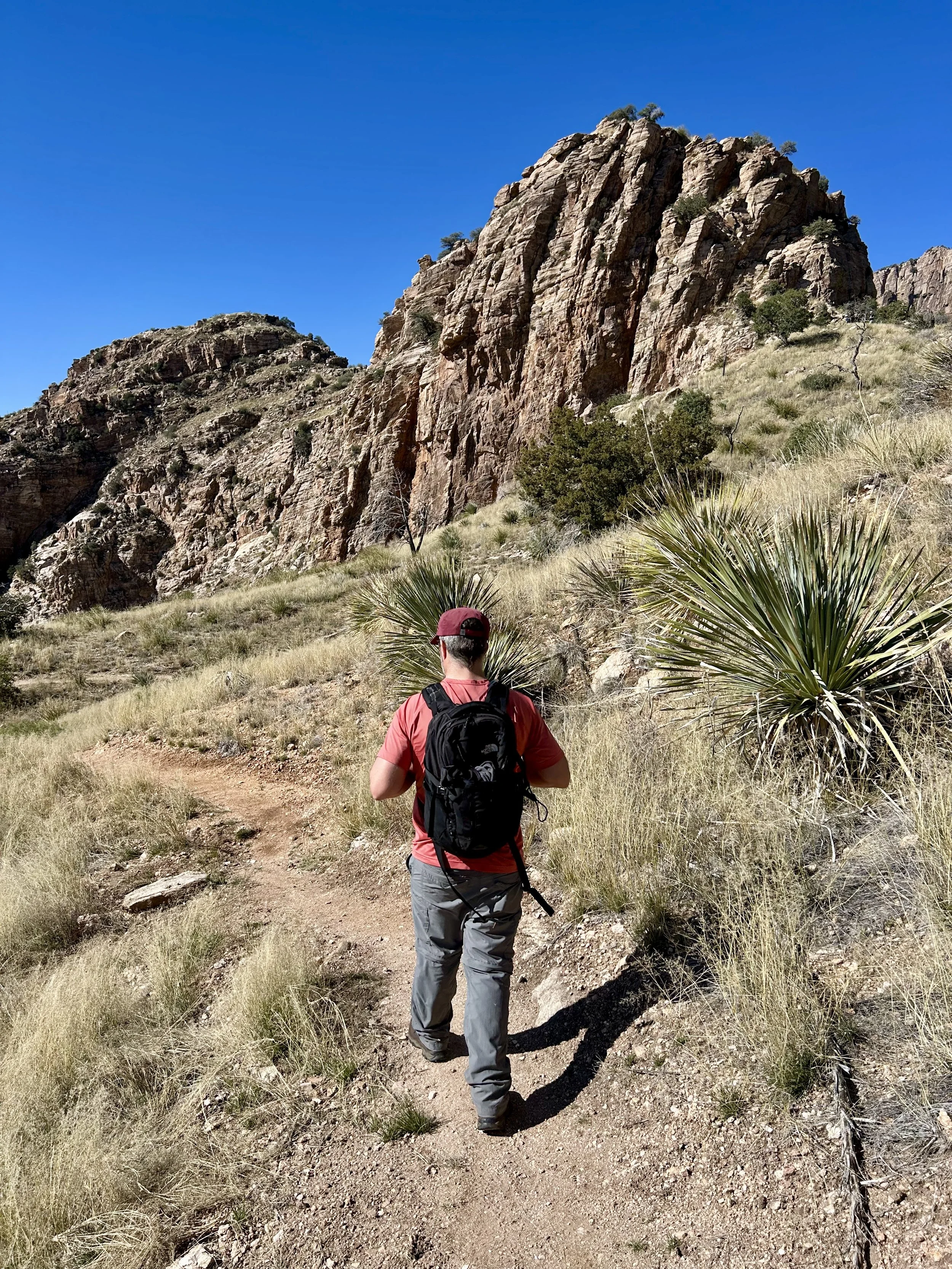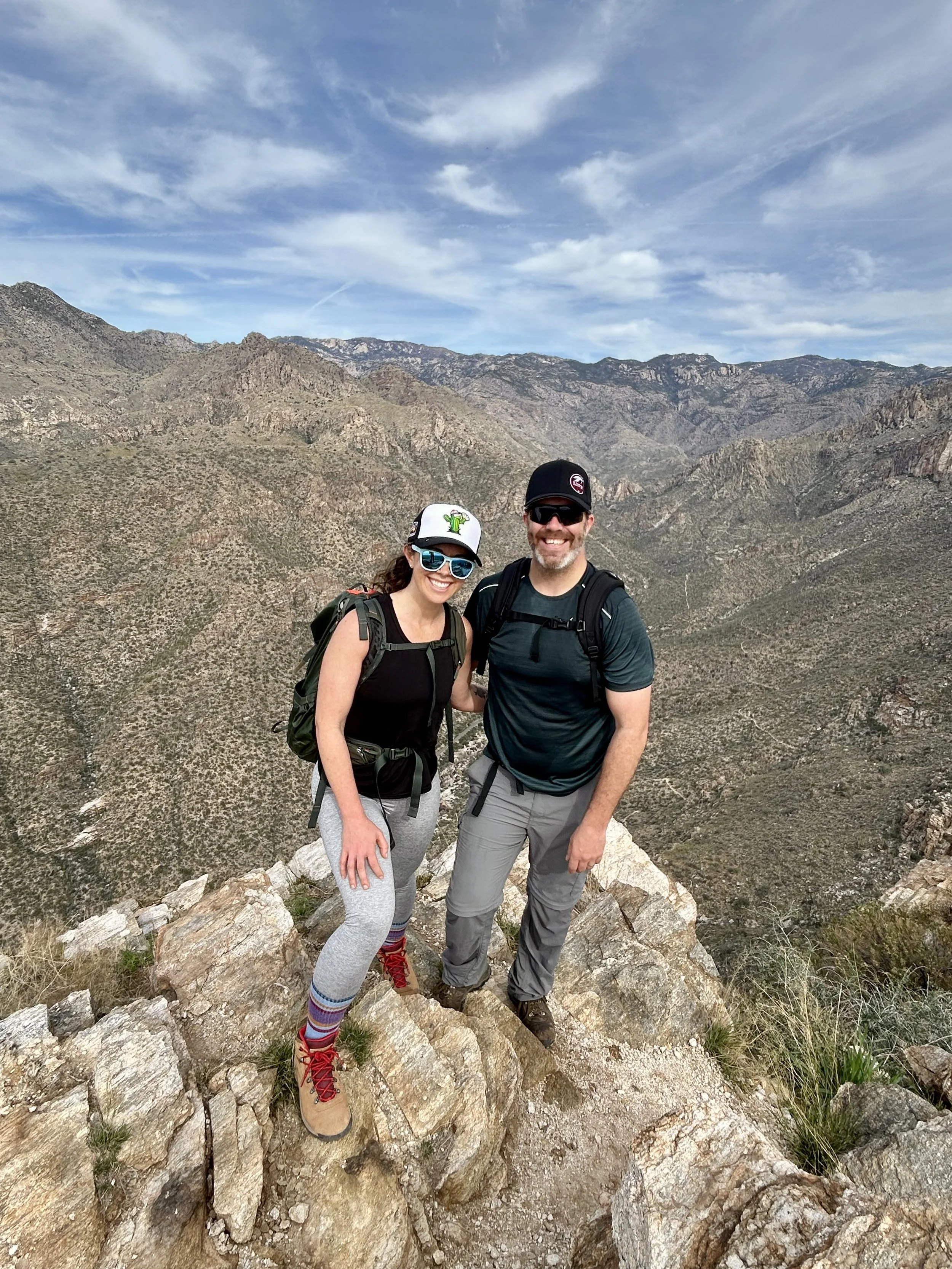 Just north of Tucson are the Catalina Foothills, which lead into the greater Santa Catalina Mountain Range. This mountain range does not feel like it should be here. This is where Mount Lemmon proudly sits above 9,000’ of vertical elevation. We have taken multiple adventures up into these mountains, and have only looked at the tip of the iceberg, let alone touched it. We have spent a good amount of time here over the past couple weeks. It has become a sort of weekend ritual to hike up there. We called up our hiking friend, Katie, and headed up to the Sabino State Parka area to explore. Our trail started at a parking area outside of the state park that we have been to before for another hike. It’s a great spot, because it saves us state park fees, which are quite pricy here in AZ, and it gave us a little more length to the hike. We set out to do Blackett’s Ridge. With beautiful weather, we had a great day in the sunshine. The Saguaros were massive, and the trail was littered with tons of Mica crystals. The trail took us up above the Tucson Valley, with amazing views of the mountains ahead of us, and the valley to the left, right and behind us. The lush green views will always surprise us. It turns out, this is the wettest desert in the world, which makes sense! At the top of the ridge, we took in the views. This area had some massive cliff faces, as the ridge began to have significant exposure on both sides. Amity safely navigated to a good resting spot, while I found a good cliff to dangle my feet off. Hiking with Katie is a great change in our typical day of hiking. We have so much to talk about and enjoy the conversations along the hike! The hike was beautiful and went quick.