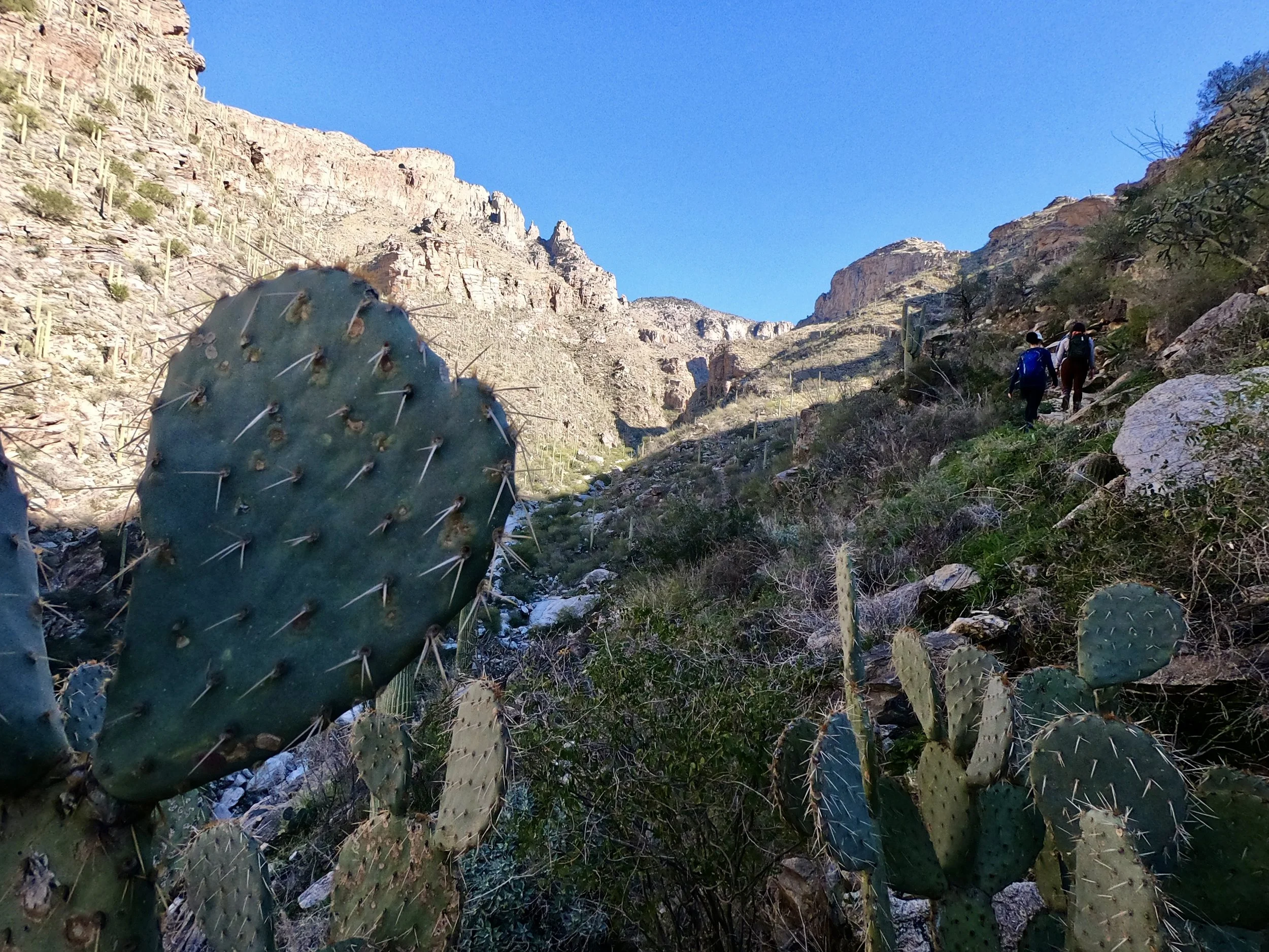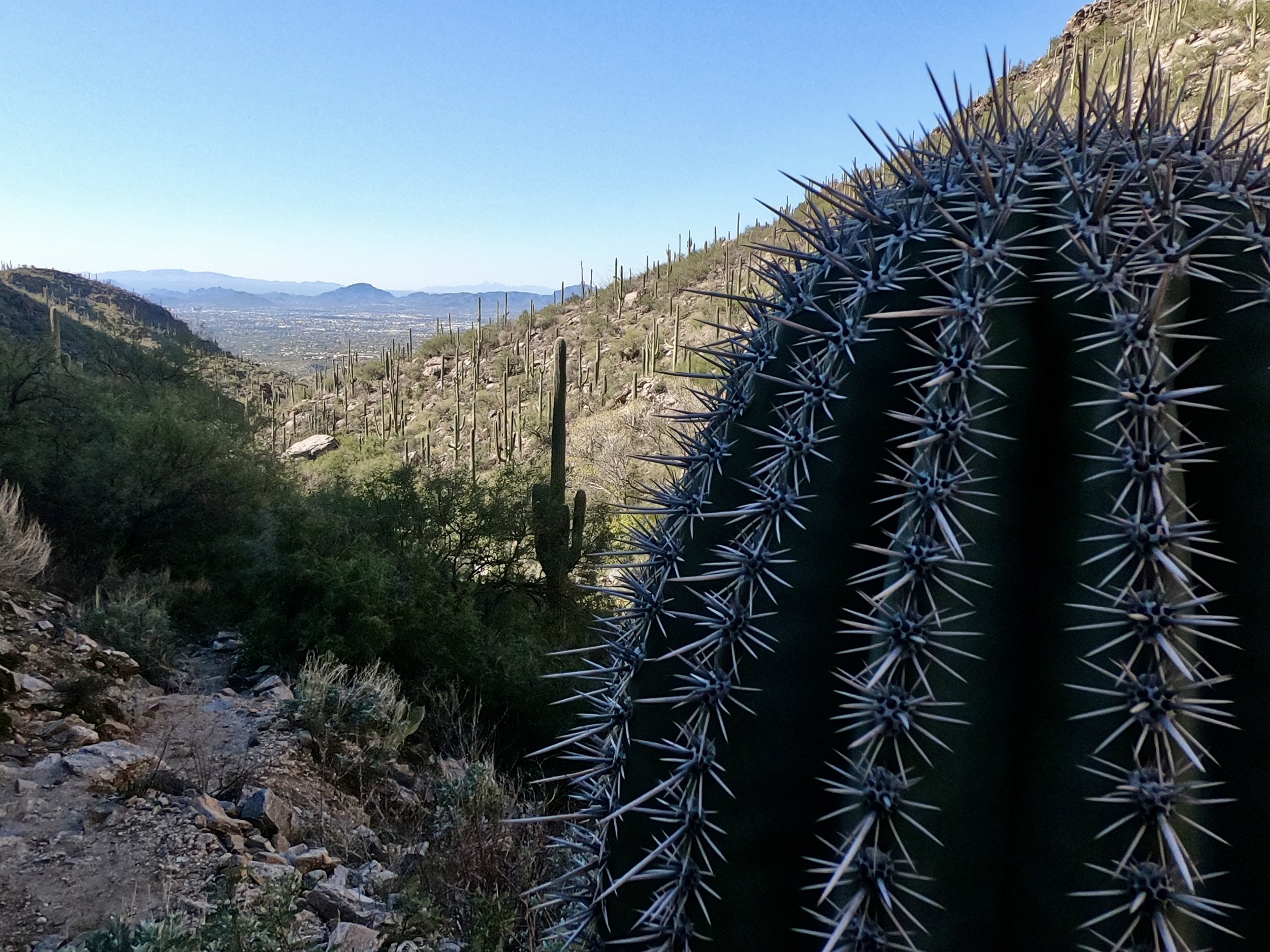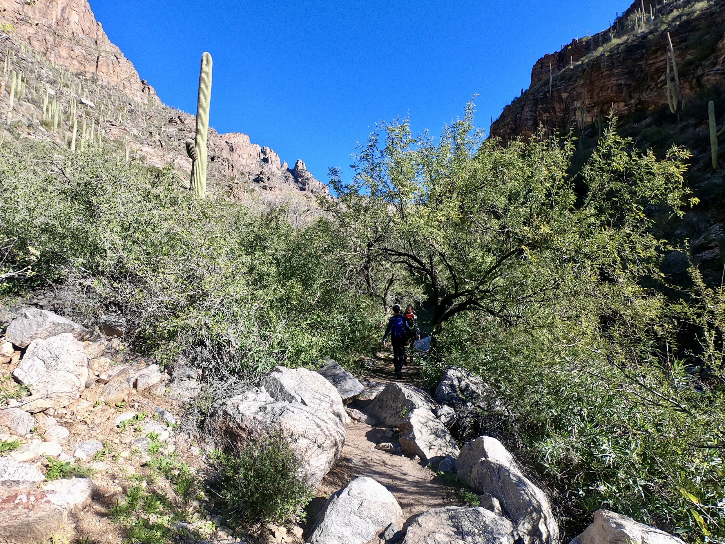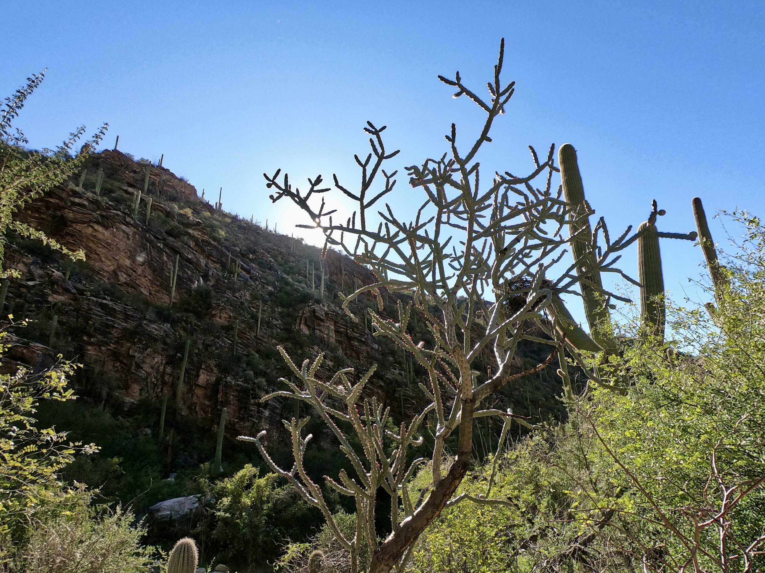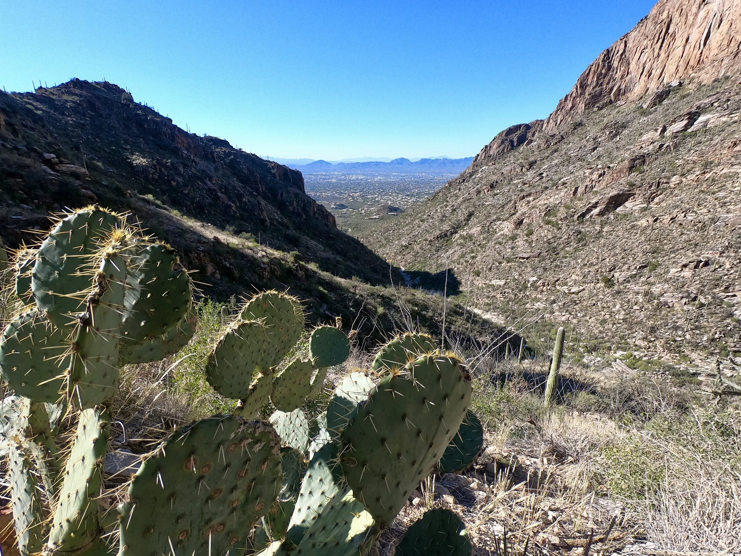 Just north of Tucson are the Catalina Foothills, which lead into the greater Santa Catalina Mountain Range. This mountain range does not feel like it should be here. This is where Mount Lemmon proudly sits above 9,000’ of vertical elevation. We have taken multiple adventures up into these mountains, and have only looked at the tip of the iceberg, let alone touched it. We have spent a good amount of time here over the past couple weeks. It has become a sort of weekend ritual to hike up there. We called up our hiking friend, Katie, and headed up to the Sabino State Parka area to explore. Our trail started at a parking area outside of the state park that we have been to before for another hike. It’s a great spot, because it saves us state park fees, which are quite pricy here in AZ, and it gave us a little more length to the hike. We set out to do Blackett’s Ridge. With beautiful weather, we had a great day in the sunshine. The Saguaros were massive, and the trail was littered with tons of Mica crystals. The trail took us up above the Tucson Valley, with amazing views of the mountains ahead of us, and the valley to the left, right and behind us. The lush green views will always surprise us. It turns out, this is the wettest desert in the world, which makes sense! At the top of the ridge, we took in the views. This area had some massive cliff faces, as the ridge began to have significant exposure on both sides. Amity safely navigated to a good resting spot, while I found a good cliff to dangle my feet off. Hiking with Katie is a great change in our typical day of hiking. We have so much to talk about and enjoy the conversations along the hike! The hike was beautiful and went quick.