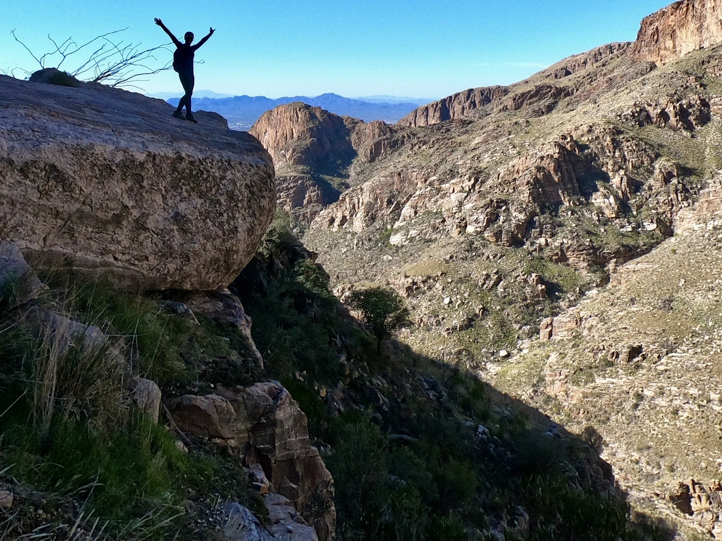 As the week progressed, we made some more plans to hike with Katie again. This next adventure was up to Finger Rock for a beautiful hike in the Santa Catalina Mountains. The hike was a gradual climb into a valley up in the foothills. We worked up to a ridge line and made a loop back to the parking area. We did around 8 miles of hiking and around a thousand vertical feet of elevation gain. At one point, we found ourselves making our way up the trail and came to an area that looked like a scramble up a small wash on the hillside. A couple groups were ahead of us, so we continued behind them and worked our way up the scramble. As I pushed up, I started to pass people. At one point a group looked at me and said, “See there are other people hiking this way. This must be the right way.” That was my first sign that something was not right. The next moment was when I had reached the top of the wash and there was no trail going anywhere. There was another group at the top with me coming to the same realization; that we had gone the wrong way. The trial was about 300 feet below us. I thought I might be able to cut down to the trail at an angle and not have to go back down the wash I had bear crawled up, but after one step I was covered in sticky burrs. I immediately stopped and called to the girls to turn around and head down. This was a sign to everyone on the wash that we were all going the wrong way. This was a perfect example of Conformity. We saw other doing something and just thought they were right, when they were far from right. By the time I got back to the bottom of the wash, it was obvious that the trail continued straight from the point we turned right to go up the wash. Once we got back to the trail we were happy to have found the right direction, but had expunged much more effort than we should have at this point. We changed the name of the trail from Finger Trail to Middle Finger Trail! We had a good laugh and continued on our hike. After this mistake, it was smooth sailing and a beautiful hike. We came across some really cool vantage points where rocks jetted out over the valley and looked like you were standing on the edge of a high-rise building. We apricated that Kaite did not judge us for our wrong turn, but instead laughed with us about it for the rest of the hike. It’s good to have fantastic trail friends who will go through some crap with ya, and come out laughing on the other side. She fully knows how to Live Rad!