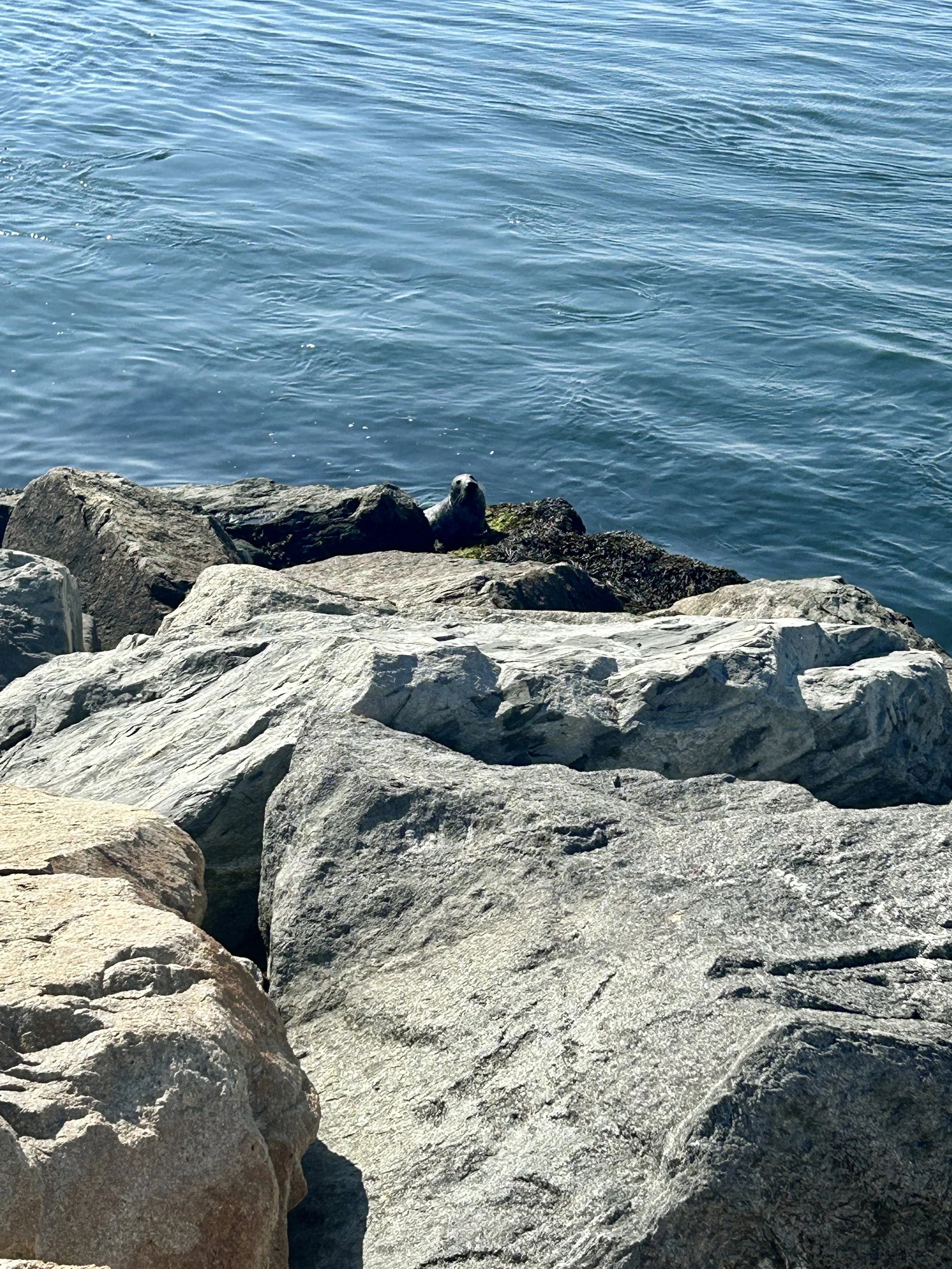 For Briley’s last day, we decided to spend the morning on the Cape Cod Canal, check out Scusset Beach, and then head up to Boston for the night. As usual, we started with a run. I’ve loved running along the canal and was excited to share it with Briley. It’s a scenic trail that starts and ends at one of our favorite beaches—Scusset Beach. After our run and some cool-down time in the car’s AC, we walked down to the beach. Amity and Briley had been unable to walk out on a jetty in Nantucket because of the tide, so we gave it another try here. As we walked out, we found ourselves in the middle of a cicada hatch. There were several screams and flailing arms as the bugs flew into our faces, adding a wild twist to our already tricky rock-hopping walk. We made it safely to the end of the jetty when Amity suddenly said, “Oh hey! Look right there!” Sitting on one of the rocks was a seal. What a perfect way to end Briley’s Cape Cod adventure. We hung out with him for a bit before braving the cicada gauntlet back to the car.