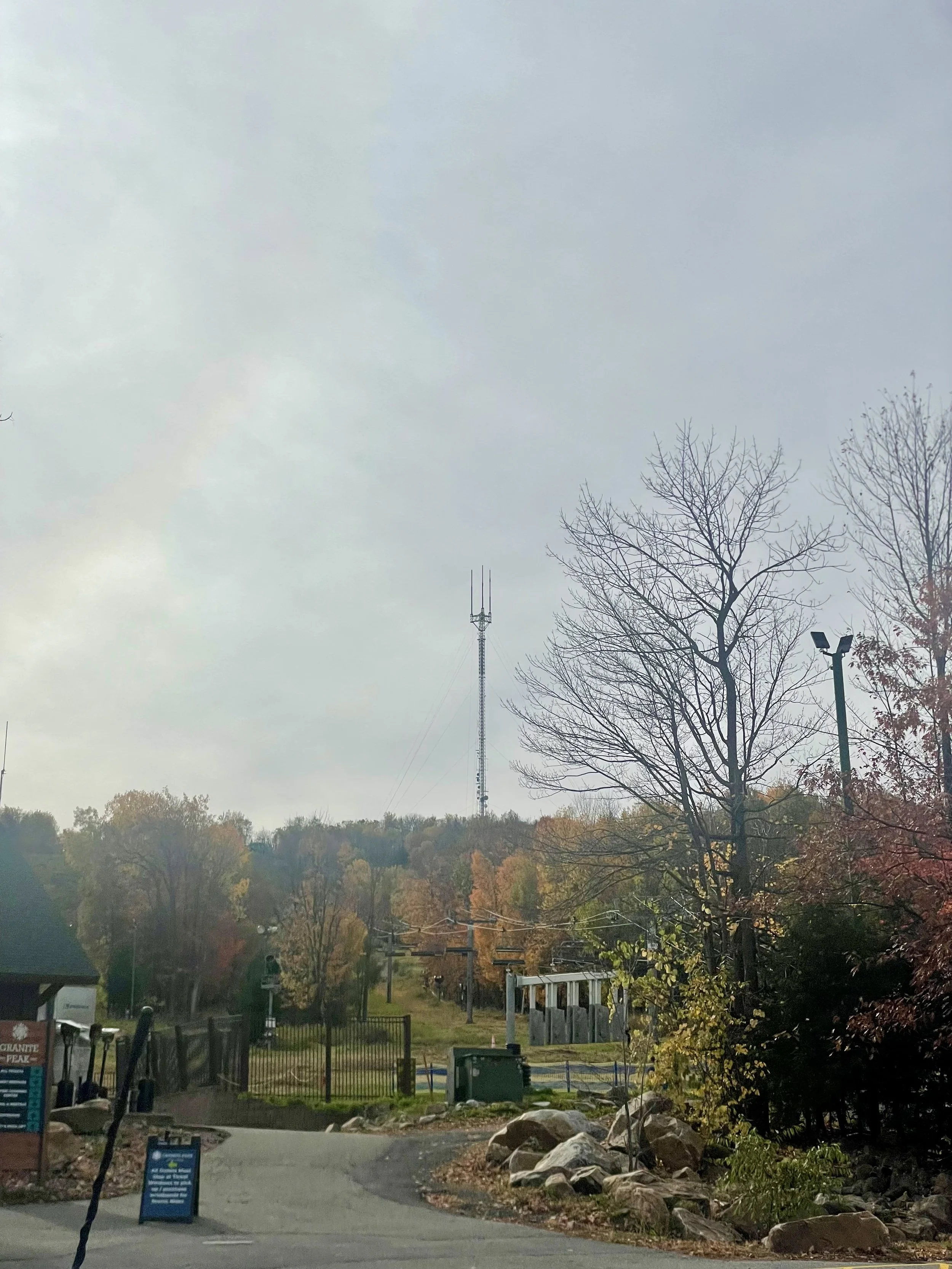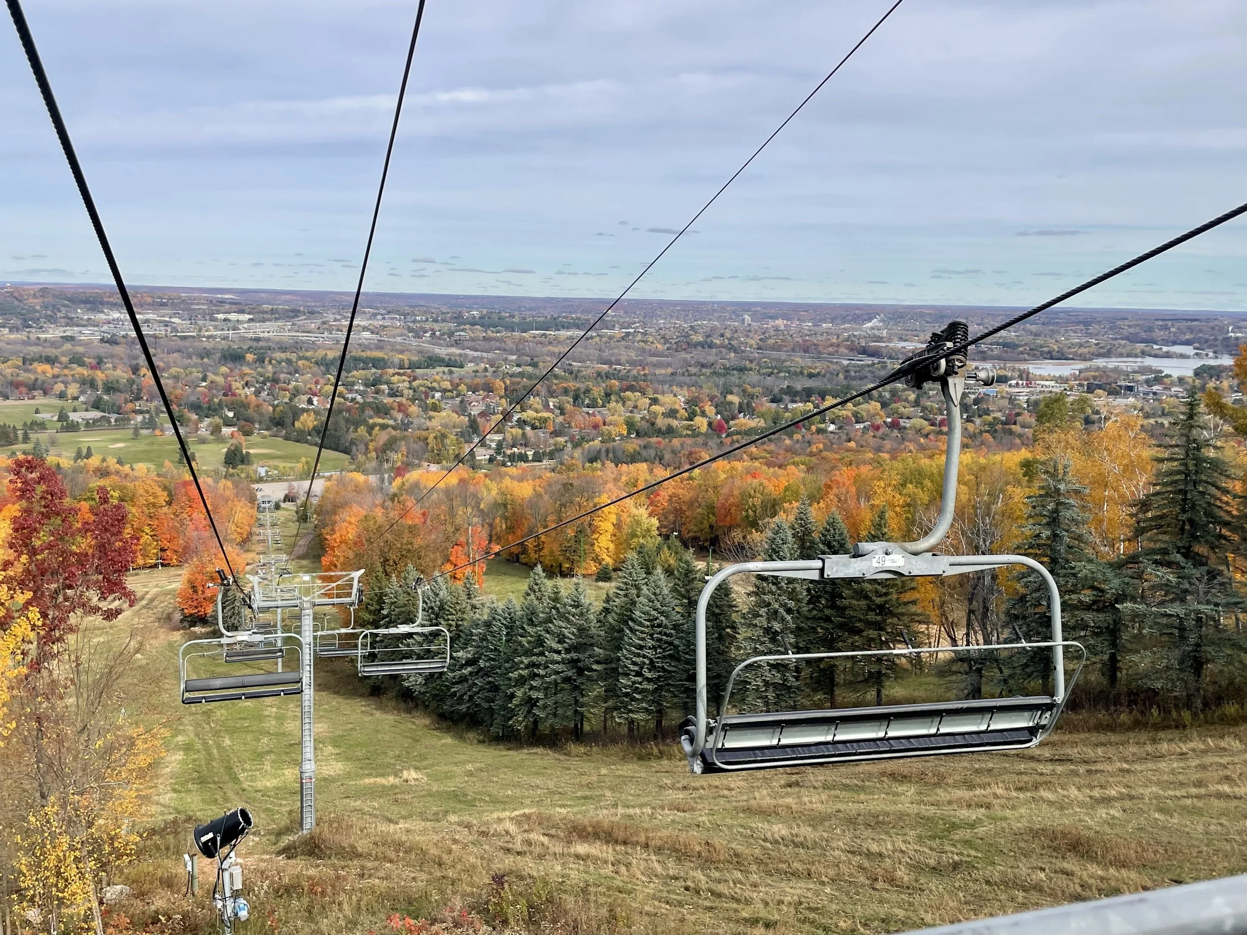 After our trip up to the Upper Peninsula in Michigan, we wanted to keep things a little more local. After some quick research, we found that a ski hill west of us does annual fall foliage chairlift rides. The ski hill is called Granite Peak and is just outside the town of Wausau, WI. We picked the perfect day to head over. The weather was crisp, and there was no incoming rain or wind. This made for a perfect day to explore the mountain. Our plan was to ride the chair up and then do some hiking around the top of the “mountain.” The ski hill was pretty small but had a little more of a village feel than some of the hills we had visited in New England. After getting on the chair, we were greeted with beautiful oranges and yellows in the trees. The leaves were slightly past peak, but the trees still held quite a bit of color, and the ground was covered in a vibrant array of fall leaves.