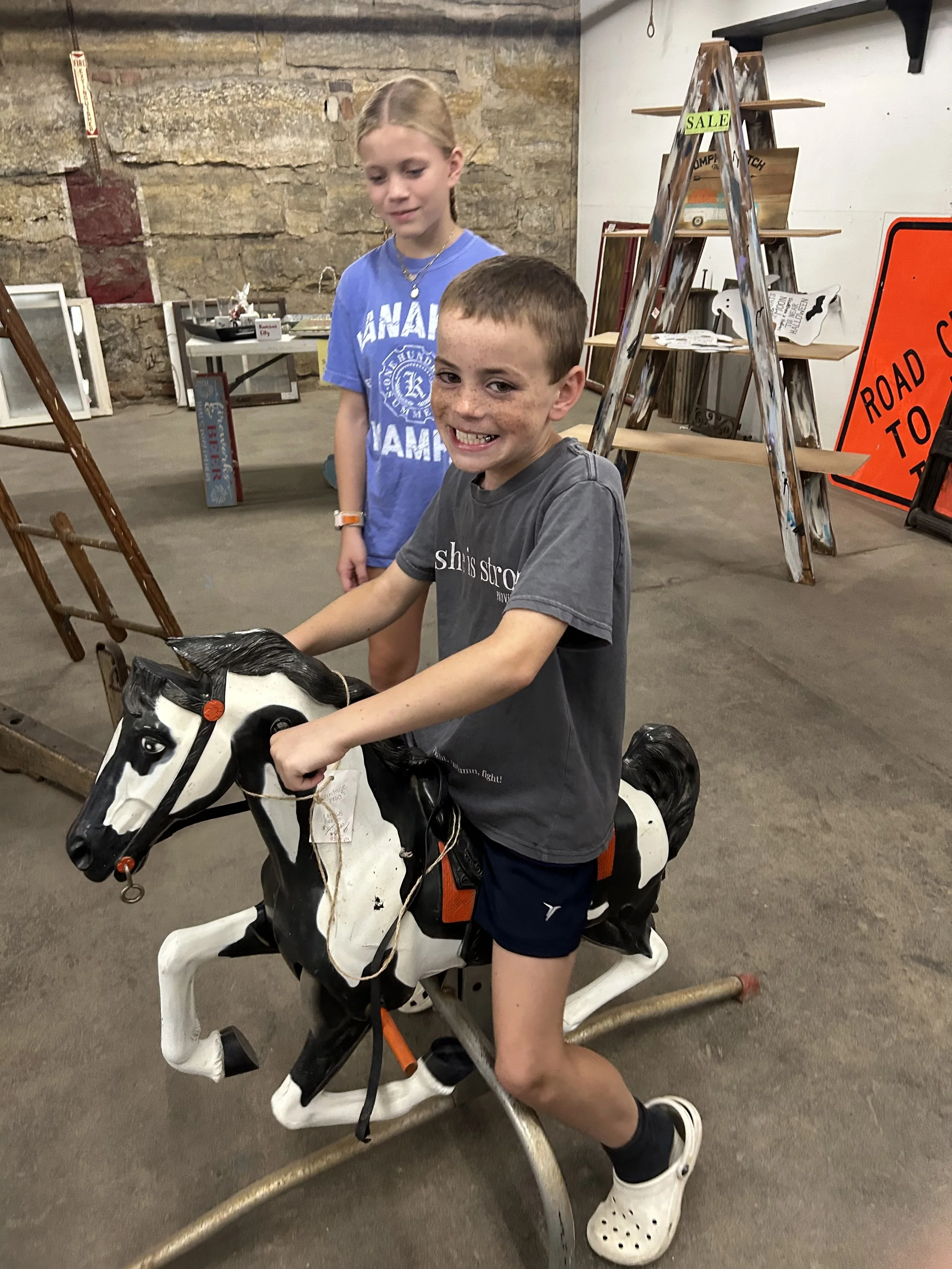 We started the next morning with a high school cross-country race that Baylor was running in. He has been progressing a lot over his freshman year, and we were excited to be there to see him run. One of the most exciting parts about being at a cross-country race is running around with the parents and spectators from place to place to cheer along the way. Andy knew the course, so we just followed him. We all had some good laughs while navigating the mass of people, getting around the course, and making sure we didn’t run into any actual racers (Atticus nearly did!). The race was quick and Baylor did great! He was happy with his time and place, which is great to see—his realistic approach to running and focusing on his own performance level instead of solely on winning. After we got back to their house, we regrouped and headed down to the West Bottoms area of Kansas City. Amity had found a Halloween-themed event that was supposed to have trick-or-treating for the kids and some shopping. Turns out, it was just antiquing, with no candy… total false advertising! We still had a good time showing the kids old things and explaining to them that their mom, dad, grandparents, and even we have used some of these things (like a typewriter). We found some good humor in that! The night ended with dinner back at their house, followed up with our obligatory trip to Andy’s Frozen Custard. It truly is the best ice cream (or frozen custard) out there! On the way home, Atticus and Finley took us to the best decorated house we have seen! Bonus points for them for giving us directions in their best British (probably more Australian) accents! Mate!