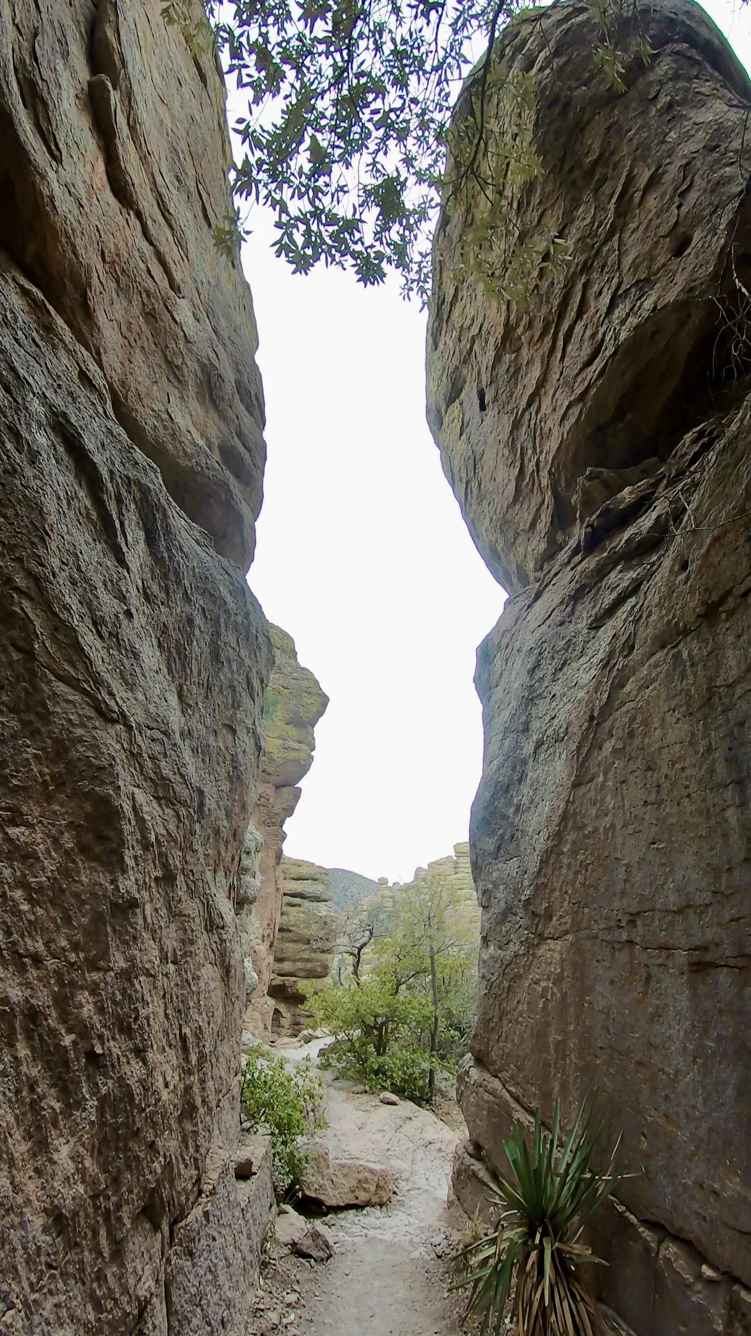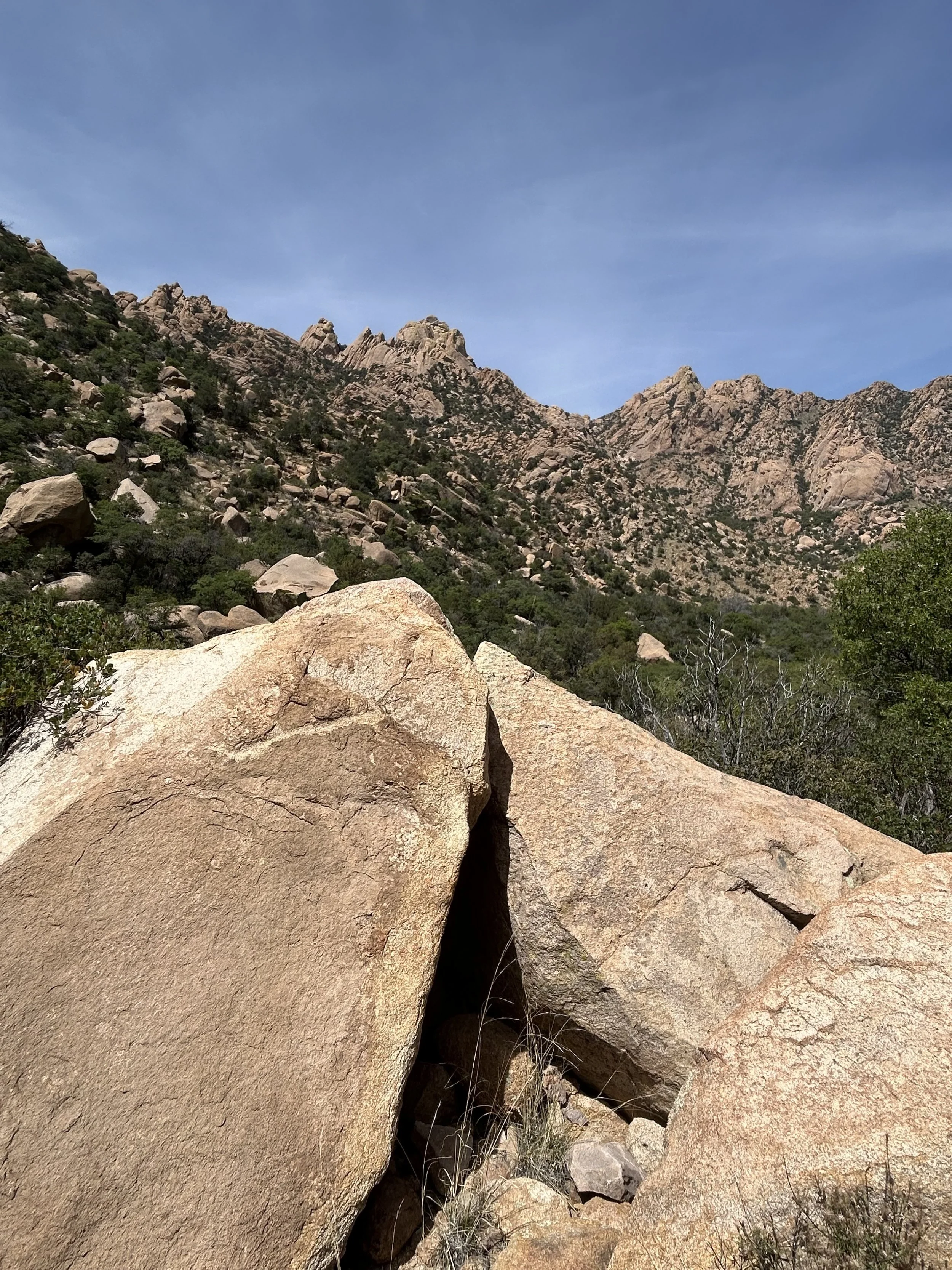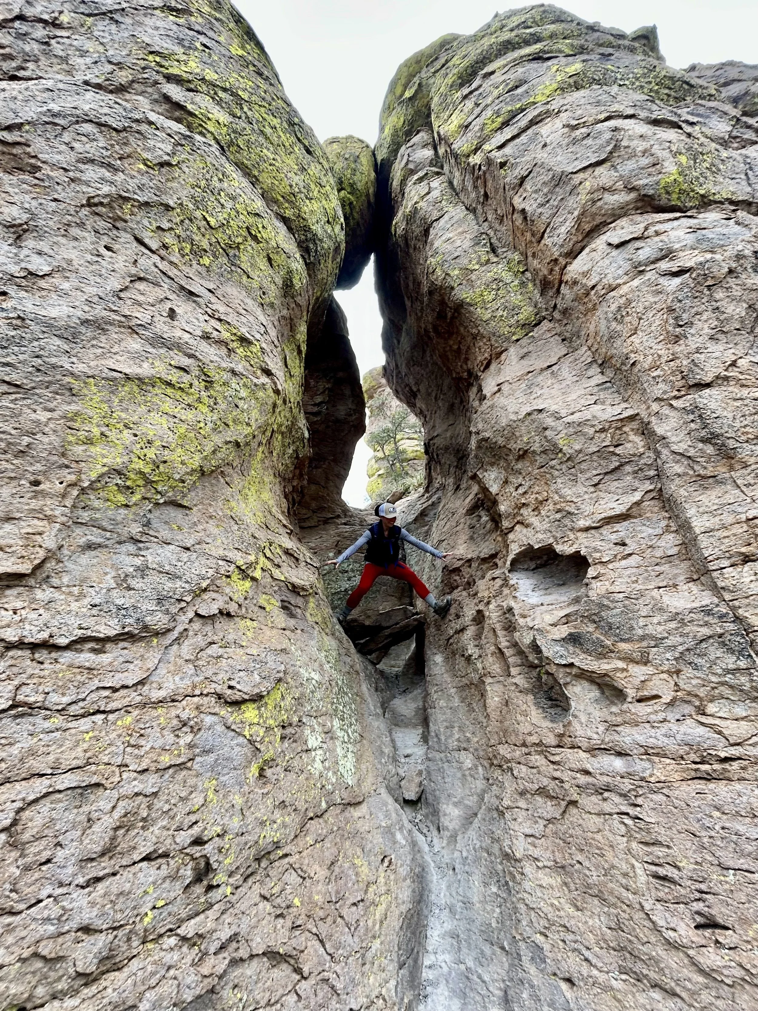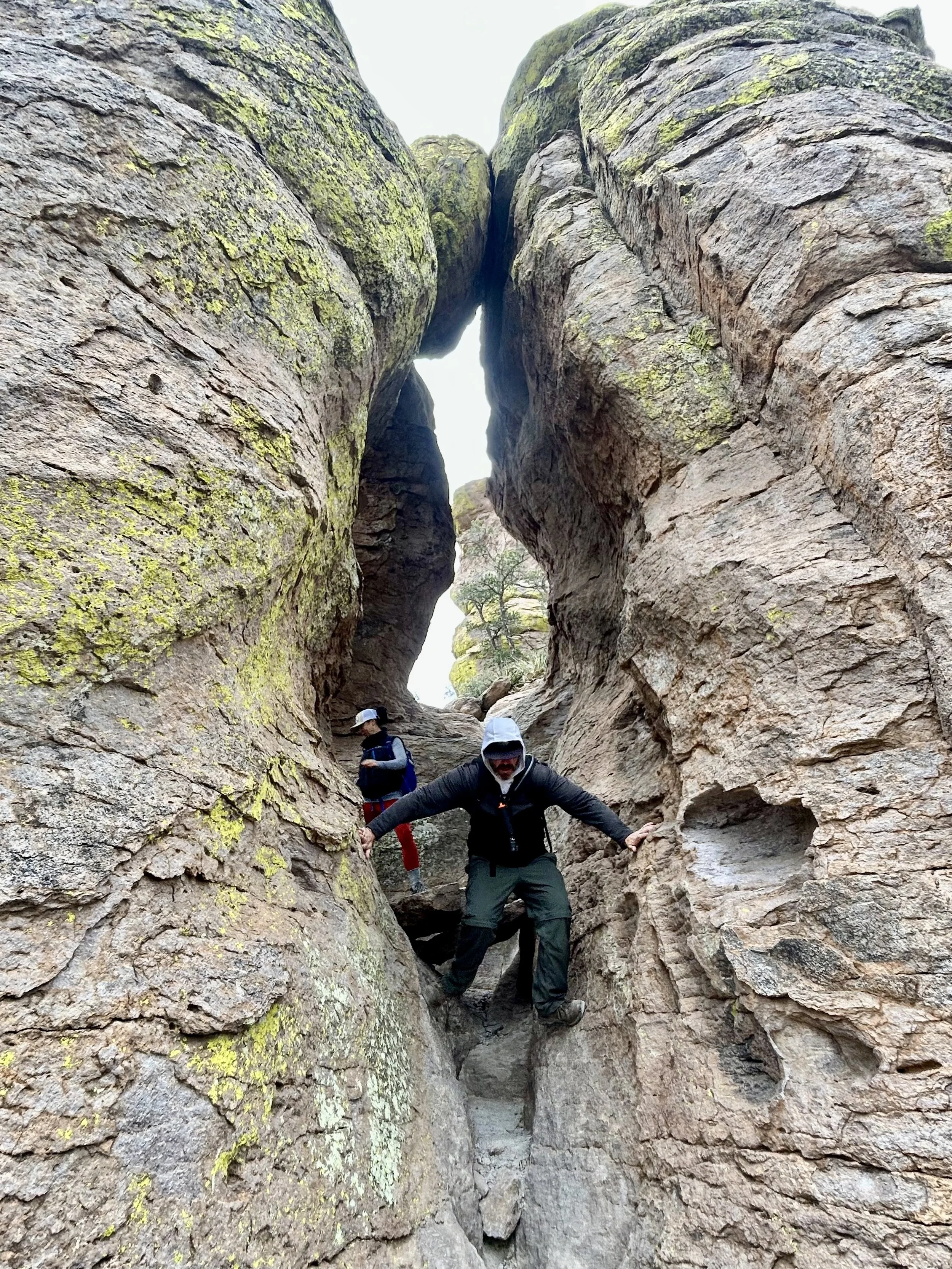 After we made it through the first section of the hike, we found ourselves hiking down into a large valley between the ridgelines we were hiking along. The trail quickly shifted from winding through gigantic rocks to running through trees and lush green undergrowth. One of the biggest things we are going to take from our time hiking in Southwestern Arizona is how green it is here! It’s truly crazy to be hiking along and have ferns on one side of the trail, prickly pear cacti on the other, and pine trees jutting up everywhere. We did not expect this element! As we worked our way back up the other side of the canyon, we came across a fork in the trail. The path was supposed to go right, but we decided to take the left and add a quick loop to our hike. The loop was called the Heart of the Rocks Loop. There was an older lady resting on the trail at the beginning. As if she was the gatekeeper of this zone, she told us, “You are going to want to do this.” She was not wrong! This was by far the coolest zone on the entire hike! At one point, I was just walking around the hoodoos and formations, not knowing or caring if I was on a trail. The route took tight turns, worked between twenty- to thirty-foot-tall rock formations, and up onto a mesa in the middle of the trail. The maze ended up taking us all to the same place, and we took some time to snap some group pictures and take it all in. There are a lot of legends in the desert about mazes and getting lost, only to truly find yourself. I felt this along this hike several times.