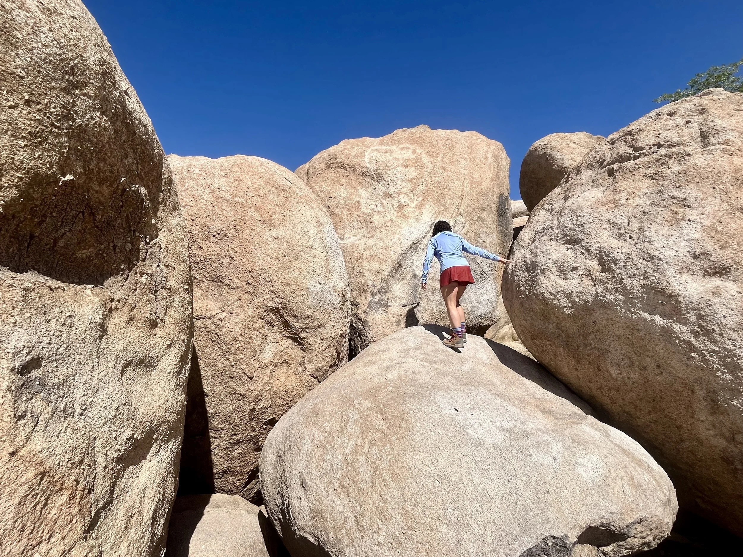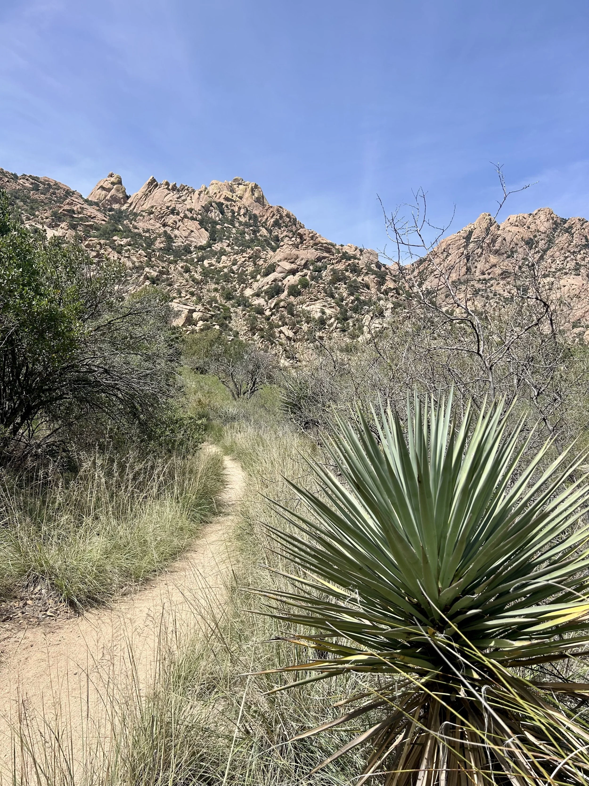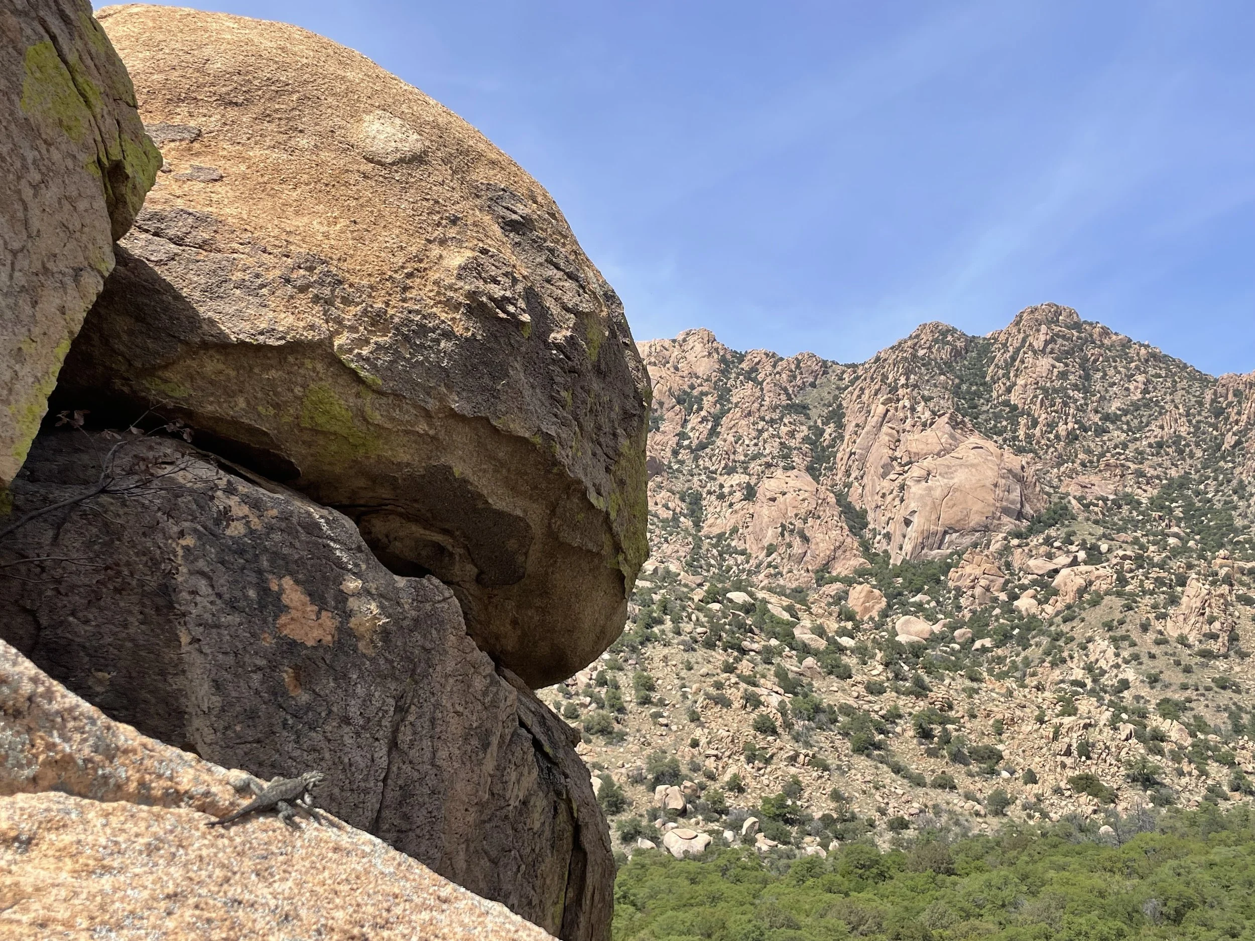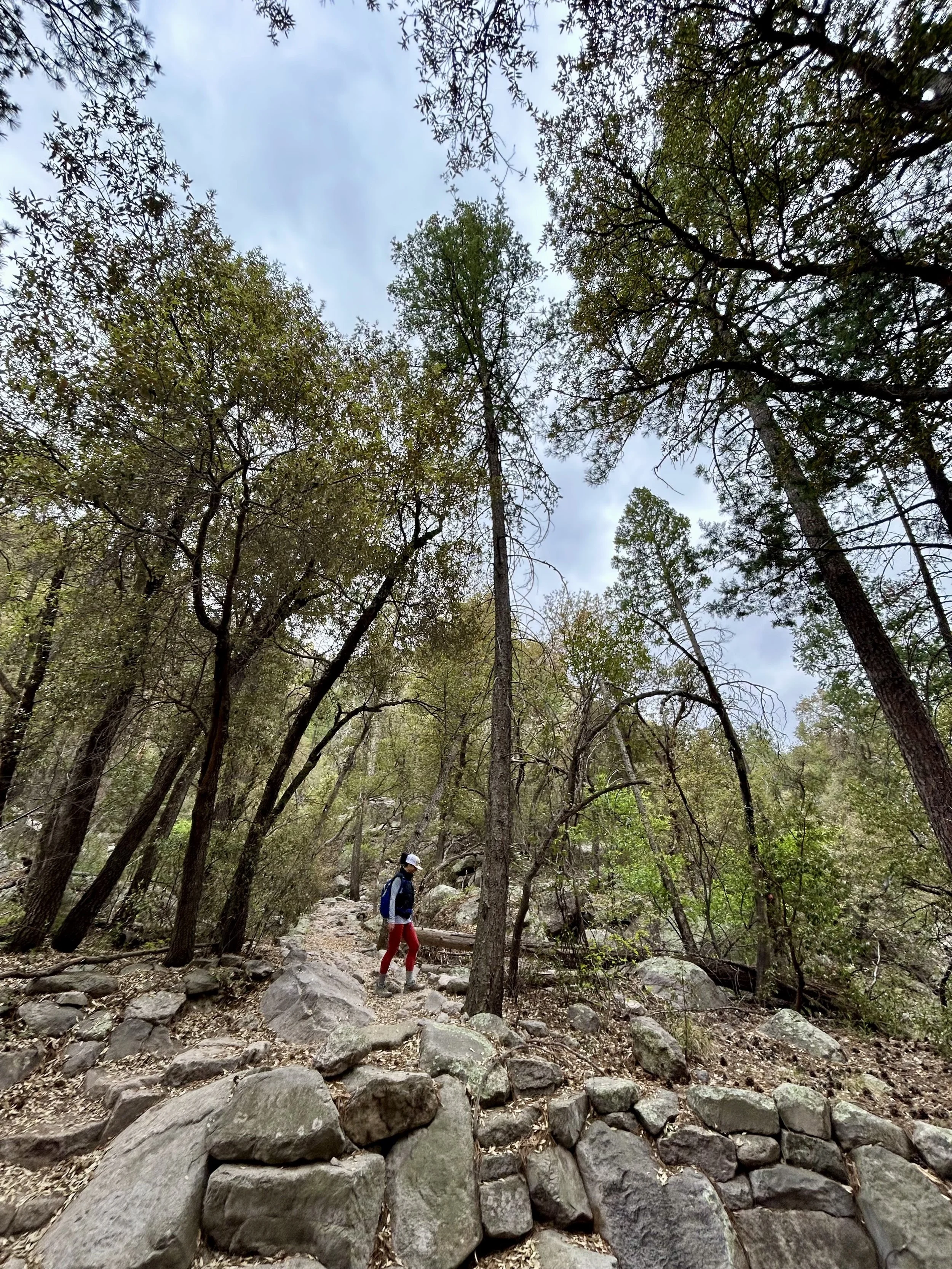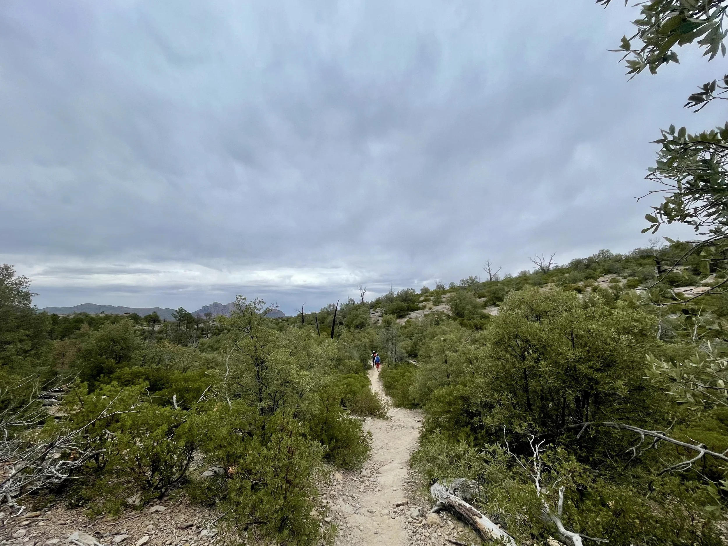 After we made it through the first section of the hike, we found ourselves hiking down into a large valley between the ridgelines we were hiking along. The trail quickly shifted from winding through gigantic rocks to running through trees and lush green undergrowth. One of the biggest things we are going to take from our time hiking in Southwestern Arizona is how green it is here! It’s truly crazy to be hiking along and have ferns on one side of the trail, prickly pear cacti on the other, and pine trees jutting up everywhere. We did not expect this element! As we worked our way back up the other side of the canyon, we came across a fork in the trail. The path was supposed to go right, but we decided to take the left and add a quick loop to our hike. The loop was called the Heart of the Rocks Loop. There was an older lady resting on the trail at the beginning. As if she was the gatekeeper of this zone, she told us, “You are going to want to do this.” She was not wrong! This was by far the coolest zone on the entire hike! At one point, I was just walking around the hoodoos and formations, not knowing or caring if I was on a trail. The route took tight turns, worked between twenty- to thirty-foot-tall rock formations, and up onto a mesa in the middle of the trail. The maze ended up taking us all to the same place, and we took some time to snap some group pictures and take it all in. There are a lot of legends in the desert about mazes and getting lost, only to truly find yourself. I felt this along this hike several times.