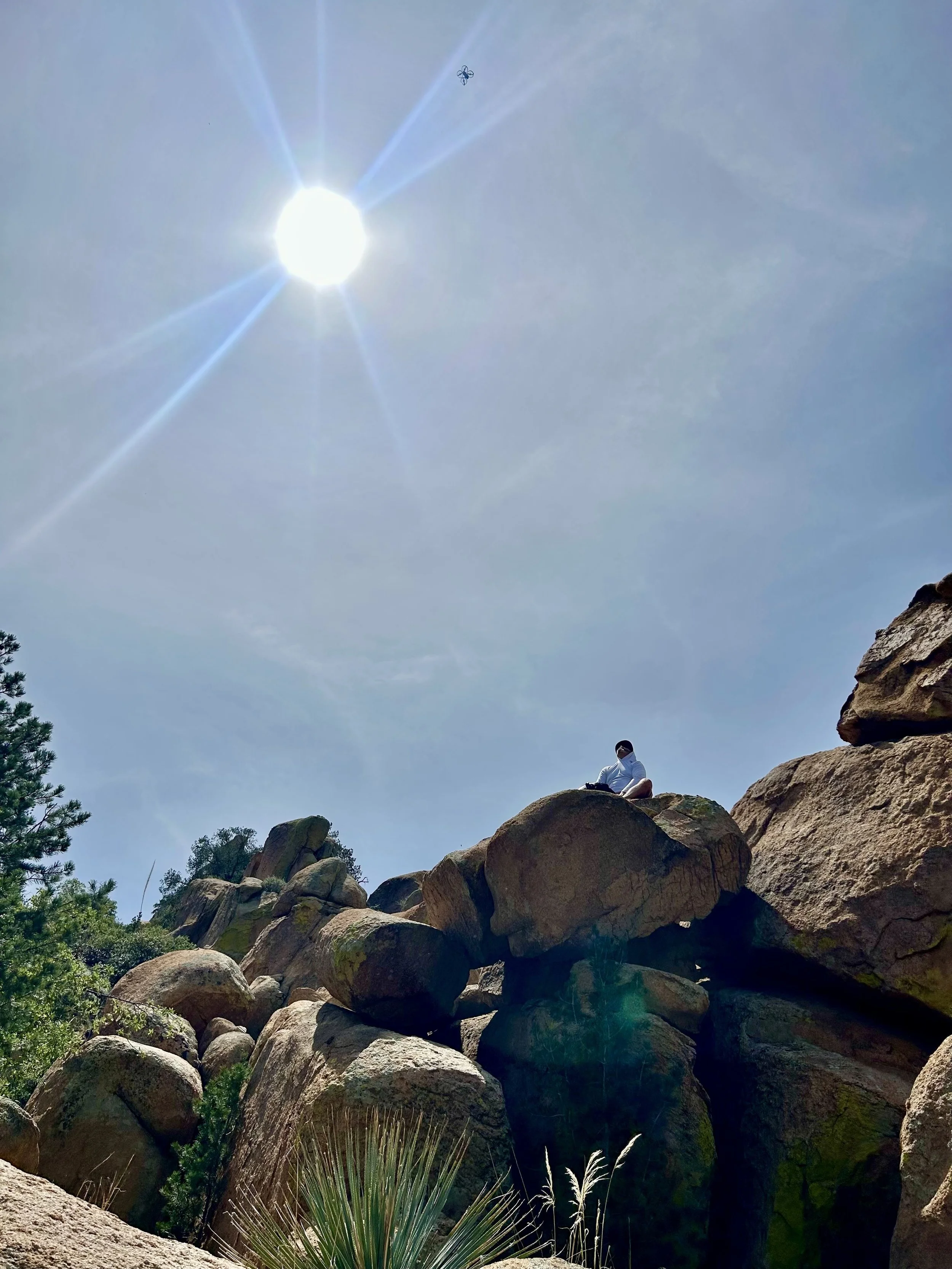 The national monument’s closest town is Wilcox, AZ. We found a KOA in the area where we could reserve a campsite. We all set out towards Wilcox and rendezvoused about an hour outside of Tucson before heading slightly south and off the path to check out another area of the state. Amity and Katie had found a zone called Cochise Stronghold. We drove along some desert dirt roads up into the foothills of a rugged mountainside and small canyon. We passed some off-grid houses and spent a good amount of time wondering what it was like to live off-grid in the desert in the summer. This area was very green, which means there is a water source somewhere, but it has to be some of the more rugged off-grid living. At the end of the road is a small campground. We parked right next to a truck with Montana license plates, which was rad! The area was so lush, green, and covered in fairly large trees. This was not the typical desert scenery and made it clear why this area is a recreation hub! As we set out on a small hike around the area, I split off from the girls and flew my drone around. As I did this, I found a path up some large rocks jutting out from the ridgeline. I made my way up there and found a really cool spot to look over the valley. It wasn’t long before Amity and Katie found me and hiked up to join me. We took some pictures and headed back down to the car. We still had another hour or so to get to Wilcox. Arizona is full of hidden surprises!