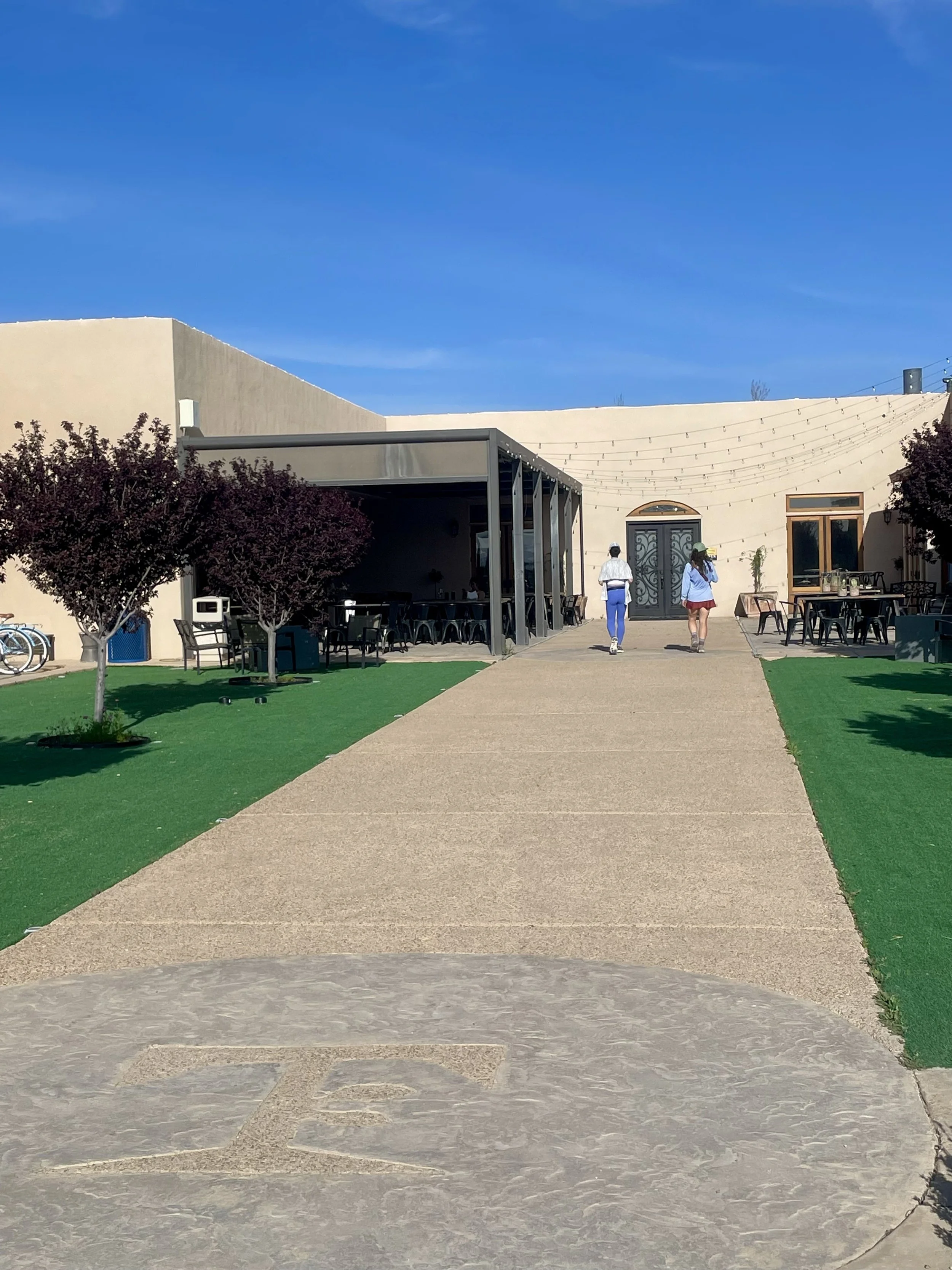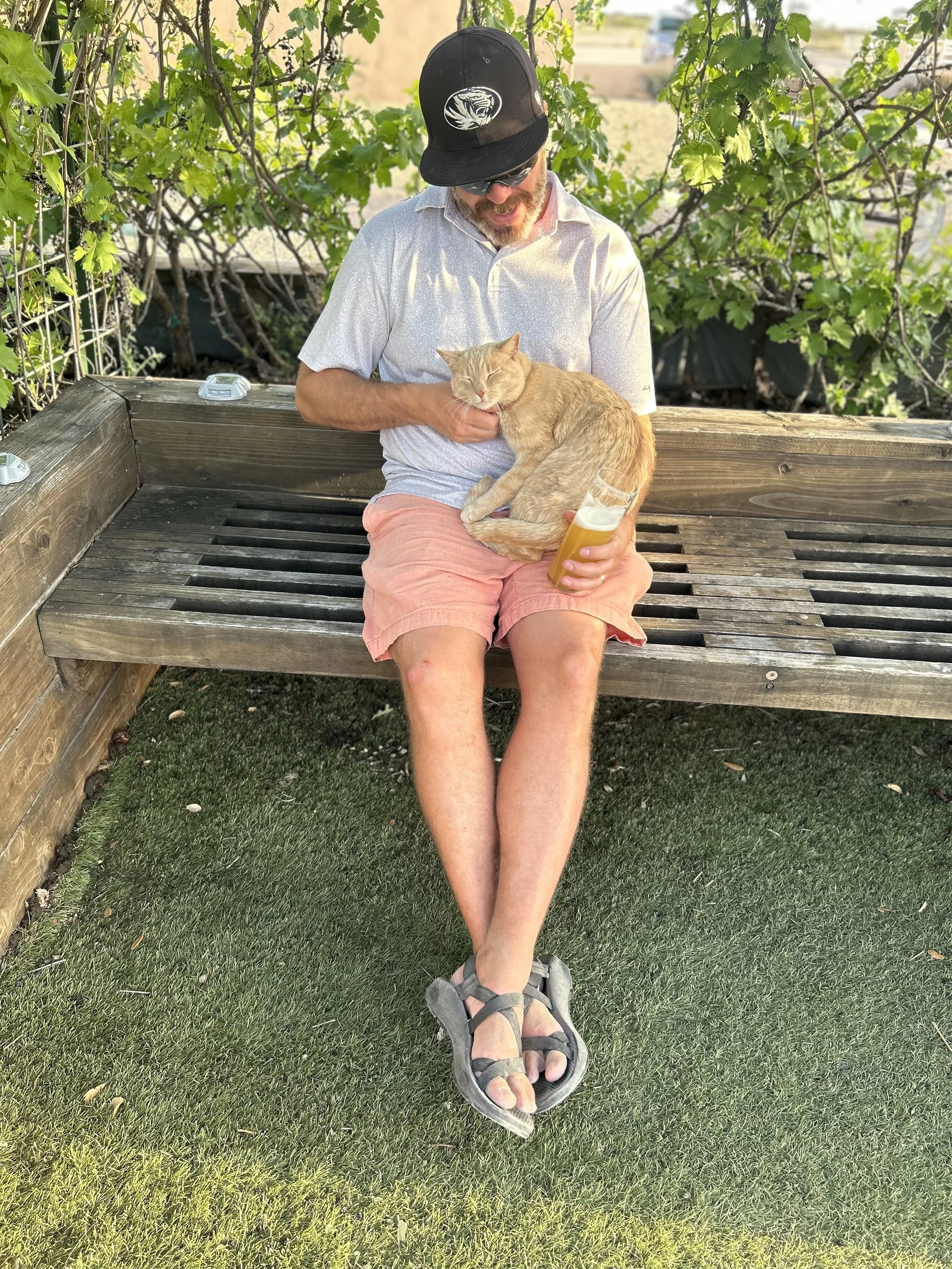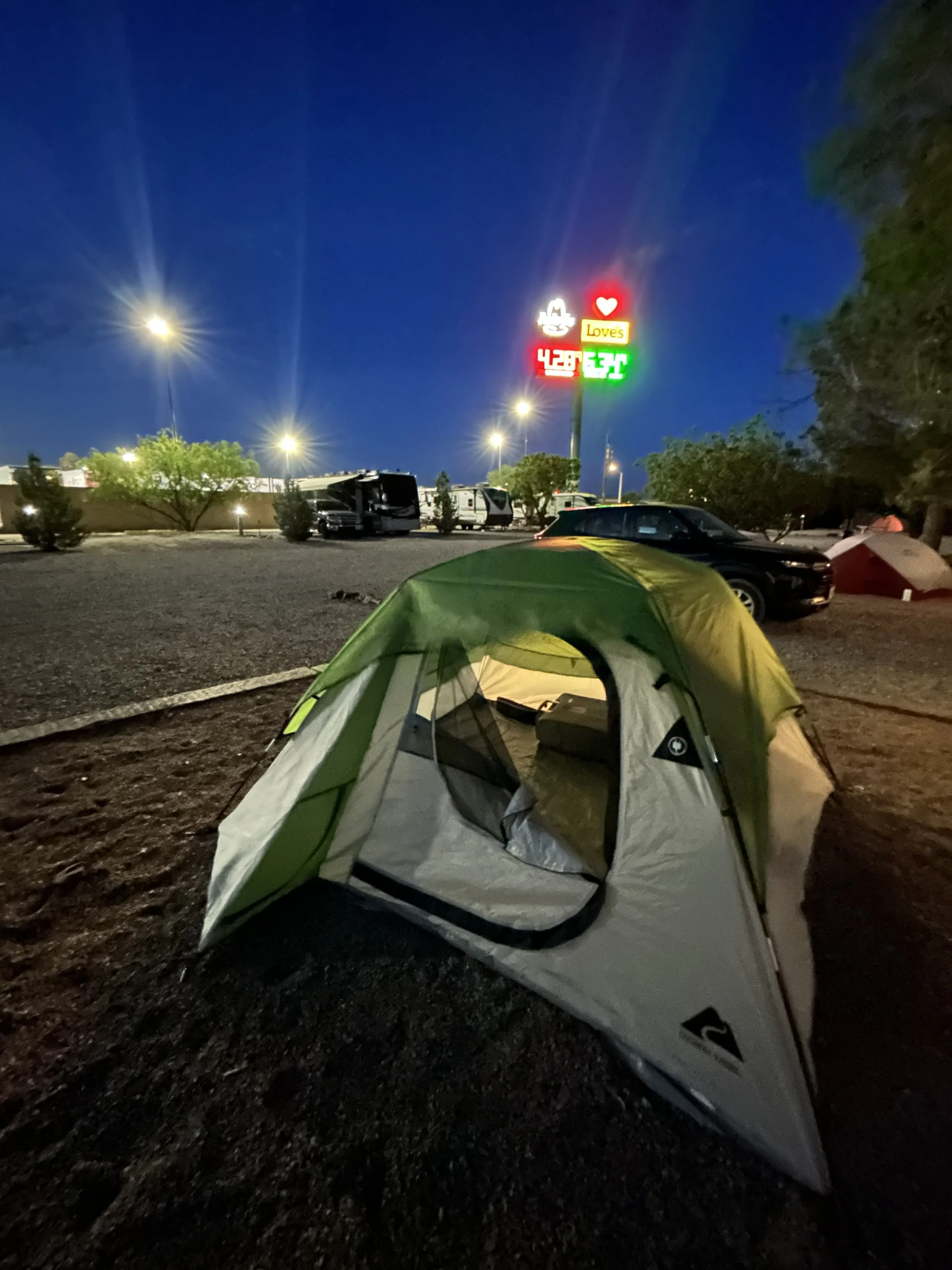 Once we got to Wilcox, we wanted to get our camp set up before we headed out for dinner. Amity had read that the KOA was close to the highway, which wouldn’t be the first time we have been at a KOA like this. The bigger shock was that we were right between the highway and a very large interstate gas station and overnight big-rig parking lot. The gas station had a very large (30’x30’) LED sign right above the campground, which proudly shined LOVE’S and the outrageous gas prices. I have seen a lot, but this was something on a whole different level! Long story short, this KOA should not have campsites and should just do RVs! After getting things set up, we headed to another reason people travel to Wilcox: vineyards! We had a reservation for dinner at a vineyard called Tirrito Farms. We had a little time before the reservation, so I found a quick trail we could walk out to an “animal viewing area.” Wilcox is right next to a massive dried lakebed called the Wilcox Playa. The hike was more comical than enjoyable. We walked through some areas where cows were grazing and eventually got out to a spot where there was a random bench in the middle of nowhere. The best part about it was that we saw two signs there. The first said “The Most Beautiful Views In Arizona,” and the second said “Do not walk out on the dry lakebed.” This spot couldn’t be further from the most beautiful spot in Arizona. I think we have all seen better views of nature in downtown Tucson. We learned that they don’t want you to walk out onto the playa because it is littered with unexploded military munitions from training and testing they used to do out there. Kind of sketchy, but BEAUTIFUL! HAHA! Once we got to Tirrito Farms, we were pleasantly surprised by the area. They have small domes you can rent, a nice pond, and lots of space for guests. We loved dinner! Everything was delicious, and knowing that it all came from this farm was really fun. After dinner, we walked around the area, and I met a farm cat. We became friends! After chasing the sunset down to the playa walk we did earlier, we headed back to our LED-illuminated campground. Before heading to bed for the night, we sat around chatting. At this point, we all saw an owl sitting on a post under the LOVE’S sign. I tried to get a photo of it before it flew away. A little bit later, we saw another owl, or the same one, land in a tree next to us. We were impressed that it was hanging around such a loud and bright area. Pretty cool to see some wildlife in a place like this! That night, we all got a little bit of an LED light tan as we slept under the big bright light!