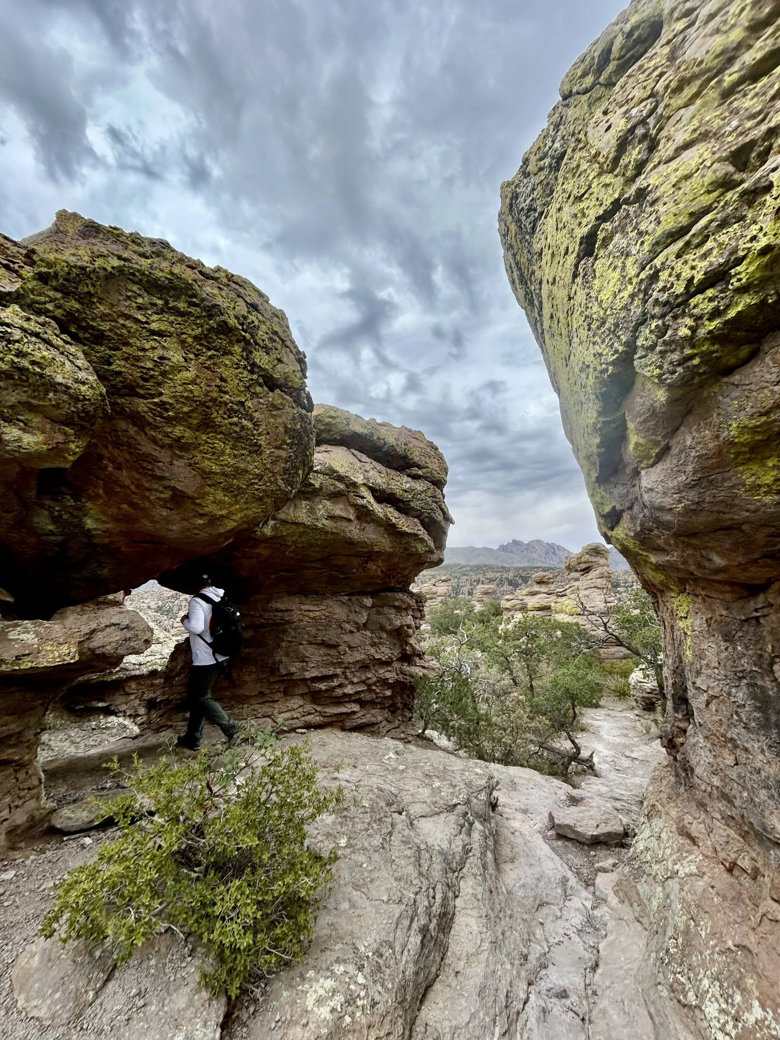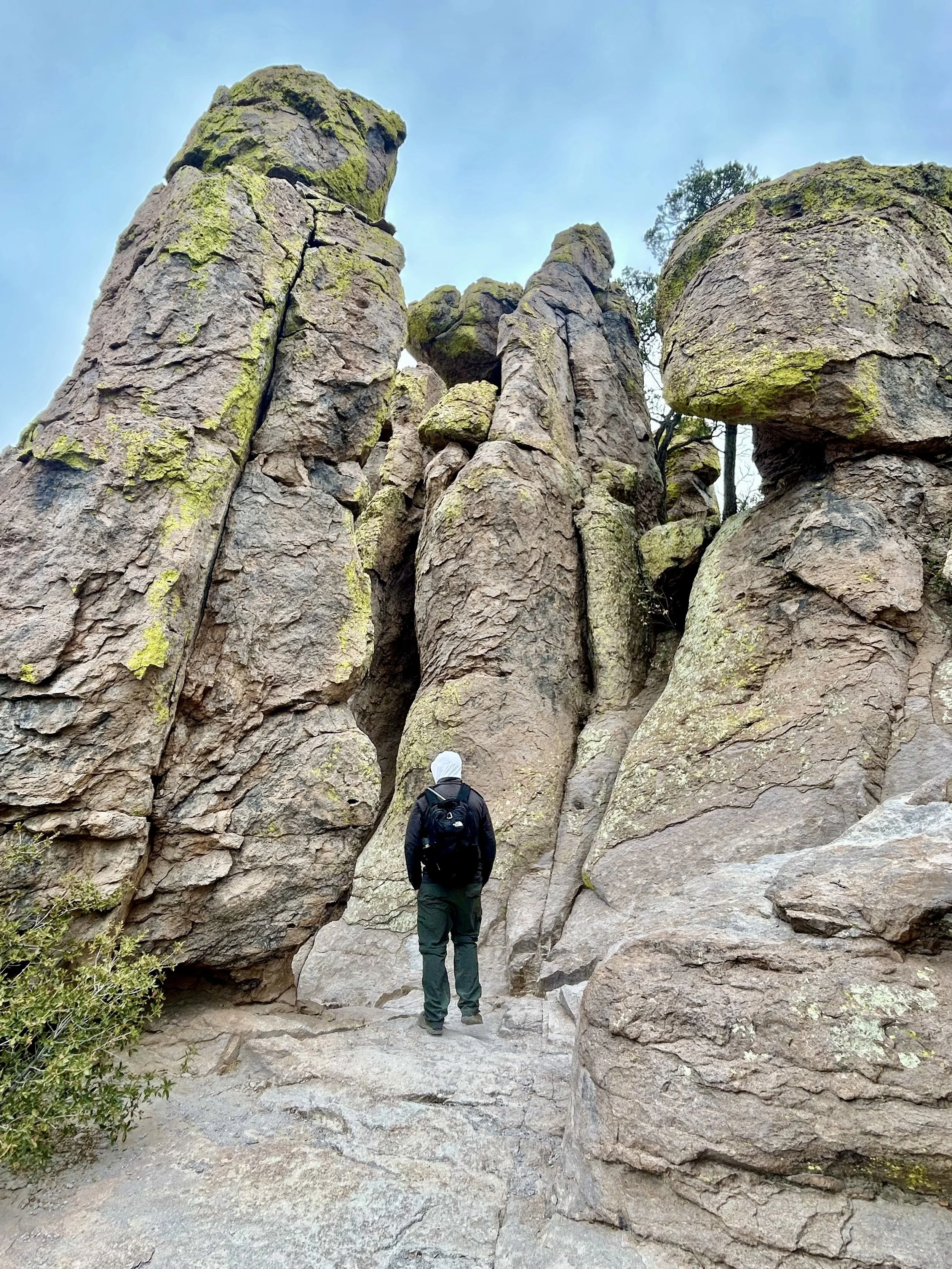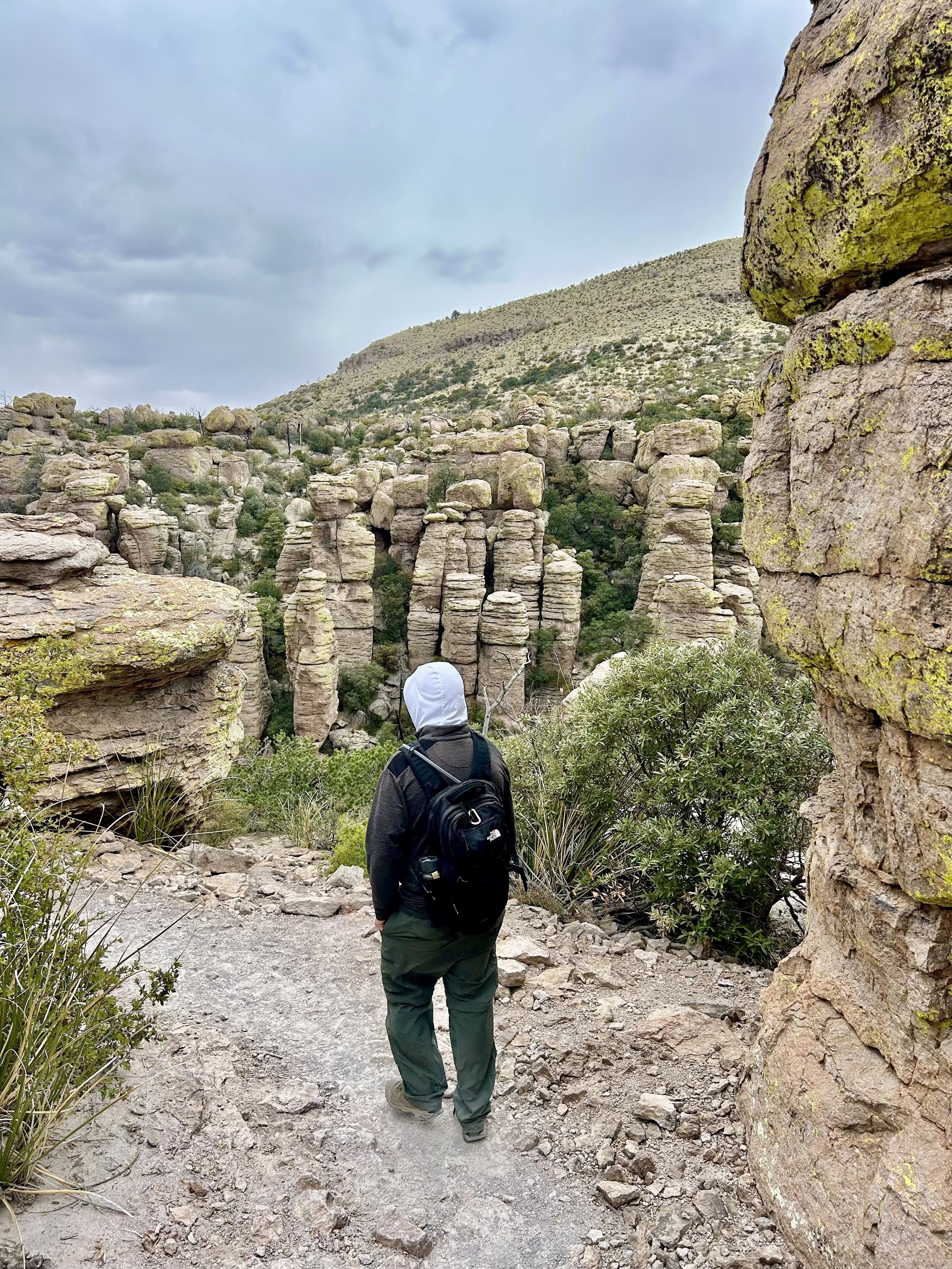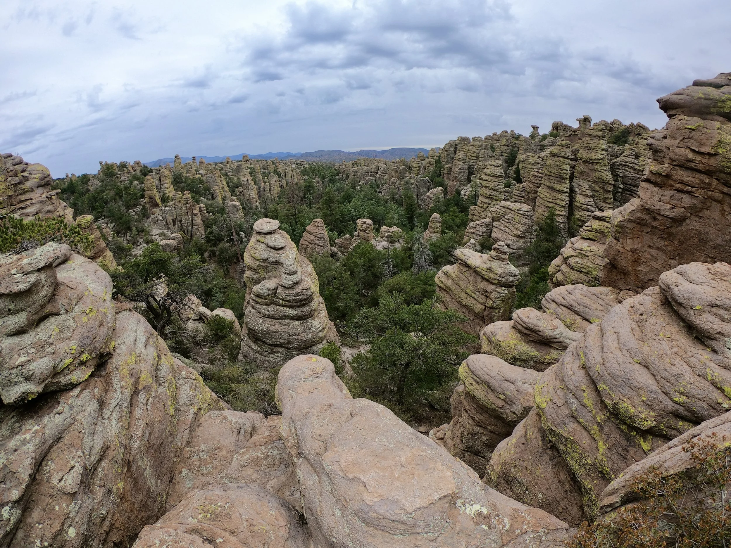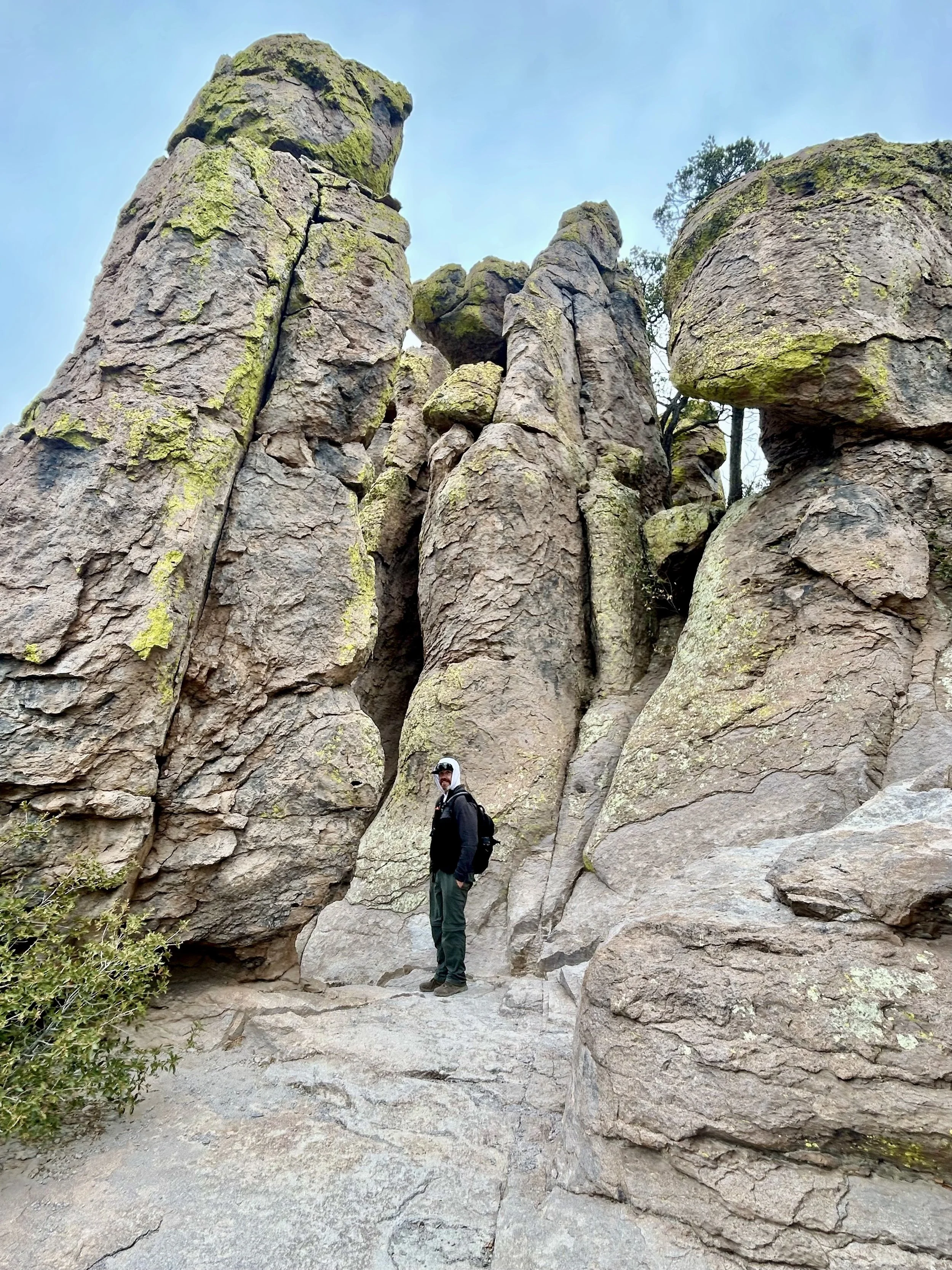 It was not hard to wake up the next morning and get going. We had about an hour-long drive to get us into the Chiricahua National Monument area and up to the trailhead we had planned. We had planned to do the largest loop in the park, which took us all around the rock formations and allowed us to see as much of the area as possible in a single day. The hike was called The Big Loop. It was a slightly cloudy and chilly start to the hike—quite a nice change of pace for Arizona hiking! The hike started up at the top of a ridgeline and worked its way down into a valley, up across to another ridgeline, and back around to where we started. The rock formations started right away and only got better as we moved along the hike. They were formed by accumulating volcanic ash stacking on top of itself. With time, wind, and rain, they slowly eroded into the towers that now exist. The landscape is otherworldly!