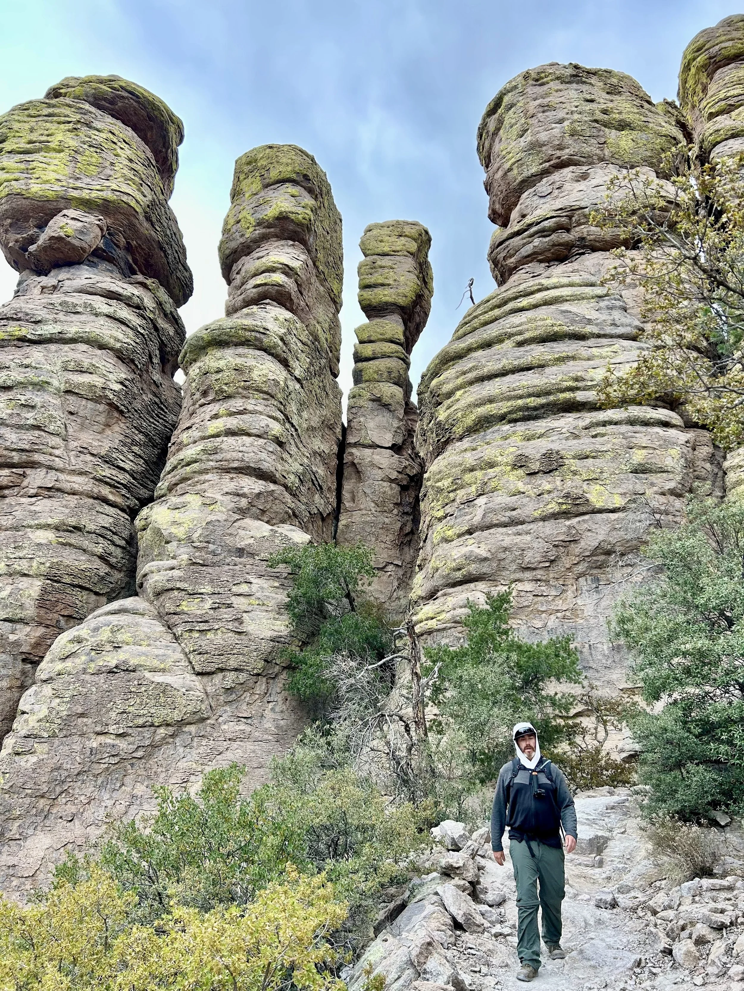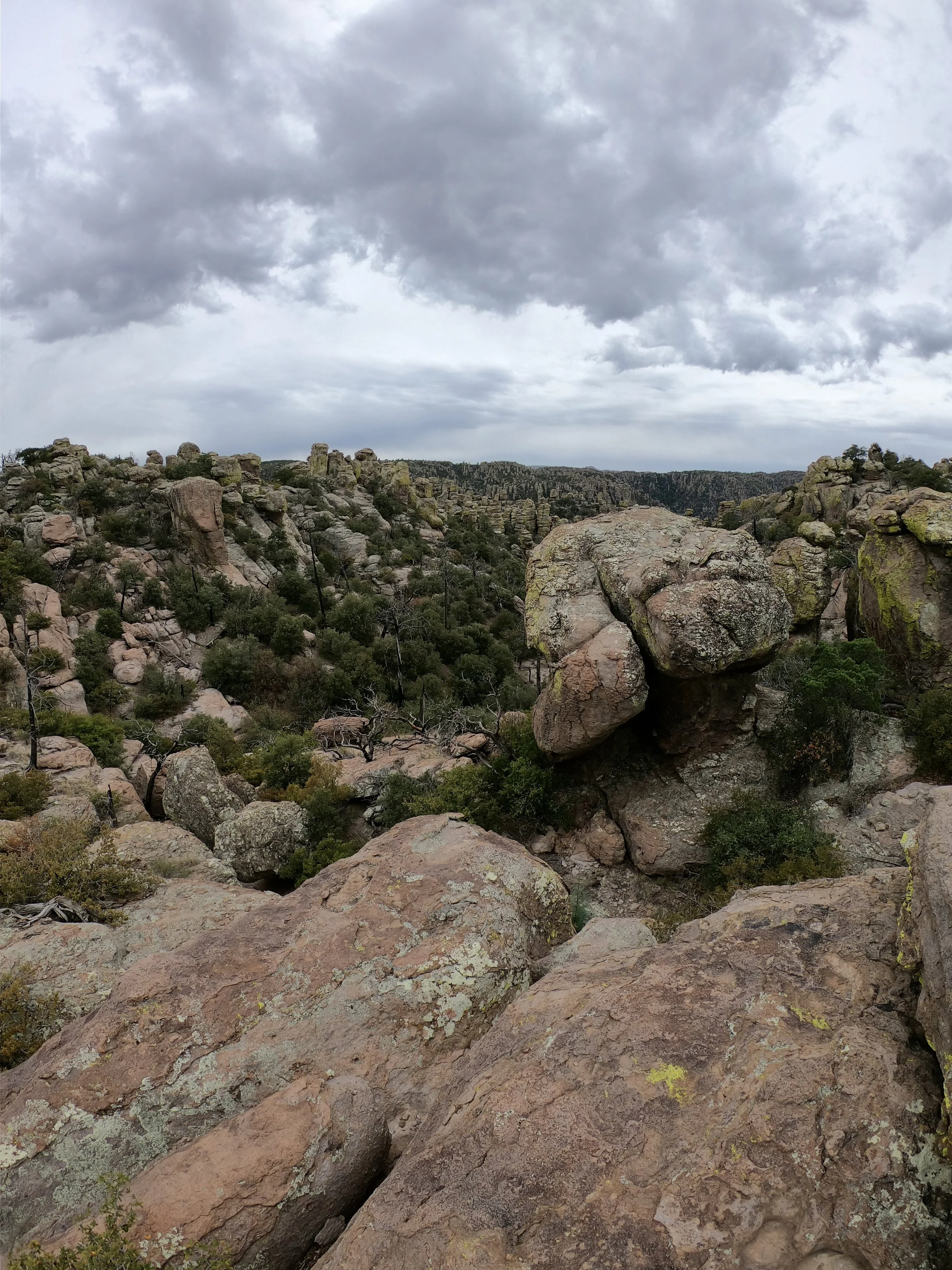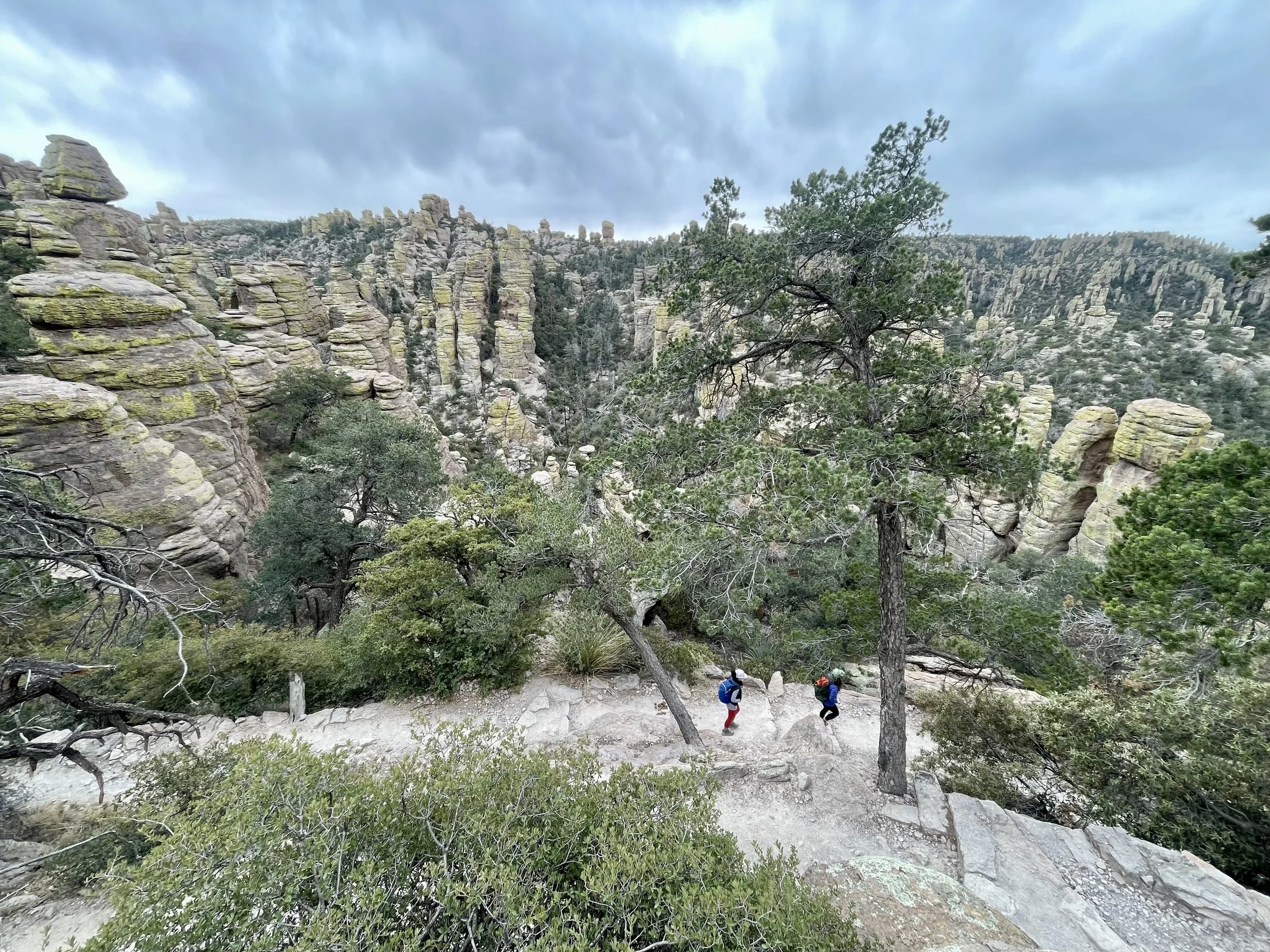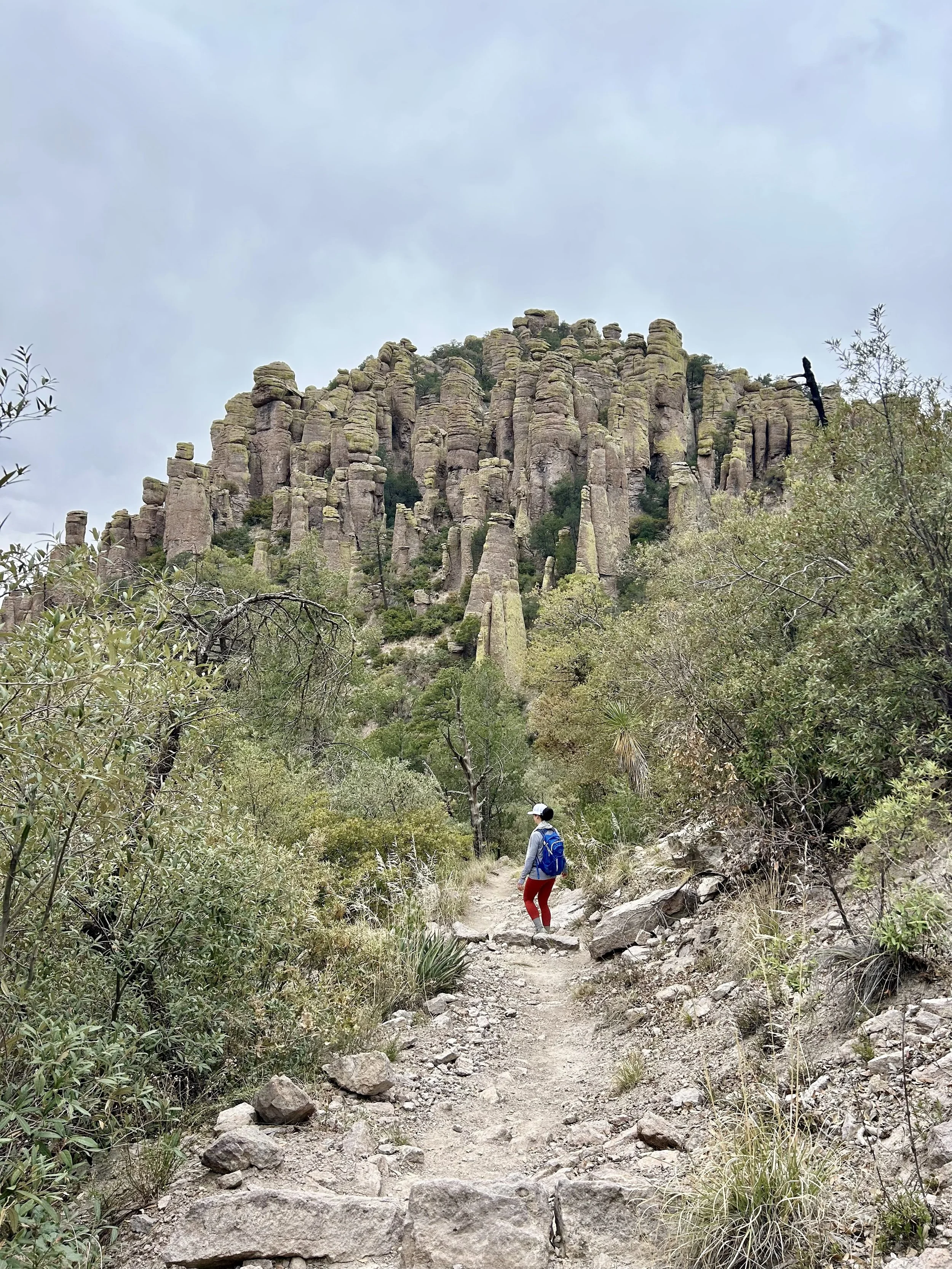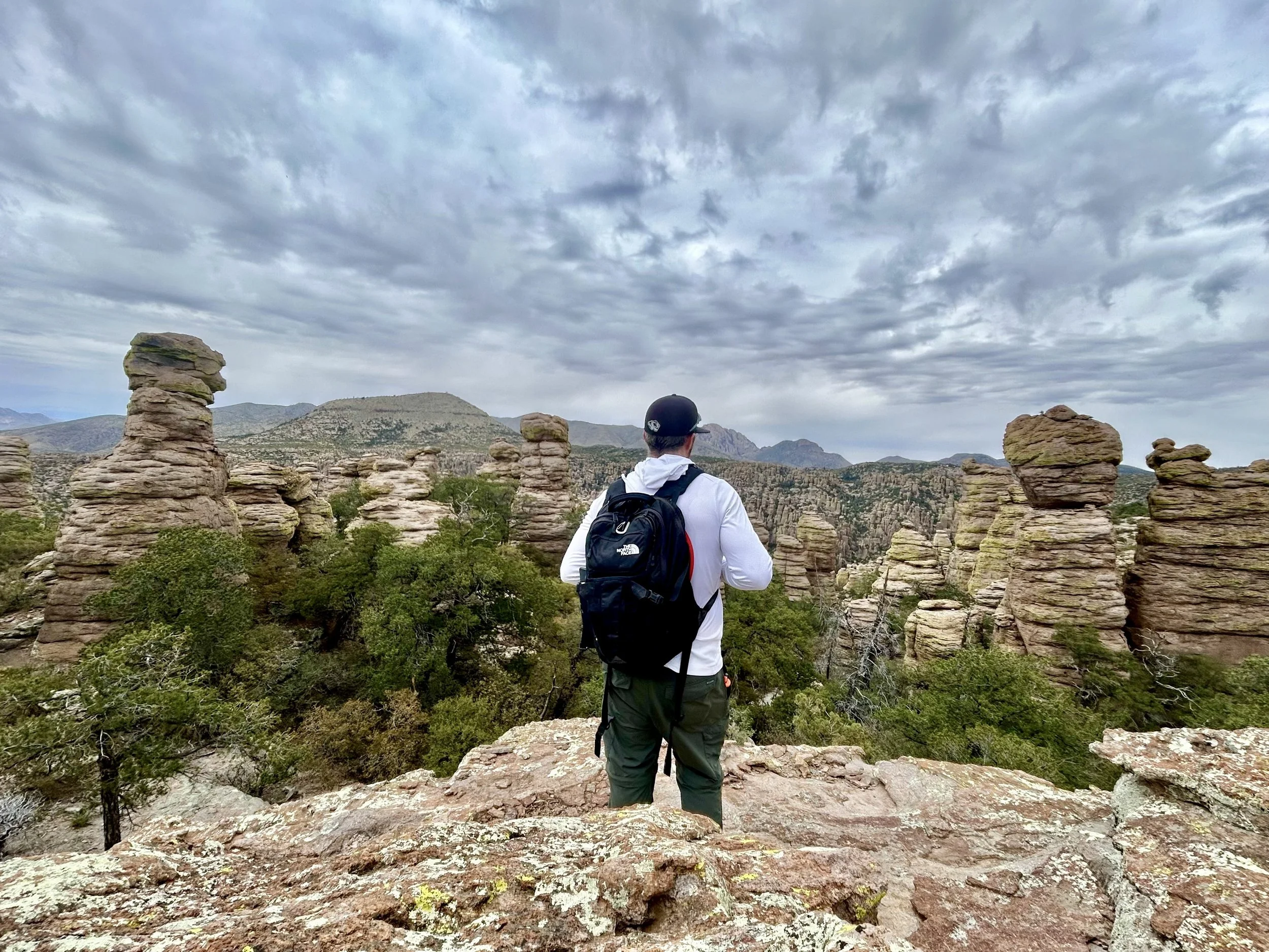 It was not hard to wake up the next morning and get going. We had about an hour-long drive to get us into the Chiricahua National Monument area and up to the trailhead we had planned. We had planned to do the largest loop in the park, which took us all around the rock formations and allowed us to see as much of the area as possible in a single day. The hike was called The Big Loop. It was a slightly cloudy and chilly start to the hike—quite a nice change of pace for Arizona hiking! The hike started up at the top of a ridgeline and worked its way down into a valley, up across to another ridgeline, and back around to where we started. The rock formations started right away and only got better as we moved along the hike. They were formed by accumulating volcanic ash stacking on top of itself. With time, wind, and rain, they slowly eroded into the towers that now exist. The landscape is otherworldly!