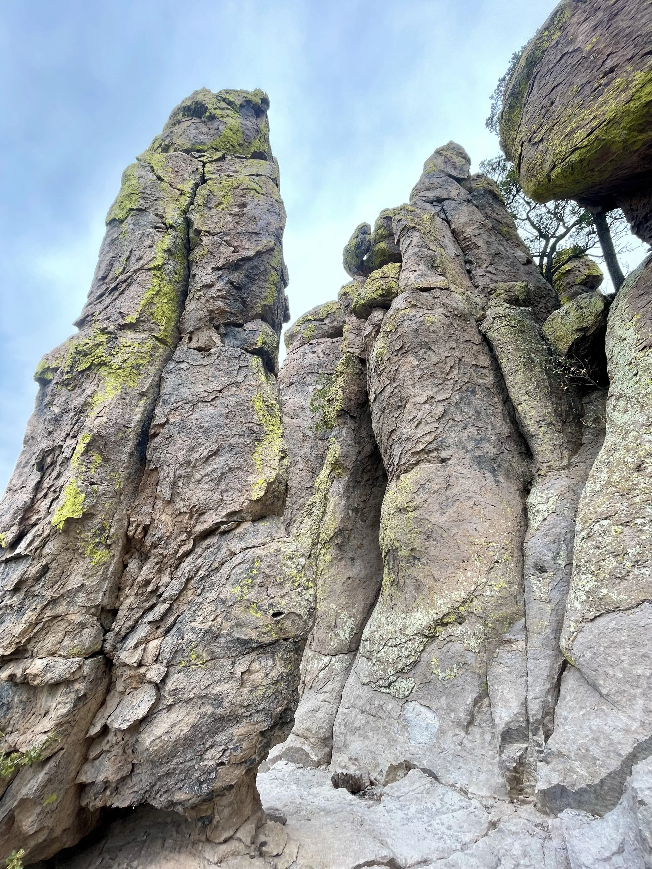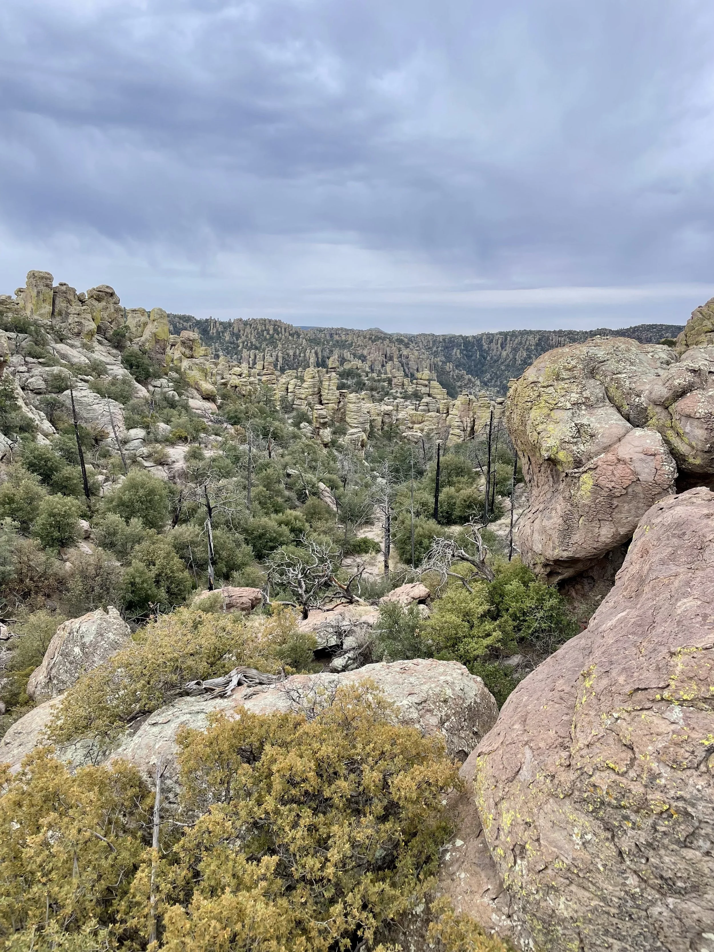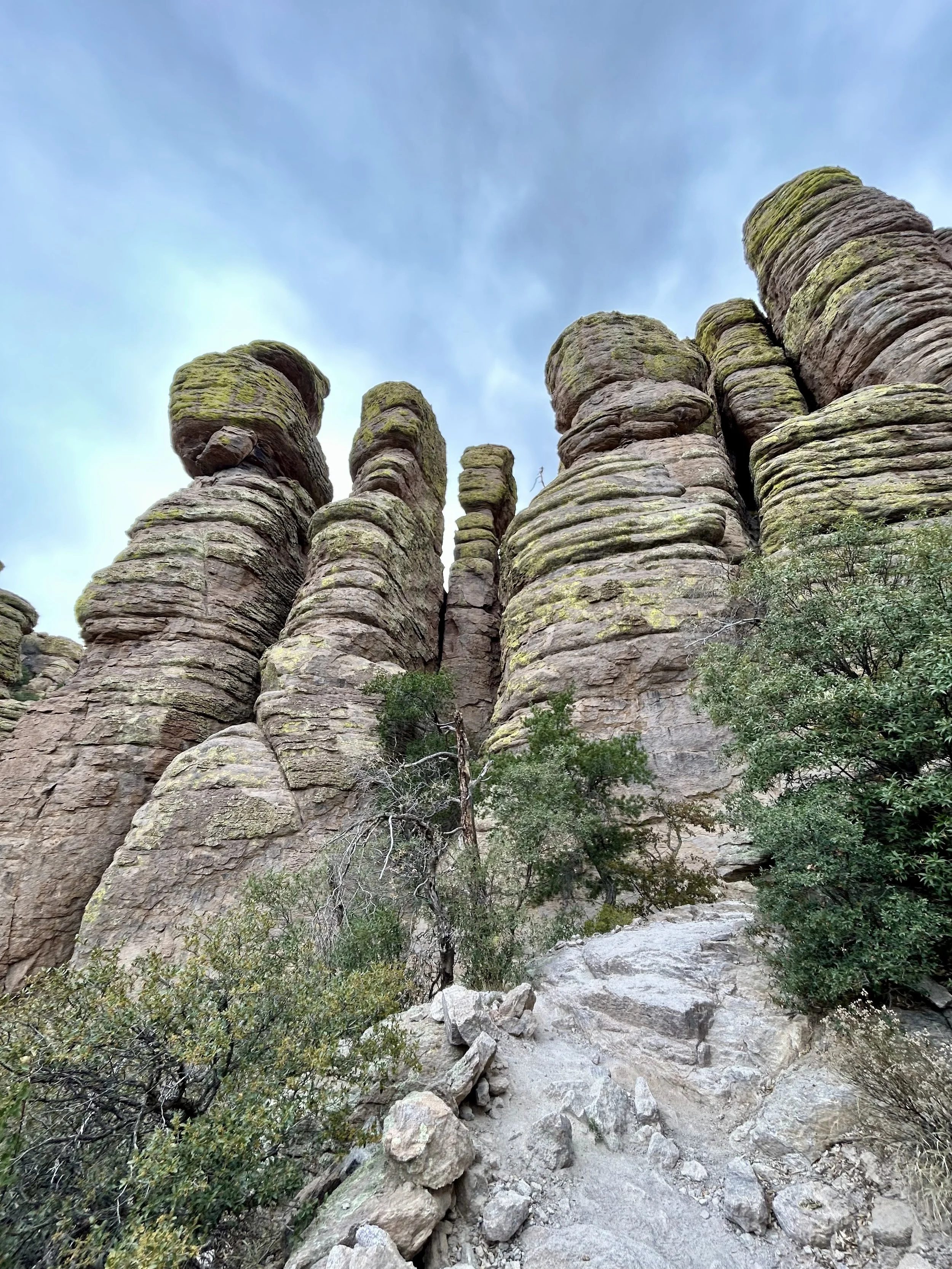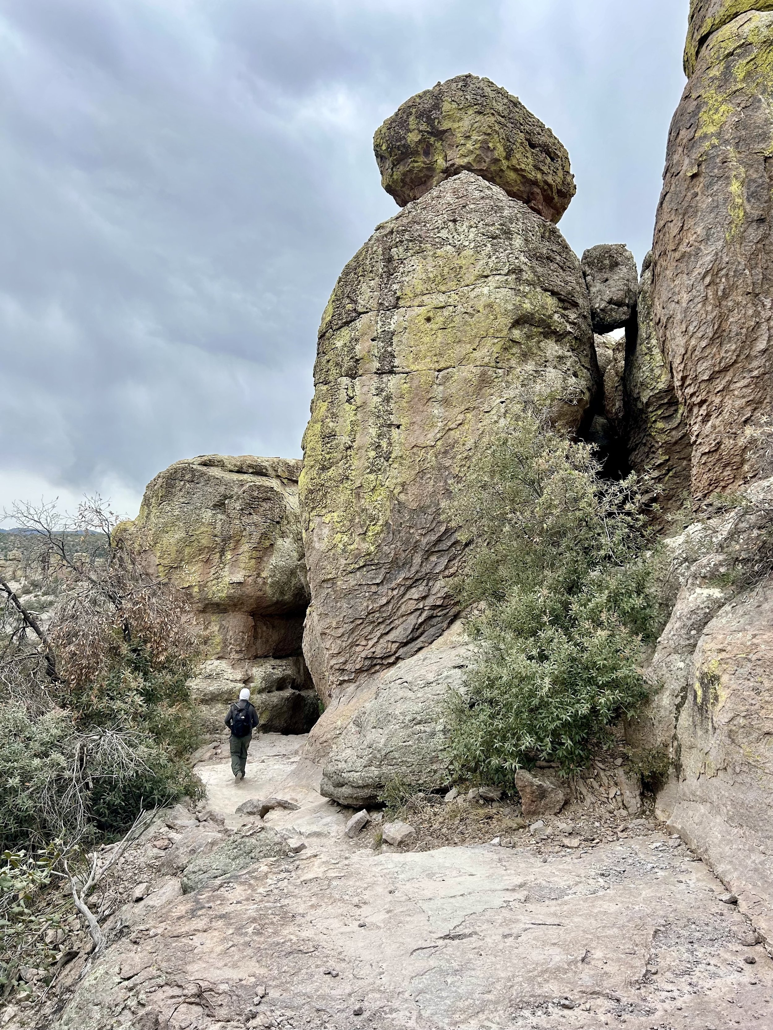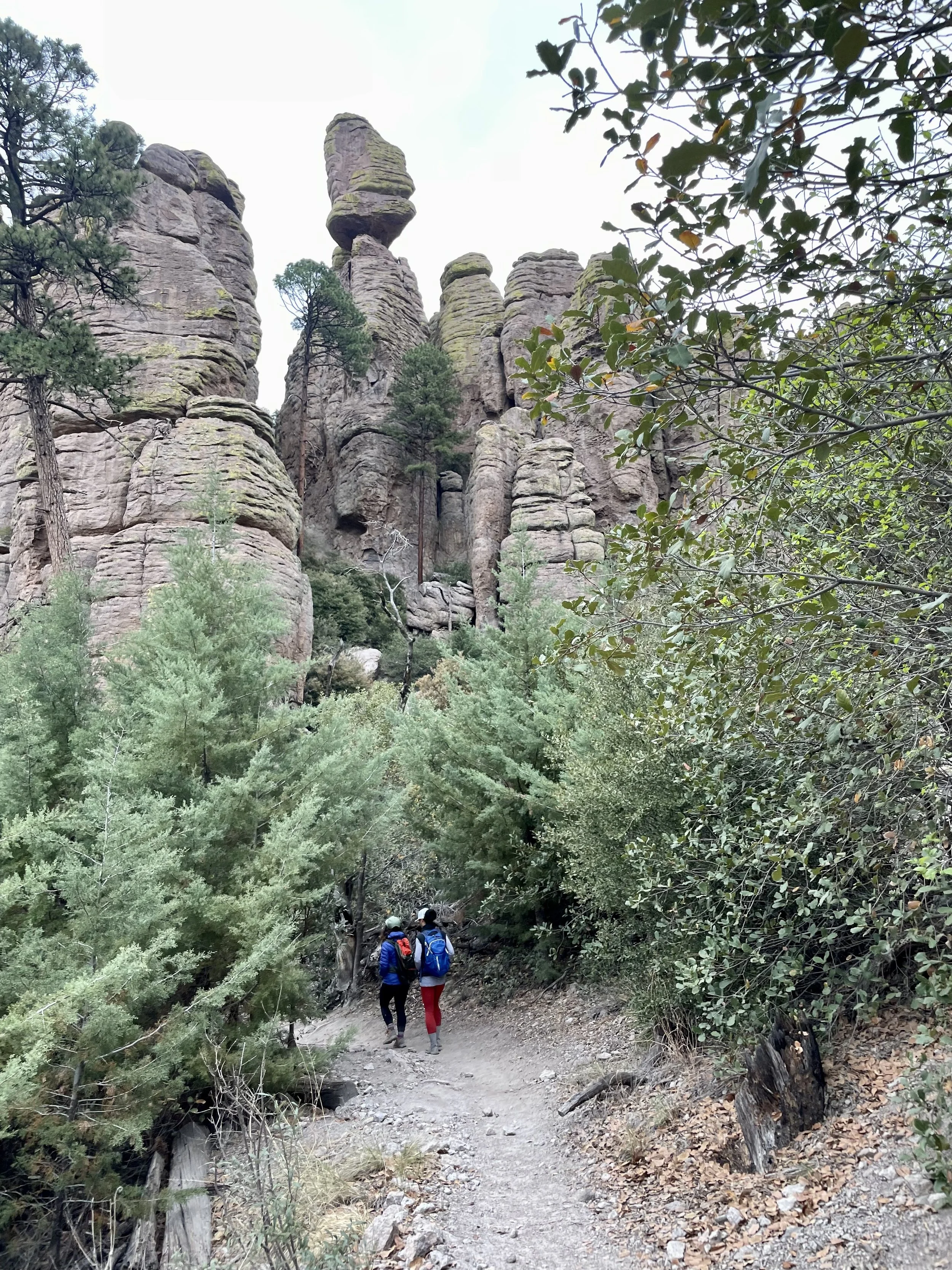 It was not hard to wake up the next morning and get going. We had about an hour-long drive to get us into the Chiricahua National Monument area and up to the trailhead we had planned. We had planned to do the largest loop in the park, which took us all around the rock formations and allowed us to see as much of the area as possible in a single day. The hike was called The Big Loop. It was a slightly cloudy and chilly start to the hike—quite a nice change of pace for Arizona hiking! The hike started up at the top of a ridgeline and worked its way down into a valley, up across to another ridgeline, and back around to where we started. The rock formations started right away and only got better as we moved along the hike. They were formed by accumulating volcanic ash stacking on top of itself. With time, wind, and rain, they slowly eroded into the towers that now exist. The landscape is otherworldly!