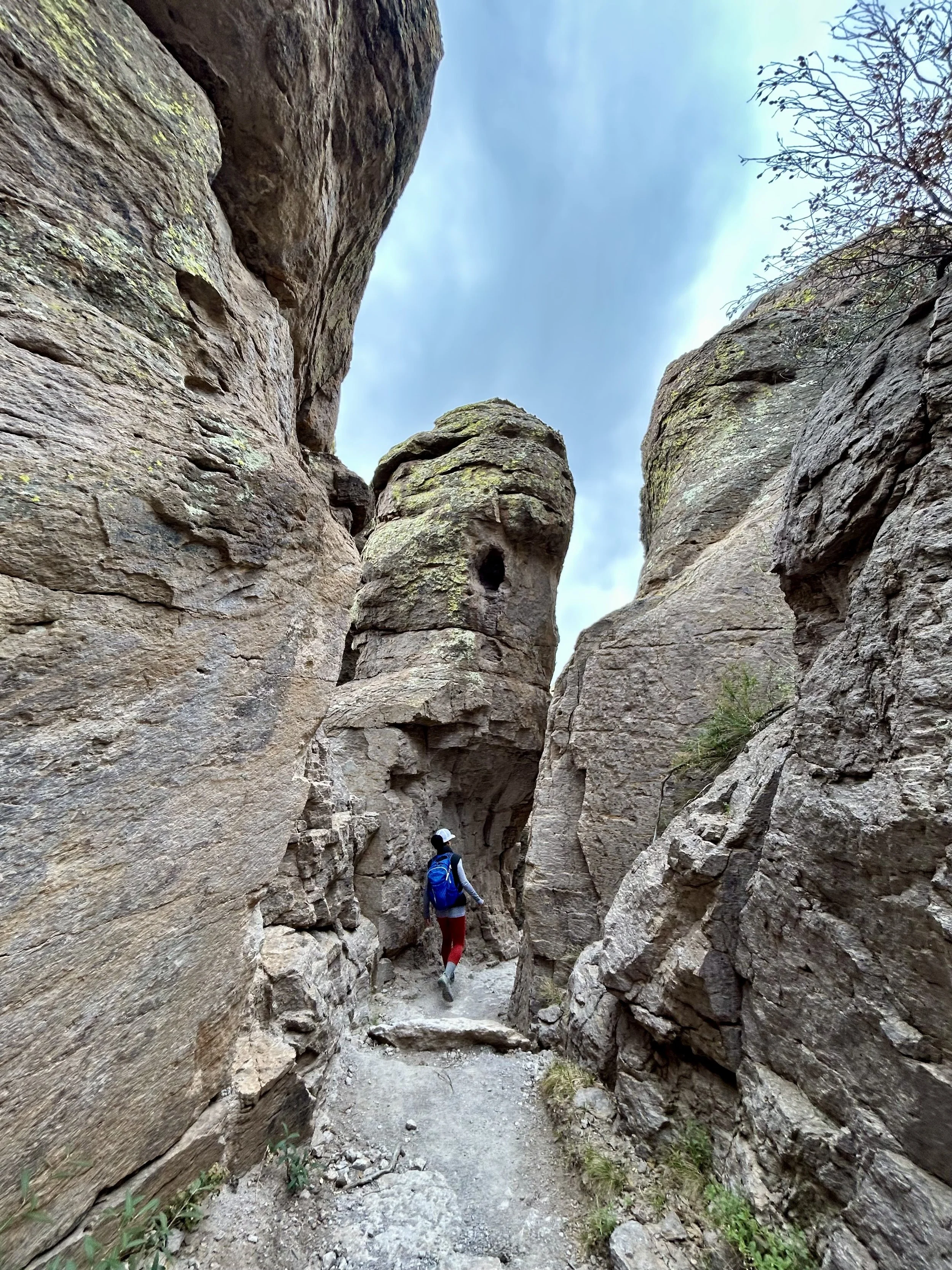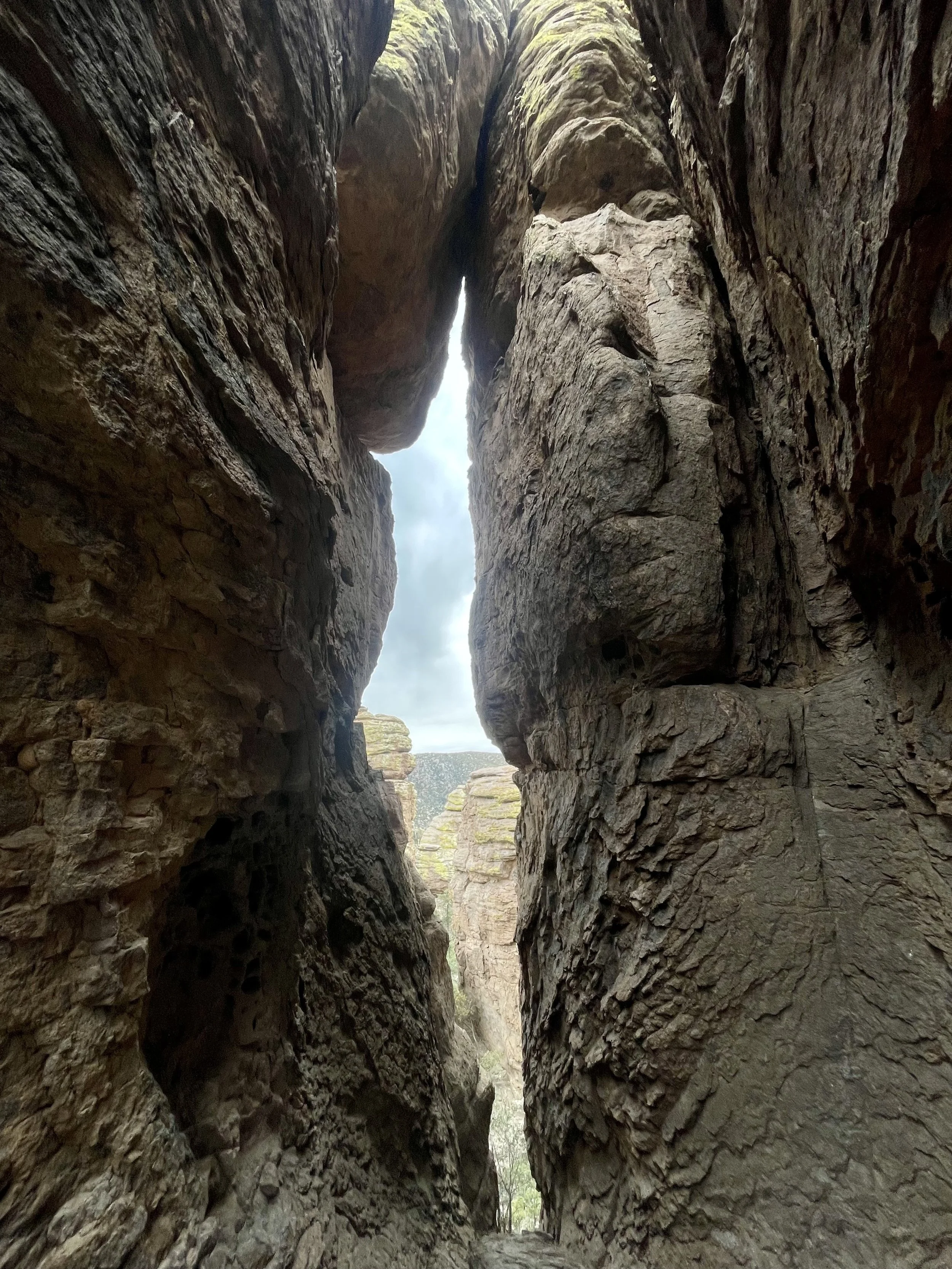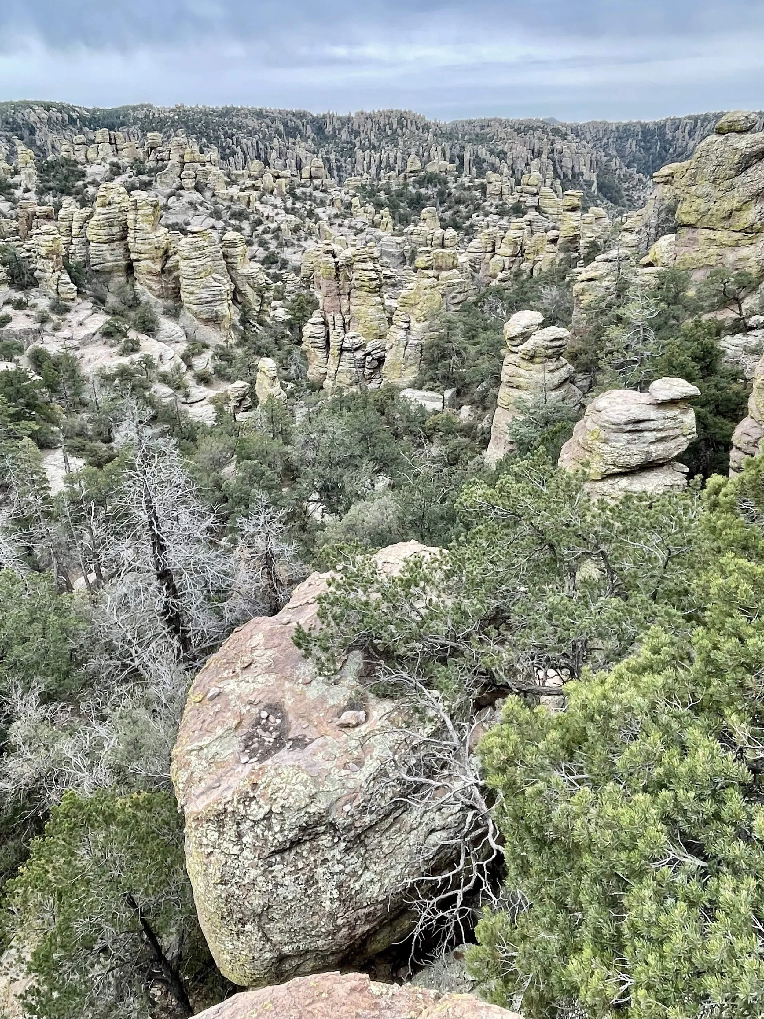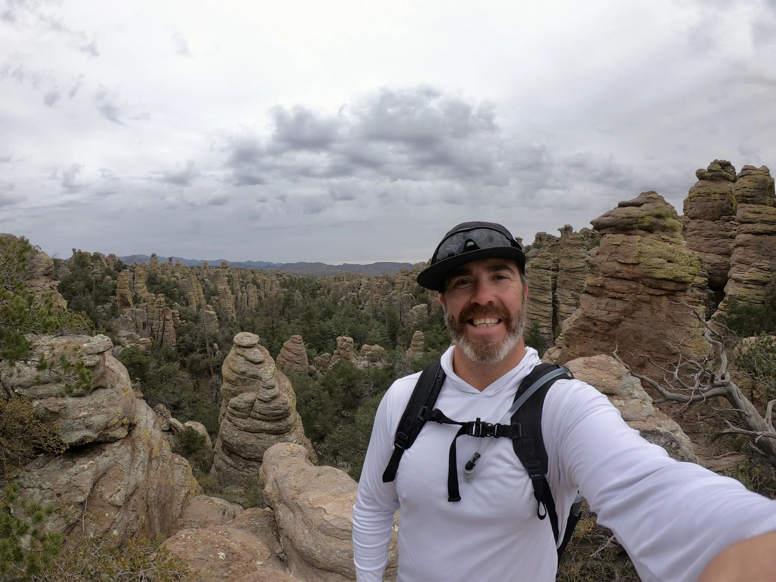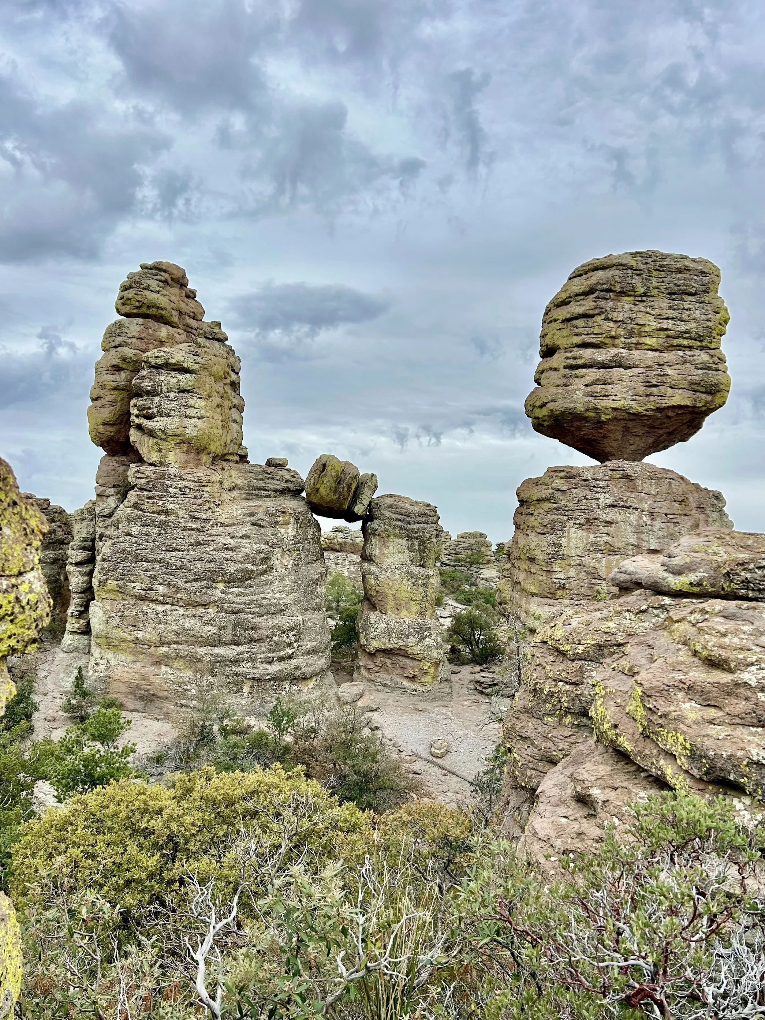 It was not hard to wake up the next morning and get going. We had about an hour-long drive to get us into the Chiricahua National Monument area and up to the trailhead we had planned. We had planned to do the largest loop in the park, which took us all around the rock formations and allowed us to see as much of the area as possible in a single day. The hike was called The Big Loop. It was a slightly cloudy and chilly start to the hike—quite a nice change of pace for Arizona hiking! The hike started up at the top of a ridgeline and worked its way down into a valley, up across to another ridgeline, and back around to where we started. The rock formations started right away and only got better as we moved along the hike. They were formed by accumulating volcanic ash stacking on top of itself. With time, wind, and rain, they slowly eroded into the towers that now exist. The landscape is otherworldly!