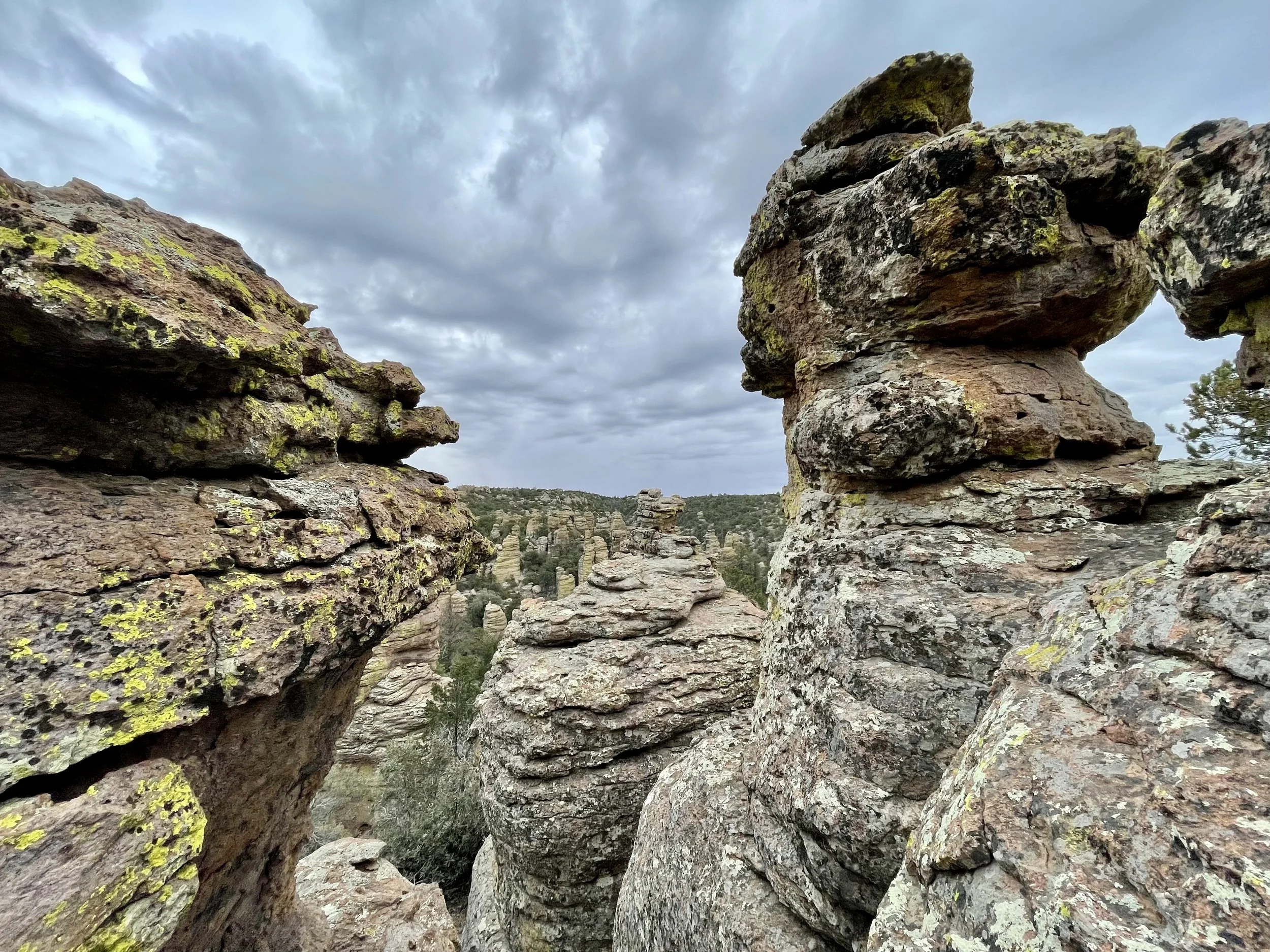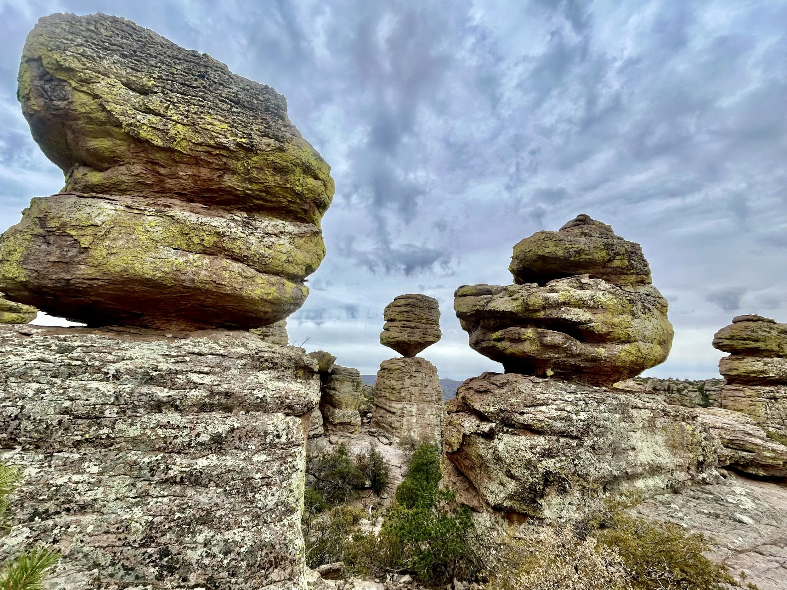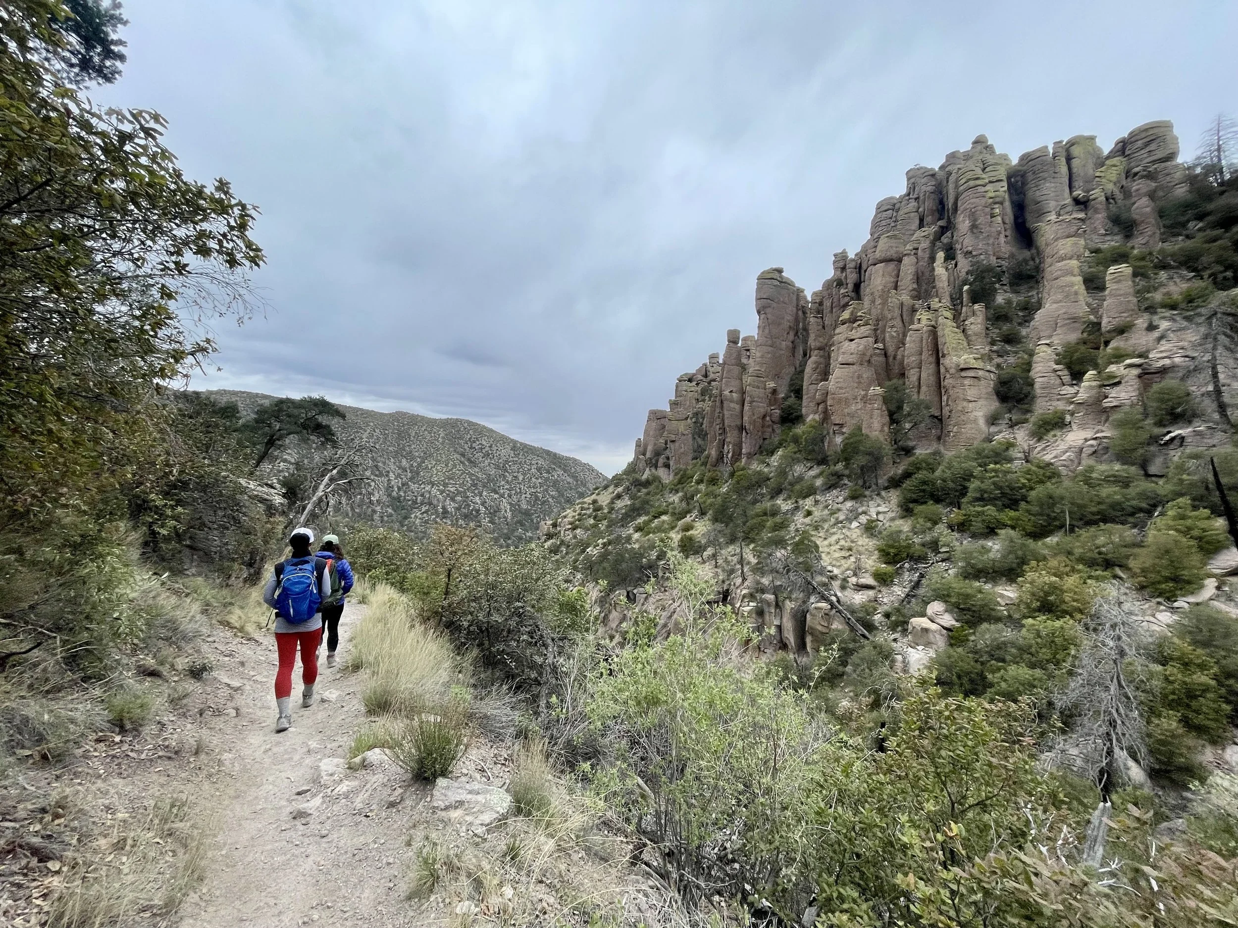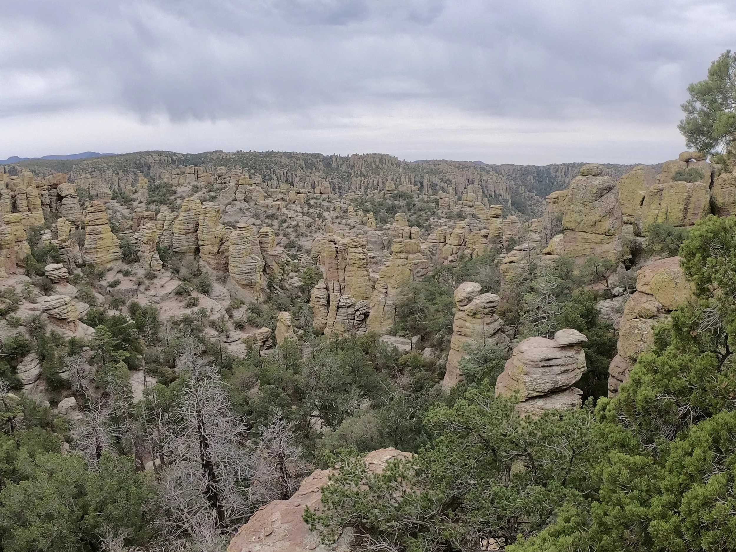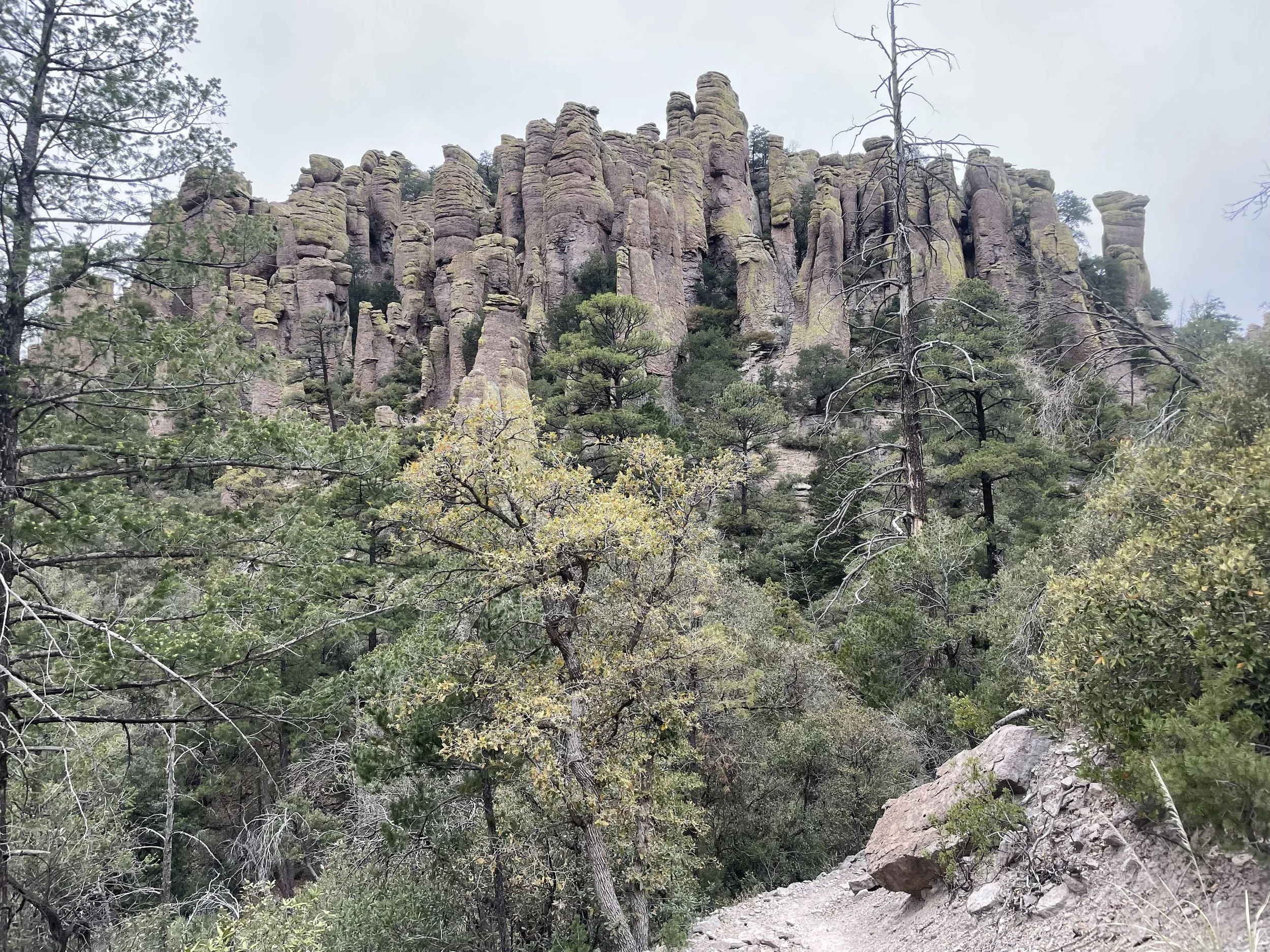 It was not hard to wake up the next morning and get going. We had about an hour-long drive to get us into the Chiricahua National Monument area and up to the trailhead we had planned. We had planned to do the largest loop in the park, which took us all around the rock formations and allowed us to see as much of the area as possible in a single day. The hike was called The Big Loop. It was a slightly cloudy and chilly start to the hike—quite a nice change of pace for Arizona hiking! The hike started up at the top of a ridgeline and worked its way down into a valley, up across to another ridgeline, and back around to where we started. The rock formations started right away and only got better as we moved along the hike. They were formed by accumulating volcanic ash stacking on top of itself. With time, wind, and rain, they slowly eroded into the towers that now exist. The landscape is otherworldly!