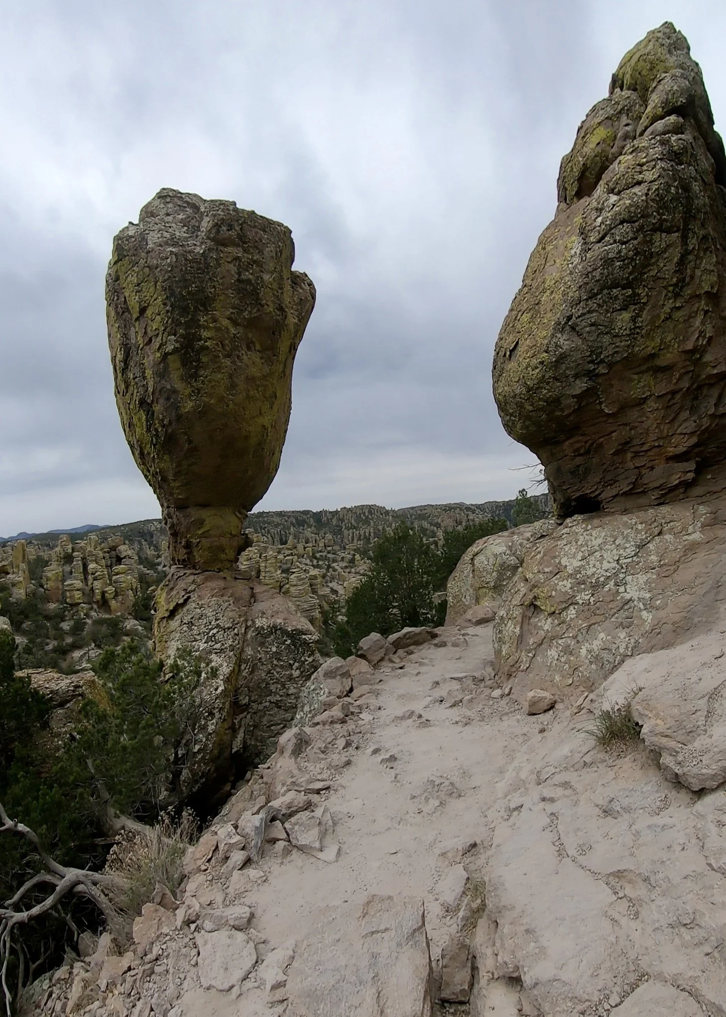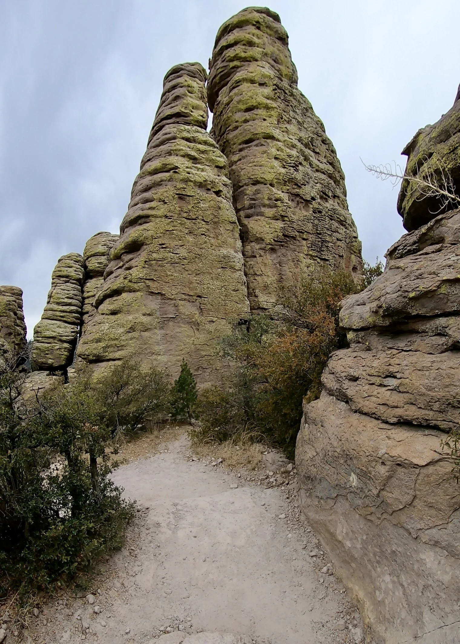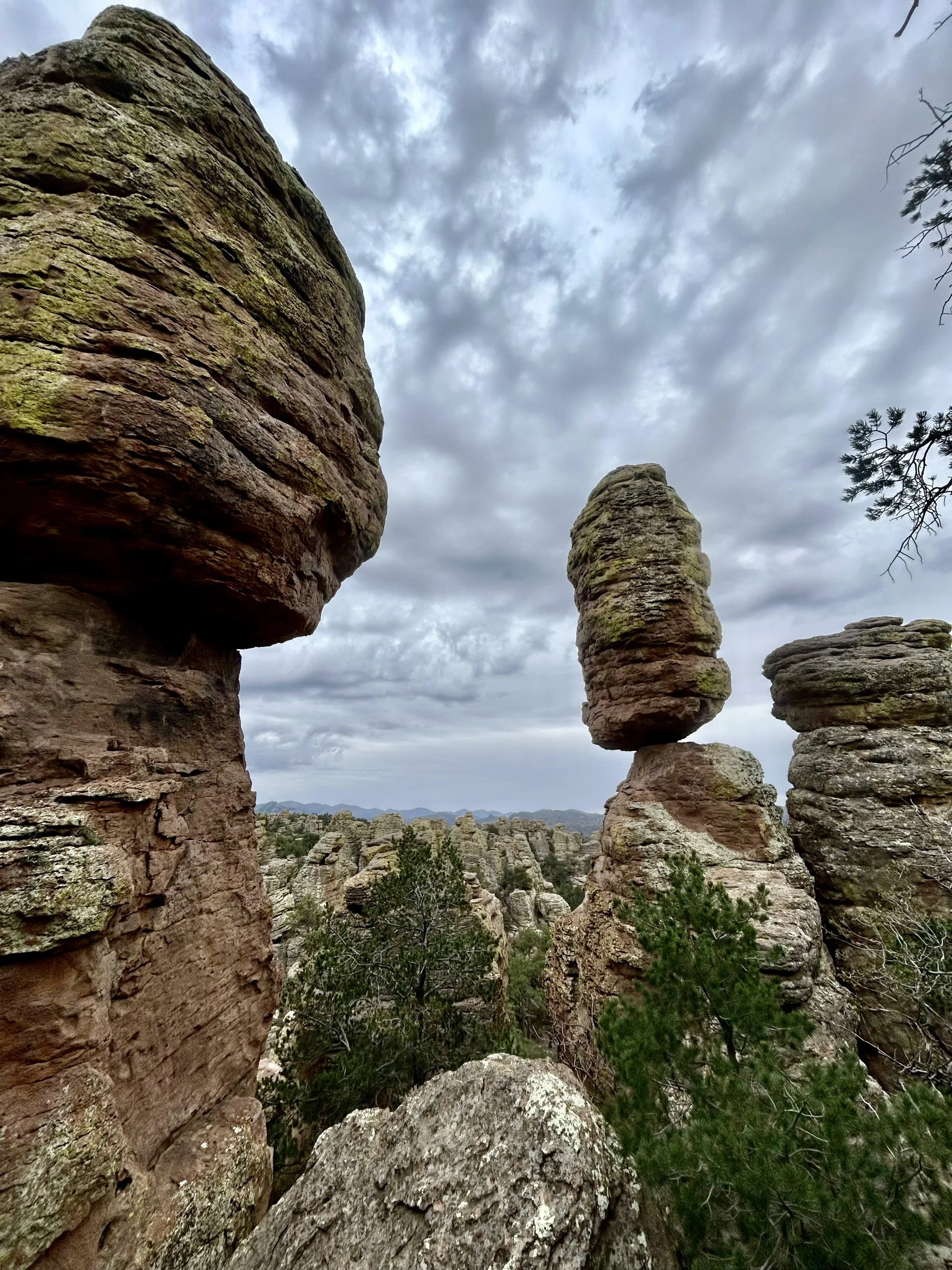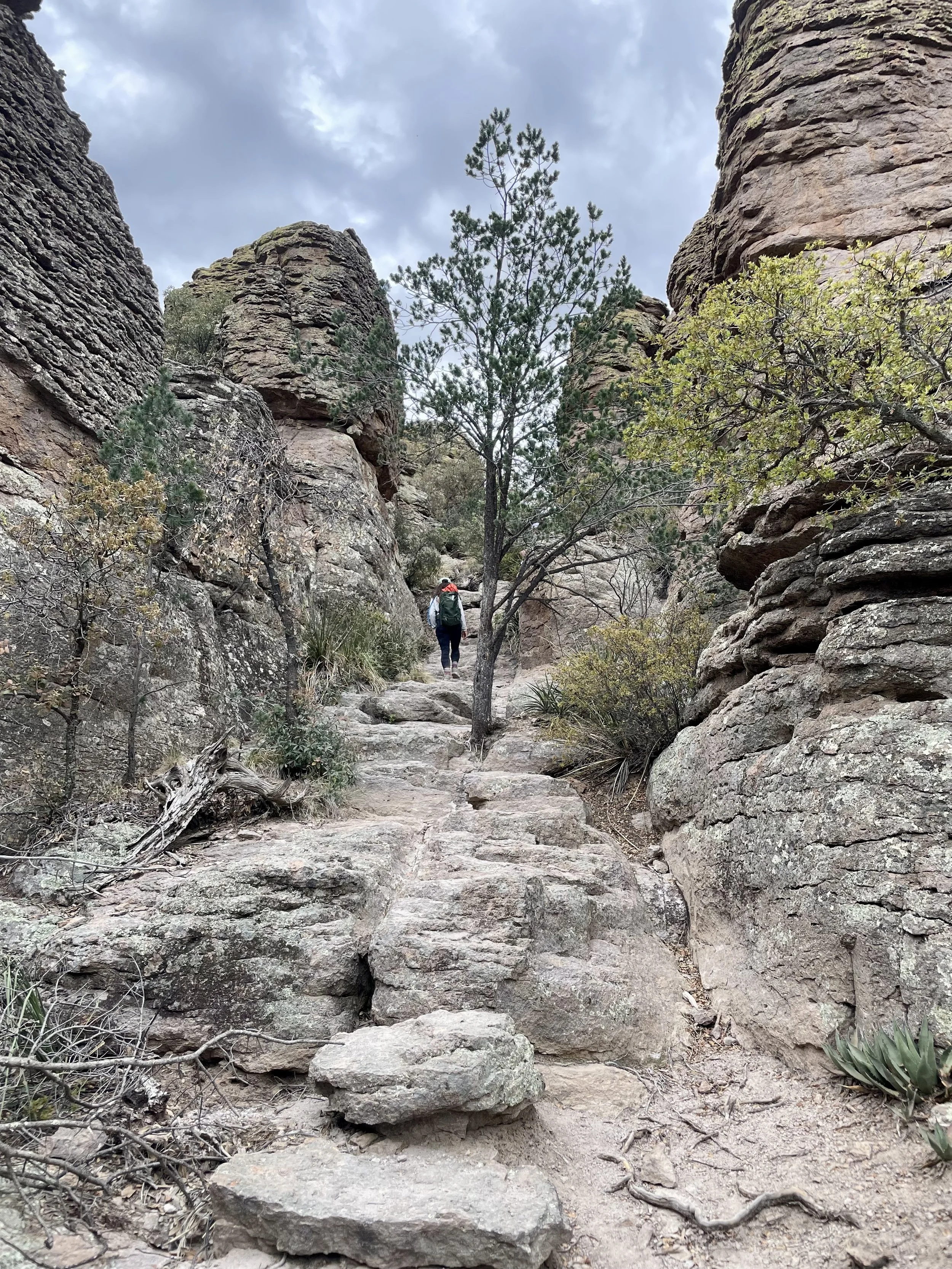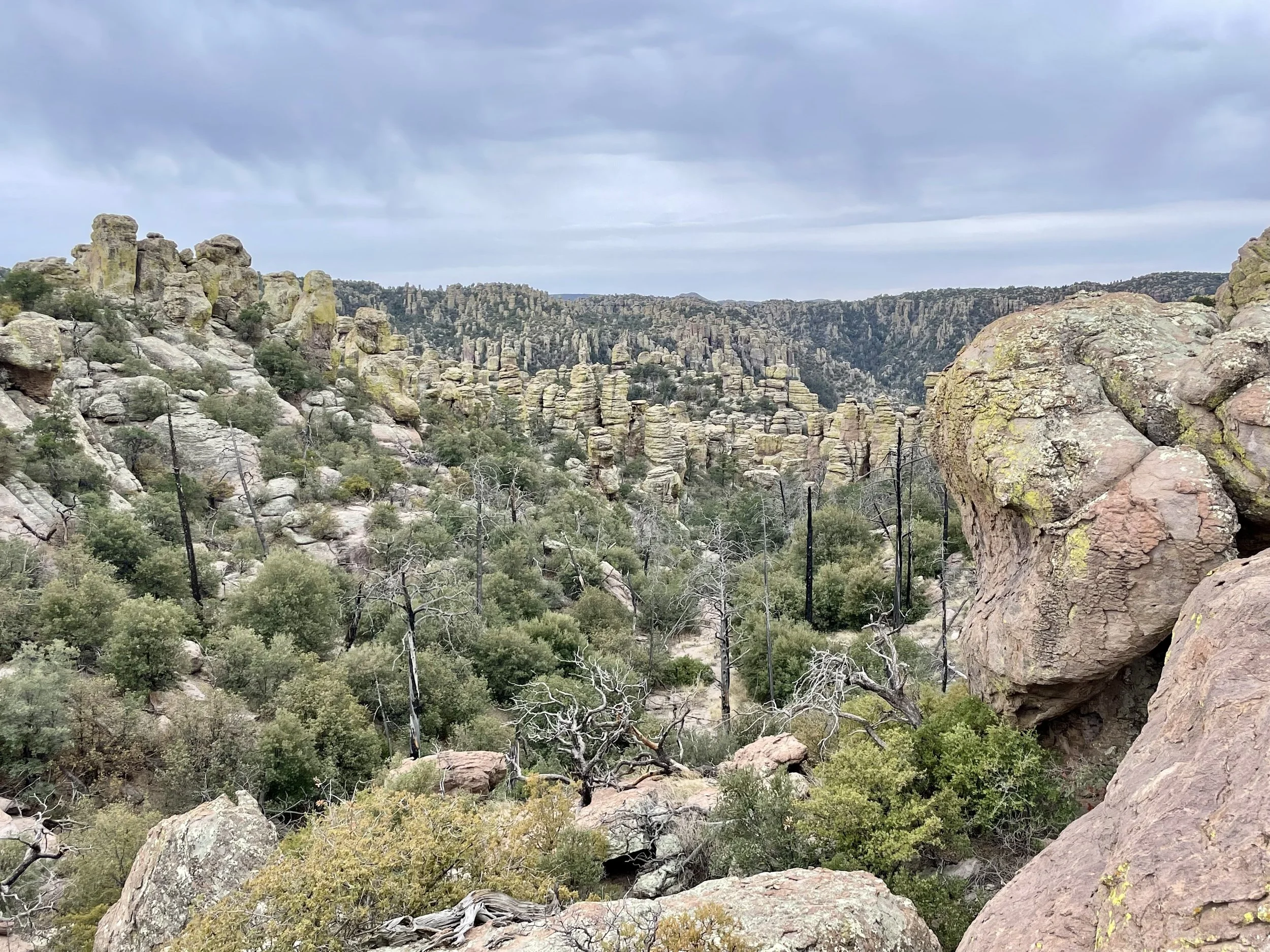 It was not hard to wake up the next morning and get going. We had about an hour-long drive to get us into the Chiricahua National Monument area and up to the trailhead we had planned. We had planned to do the largest loop in the park, which took us all around the rock formations and allowed us to see as much of the area as possible in a single day. The hike was called The Big Loop. It was a slightly cloudy and chilly start to the hike—quite a nice change of pace for Arizona hiking! The hike started up at the top of a ridgeline and worked its way down into a valley, up across to another ridgeline, and back around to where we started. The rock formations started right away and only got better as we moved along the hike. They were formed by accumulating volcanic ash stacking on top of itself. With time, wind, and rain, they slowly eroded into the towers that now exist. The landscape is otherworldly!