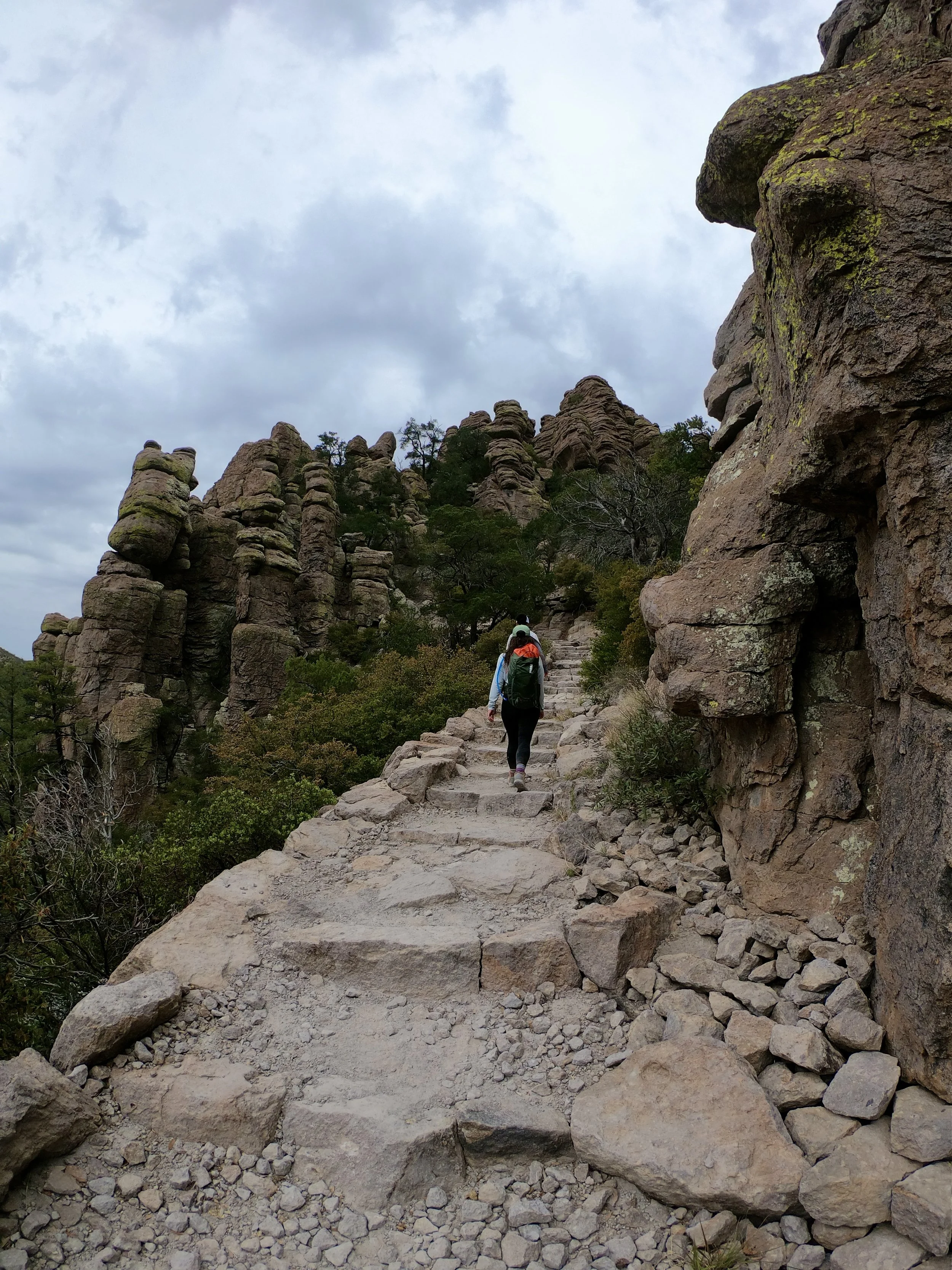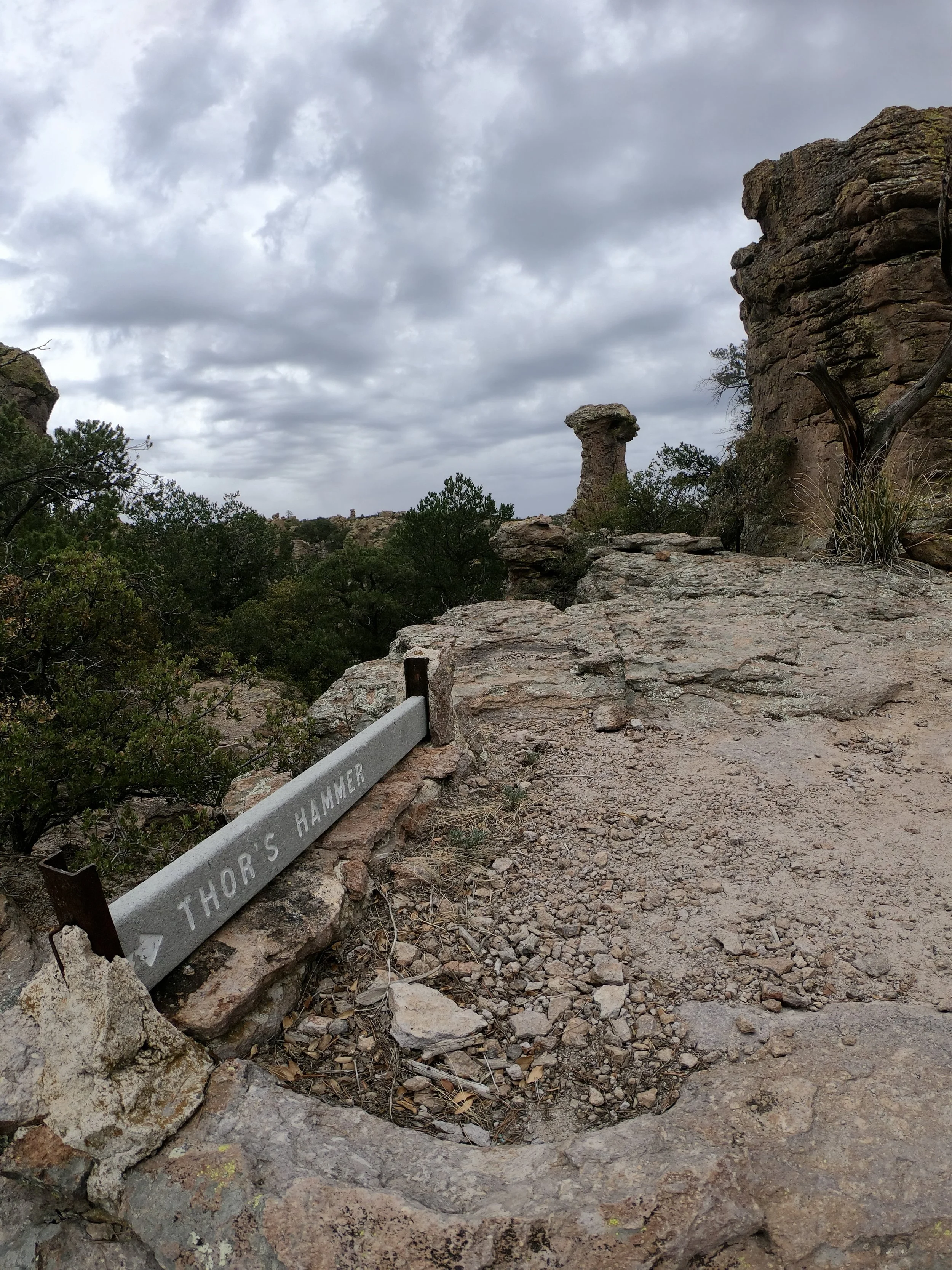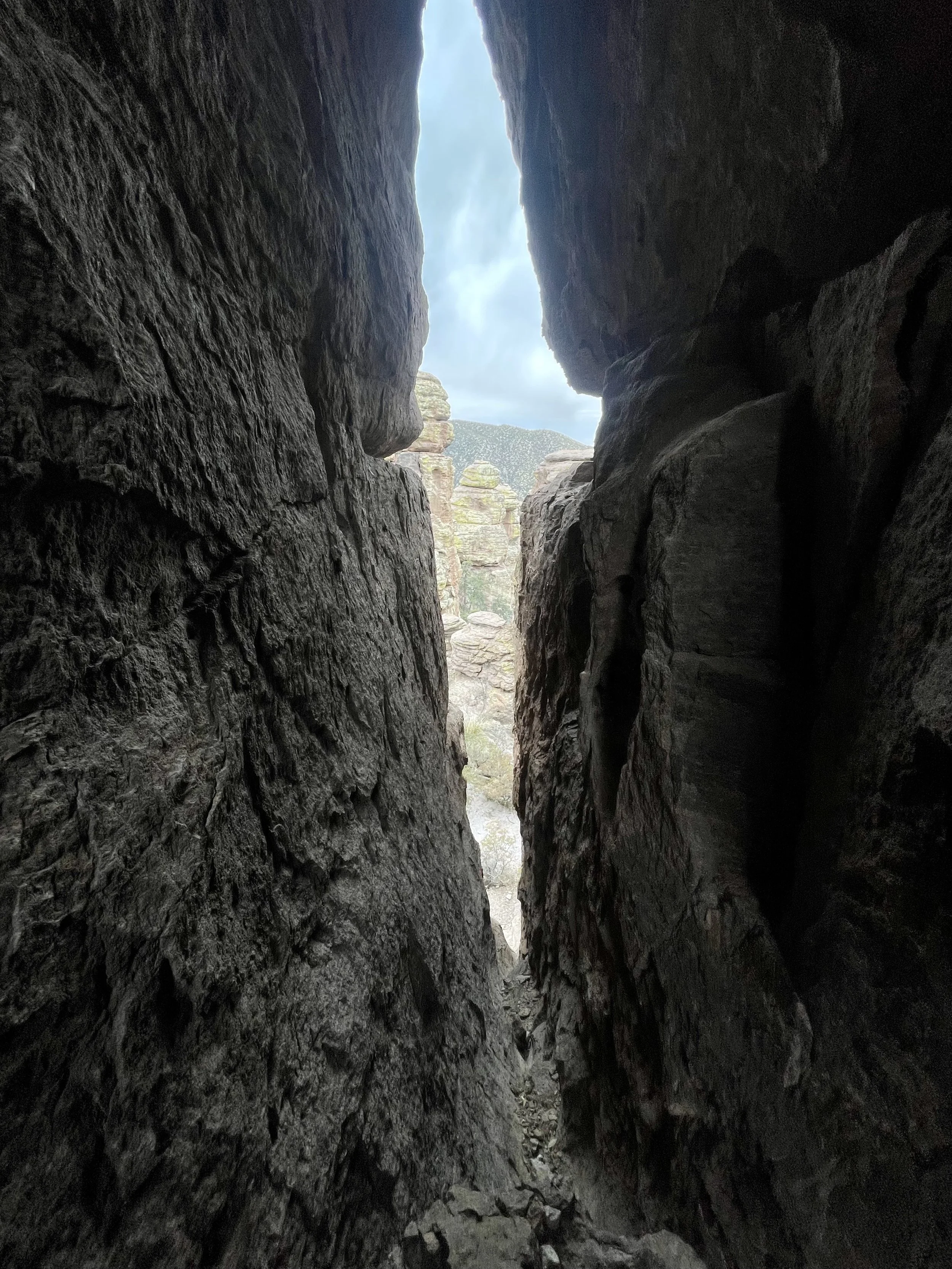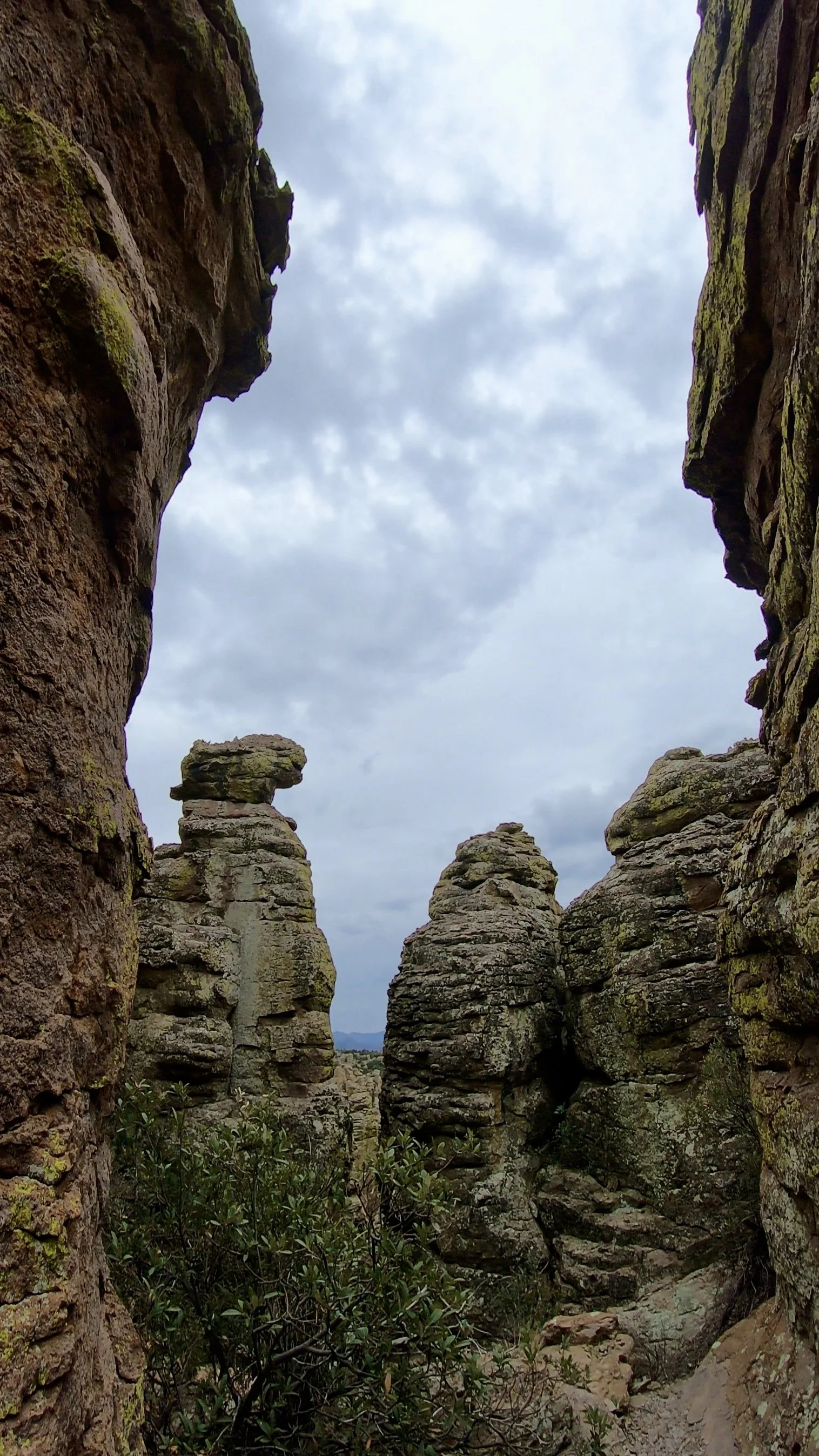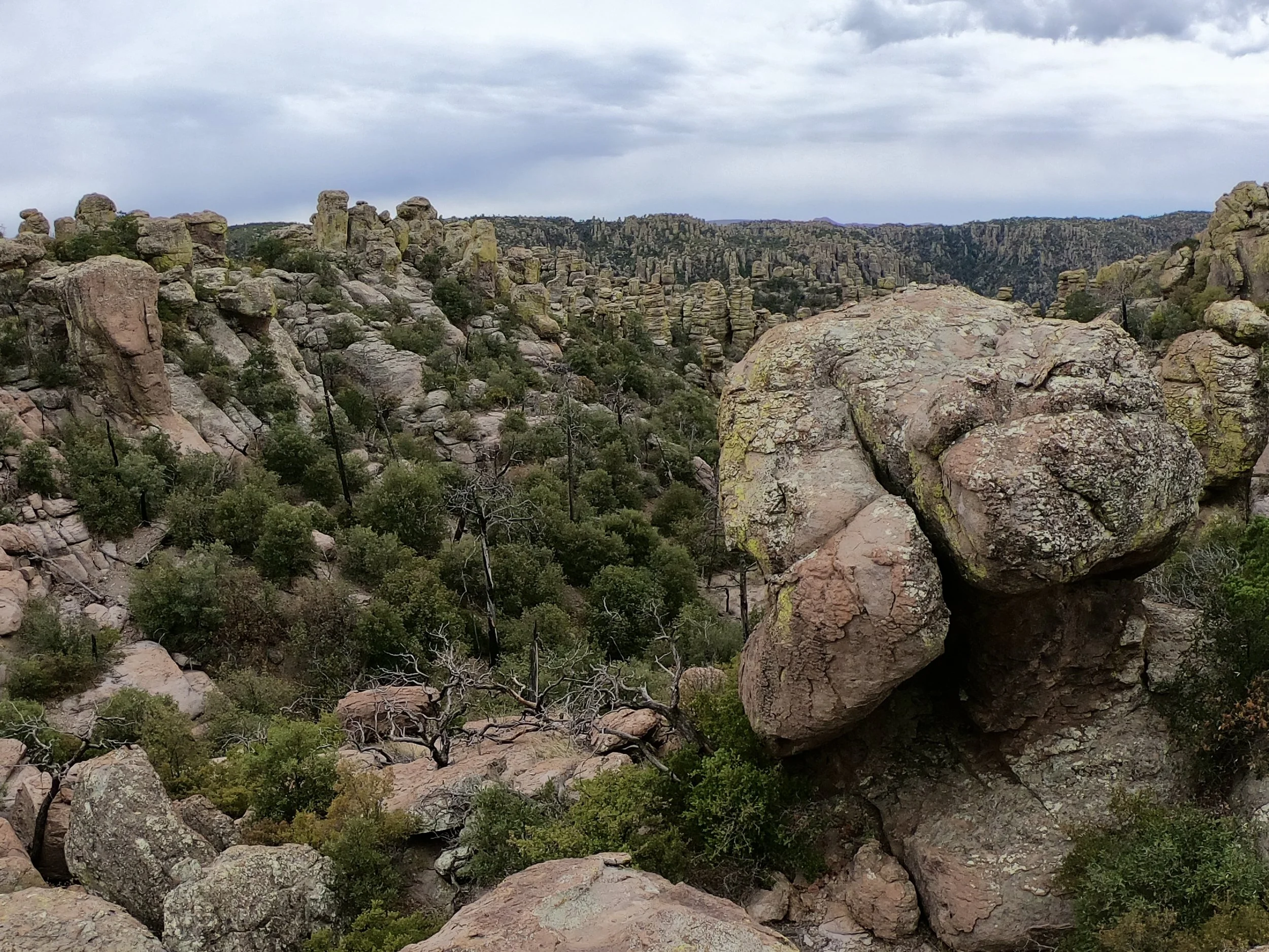 It was not hard to wake up the next morning and get going. We had about an hour-long drive to get us into the Chiricahua National Monument area and up to the trailhead we had planned. We had planned to do the largest loop in the park, which took us all around the rock formations and allowed us to see as much of the area as possible in a single day. The hike was called The Big Loop. It was a slightly cloudy and chilly start to the hike—quite a nice change of pace for Arizona hiking! The hike started up at the top of a ridgeline and worked its way down into a valley, up across to another ridgeline, and back around to where we started. The rock formations started right away and only got better as we moved along the hike. They were formed by accumulating volcanic ash stacking on top of itself. With time, wind, and rain, they slowly eroded into the towers that now exist. The landscape is otherworldly!