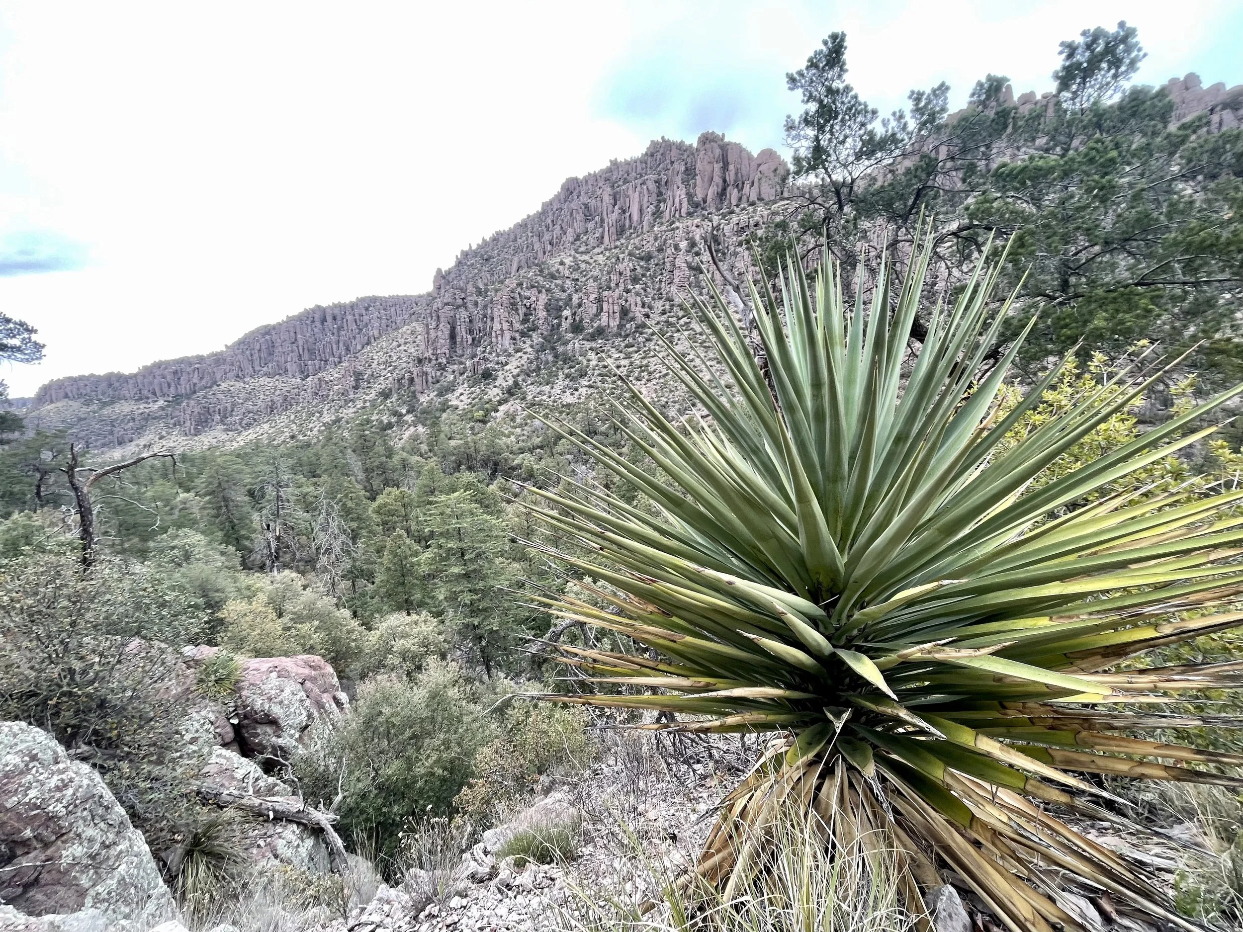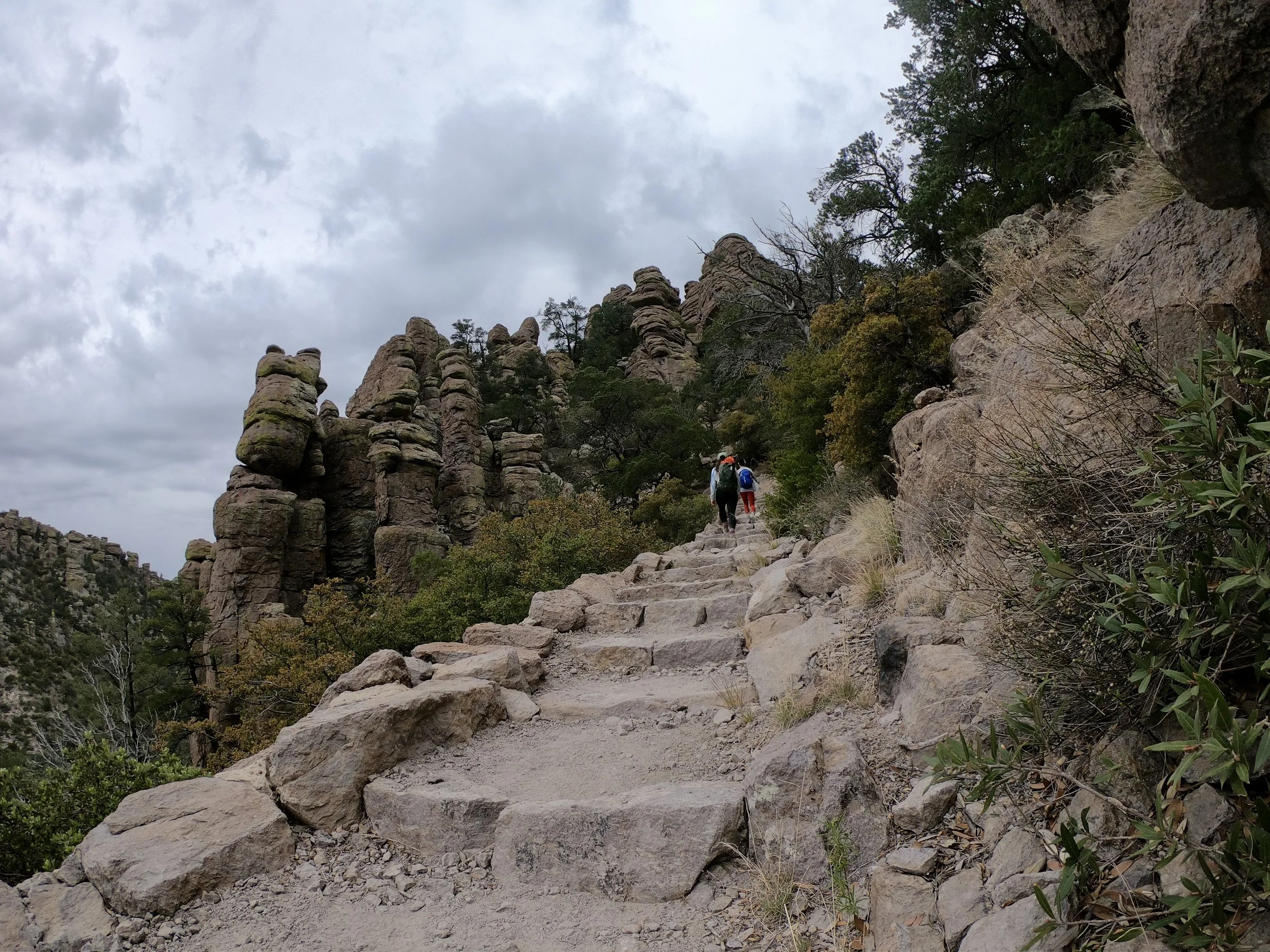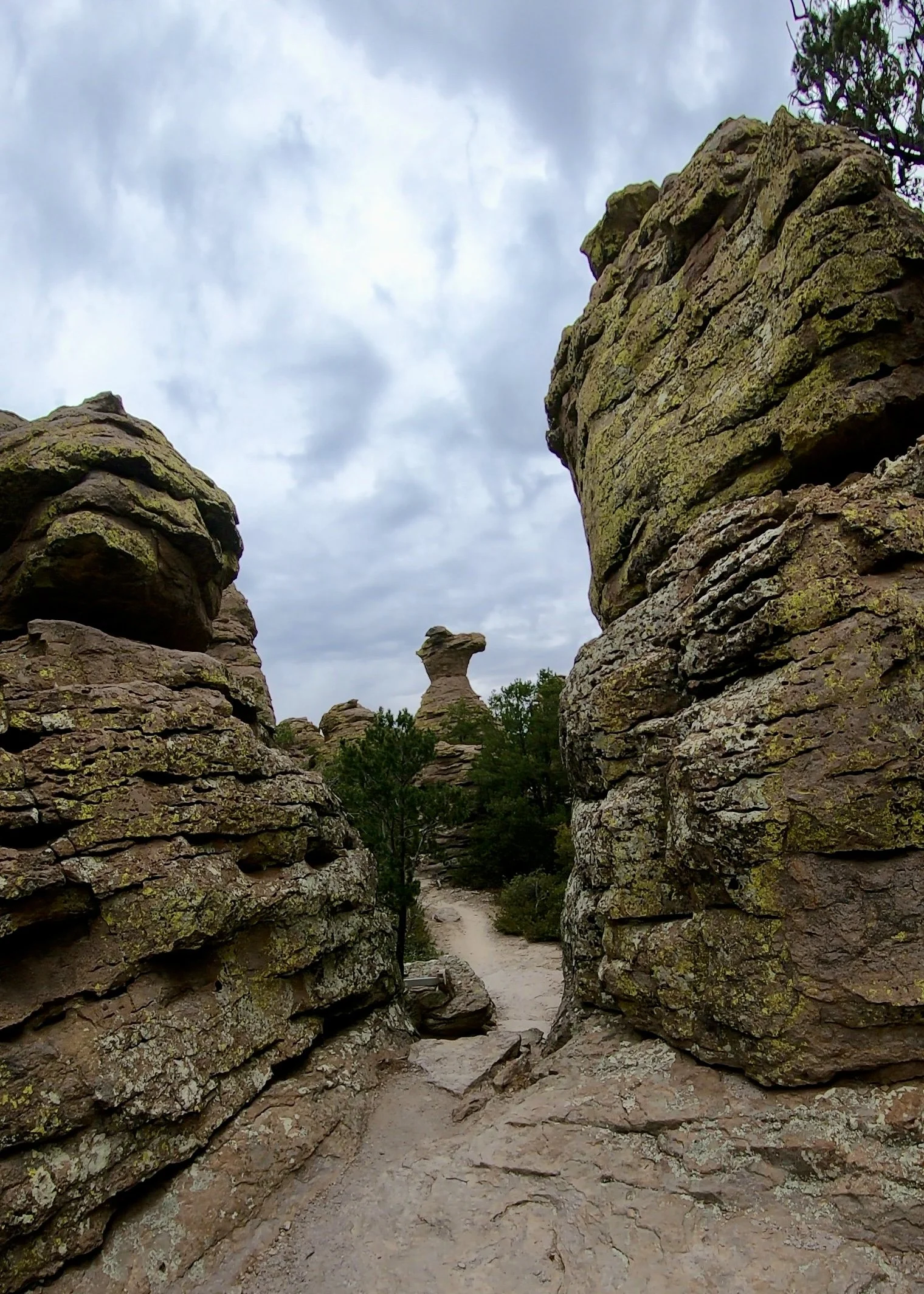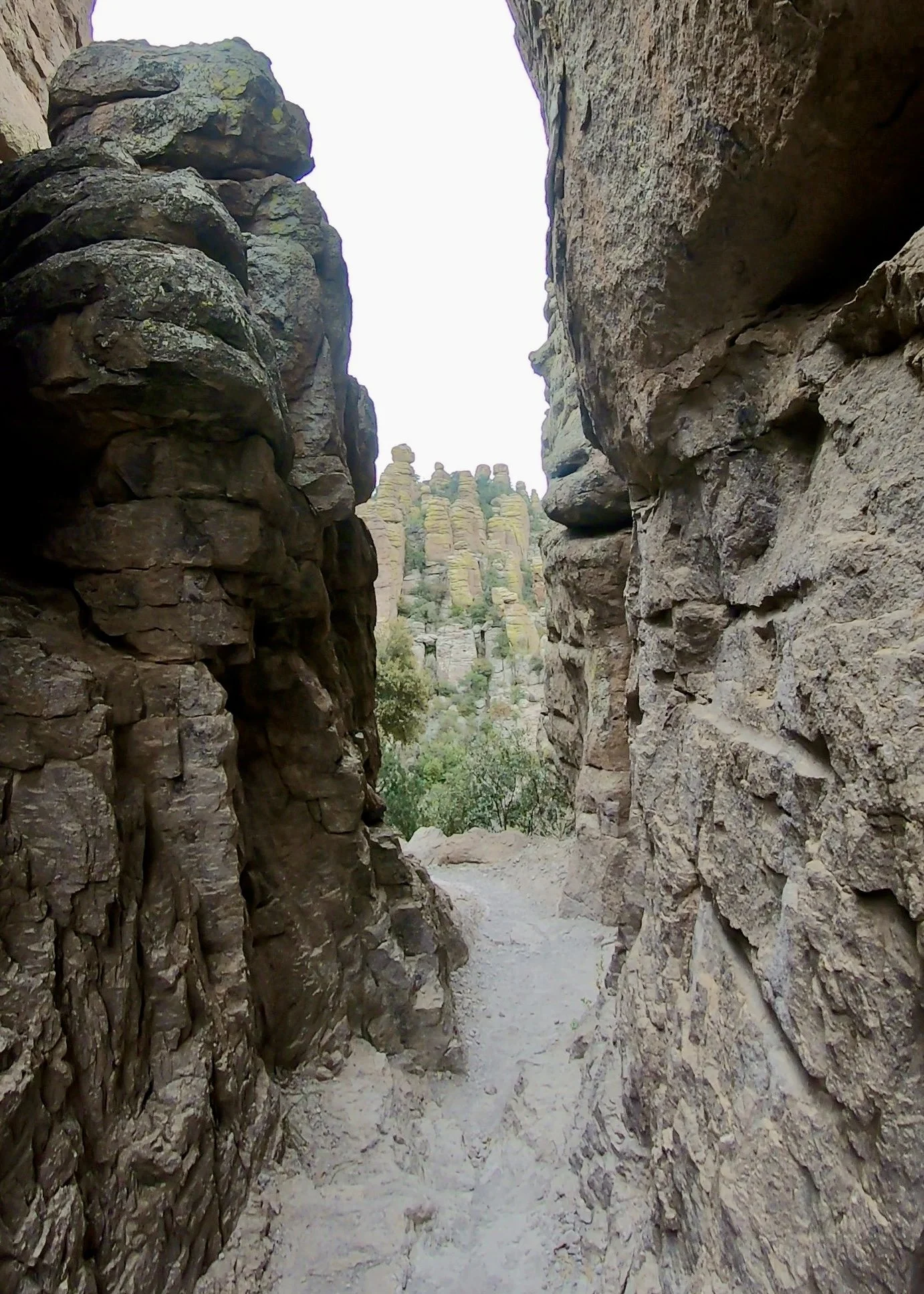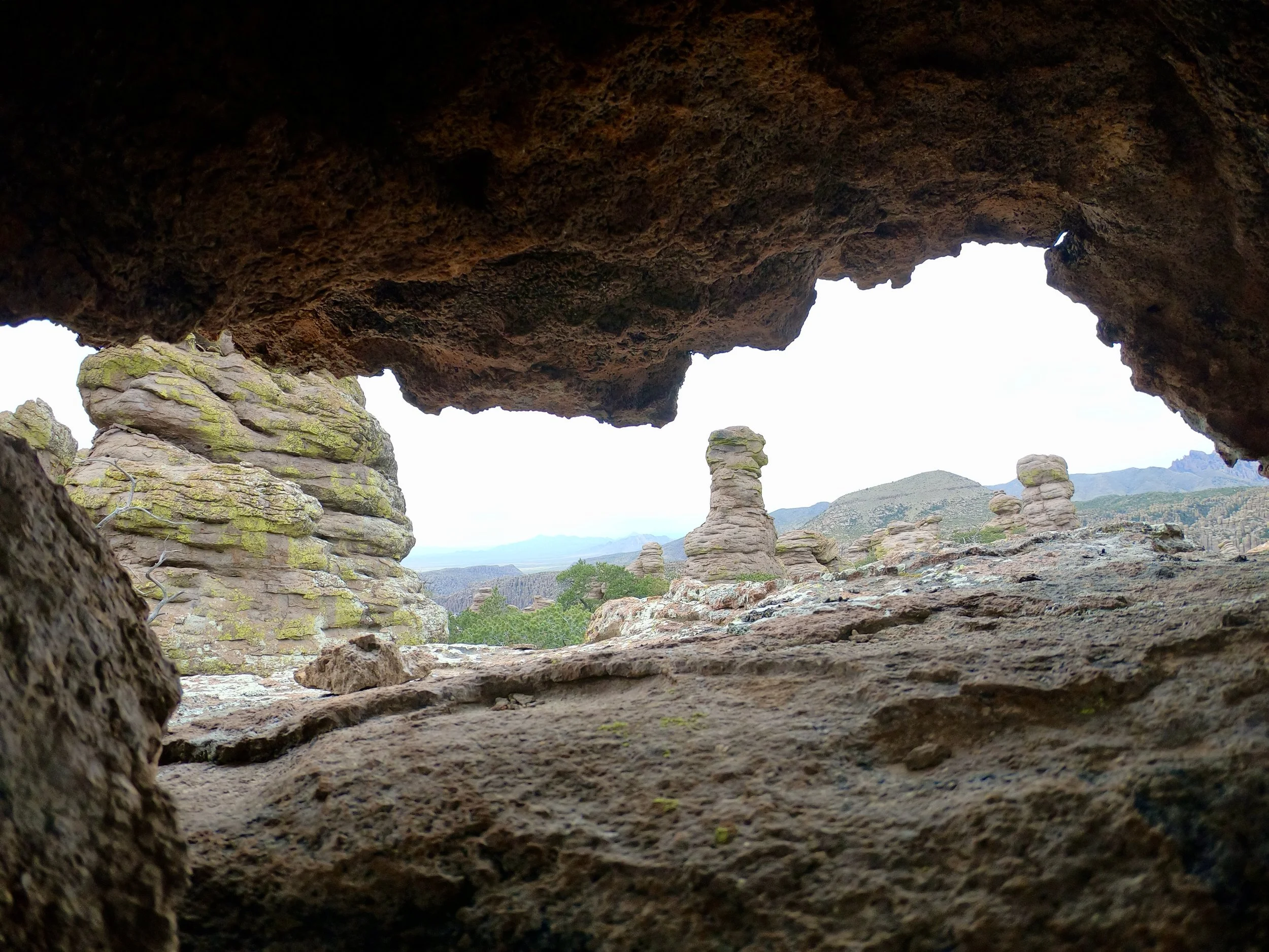 It was not hard to wake up the next morning and get going. We had about an hour-long drive to get us into the Chiricahua National Monument area and up to the trailhead we had planned. We had planned to do the largest loop in the park, which took us all around the rock formations and allowed us to see as much of the area as possible in a single day. The hike was called The Big Loop. It was a slightly cloudy and chilly start to the hike—quite a nice change of pace for Arizona hiking! The hike started up at the top of a ridgeline and worked its way down into a valley, up across to another ridgeline, and back around to where we started. The rock formations started right away and only got better as we moved along the hike. They were formed by accumulating volcanic ash stacking on top of itself. With time, wind, and rain, they slowly eroded into the towers that now exist. The landscape is otherworldly!