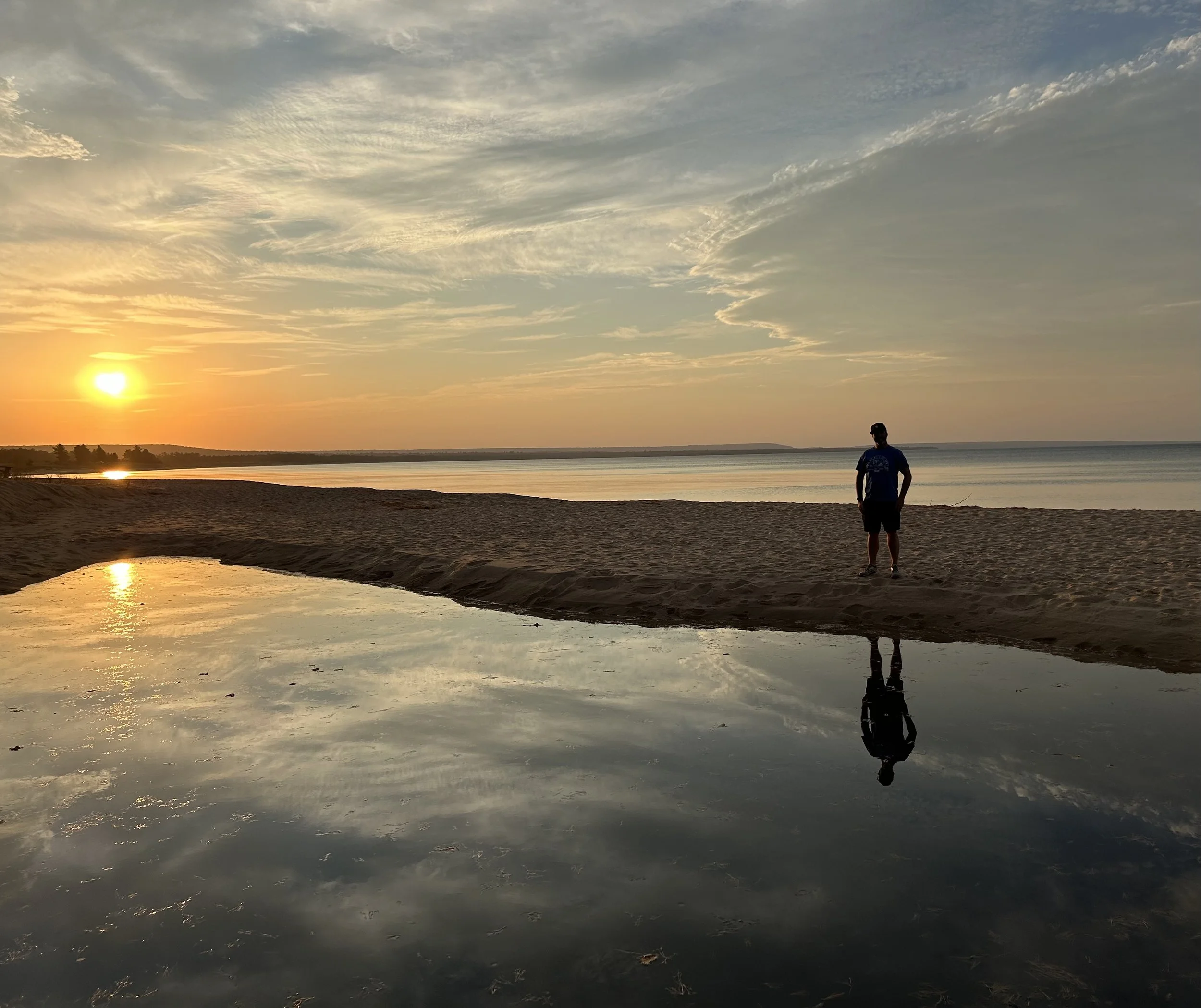 The next stop on the drive was Marquette, where we planned to do some urban exploring before heading to the area where we would camp for the night. Marquette is located on the northern shore of the Upper Peninsula, along Lake Superior. It is a really cool city! Built on a hill, we wondered what winters were like there, but the architecture and natural beauty of the city were amazing. We walked around town for a bit, down past the marina, and found a brewery downtown to sample the local goods. The brewery is called Ore Dock Brewing Company. It was a beautiful day, so we took full advantage of their patio for a relaxing beer after a long day in the car. We headed back to the car, did some driving around the city to explore the area a little more, and wondered what it would be like to live up there. You are pretty secluded from anything—just like being in Montana. We made our way eastward along the Lake Superior shoreline. As the sun began to set, we found a place to pull over and take some pictures. The leaves were in peak color, and the lake was super calm. This made for an amazing sunset, and we got some great pictures!