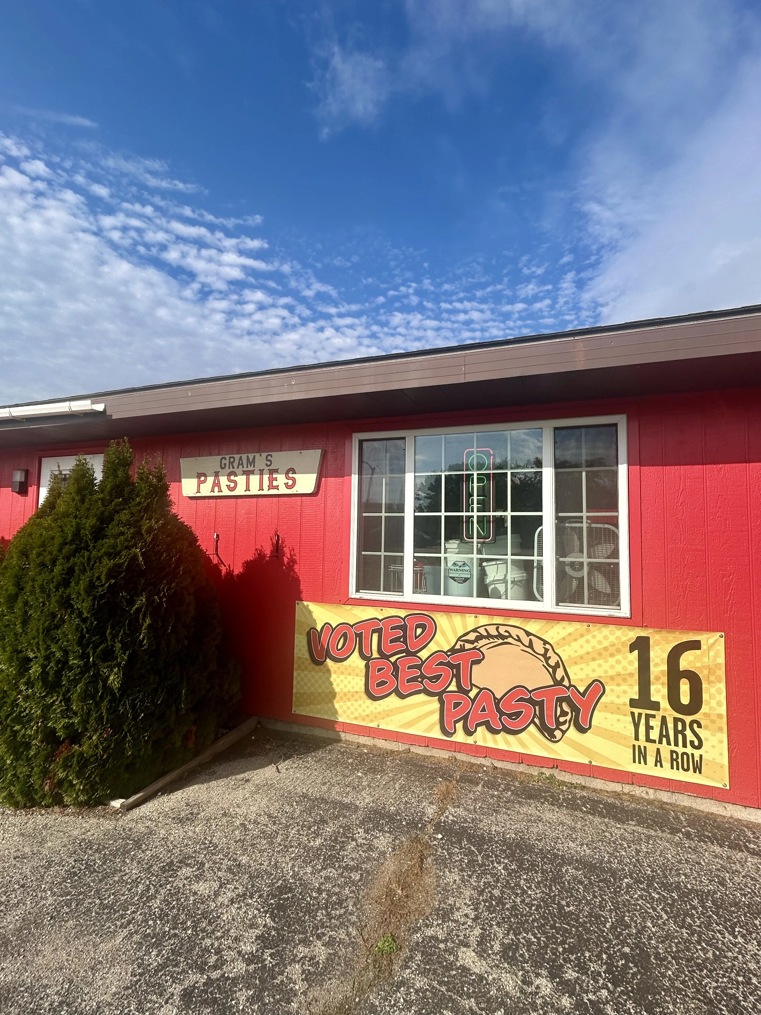 We had originally planned to check out the U.S. Ski Team Hall of Fame in Ishpeming, MI. When we hit the road, we decided to check the museum hours and learned that we would not be able to make it in time. We only had another four and a half hours to drive, so we adjusted our route to head north along the Lake Michigan shoreline of Green Bay before pushing more directly north to Marquette, MI. Before we left, Amity had learned from a patient of hers that we had to make sure to get a pasty while we were up there. The U.P. has a strong copper and iron mining history, which brought an Irish cultural element to the area. Pasties are very much an Irish staple. I remember them from Butte, MT, for the same exact reasons. We stopped at a place called Gram’s Pasties. It was a small establishment. When we walked in, an older, rough-looking woman came out from the back to take our order. Amity looked at her and said we would like to get some “pasties” (pronounced like the nipple coverings). The woman looked at her and, with the sternest face and harshest voice, declared, “IT’S PRONOUNCED PASTY!” We were both taken aback, as if our grandmother were yelling at us. We politely ordered our pasties and quickly left to continue our drive. We will laugh about this moment for a very long time! They were really good!