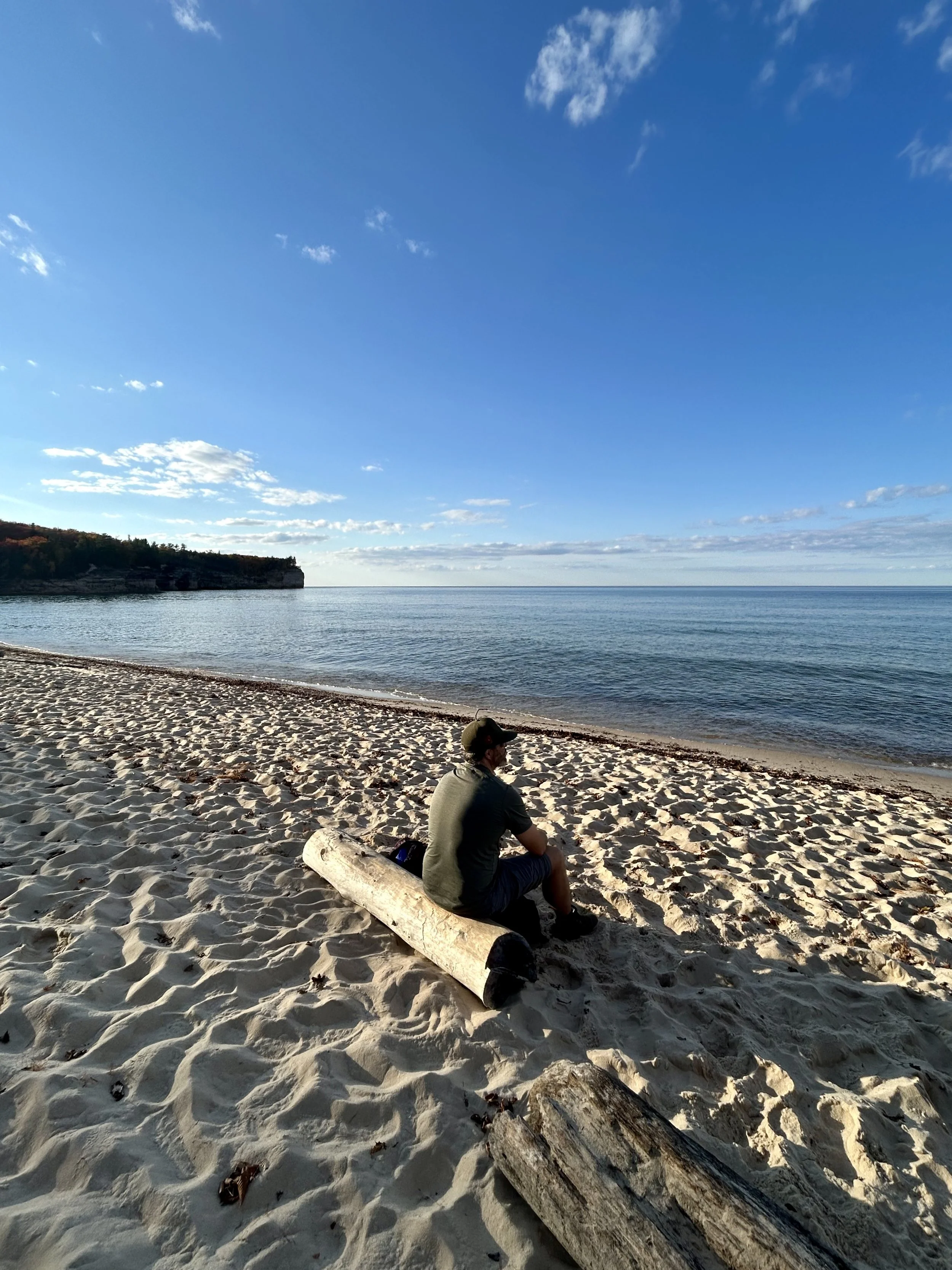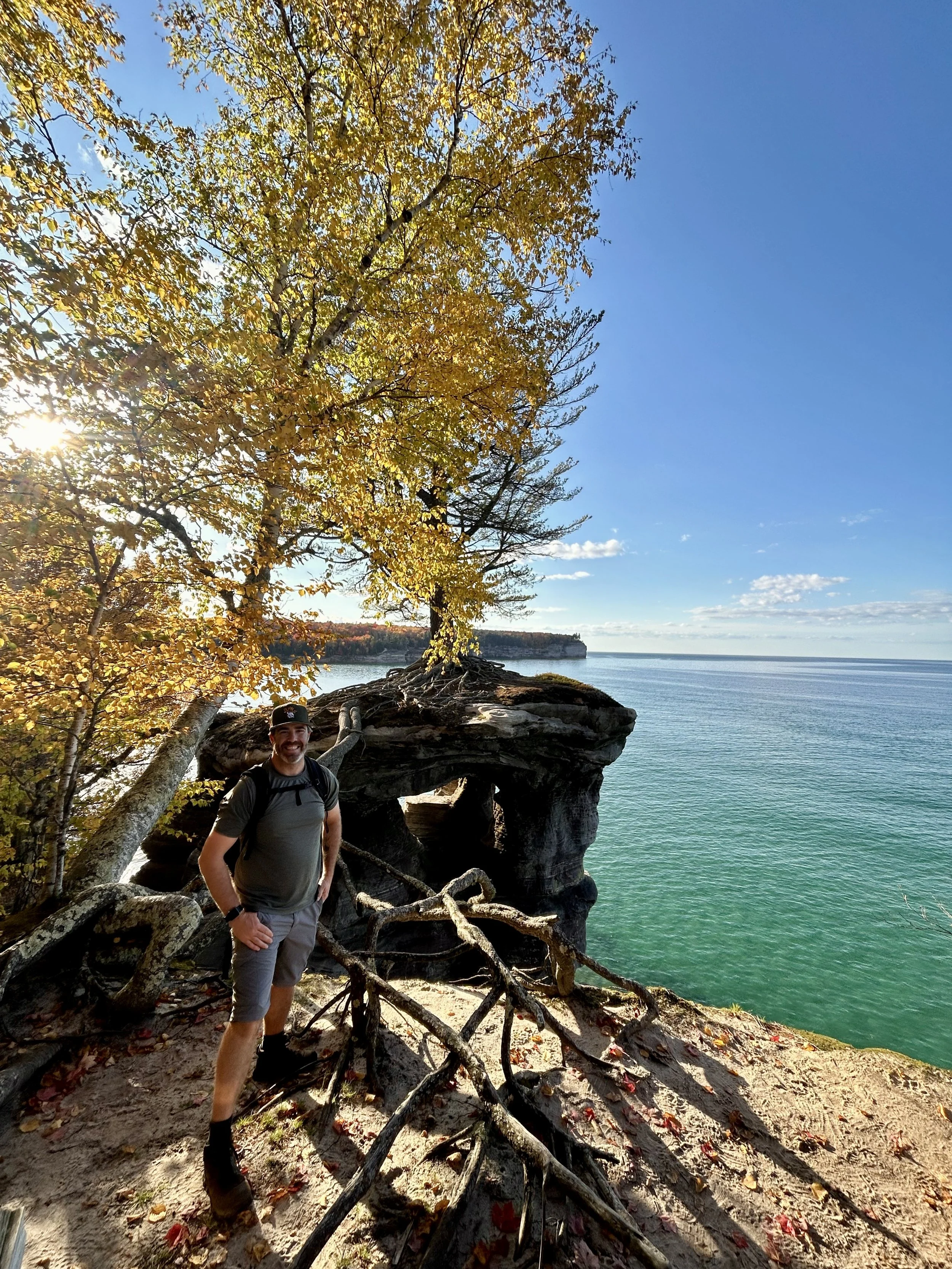 We then pushed on toward Munising and the Pictured Rocks National Shoreline. This was just over another hour of drive time to get to the trailhead. There are endless miles of trails here. We set out with the plan to reach Chapel Rock and Chapel Beach. This added another seven miles of hiking to our day. We are killing it! During this hike, we came up with a new game. The leaves were falling through an amazing canopy of trees, and we started trying to catch them as we walked. The only rule was that you couldn’t stop and wait for the leaves to fall—you had to keep walking and only catch the ones falling in front of you. We both managed to catch one each, which was quite the feat on its own—and very funny! Not only was the hike full of good laughs and fun, but it was beautiful. The golden fall colors mixed with burnt oranges and lingering green leaves were enough on their own. Then we came across several water crossings, waterfalls, and eventually made it down to Chapel Rock and the beach. Every time we’ve hiked along the Great Lakes and come down to the shoreline, it never feels like we’re looking at a freshwater lake. We always expect to see a whale, or seals, or some kind of marine life—but in the end, it really is just a lake. Well, it’s the largest lake on the western half of the entire planet! Pretty cool that we got to spend some time sitting on a beach taking it all in. Chapel Rock reminds me of the floating rocks from the movie Avatar. The power of the shoreline on Lake Superior is something to see! All of the sea caves and natural features are stunning. We spent some time relaxing on the beach, having a snack, and taking it all in. The sun was getting ready to set, and we didn’t want to be walking in the dark, so we had to leave this slice of paradise and hike back to the car. We capped the night off with some more brewery beers back in Munising. This time we headed into East Channel Brewing Company. We ended up chatting with a local there for quite some time about the area. He had some great insights and was a photographer, so we got to see some amazing shots he had captured of the northern lights and other sights in the area. After chatting with him for a bit, we headed back to By George Brewing Co. to grab a four-pack for the campsite. We couldn’t resist going back—it was so good! Once we hit the campsite, we were exhausted. Two and a half hours of driving and over 13 miles of hiking did the trick!