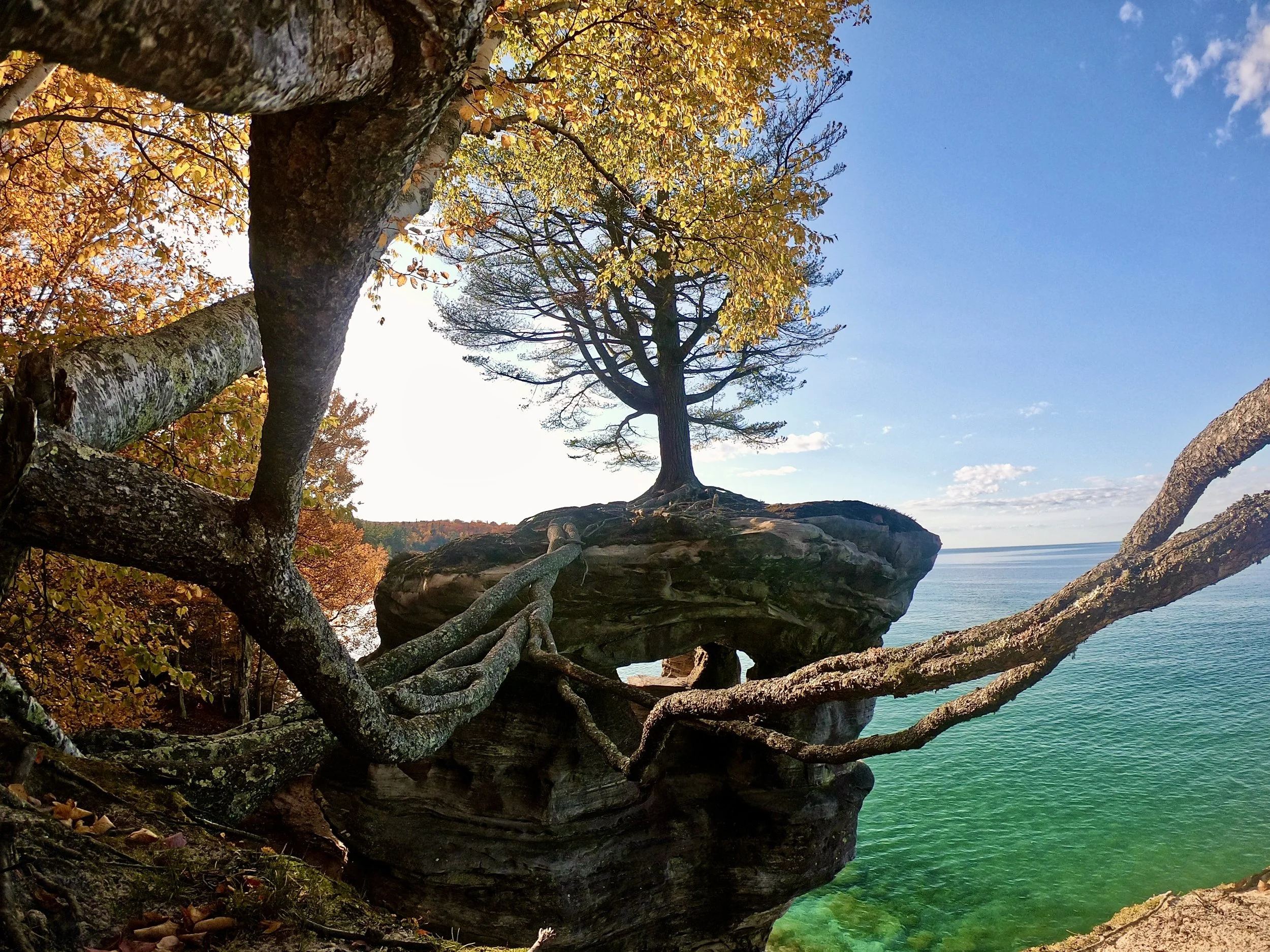The next day we had a couple of different plans. We had initially planned to spend the day hiking to Tahquamenon Falls and then exploring the Pictured Rocks National Shoreline the next day. We were worried about weather coming in on Sunday, as the forecasts were calling for rain, very strong winds, and shoreline waves of 10 to 16 feet. So, we ultimately decided to do both in the same day. This made for a long and adventurous day! Tahquamenon Falls was just over an hour’s drive from Munising. With our early start, we were able to get into the state park and find parking without an issue. There are two major falls in Tahquamenon Falls State Park. We started by hiking around the Lower Falls. There are several different styles of waterfalls in this section. We logged just over four miles of hiking around the falls and an island out in the middle of the river. The fall colors mixed with the amber color of the water made for an amazing combination. The Upper Falls section is a short drive from the Lower Falls. We planned to do this one second, as we had learned in our research that you can get a beer and some food at a park facility there. We quickly made it up to the Upper Falls trailhead and set back out. This was a much shorter hike with fewer waterfalls along the way. The falls here were also much larger and more dramatic. It was a beautiful area to spend the day exploring. At the end of the hike, we enjoyed some almond butter sandwiches and grabbed a beer from the park store. They even had their own brewery here called the Tahquamenon Falls Brewery. This is the first state park we’ve found that has a brewery. Way to go, U.P. and Michigan!