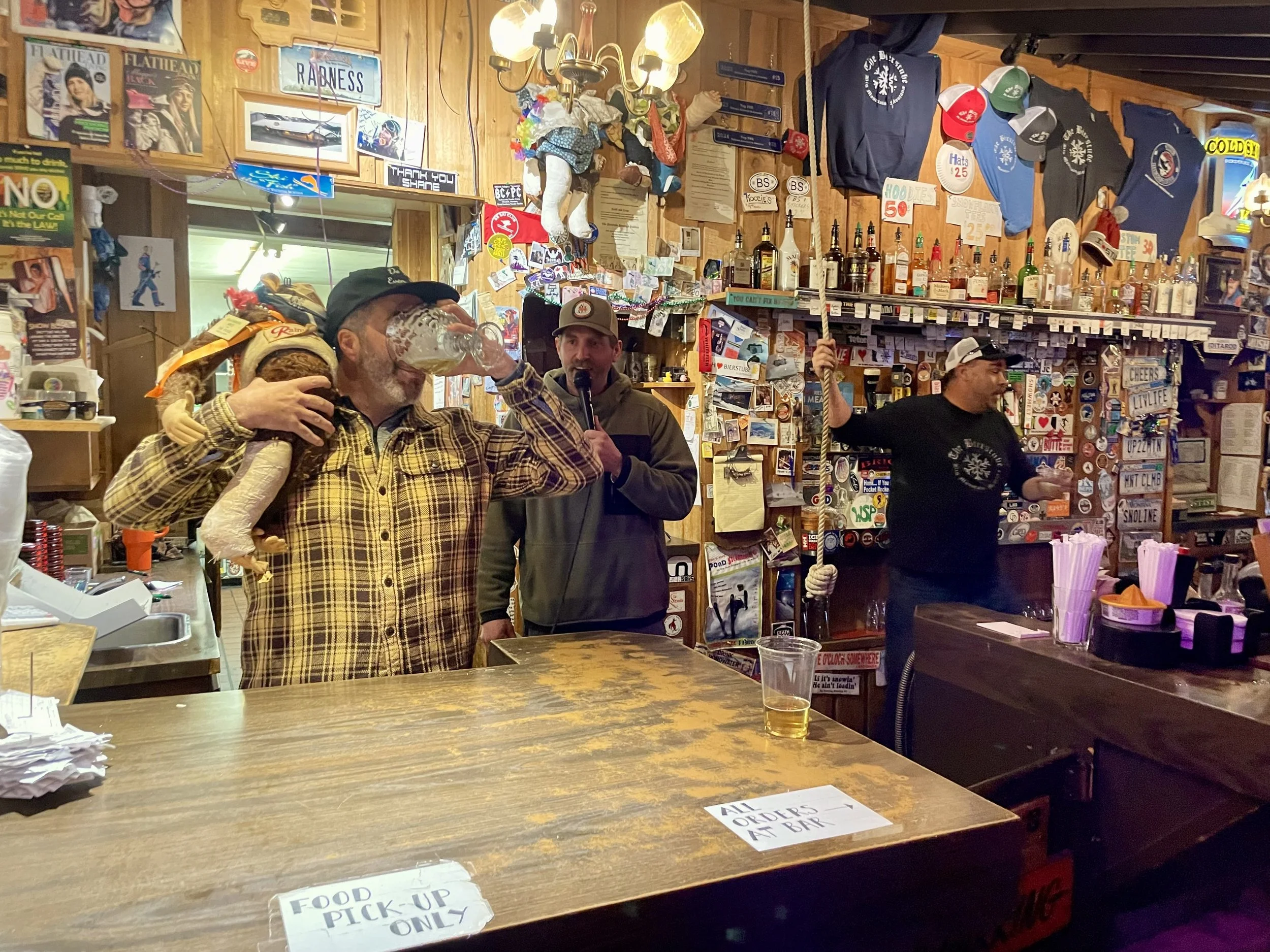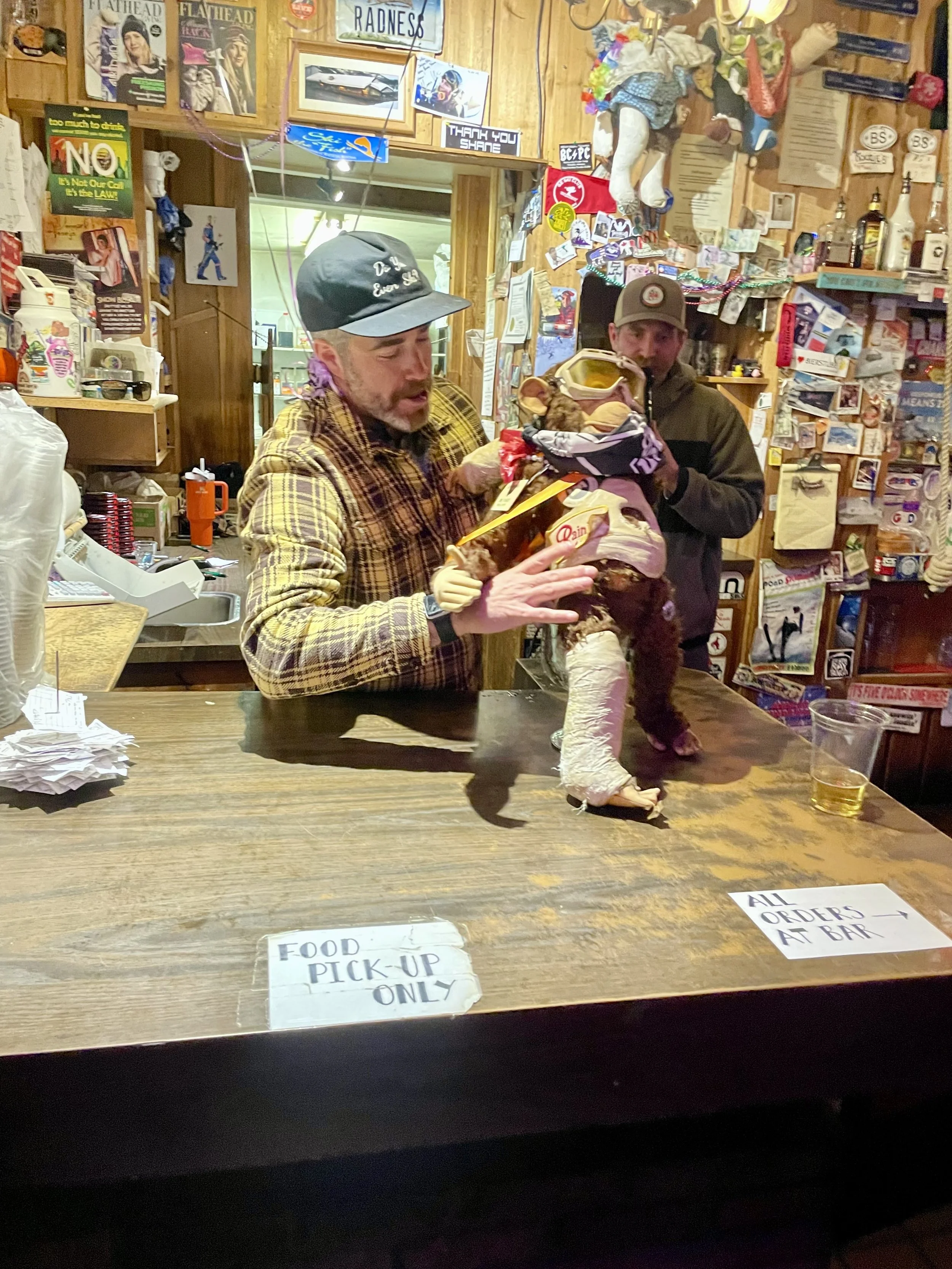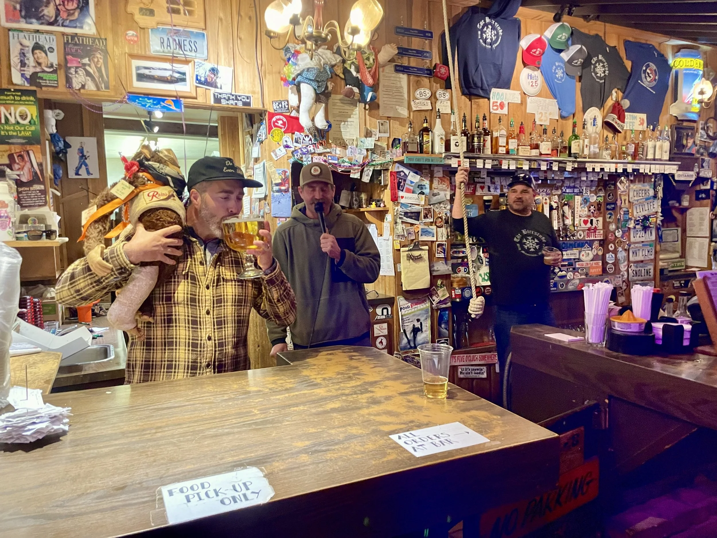 The second day of skiing, Ray Pitman and Kevin Wise joined Craig and me for a bro ski and snowboard day. Yes, we did let snowboarders join us for the day! We are inclusive! Kevin hadn’t snowboarded all year and killed it! At one point, we were flying down a run, and I did a shoulder check and could see Kevin’s flaming purple snowboard suit flying right next to me! I was stoked for him! I really enjoyed spending the day with them and catching up on all the new things going on in our lives. We rode every area of the mountain that day. I even got Craig to go into the Base Lodge. I had to stop by there and up at the Summit House to say hi to my old coworkers. We planned on wrapping the day up with Frabert at the Bierstube. Frabert is the mountain’s “Jackass of the Week” award event sponsored by the ski patrol. It’s the oldest tradition on the mountain, and not only do they give out this award, but they also give out a free keg of beer for the locals to enjoy. I have been going to these since I was a child. As we walked in, I immediately saw some friends I was hoping to run into, and then realized there were more and more people there I was not expecting to see. Then I saw my sister, Tori, walk in with some balloons and realized they had planned a surprise birthday party for me at Frabert. I barely had enough time to see everyone, say hi, and share in the stoke before I saw that the balloons had moved. They were now behind the bar, next to where the Frabert winner stands. That was the moment it all sank in that my stupid ski bag move at the airport was going to come back to bite me! I had recently told Will Buck all about Frabert on our hike in Tucson and that it was my life goal to never win Frabert. I totally jinxed myself! The patroller who told the story did a great job of highlighting my stupid moments and the fact that I have been coming to this event since I was a toddler. The bar was packed with friends and family, and I proudly walked up to accept my “big award!” The prize was a razzing from everyone there, a chant, and then I had to chug a 40 oz chalice of beer. The chant goes, “Here’s to Frabert, who skis so fast! He leaps over moguls and falls on his ass!” And with that, I did my duty and chugged the beer! A slight drip missed my mouth, but overall I CRUSHED IT! To the point that I got compliments on it for the remainder of my trip in Whitefish. With my dad being the first Lifetime Frabert Award winner, I HAD TO! All in all, I was not expecting a surprise birthday party and couldn’t have been happier they pulled it off. Kudos to Amity for all the behind-the-scenes work—she wasn’t even there for this trip! There wasn’t much going on later that night other than playing with the Moores’ pets, Wally and Marley!
