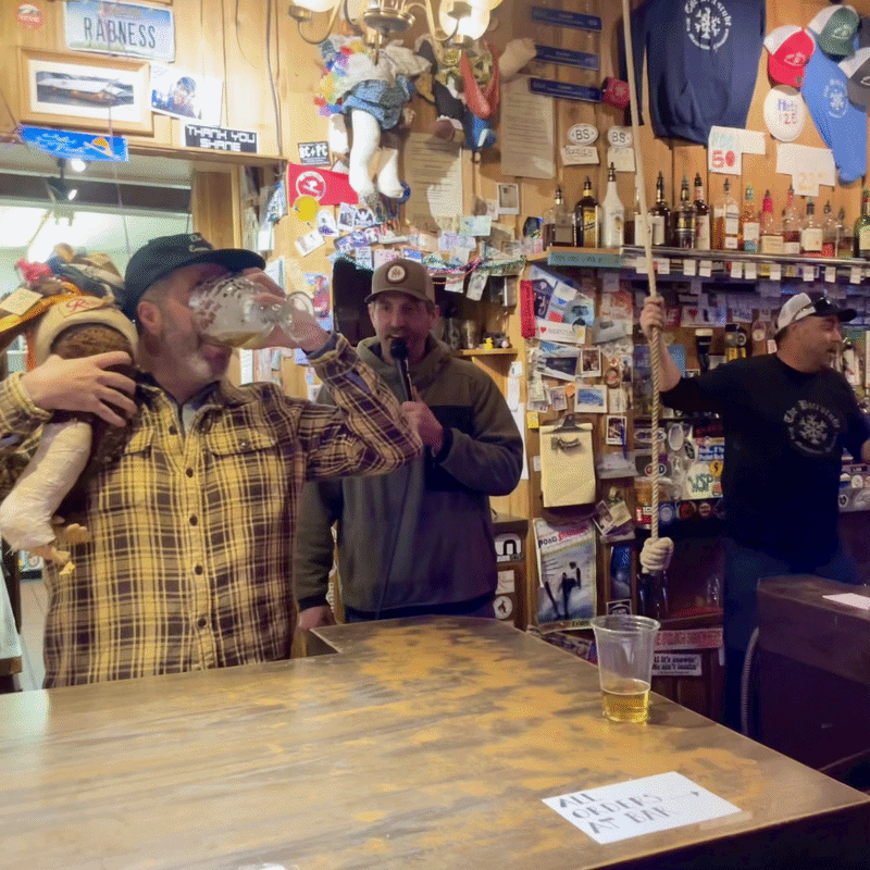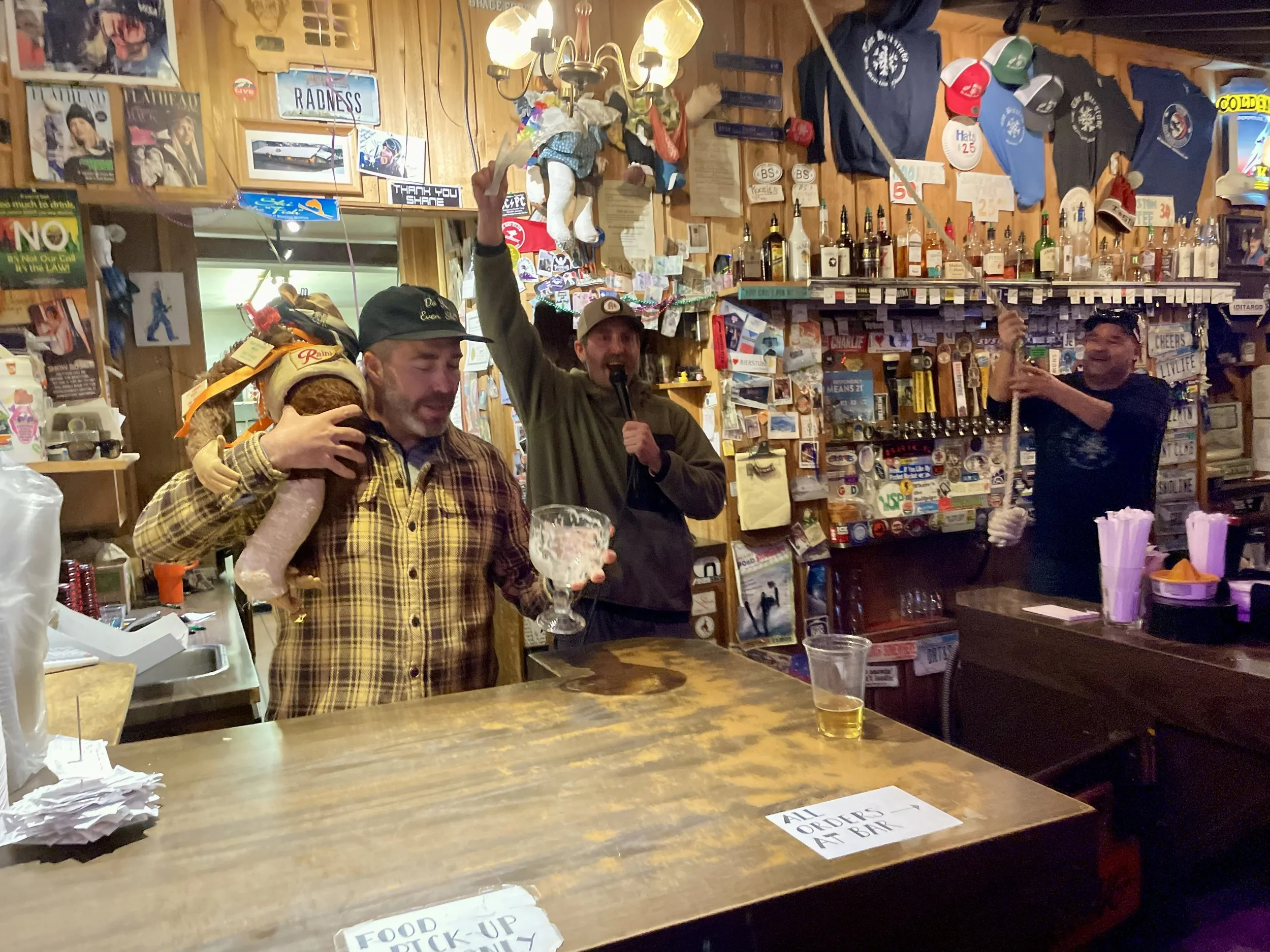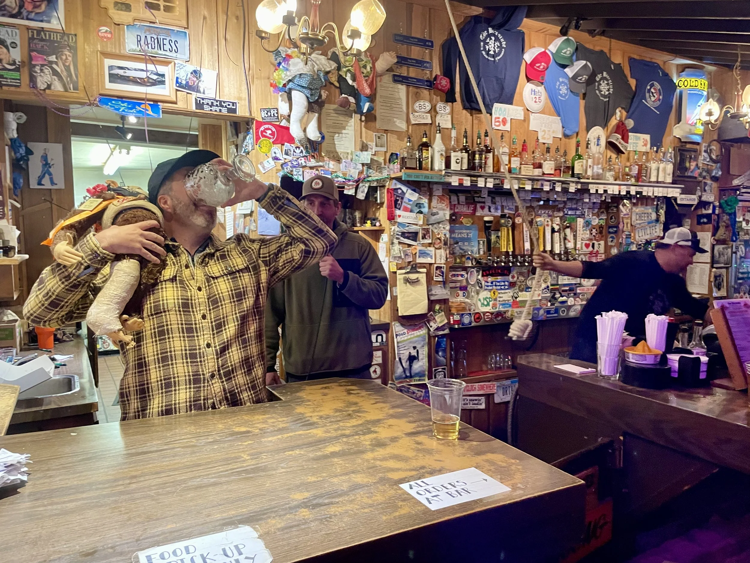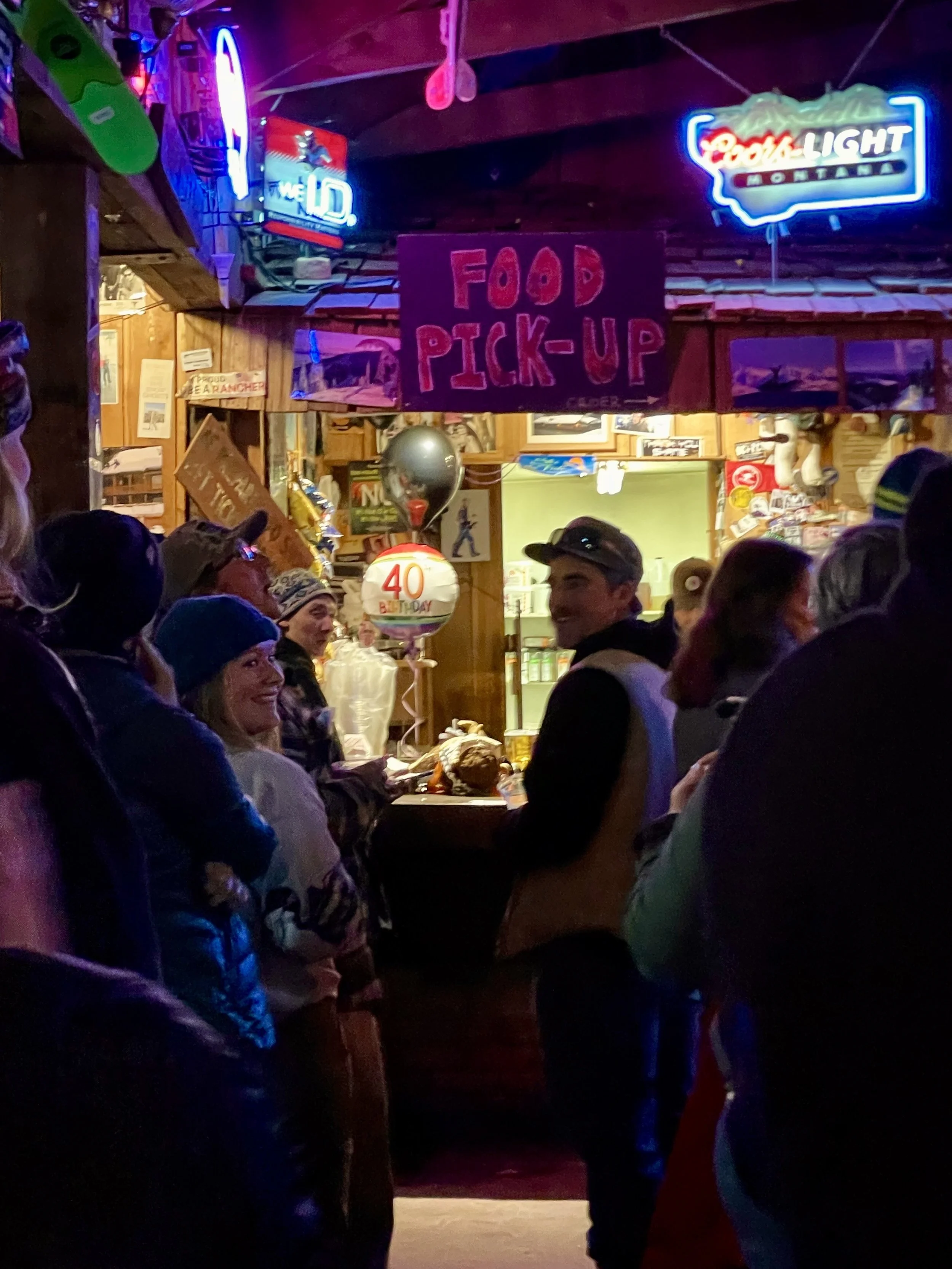 The second day of skiing, Ray Pitman and Kevin Wise joined Craig and me for a bro ski and snowboard day. Yes, we did let snowboarders join us for the day! We are inclusive! Kevin hadn’t snowboarded all year and killed it! At one point, we were flying down a run, and I did a shoulder check and could see Kevin’s flaming purple snowboard suit flying right next to me! I was stoked for him! I really enjoyed spending the day with them and catching up on all the new things going on in our lives. We rode every area of the mountain that day. I even got Craig to go into the Base Lodge. I had to stop by there and up at the Summit House to say hi to my old coworkers. We planned on wrapping the day up with Frabert at the Bierstube. Frabert is the mountain’s “Jackass of the Week” award event sponsored by the ski patrol. It’s the oldest tradition on the mountain, and not only do they give out this award, but they also give out a free keg of beer for the locals to enjoy. I have been going to these since I was a child. As we walked in, I immediately saw some friends I was hoping to run into, and then realized there were more and more people there I was not expecting to see. Then I saw my sister, Tori, walk in with some balloons and realized they had planned a surprise birthday party for me at Frabert. I barely had enough time to see everyone, say hi, and share in the stoke before I saw that the balloons had moved. They were now behind the bar, next to where the Frabert winner stands. That was the moment it all sank in that my stupid ski bag move at the airport was going to come back to bite me! I had recently told Will Buck all about Frabert on our hike in Tucson and that it was my life goal to never win Frabert. I totally jinxed myself! The patroller who told the story did a great job of highlighting my stupid moments and the fact that I have been coming to this event since I was a toddler. The bar was packed with friends and family, and I proudly walked up to accept my “big award!” The prize was a razzing from everyone there, a chant, and then I had to chug a 40 oz chalice of beer. The chant goes, “Here’s to Frabert, who skis so fast! He leaps over moguls and falls on his ass!” And with that, I did my duty and chugged the beer! A slight drip missed my mouth, but overall I CRUSHED IT! To the point that I got compliments on it for the remainder of my trip in Whitefish. With my dad being the first Lifetime Frabert Award winner, I HAD TO! All in all, I was not expecting a surprise birthday party and couldn’t have been happier they pulled it off. Kudos to Amity for all the behind-the-scenes work—she wasn’t even there for this trip! There wasn’t much going on later that night other than playing with the Moores’ pets, Wally and Marley!