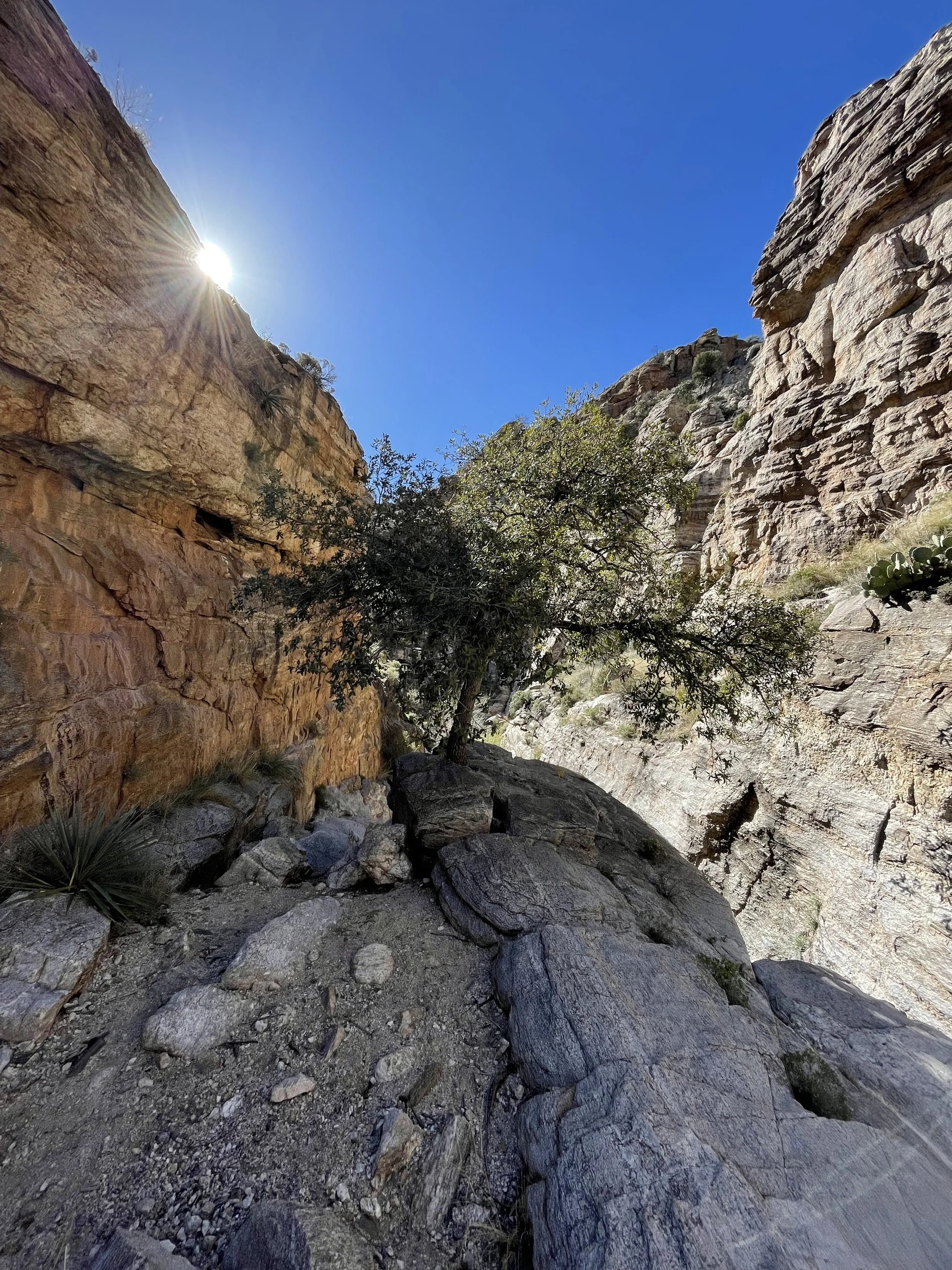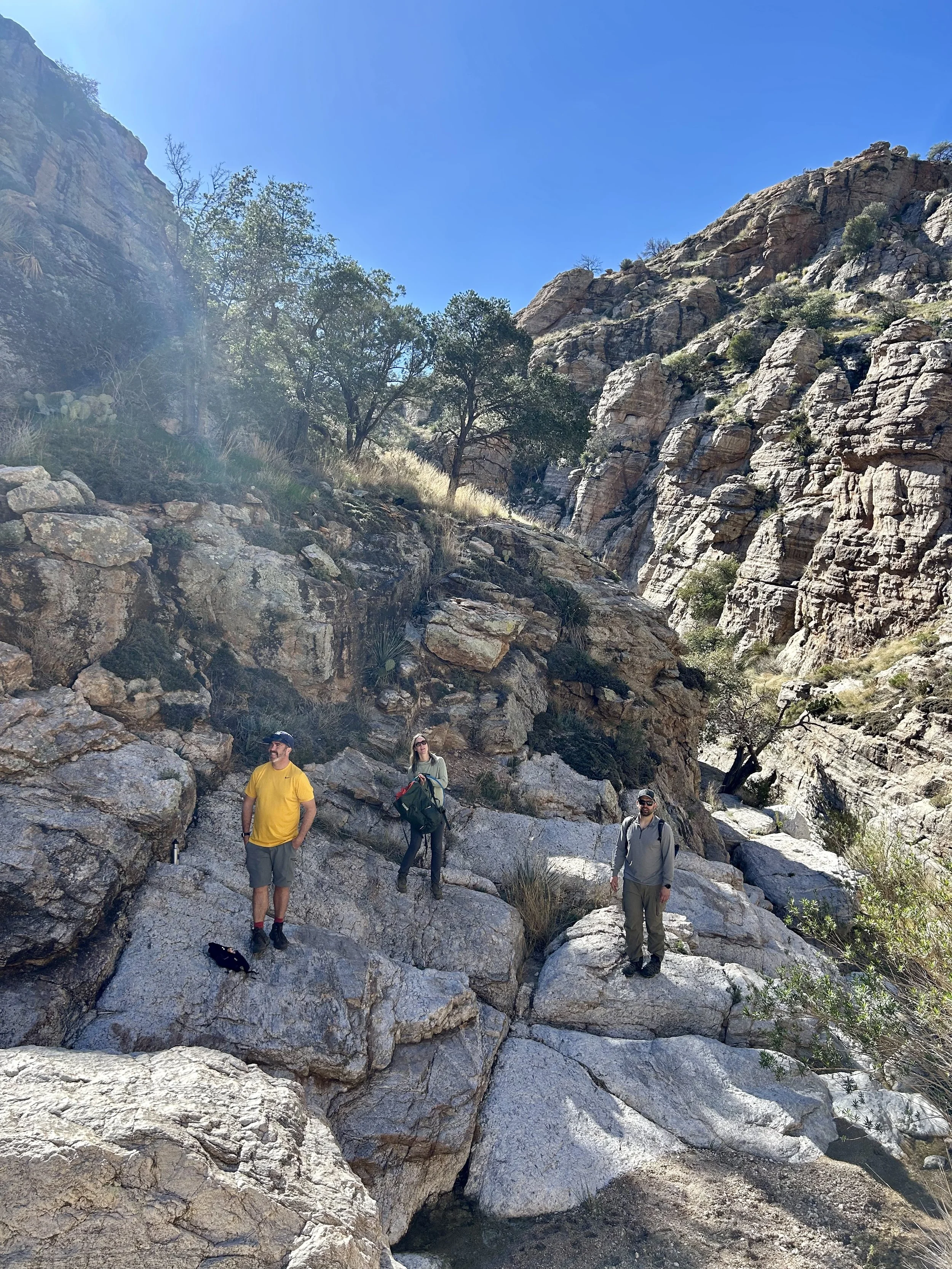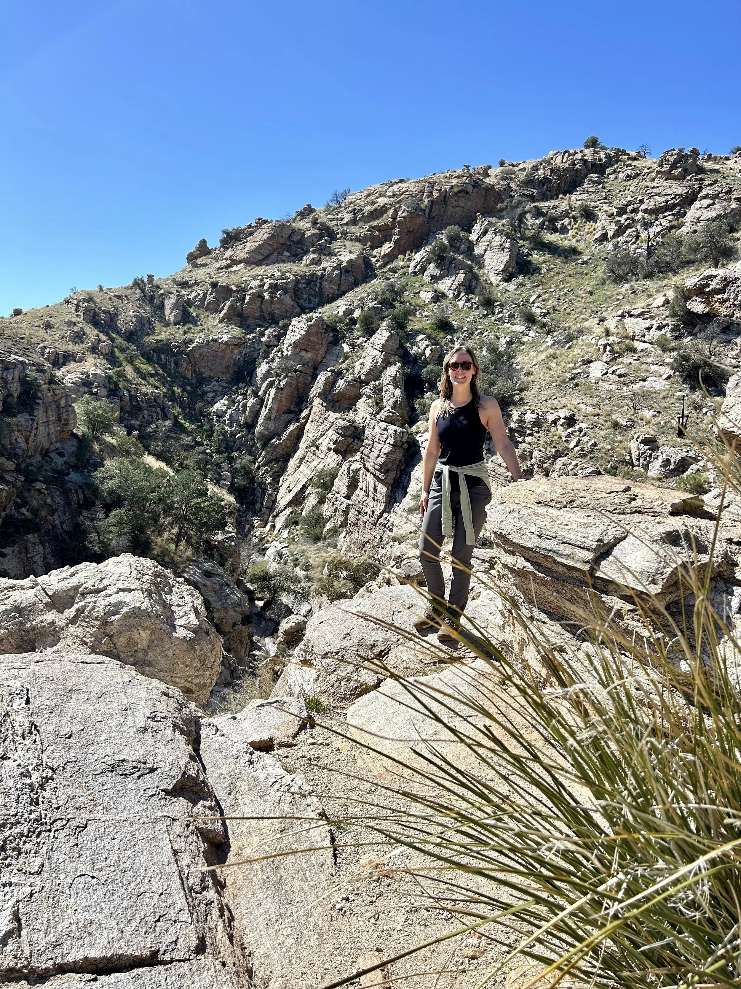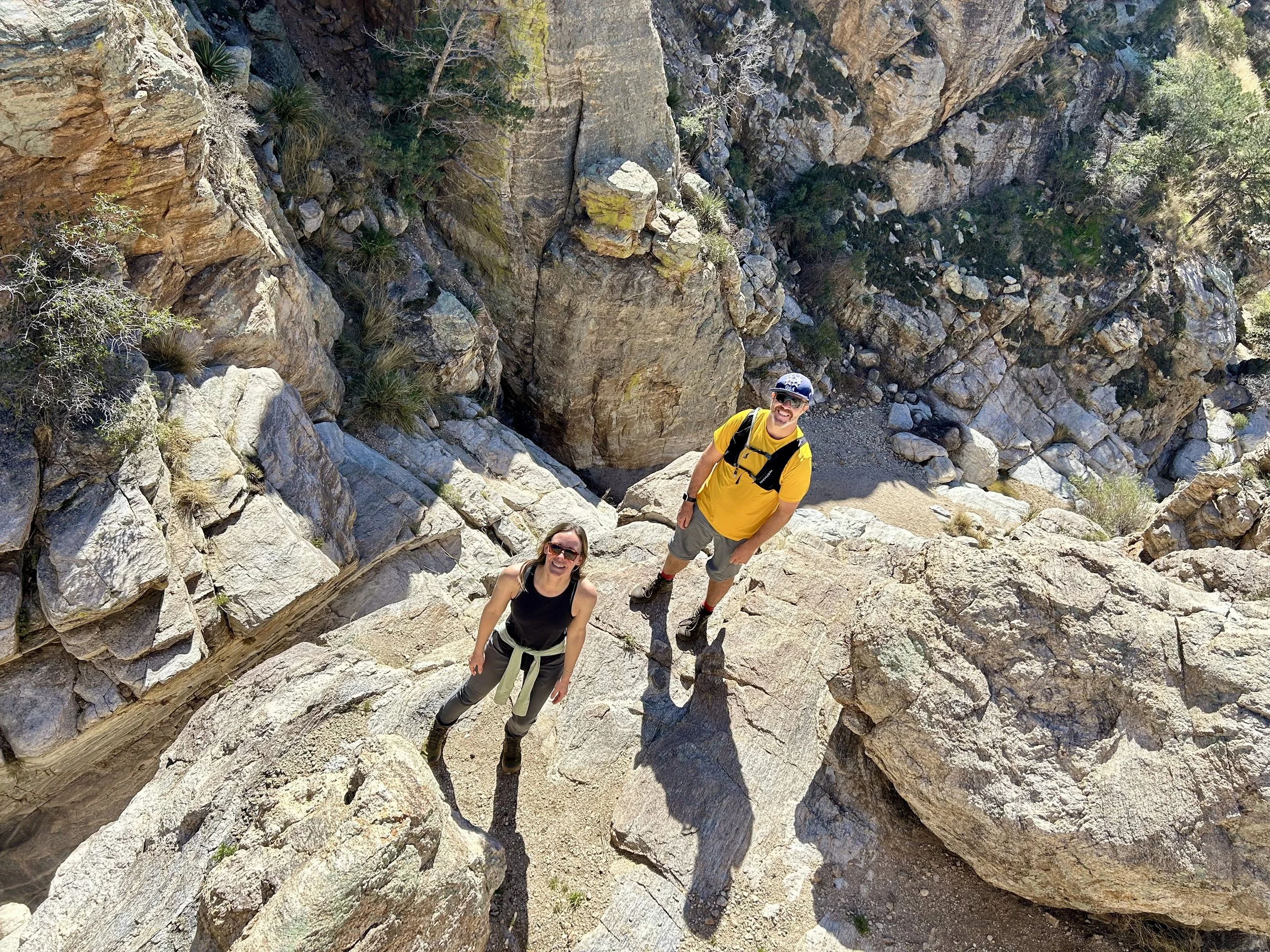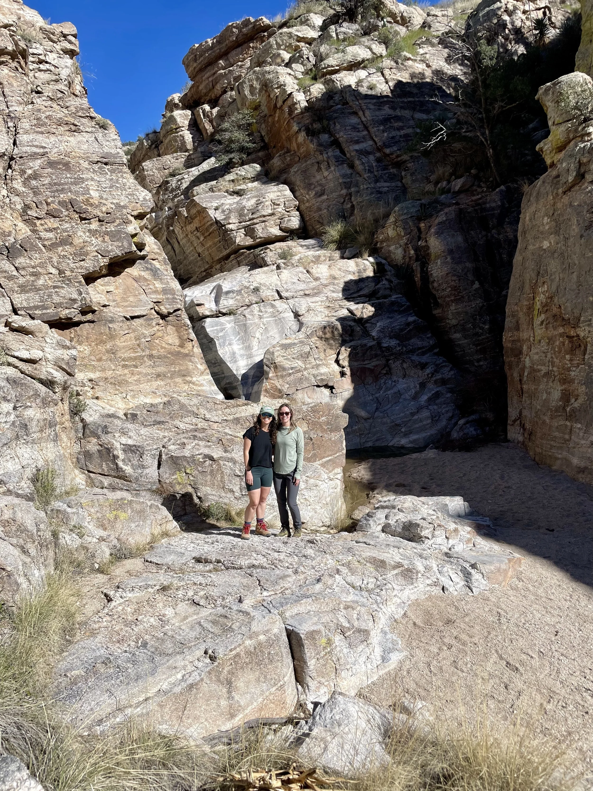 The next morning, we got an early start to do some hiking and exploring around the Mount Lemmon area. We set out to hike Soldier Trail. The trailhead was right on the road up to Mount Lemmon. It started with a good amount of vertical climb through the saguaro forest. We gained elevation pretty quickly, and the desert shifted from gigantic cacti to highland desert with lots of yellow and orange flowers. We had no idea what the end of the trail was and joked about the chance that it was just a sign, as this had happened to us recently. As we got to the distance AllTrails gave us for the hike, we noticed a little creek and a trail running along it. We decided to check it out to find a shady place to have lunch. We ended up walking into a desert oasis cut into a tiny slot canyon hidden in the rolling hills. The best part, no one was there! We hiked around the different levels of the canyon, took tons of pictures, and reveled in our hiking surprise. We didn’t have a ton of time to hang out, as we wanted to head up to the top of Mount Lemmon after our hike, so we eventually pulled our things back together and worked our way back down the trail to the car.