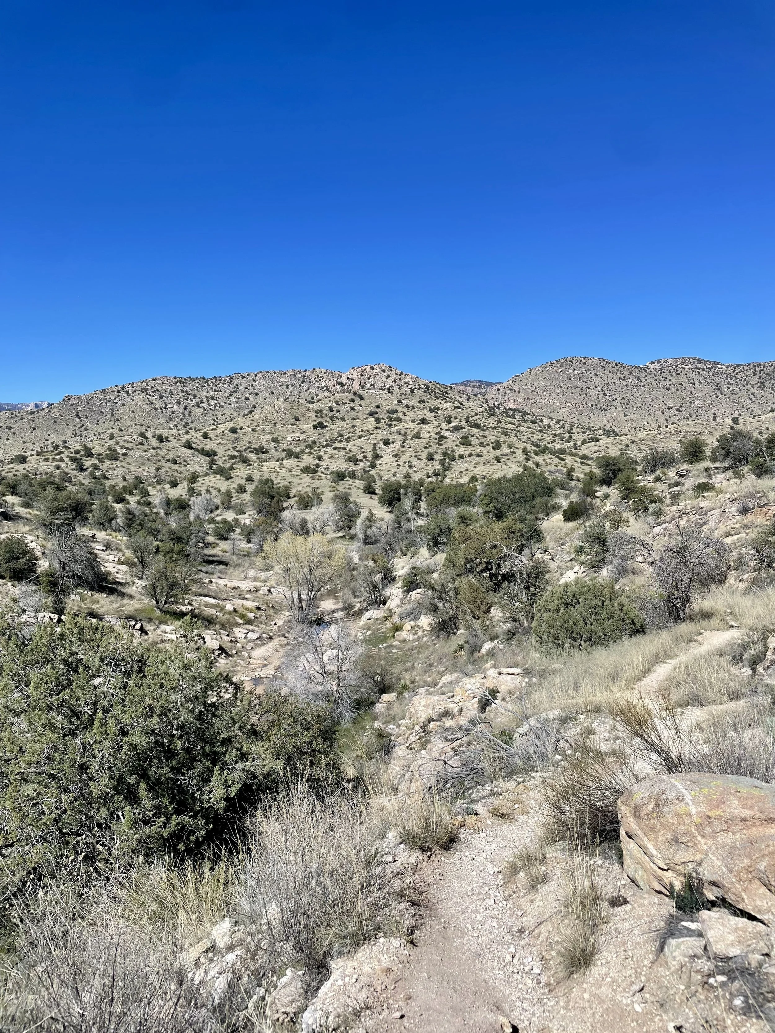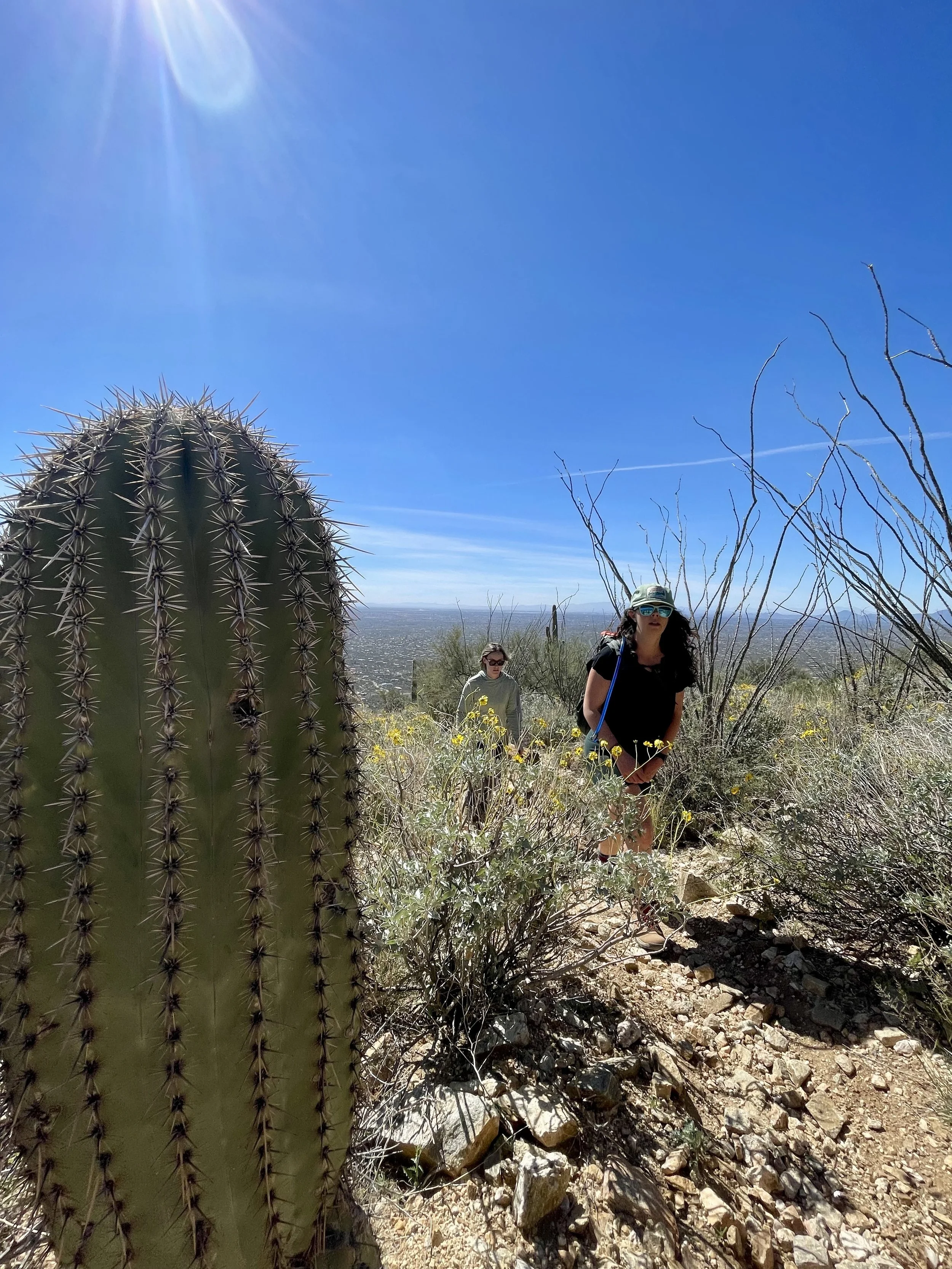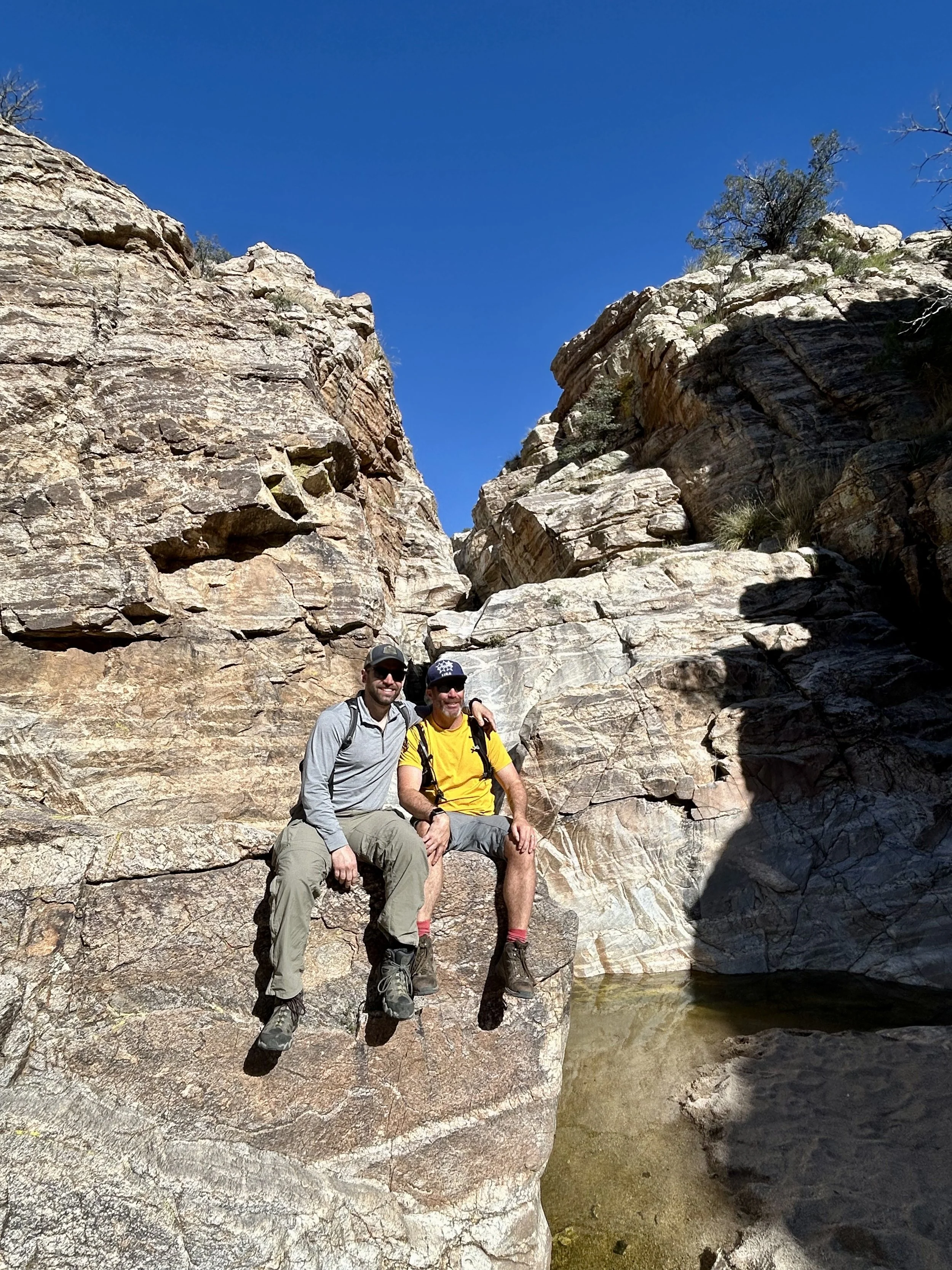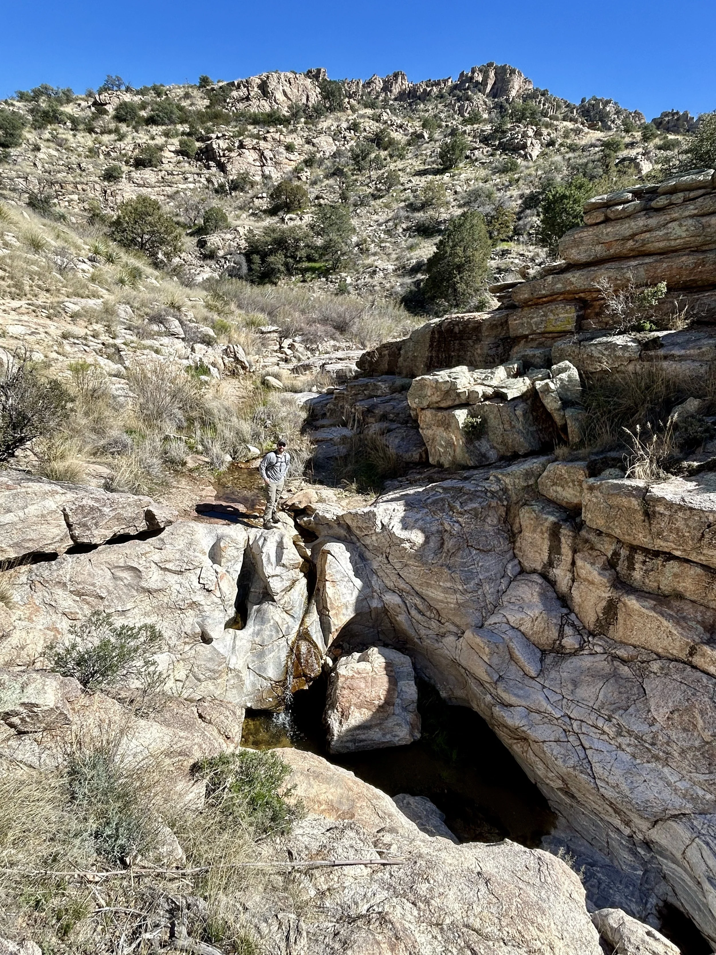 The next morning, we got an early start to do some hiking and exploring around the Mount Lemmon area. We set out to hike Soldier Trail. The trailhead was right on the road up to Mount Lemmon. It started with a good amount of vertical climb through the saguaro forest. We gained elevation pretty quickly, and the desert shifted from gigantic cacti to highland desert with lots of yellow and orange flowers. We had no idea what the end of the trail was and joked about the chance that it was just a sign, as this had happened to us recently. As we got to the distance AllTrails gave us for the hike, we noticed a little creek and a trail running along it. We decided to check it out to find a shady place to have lunch. We ended up walking into a desert oasis cut into a tiny slot canyon hidden in the rolling hills. The best part, no one was there! We hiked around the different levels of the canyon, took tons of pictures, and reveled in our hiking surprise. We didn’t have a ton of time to hang out, as we wanted to head up to the top of Mount Lemmon after our hike, so we eventually pulled our things back together and worked our way back down the trail to the car.