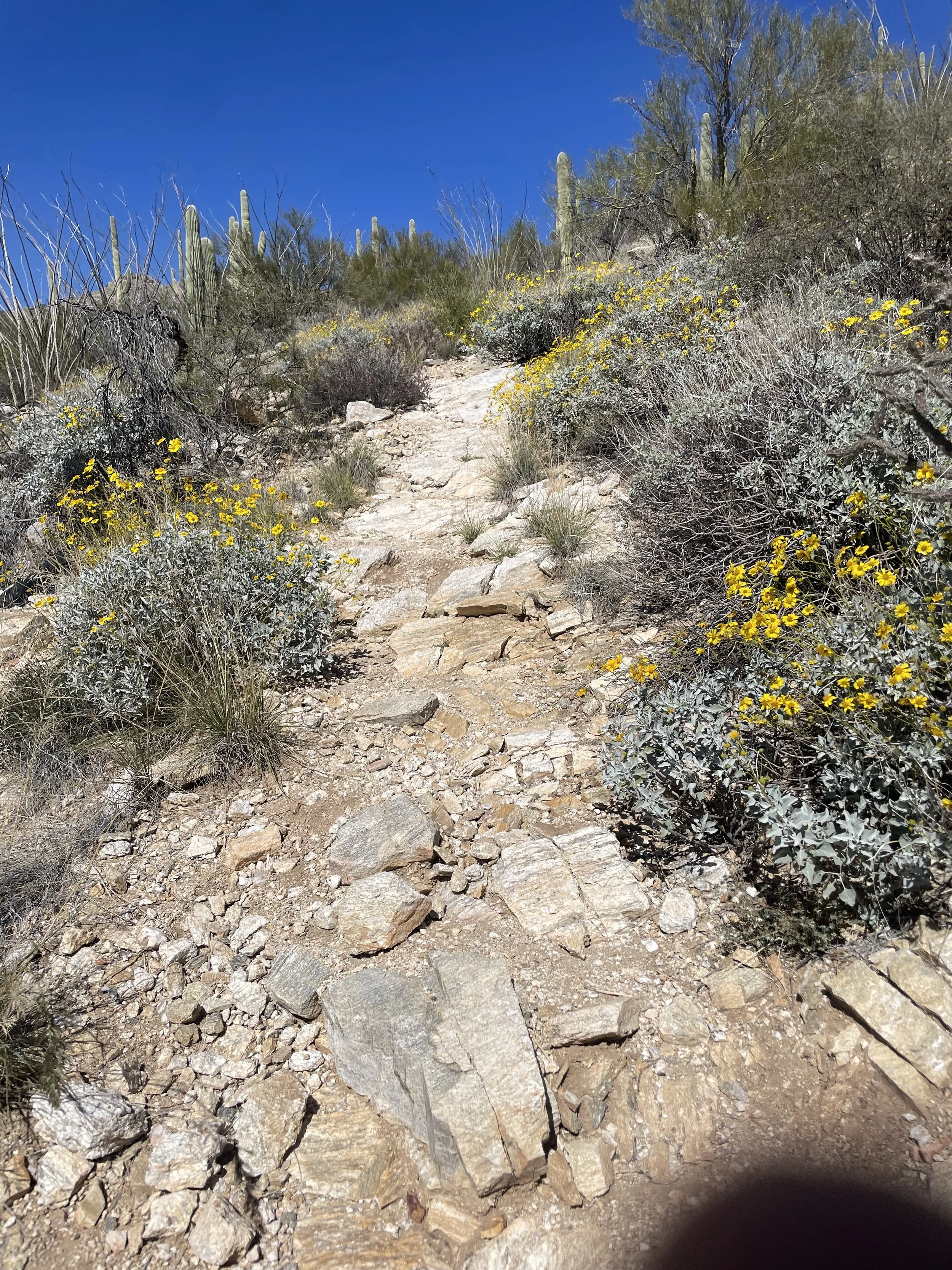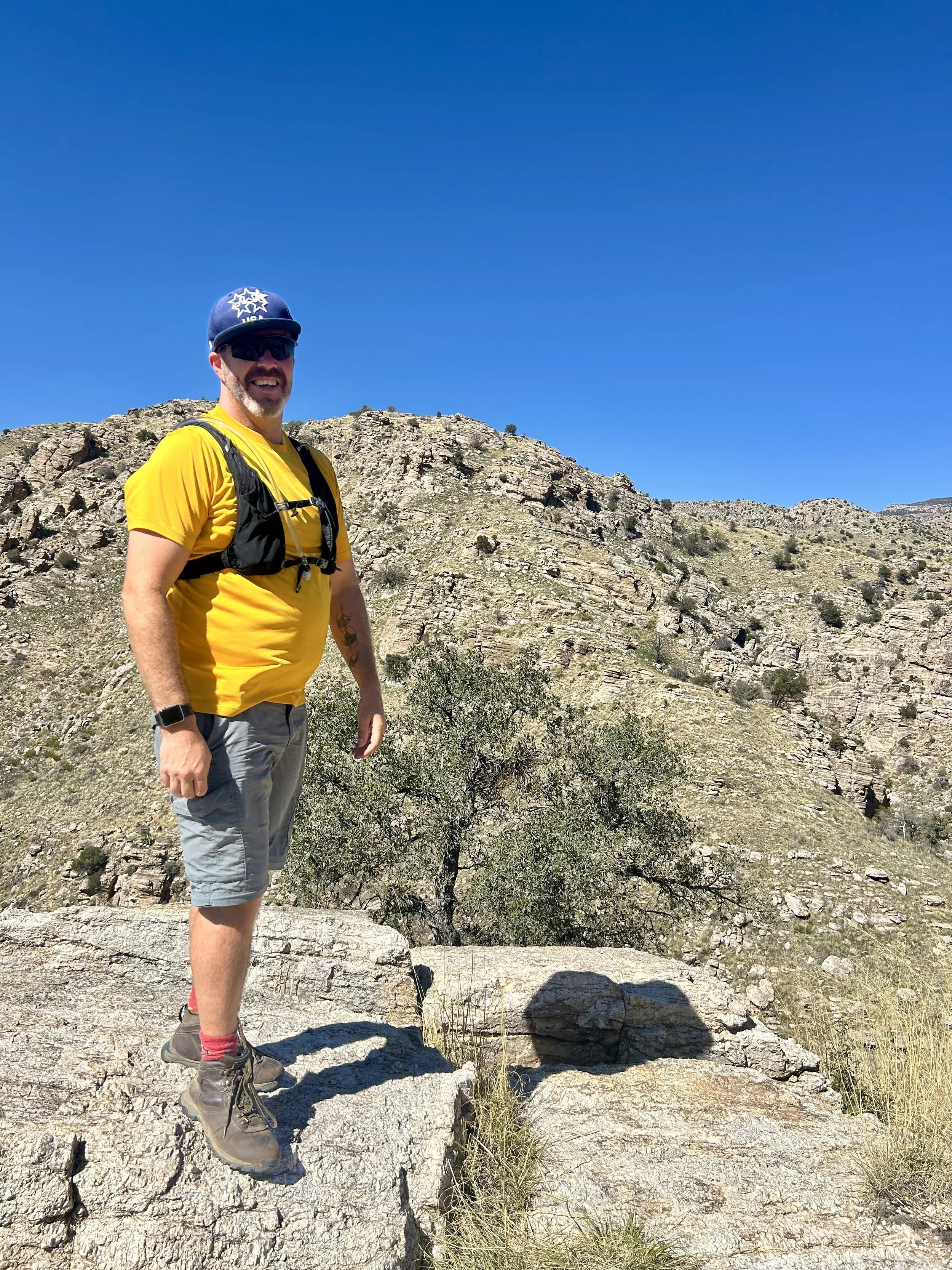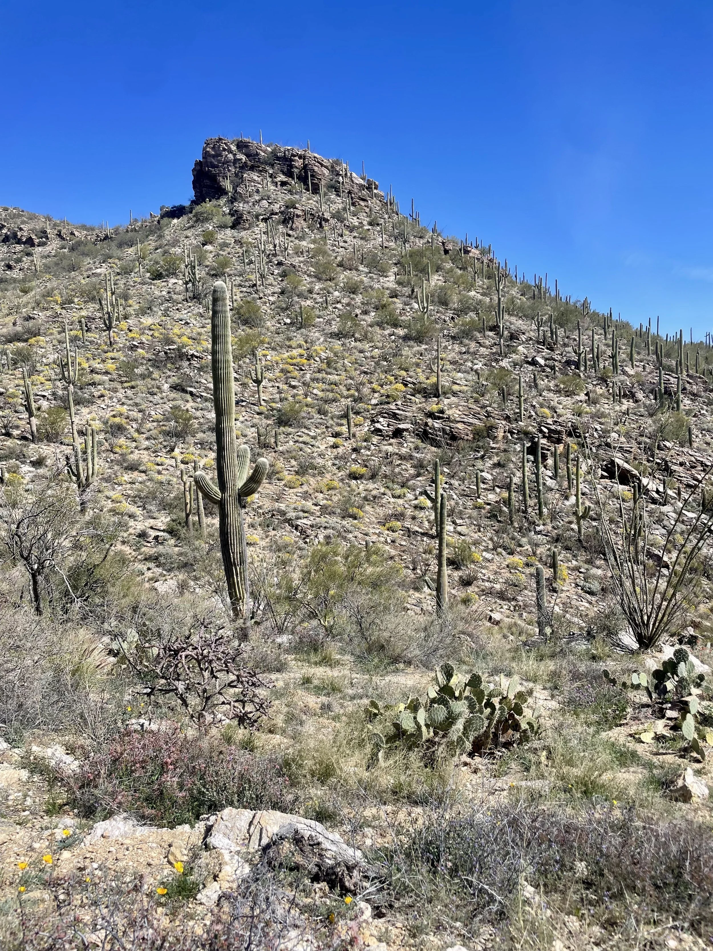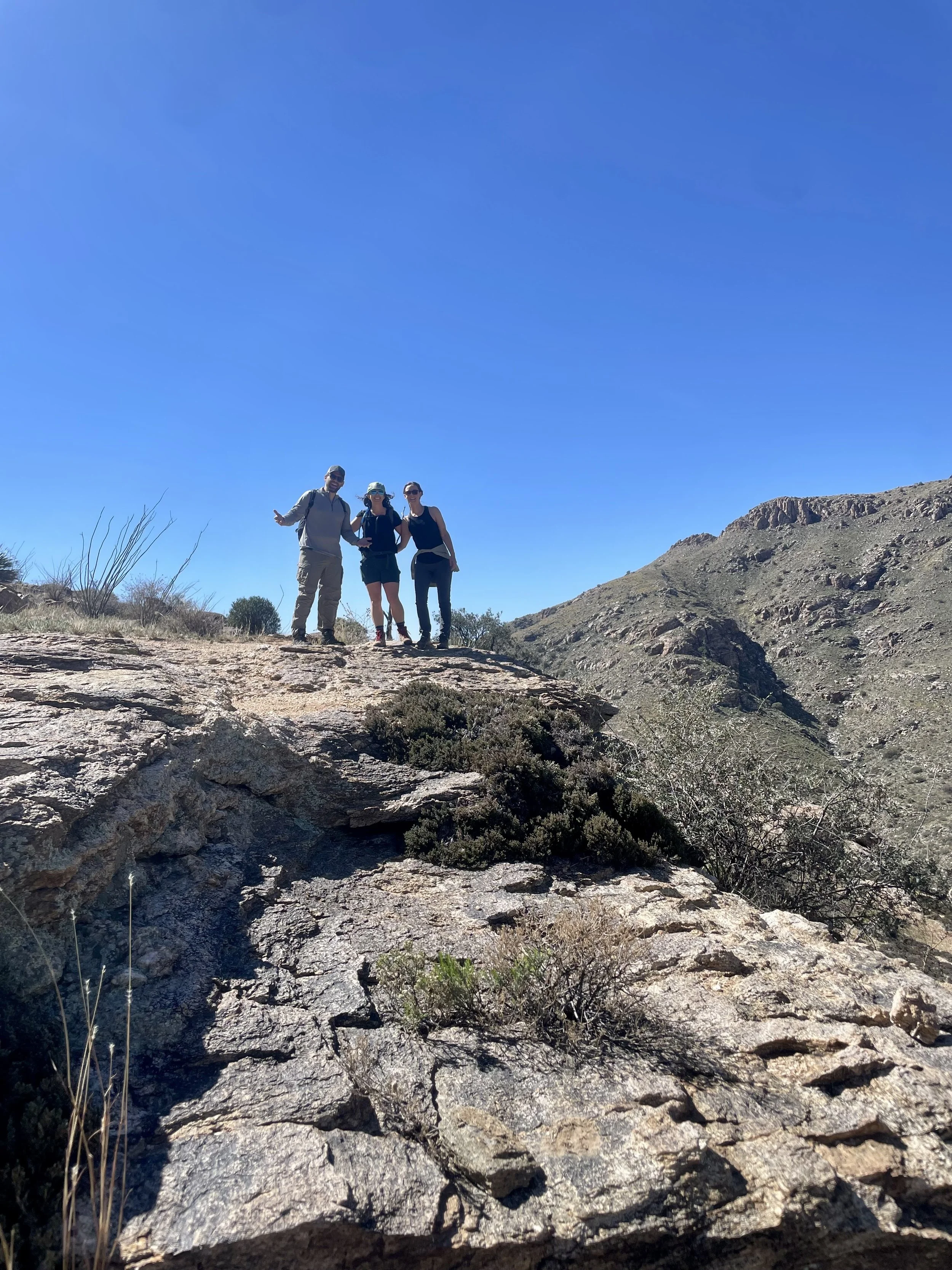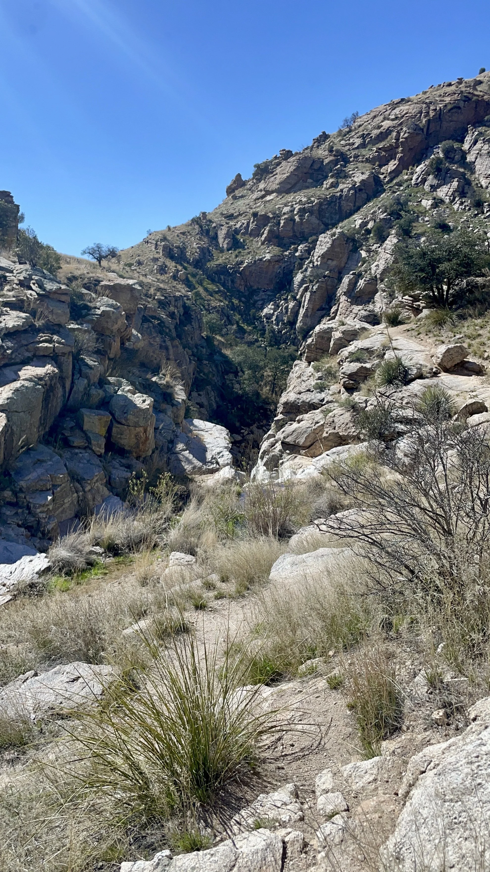 The next morning, we got an early start to do some hiking and exploring around the Mount Lemmon area. We set out to hike Soldier Trail. The trailhead was right on the road up to Mount Lemmon. It started with a good amount of vertical climb through the saguaro forest. We gained elevation pretty quickly, and the desert shifted from gigantic cacti to highland desert with lots of yellow and orange flowers. We had no idea what the end of the trail was and joked about the chance that it was just a sign, as this had happened to us recently. As we got to the distance AllTrails gave us for the hike, we noticed a little creek and a trail running along it. We decided to check it out to find a shady place to have lunch. We ended up walking into a desert oasis cut into a tiny slot canyon hidden in the rolling hills. The best part, no one was there! We hiked around the different levels of the canyon, took tons of pictures, and reveled in our hiking surprise. We didn’t have a ton of time to hang out, as we wanted to head up to the top of Mount Lemmon after our hike, so we eventually pulled our things back together and worked our way back down the trail to the car.