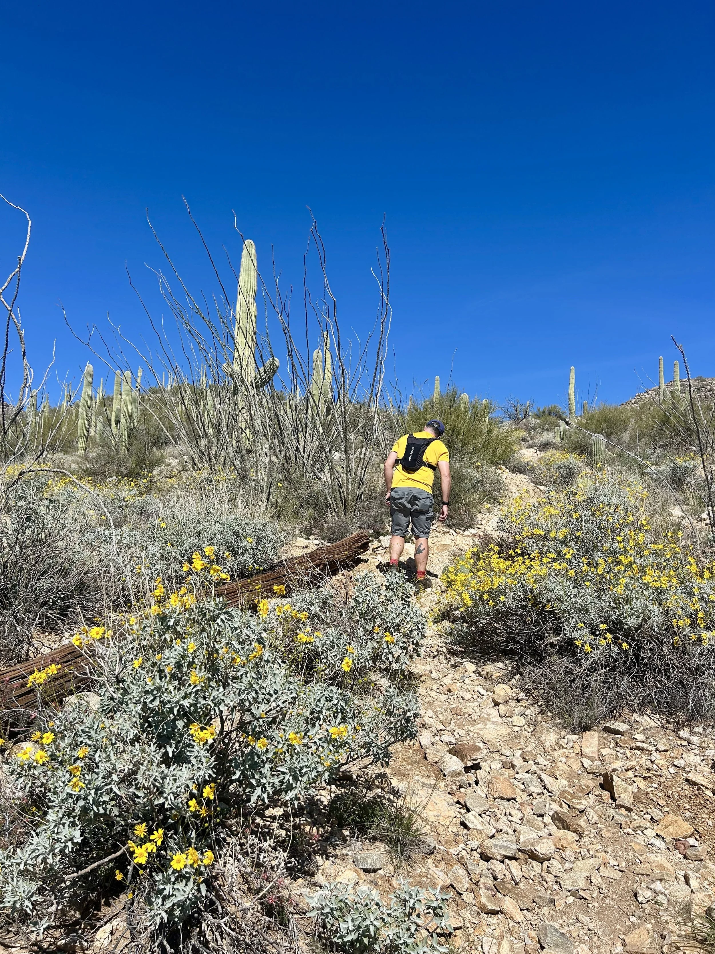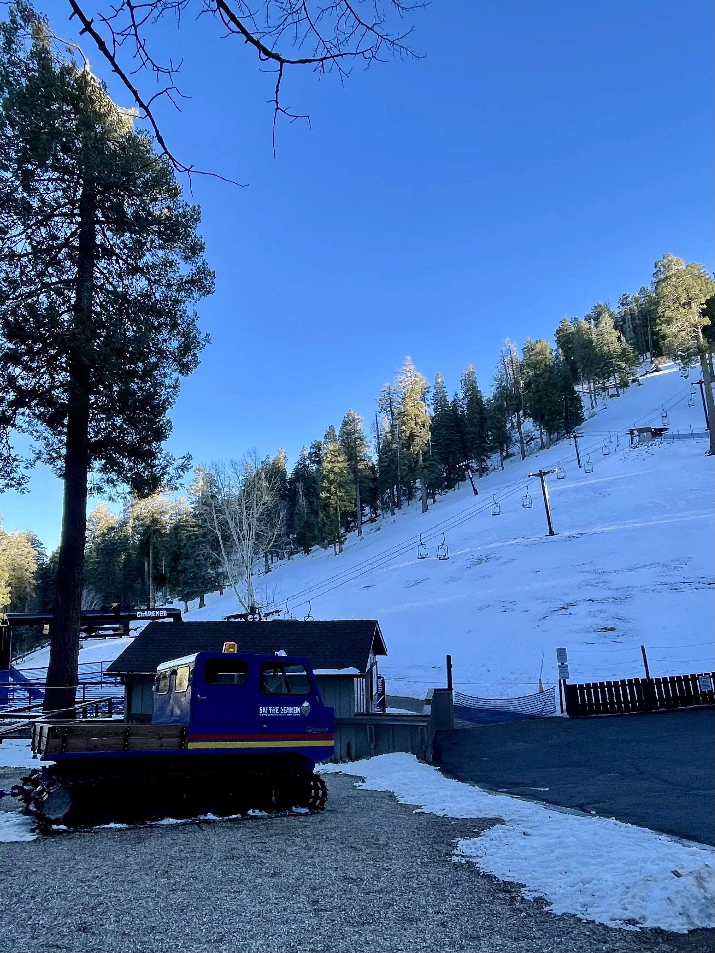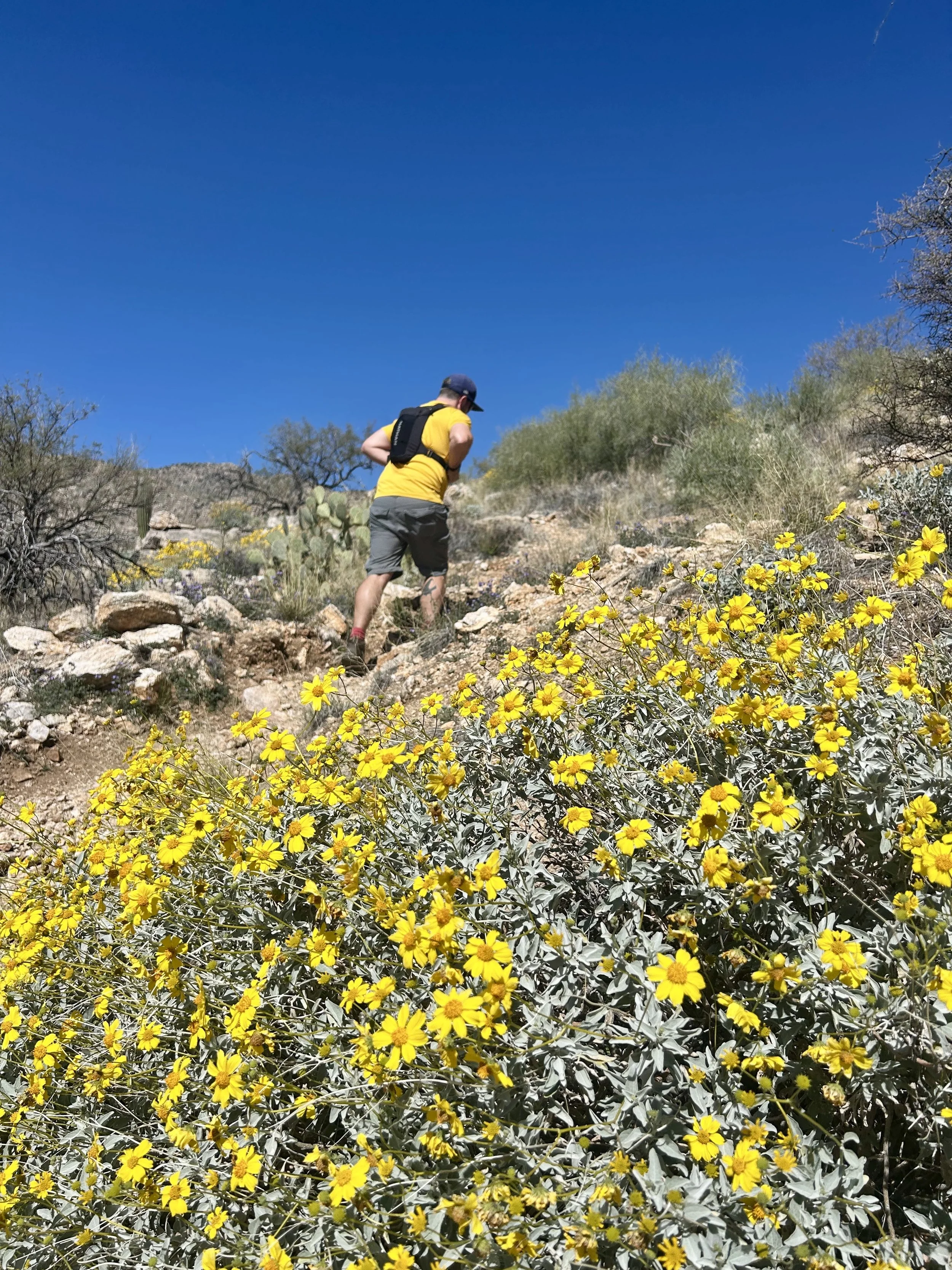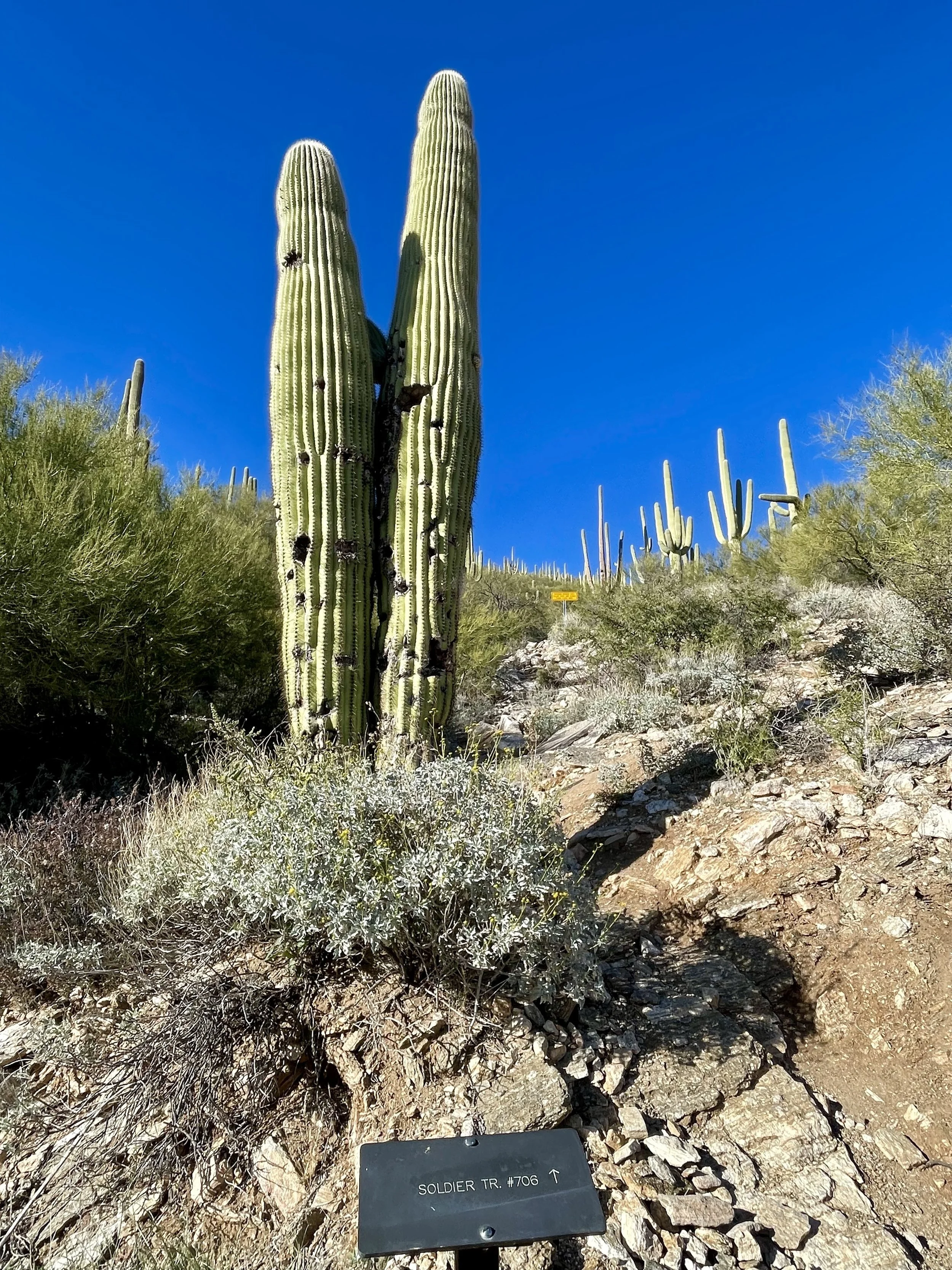 The next morning, we got an early start to do some hiking and exploring around the Mount Lemmon area. We set out to hike Soldier Trail. The trailhead was right on the road up to Mount Lemmon. It started with a good amount of vertical climb through the saguaro forest. We gained elevation pretty quickly, and the desert shifted from gigantic cacti to highland desert with lots of yellow and orange flowers. We had no idea what the end of the trail was and joked about the chance that it was just a sign, as this had happened to us recently. As we got to the distance AllTrails gave us for the hike, we noticed a little creek and a trail running along it. We decided to check it out to find a shady place to have lunch. We ended up walking into a desert oasis cut into a tiny slot canyon hidden in the rolling hills. The best part, no one was there! We hiked around the different levels of the canyon, took tons of pictures, and reveled in our hiking surprise. We didn’t have a ton of time to hang out, as we wanted to head up to the top of Mount Lemmon after our hike, so we eventually pulled our things back together and worked our way back down the trail to the car.