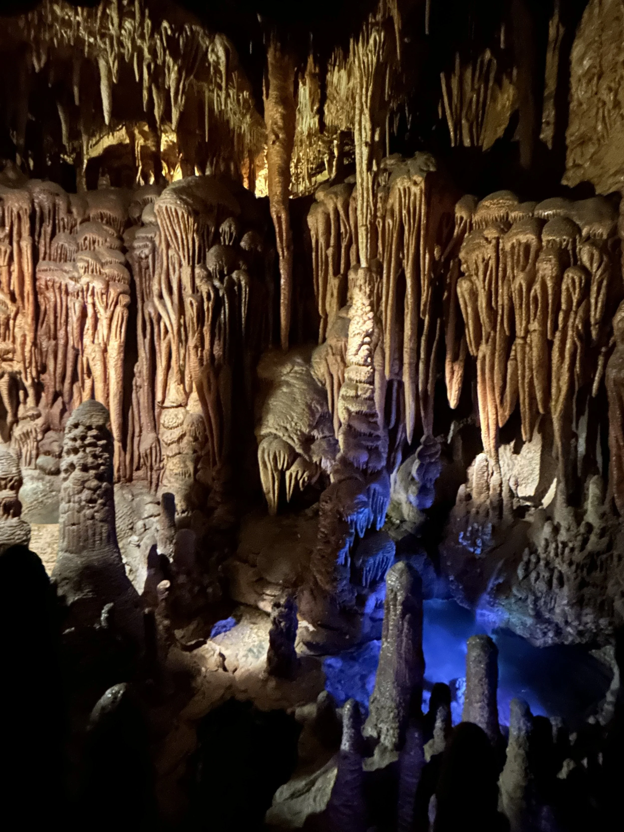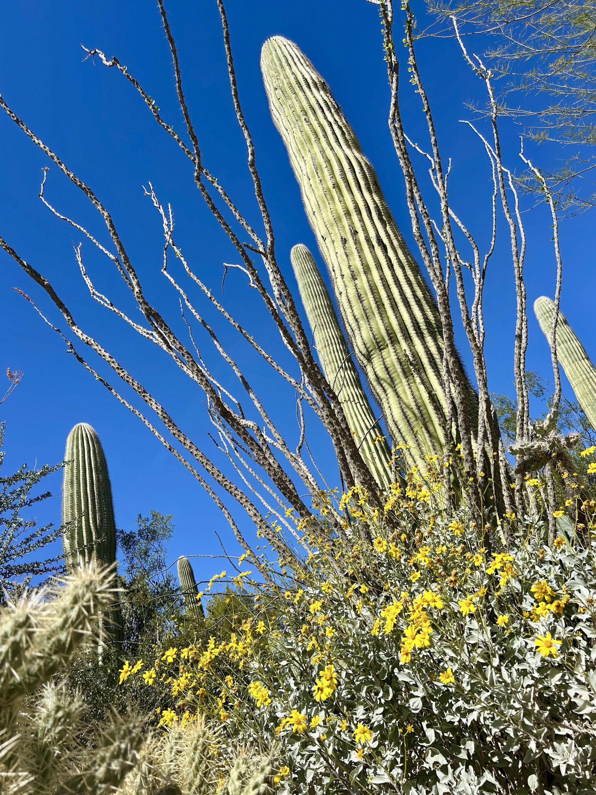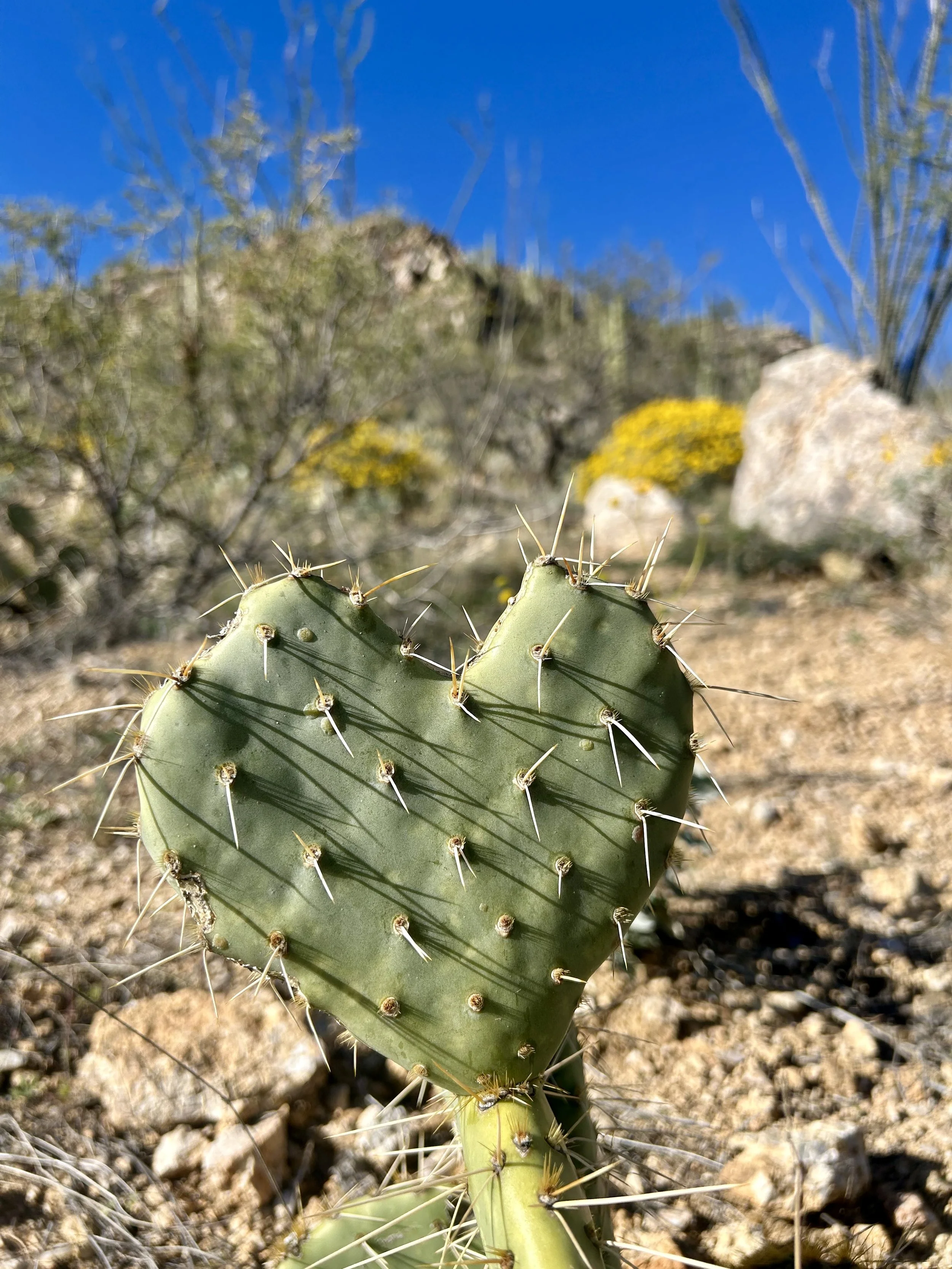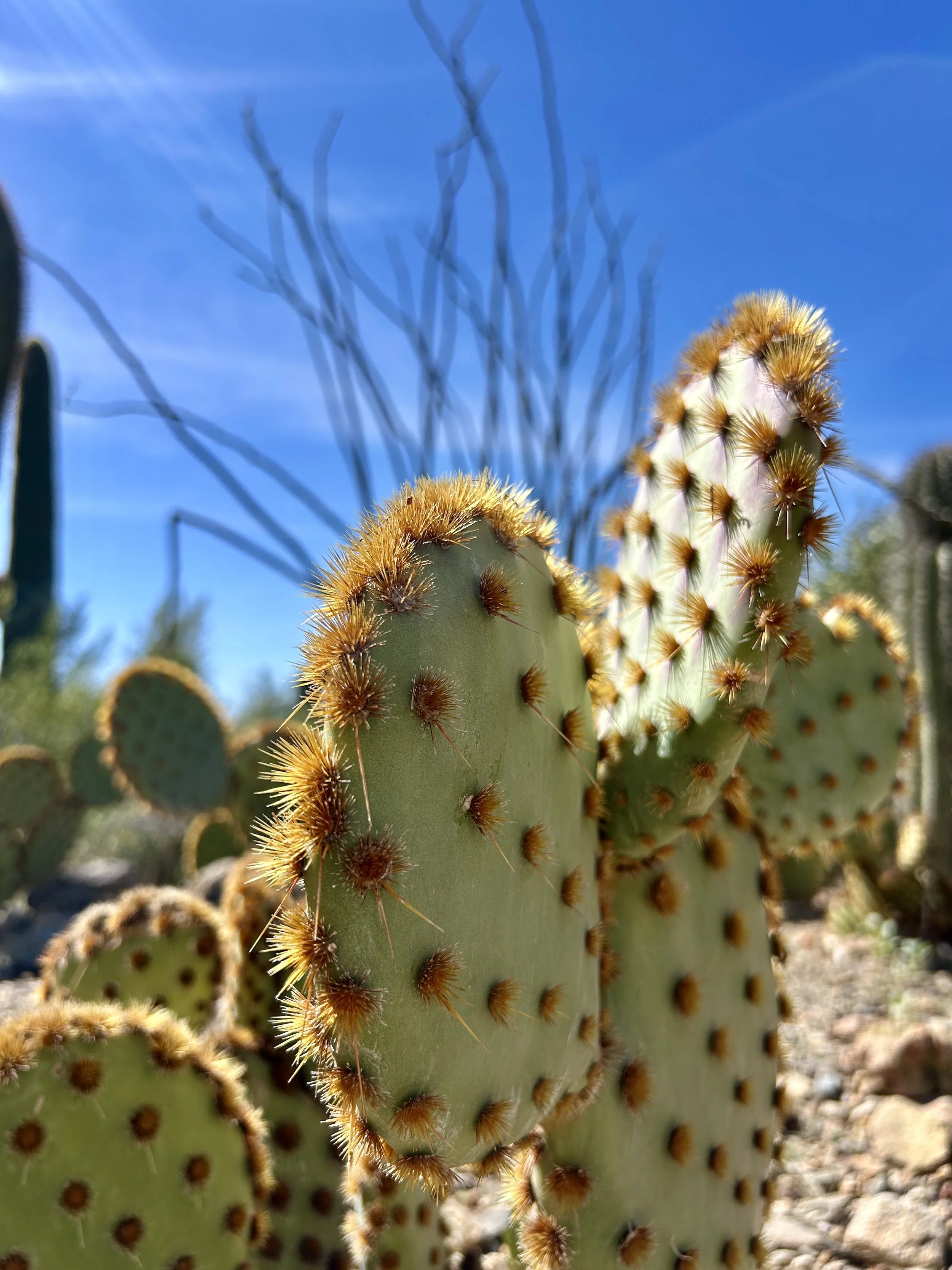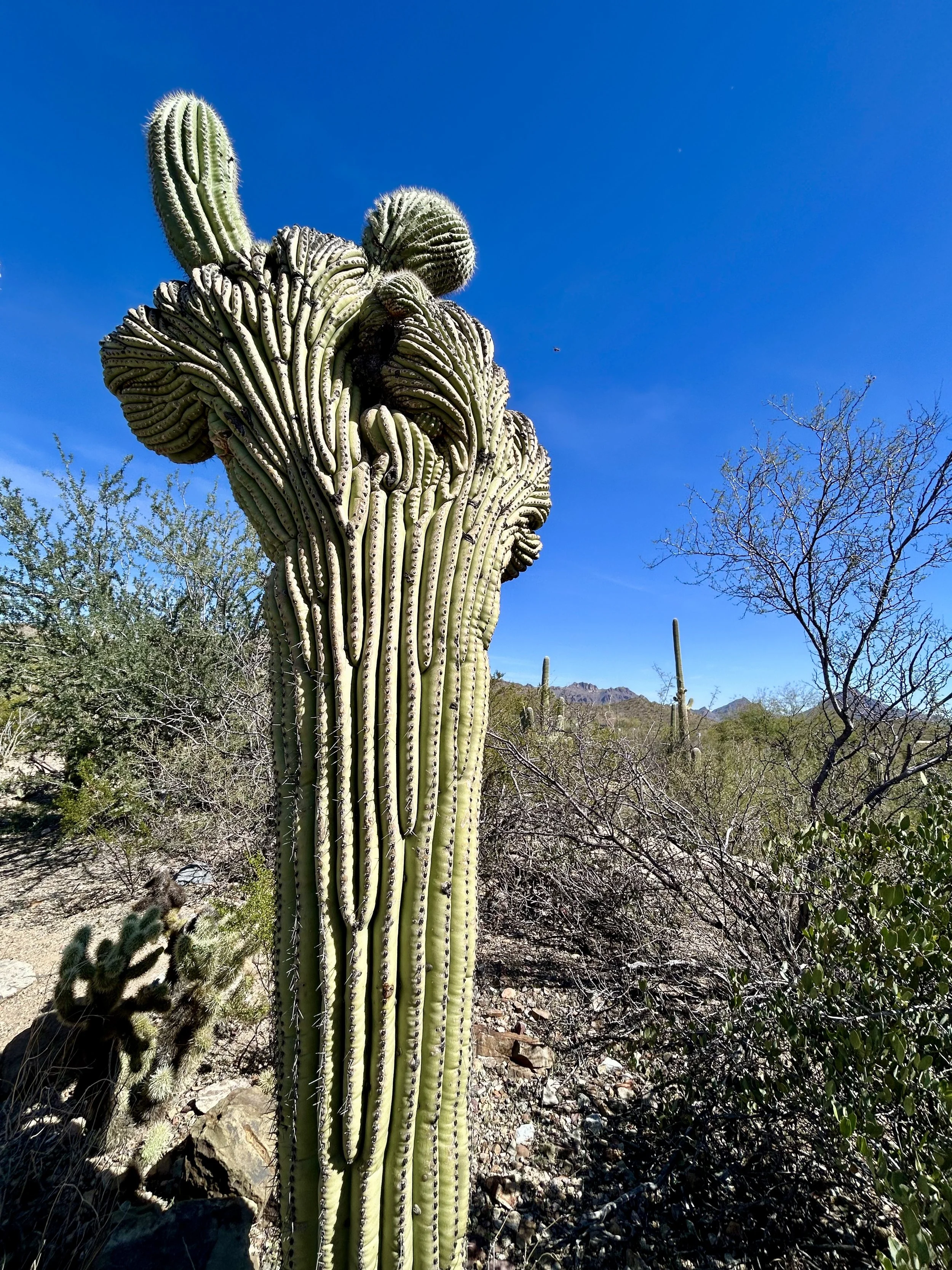 The next morning, we got an early start to do some hiking and exploring around the Mount Lemmon area. We set out to hike Soldier Trail. The trailhead was right on the road up to Mount Lemmon. It started with a good amount of vertical climb through the saguaro forest. We gained elevation pretty quickly, and the desert shifted from gigantic cacti to highland desert with lots of yellow and orange flowers. We had no idea what the end of the trail was and joked about the chance that it was just a sign, as this had happened to us recently. As we got to the distance AllTrails gave us for the hike, we noticed a little creek and a trail running along it. We decided to check it out to find a shady place to have lunch. We ended up walking into a desert oasis cut into a tiny slot canyon hidden in the rolling hills. The best part, no one was there! We hiked around the different levels of the canyon, took tons of pictures, and reveled in our hiking surprise. We didn’t have a ton of time to hang out, as we wanted to head up to the top of Mount Lemmon after our hike, so we eventually pulled our things back together and worked our way back down the trail to the car.