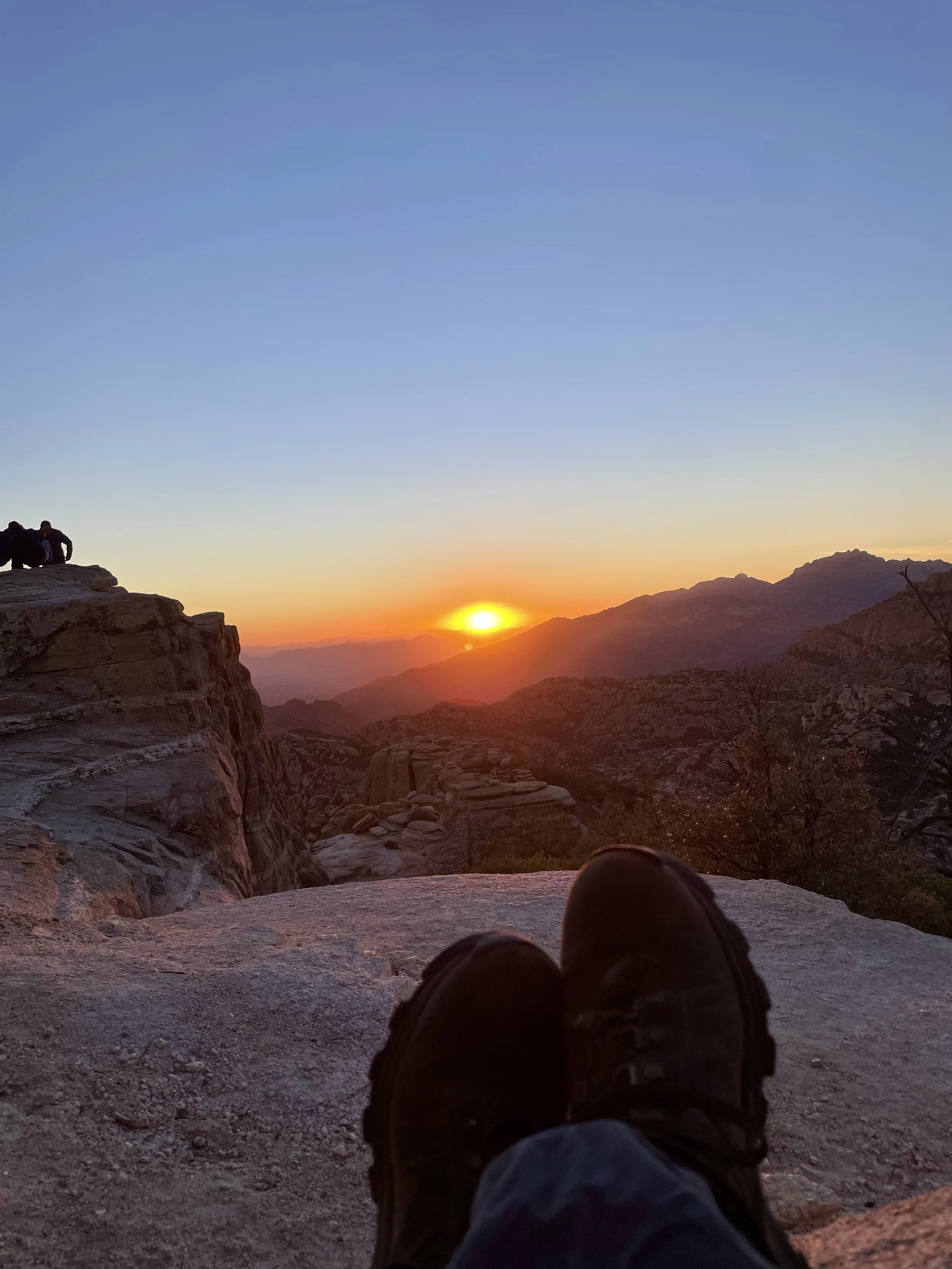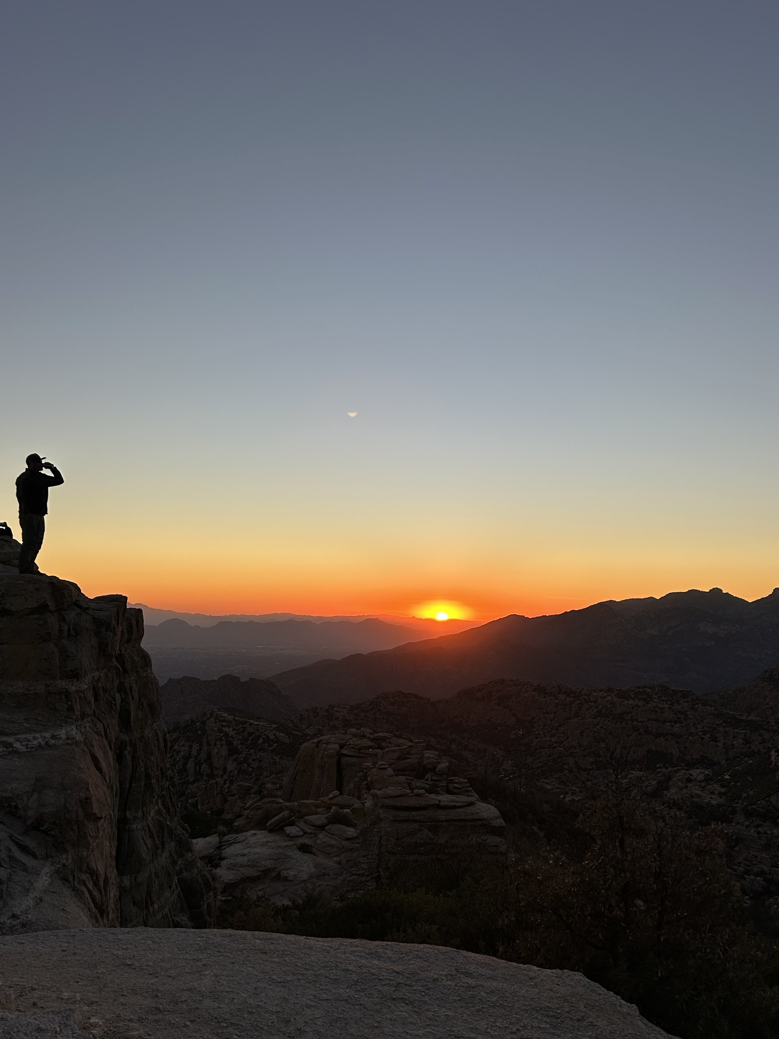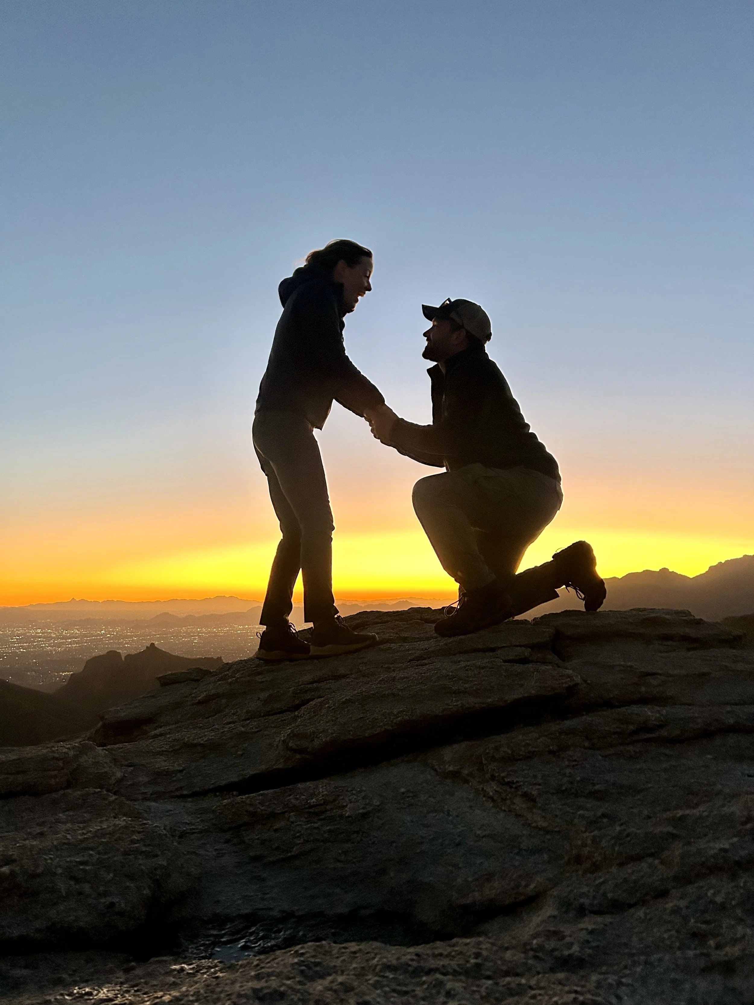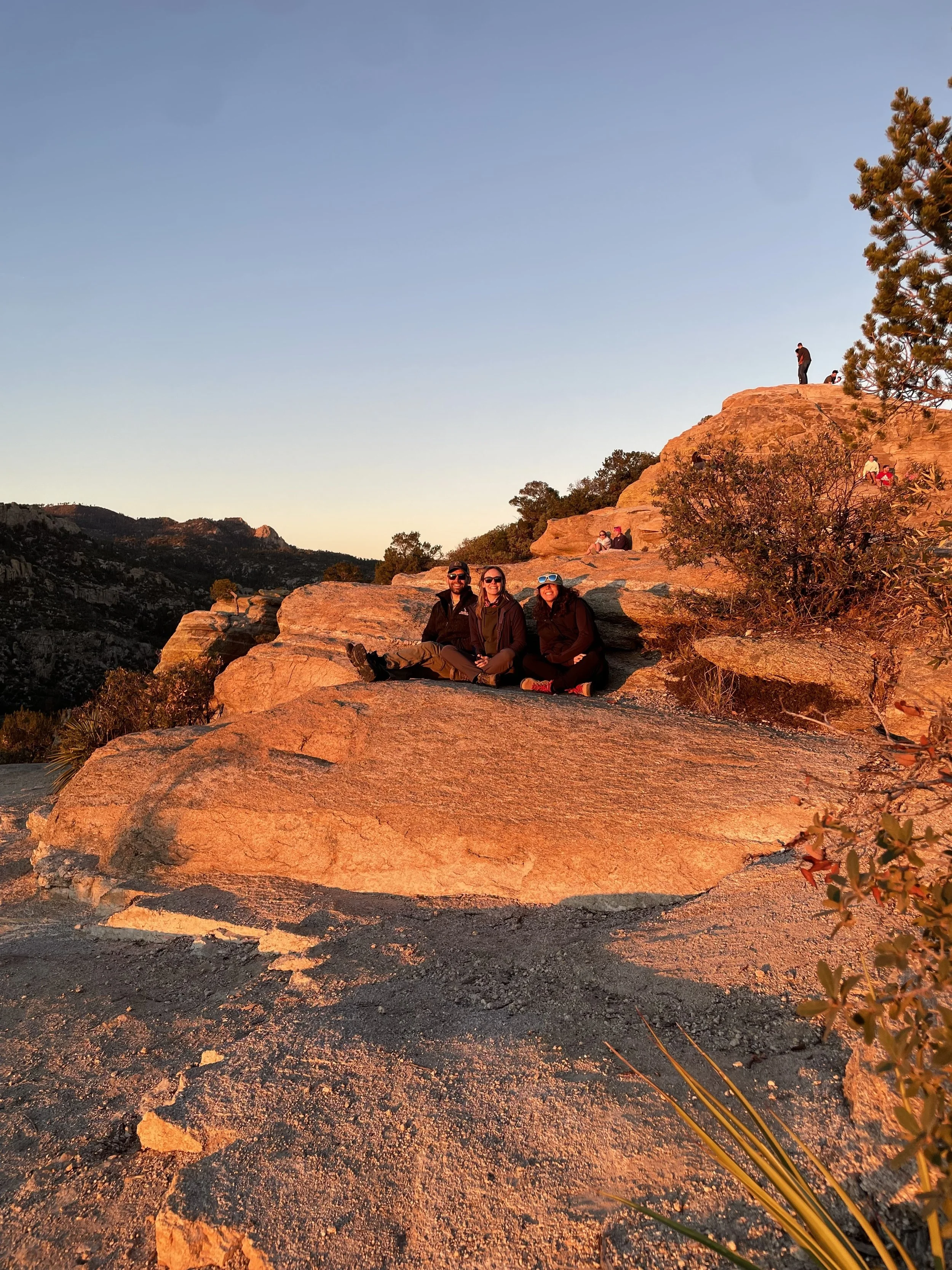 Once back at the car, we made our way up the Catalina Highway to Summerhaven at the top of Mount Lemmon. We unfortunately were just too late to get cookies at the Cookie Cabin, but ended up getting some snacks at the merch shop up there. We took some pictures up at the ski hill and threw a couple of snowballs before heading to the next location on the adventure. We planned on finishing our night at Windy Point for the sunset. This is an epic pull-out on the Catalina Highway. The views up there have cliffs overlooking several mountain ranges, vertical hoodoos, and Tucson spread out in the valley below. We got there just in time to find a great spot to watch the sunset over the mountains on the horizon. The light was so radiant, it feels like you are bathing in the sunset. Absolutely beautiful! We took a moment to stage some photos for Amy and Will. They are engaged and working on planning their elopement or wedding, so we got Will to drop to a knee, and the photo was ON POINT! We probably confused some people, but we had some good laughs over it. As we walked back to the car, we came across a man who had a gigantic telescope set up. Tucson is known for its dark skies and the astronomy that happens here. We asked him what he was looking at, and he said “Jupiter.” He then asked if we wanted to look. CRAZY! We could see the eye of the storms on Jupiter and the striations of the colors the planet displays. Never did I think I would be able to casually look at Jupiter with such clarity. We wrapped the night up at home tossing a pizza and telling travel life stories. What a great day!