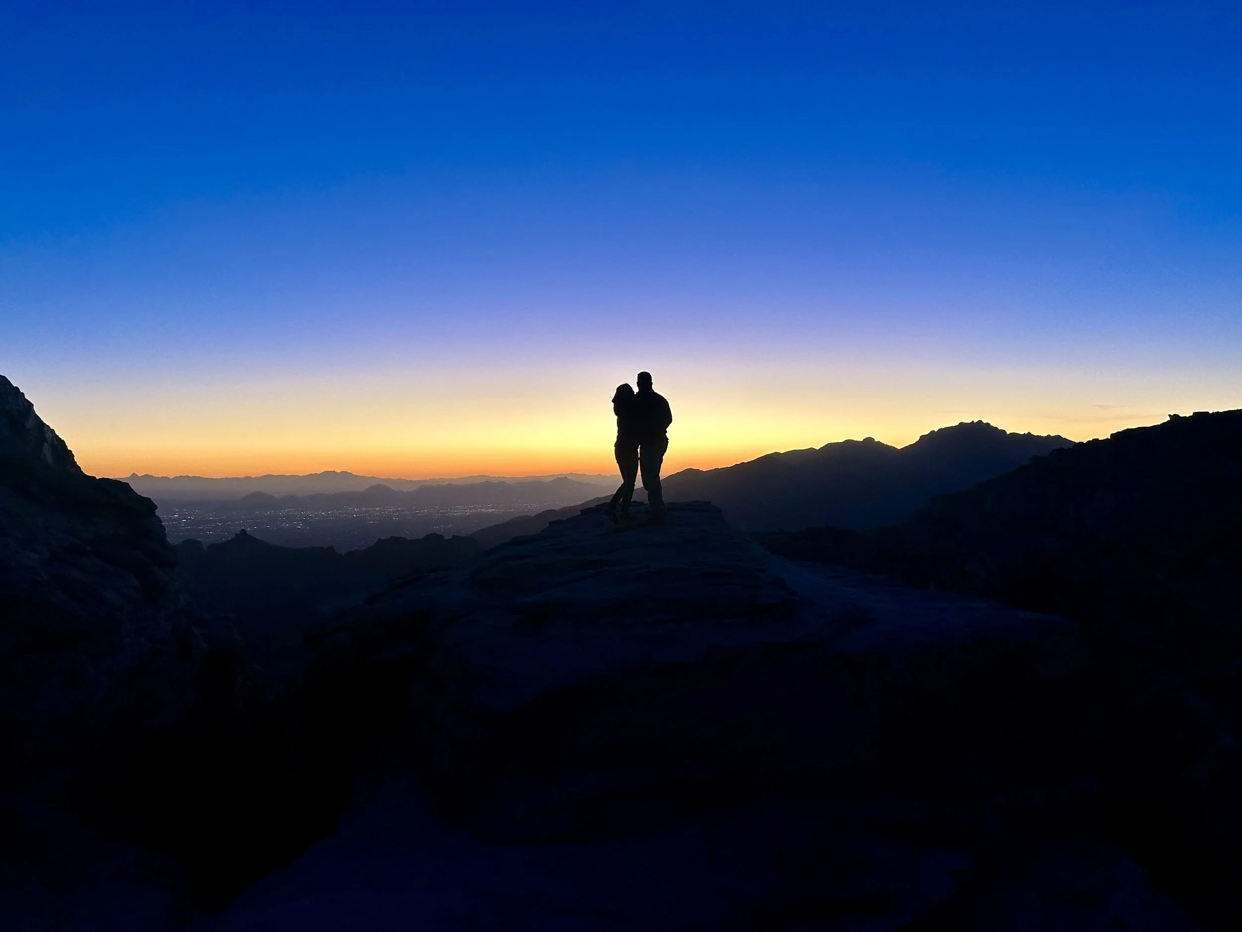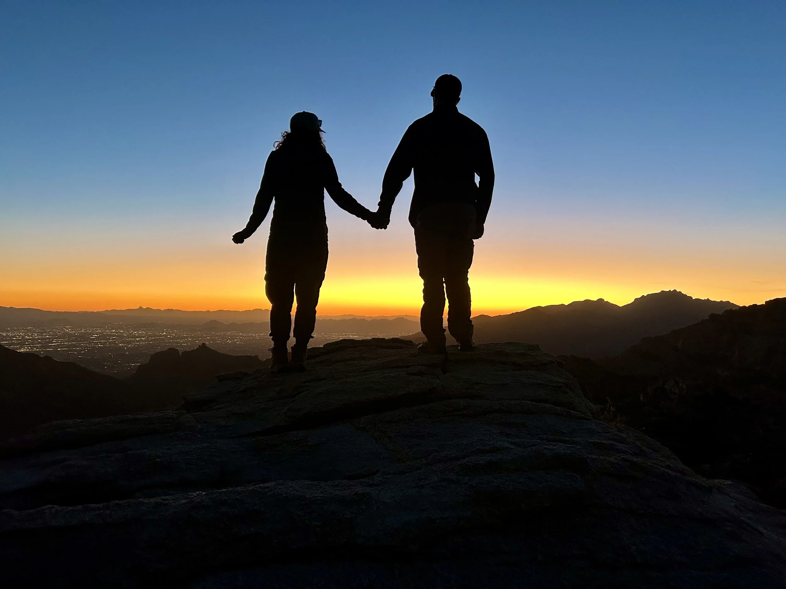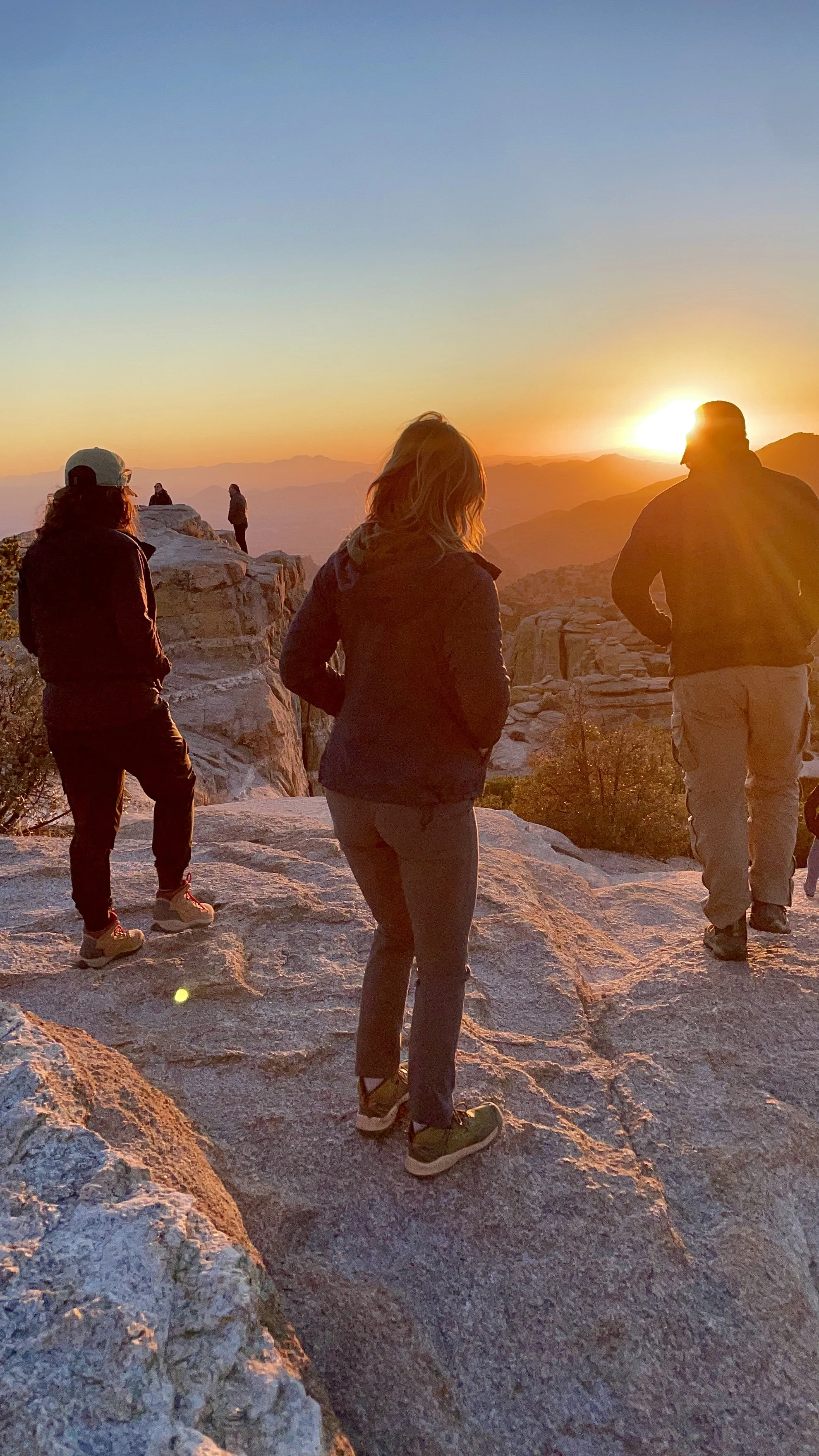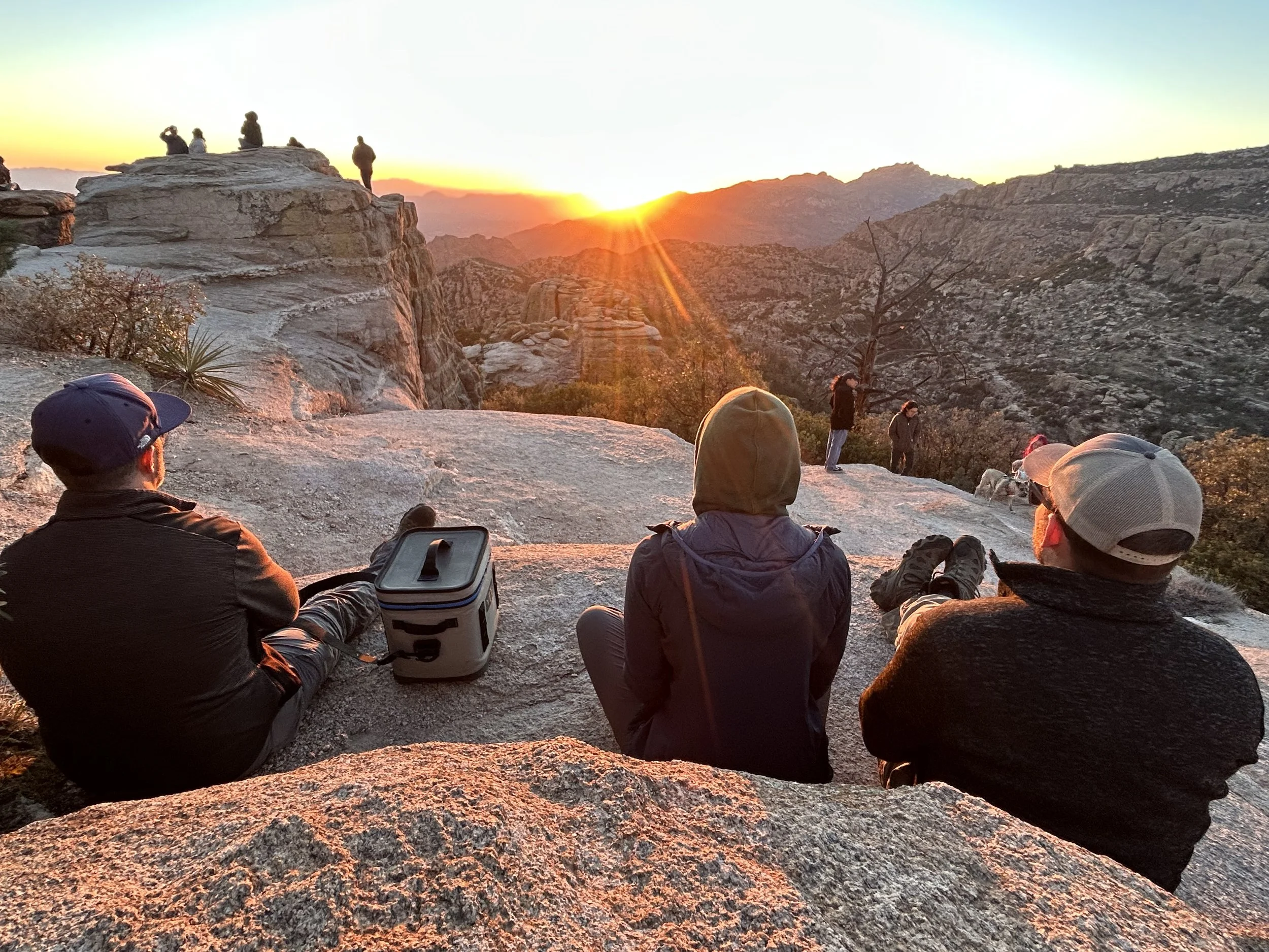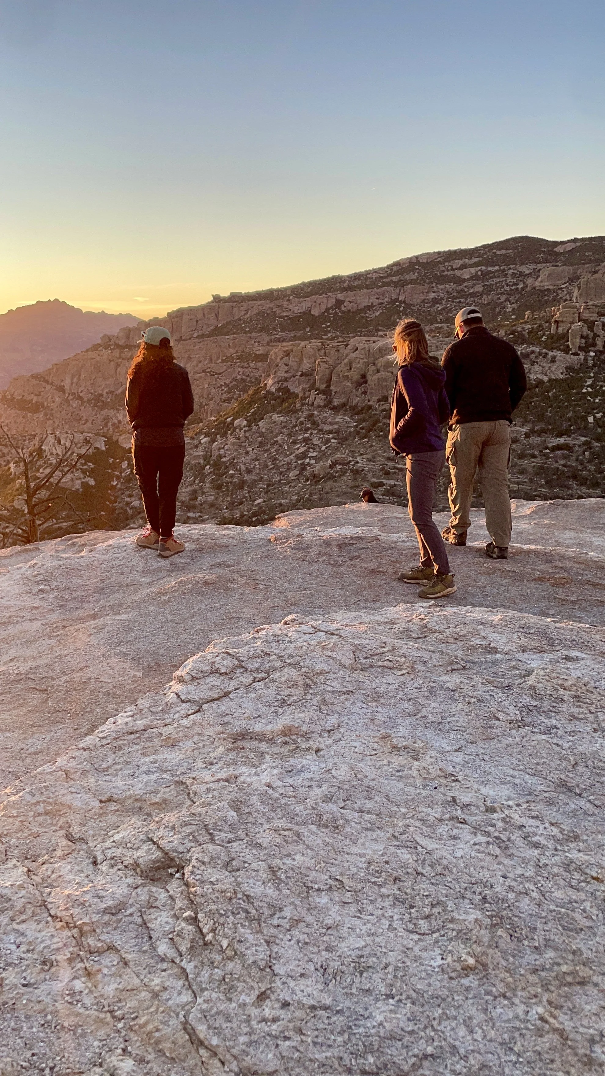 Once back at the car, we made our way up the Catalina Highway to Summerhaven at the top of Mount Lemmon. We unfortunately were just too late to get cookies at the Cookie Cabin, but ended up getting some snacks at the merch shop up there. We took some pictures up at the ski hill and threw a couple of snowballs before heading to the next location on the adventure. We planned on finishing our night at Windy Point for the sunset. This is an epic pull-out on the Catalina Highway. The views up there have cliffs overlooking several mountain ranges, vertical hoodoos, and Tucson spread out in the valley below. We got there just in time to find a great spot to watch the sunset over the mountains on the horizon. The light was so radiant, it feels like you are bathing in the sunset. Absolutely beautiful! We took a moment to stage some photos for Amy and Will. They are engaged and working on planning their elopement or wedding, so we got Will to drop to a knee, and the photo was ON POINT! We probably confused some people, but we had some good laughs over it. As we walked back to the car, we came across a man who had a gigantic telescope set up. Tucson is known for its dark skies and the astronomy that happens here. We asked him what he was looking at, and he said “Jupiter.” He then asked if we wanted to look. CRAZY! We could see the eye of the storms on Jupiter and the striations of the colors the planet displays. Never did I think I would be able to casually look at Jupiter with such clarity. We wrapped the night up at home tossing a pizza and telling travel life stories. What a great day!