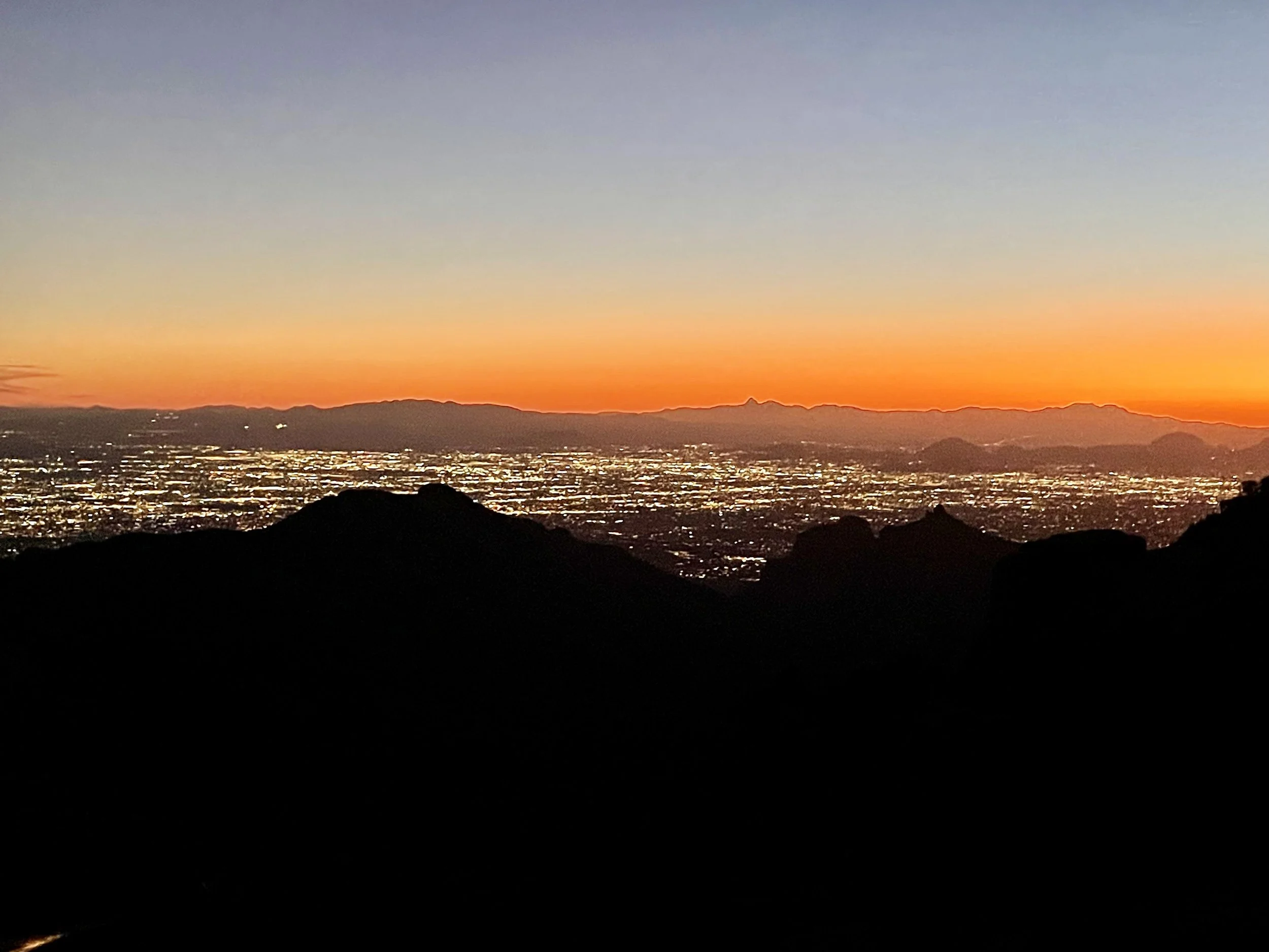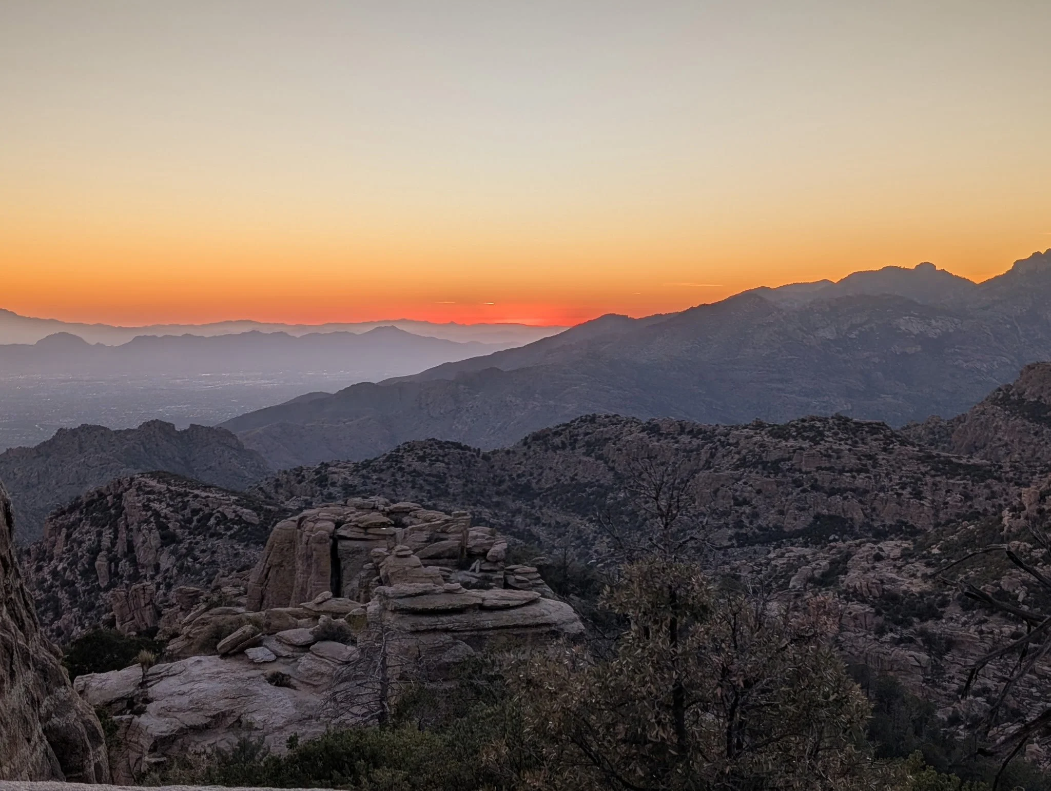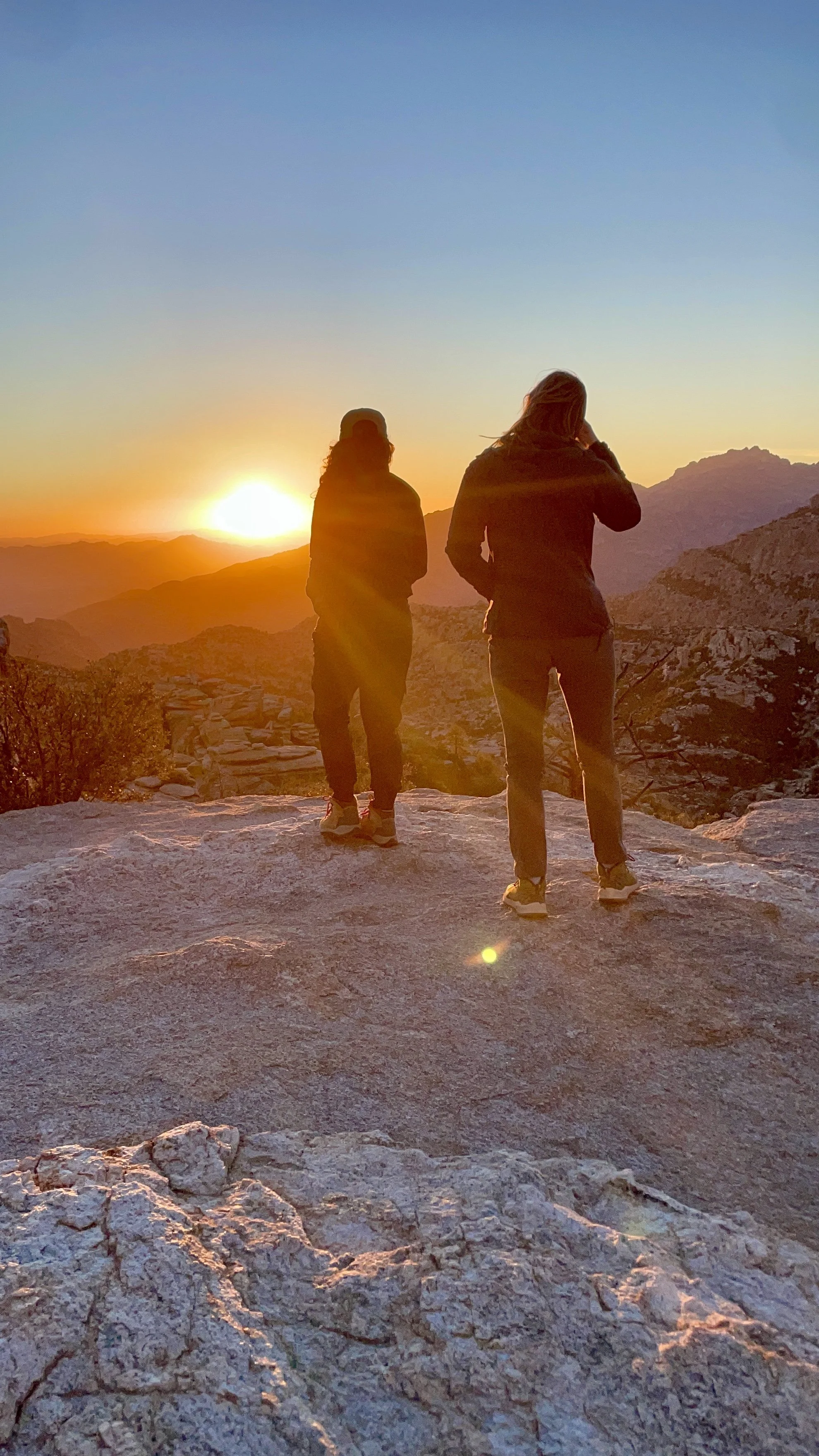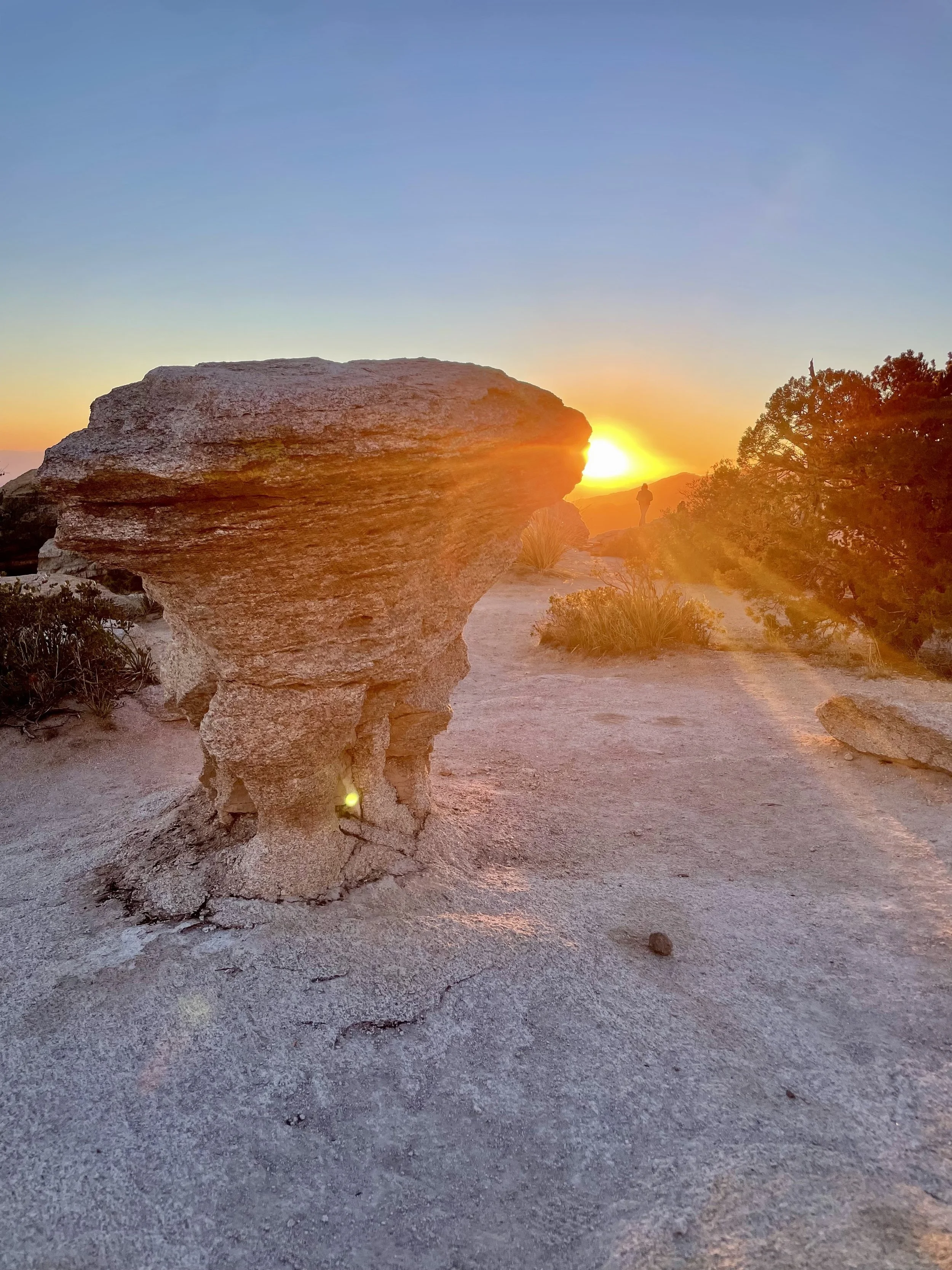 Once back at the car, we made our way up the Catalina Highway to Summerhaven at the top of Mount Lemmon. We unfortunately were just too late to get cookies at the Cookie Cabin, but ended up getting some snacks at the merch shop up there. We took some pictures up at the ski hill and threw a couple of snowballs before heading to the next location on the adventure. We planned on finishing our night at Windy Point for the sunset. This is an epic pull-out on the Catalina Highway. The views up there have cliffs overlooking several mountain ranges, vertical hoodoos, and Tucson spread out in the valley below. We got there just in time to find a great spot to watch the sunset over the mountains on the horizon. The light was so radiant, it feels like you are bathing in the sunset. Absolutely beautiful! We took a moment to stage some photos for Amy and Will. They are engaged and working on planning their elopement or wedding, so we got Will to drop to a knee, and the photo was ON POINT! We probably confused some people, but we had some good laughs over it. As we walked back to the car, we came across a man who had a gigantic telescope set up. Tucson is known for its dark skies and the astronomy that happens here. We asked him what he was looking at, and he said “Jupiter.” He then asked if we wanted to look. CRAZY! We could see the eye of the storms on Jupiter and the striations of the colors the planet displays. Never did I think I would be able to casually look at Jupiter with such clarity. We wrapped the night up at home tossing a pizza and telling travel life stories. What a great day!