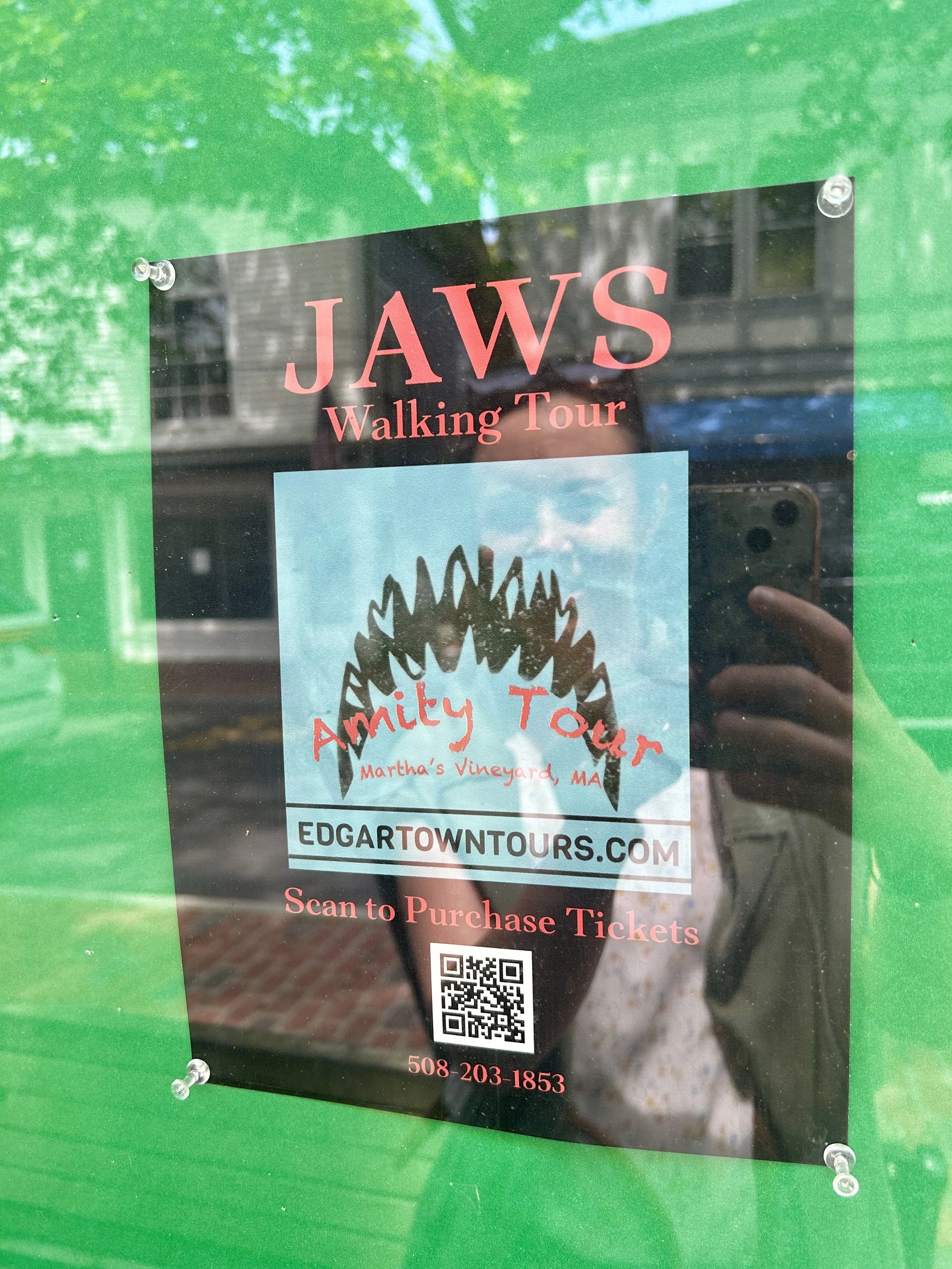 Our first stop was the famous “Jaws Bridge,” a small bridge over an estuary leading to a salt pond. While exploring the beach, we took photos where the iconic scenes were filmed and made sure to check for sharks! Young Billy probably wouldn’t have even come out to the island, considering how afraid I used to be of sharks. That fear came straight from watching JAWS. So being here was low-key thrilling—and, at times, pretty comical—for Amity and me. After that, we hopped back on the bus and headed into Edgartown.