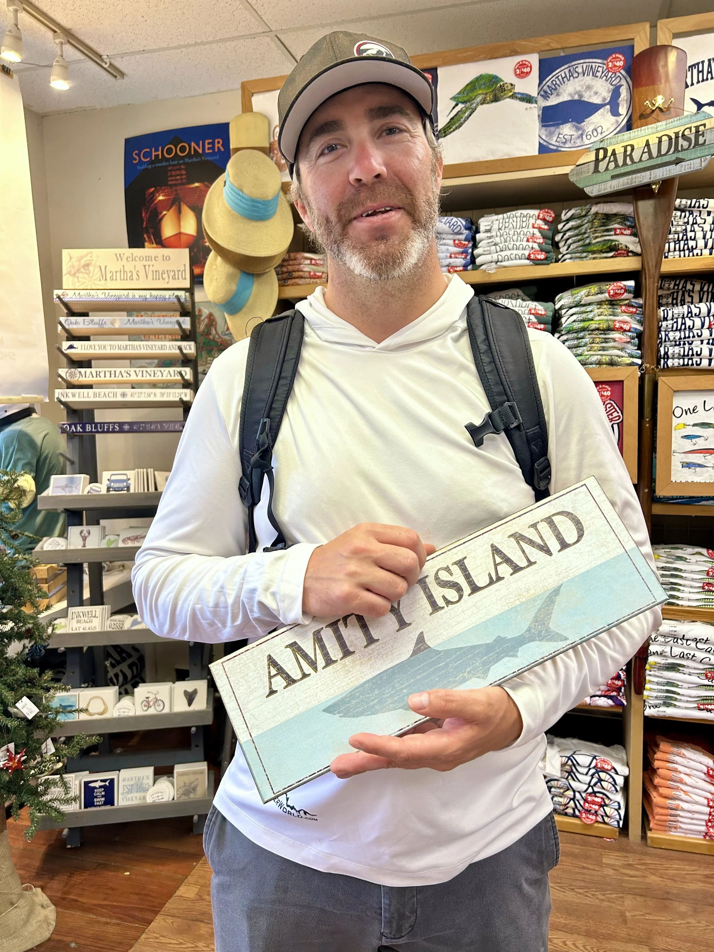 Although we didn’t find any Amity Week merch for Amity herself on this trip, I was able to pull off something rad for her. Our anniversary was the week after our visit, which coincided with Amity Week. I reached out to the Martha’s Vineyard Sharks—a summer collegiate baseball team on the island. For Amity Week, they played one game as the Amity Sharks in honor of the 50th anniversary of JAWS. I managed to get her a team uniform! She couldn’t have been happier and got serious street cred from her patients and coworkers when she wore it to work. GO SHARKS!