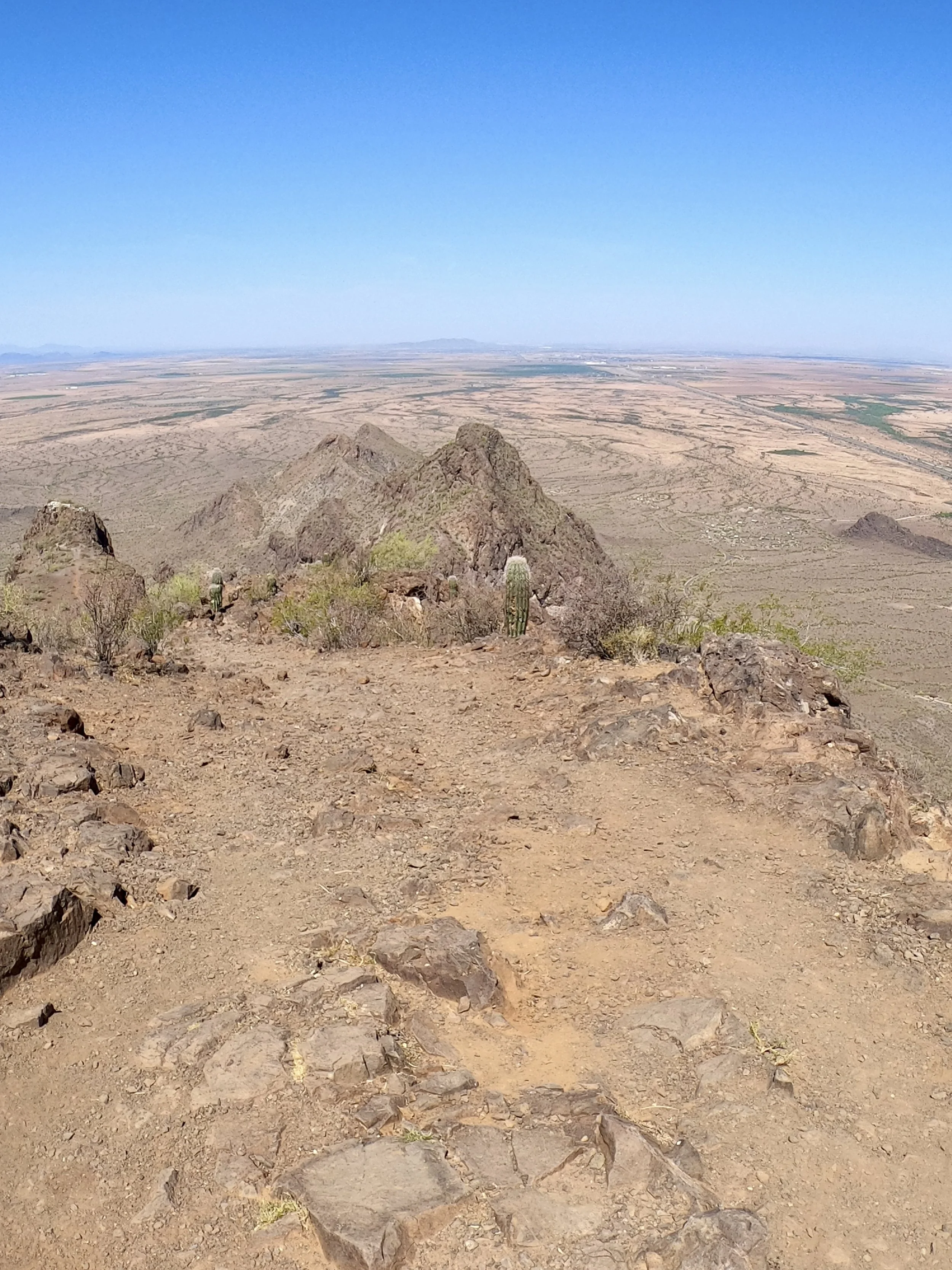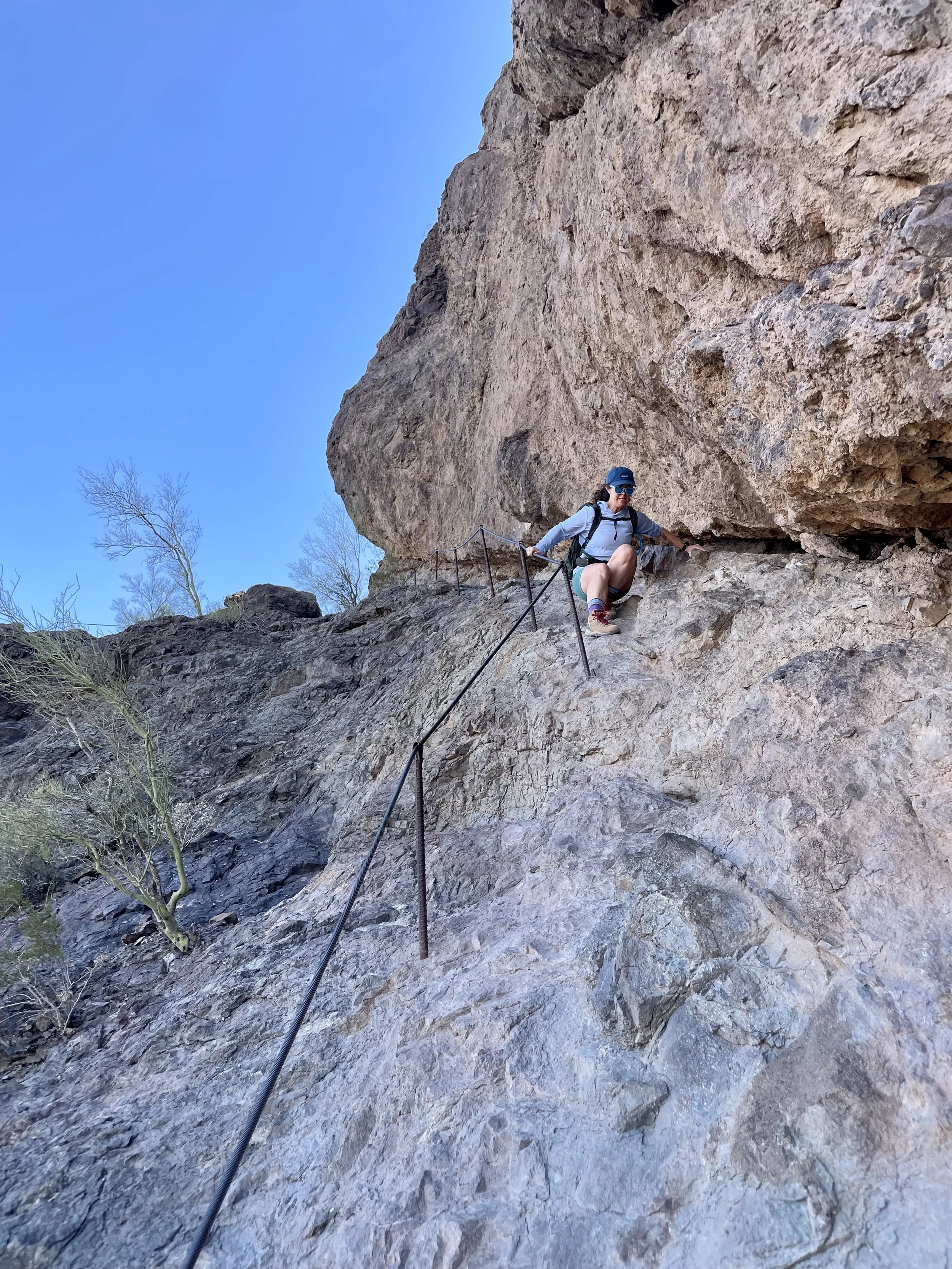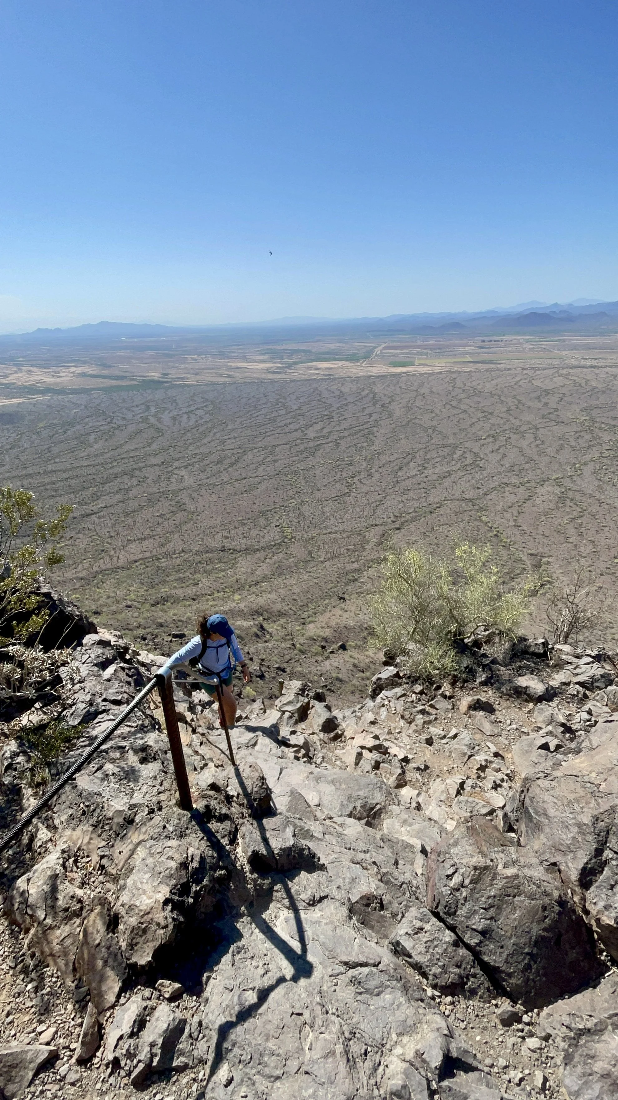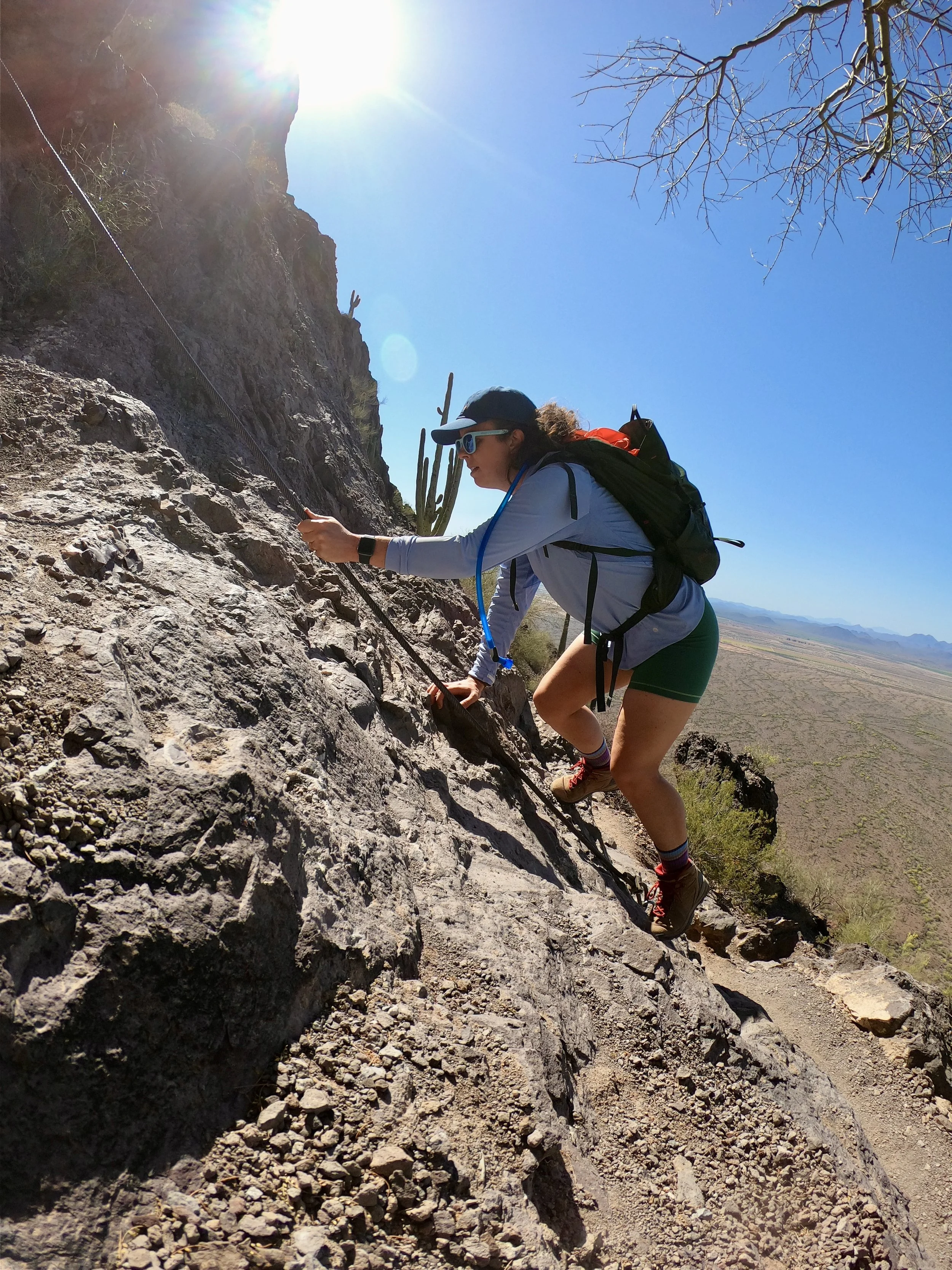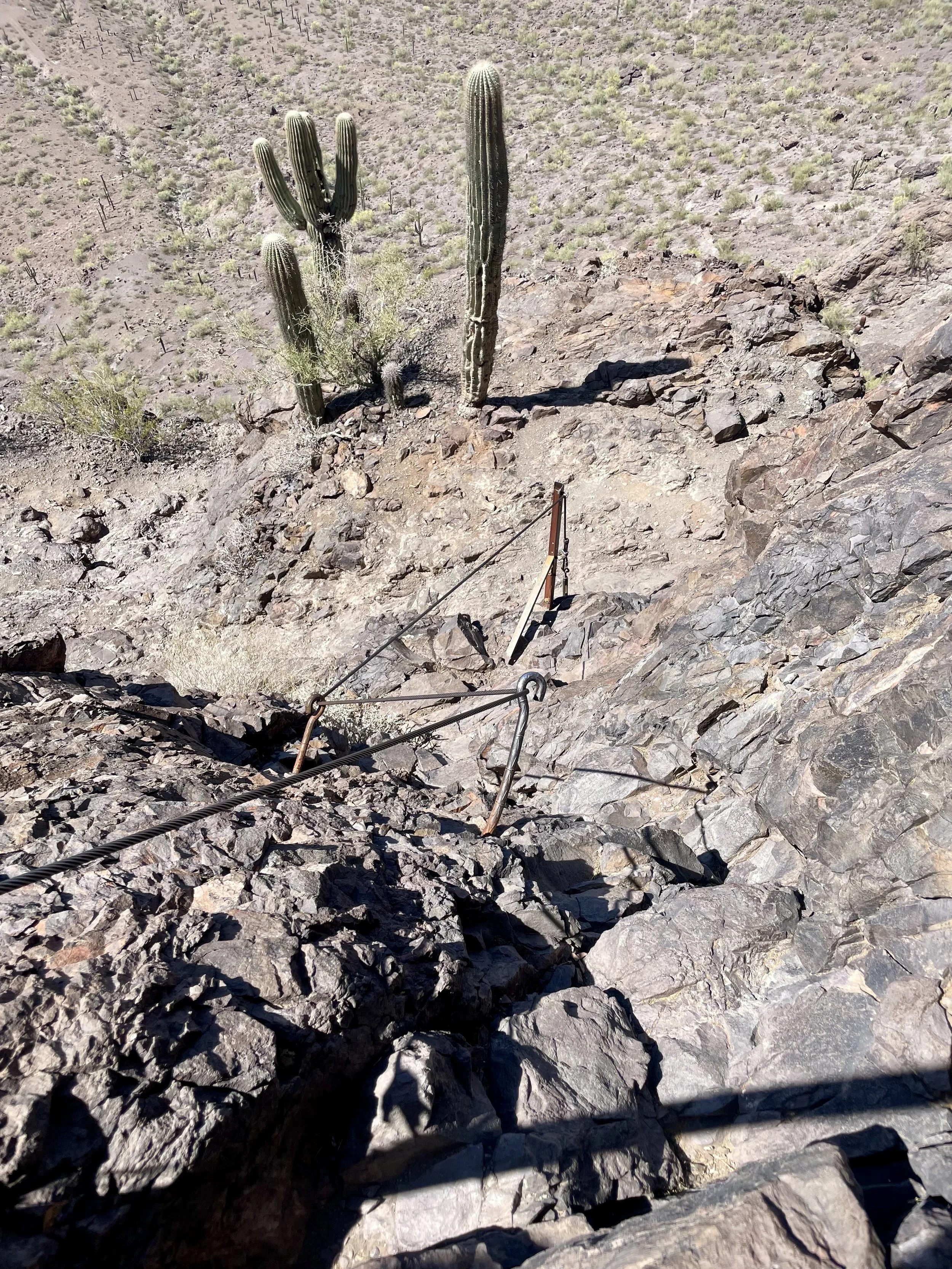 Going down turned out to be slightly easier than up. We at least knew what we were getting into, and just focusing on making every step with strong intentions and purpose helped us navigate these cable climbs relatively easy. Once we hit the turn to extend our hike around the mountain, we thought we might be done with these cables, but we were wrong! The steepest downward climb was still in front of us. Once we were on it, we could do nothing but laugh. We both took our time and made it down unscathed; outside of some bruises and cuts we got on our arms and knees from the rocks. We slowly made our way down the west side of the mountain into the valley below. The terrain became less rugged and started to fill with gigantic Saguaro Cacti. At this point, we had left the state park boundary, and into a zone where I could fly my drone. We had some fun getting a couple desert and mountain shots as we walked through the Saguaro forest. The remaining 4 miles were not challenging in the sense of the terrain, but were challenging in the sense that we were hiking in the desert sun, with no sun relief, and it was getting hot!