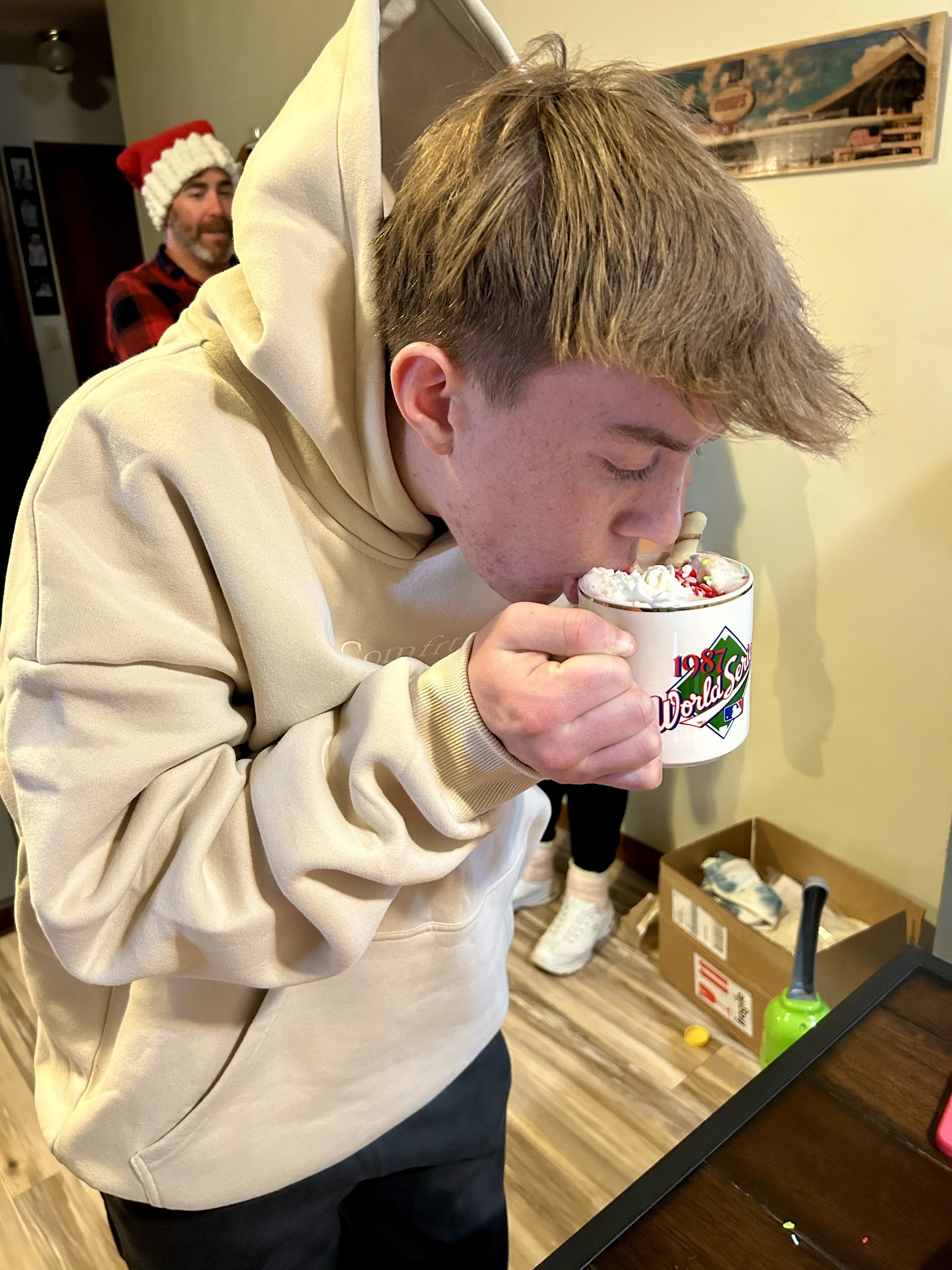 On Christmas Day, we had a relatively slow morning. Our major event for the day started with a gift exchange at Mike’s house, followed up with some family time there. We wanted to do something special for the kids, so we came up with a hot chocolate bar that was a hit! We had all kinds of cookies, sprinkles, whipped cream, and chocolate to give anyone who had one a proper Christmas Day sugar rush! Around the middle of the day, everyone made their way to other events and planned activities. This gave us some time to hang out with Karen and Mike alone. The Chiefs were playing, but no one really cared, as they were already eliminated from the playoffs. It’s been a rough season to be a Chiefs fan. There were no emotional investments in this game, so the outcome couldn’t ruin anyone’s Christmas celebrations. That night, we headed over to Julie and Jeff’s house to continue the holiday marathon! Amity got her crafting on by helping place some sequins and gemstones onto one of Finley’s dance outfits. After a couple hours, her fingers hurt and she was feeling the effects of the potent glue she was using. We all did another gift exchange, which is crazy to think that this was at least the fifth time the kids had unwrapped gifts in the last couple days. I am a one-and-done kind of guy, but I know they loved everything they got! Following gifts, we had a nice Christmas dinner with everyone. Asa had cooked some prime rib and nailed it! Julie did the rest, and it was all fantastic! I had to give Baylor a hard time because he was nearly done with his dinner before Grandma even sat down at the table. He’s a growing young man, so you can’t give him too much crap—especially when everything smelled so good! That night, the Early’s left, and it was just Amity, Asa, Kelsey, baby Seger, Julie, Jeff, and me. They played some card games, as Seger and I played with his balls, cars, and toys. He is a hoot! He never caught on to my hide-and-seek game with his cars and always found them! Right before bed, I took a little personal time to soak in their new hot tub. Can’t complain that we now get to do a little soaking any time we are back home in Kirksville! It was a really long day, and the R&R was well received.